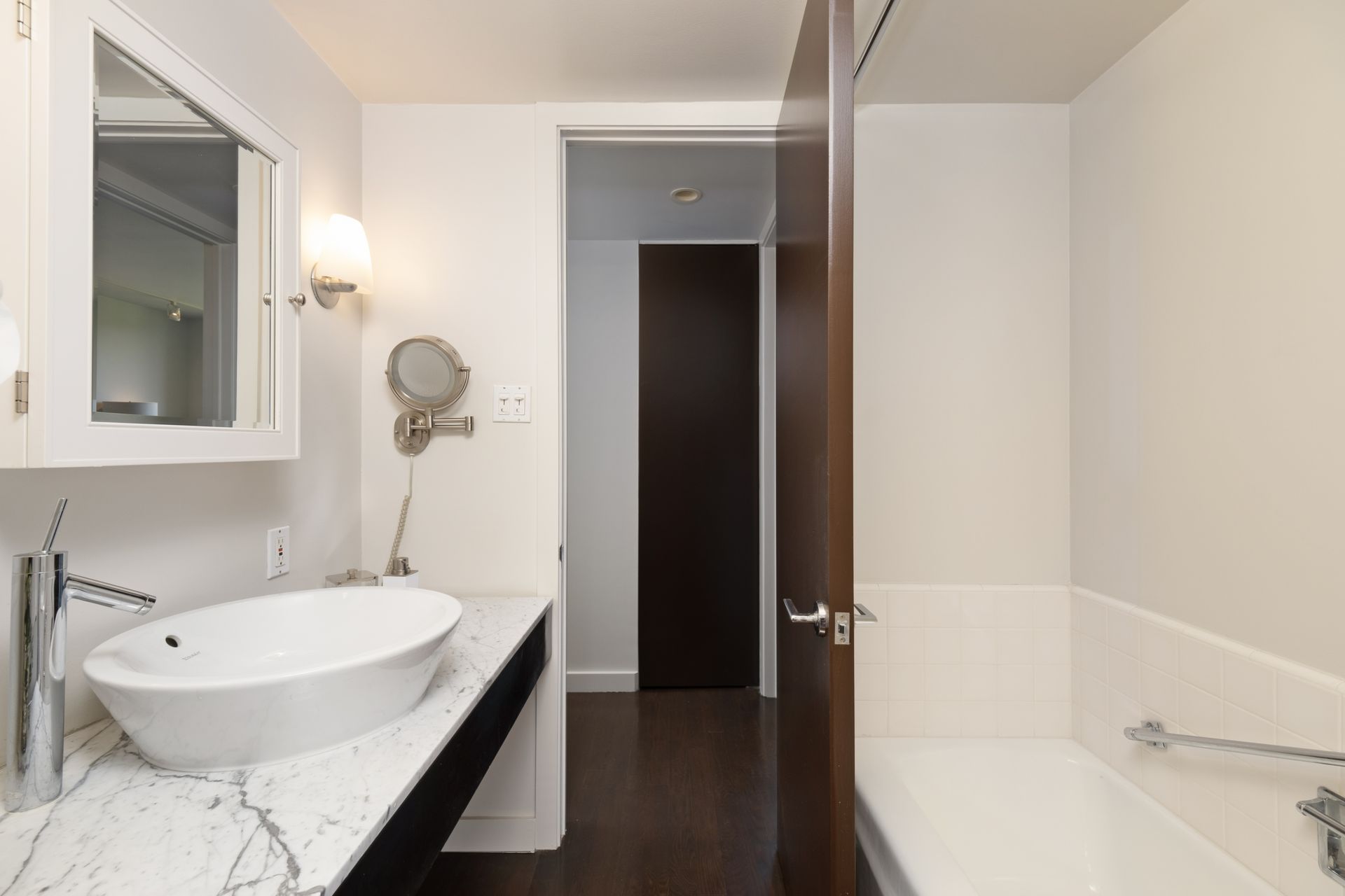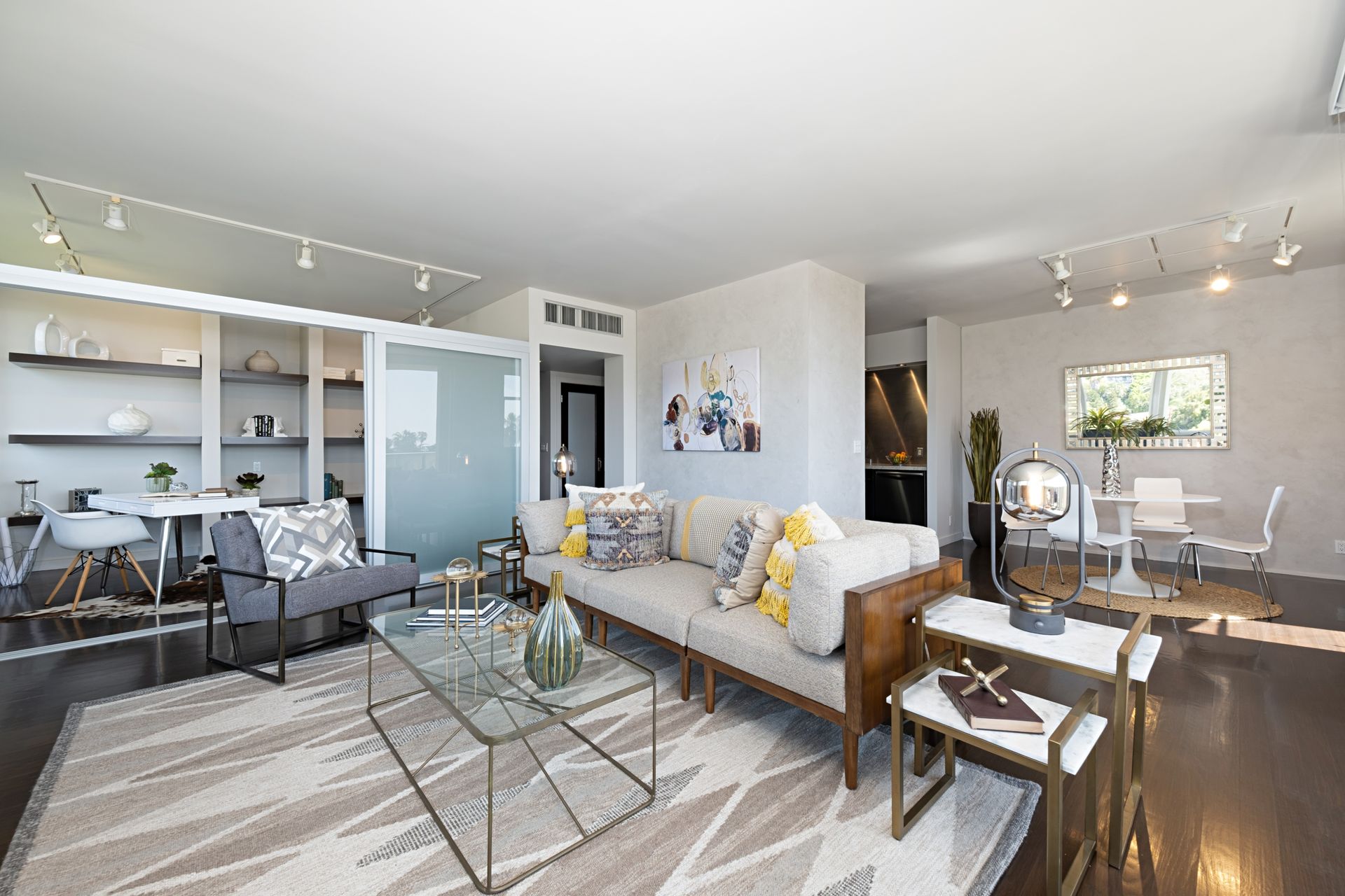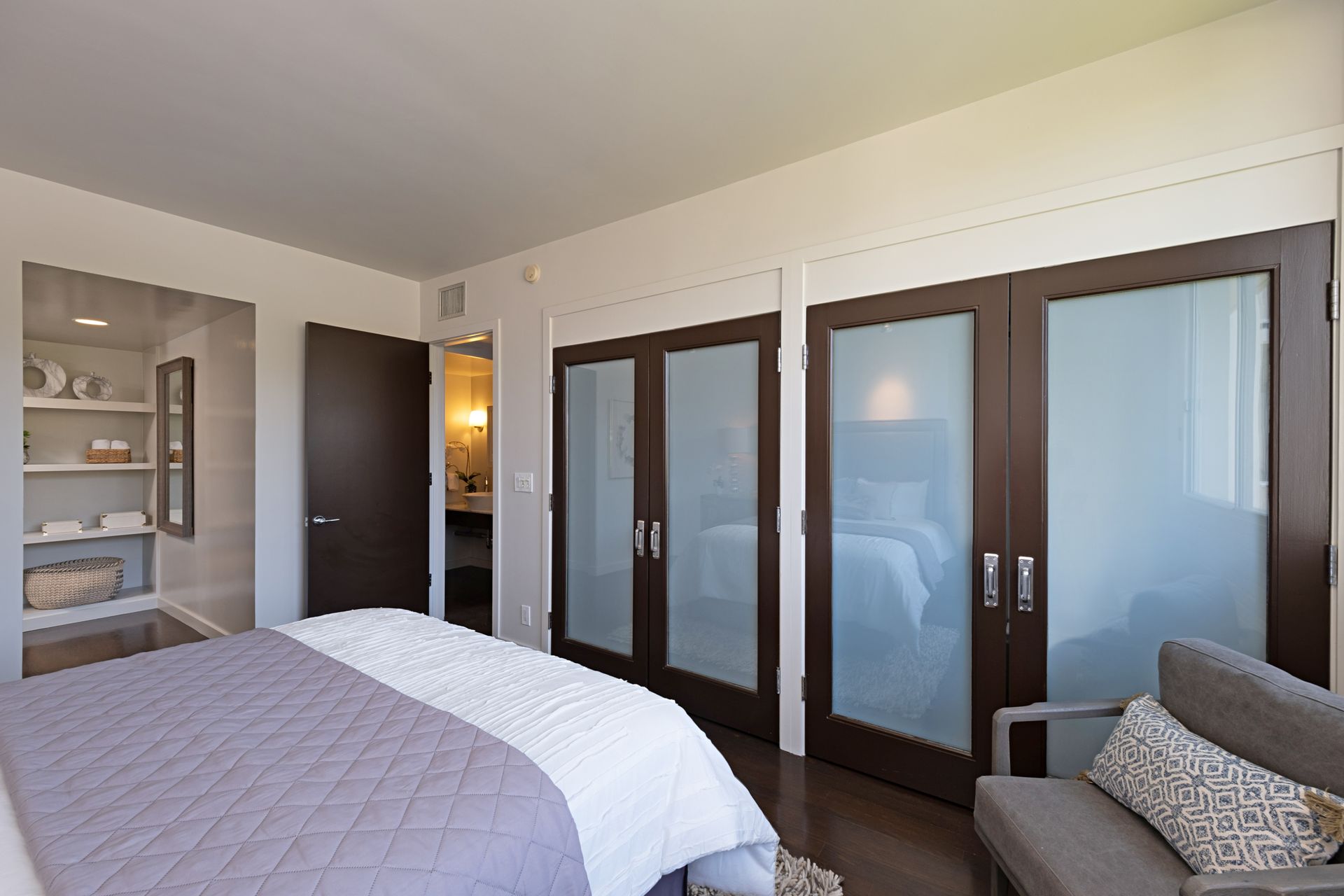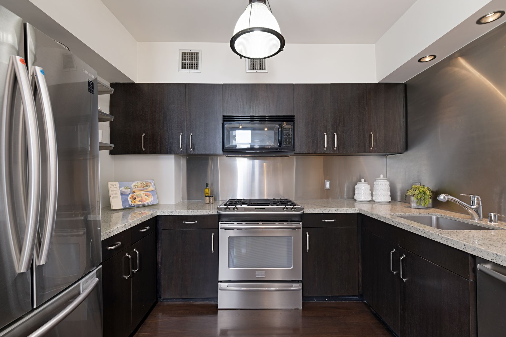 This coveted designer corner unit is most ideal for your main residence or Pied-à-terre. The modern kitchen features granite countertops, stainless-steel backsplash, and newer appliances. The unit showcases nine-foot ceilings with wall to ceiling glass windows with updated custom-fit shades. The newer sliding doors create an open space living area or an enclosed office with Halogen track lighting and built-in floating bookcases. The unit has oak hardwood floors with dark custom walnut finish and several built-in closets. The master bathroom has its own en-suite bathroom and newer spacious closets. This full-service complex features 24-hour security, a doorman, a beautiful heated pool, a gym, saunas, community laundry, two assigned premium parking spaces, a private storage unit and community bike racks. The unit has amazing views of all the things that makes this city spectacular: downtown, the ocean, hiking trails and Hollywood hills! Located a block away from Hillhurst Village shops, grocery stores and restaurants. Come home after a busy day and unwind watching the sunset off your private balcony.