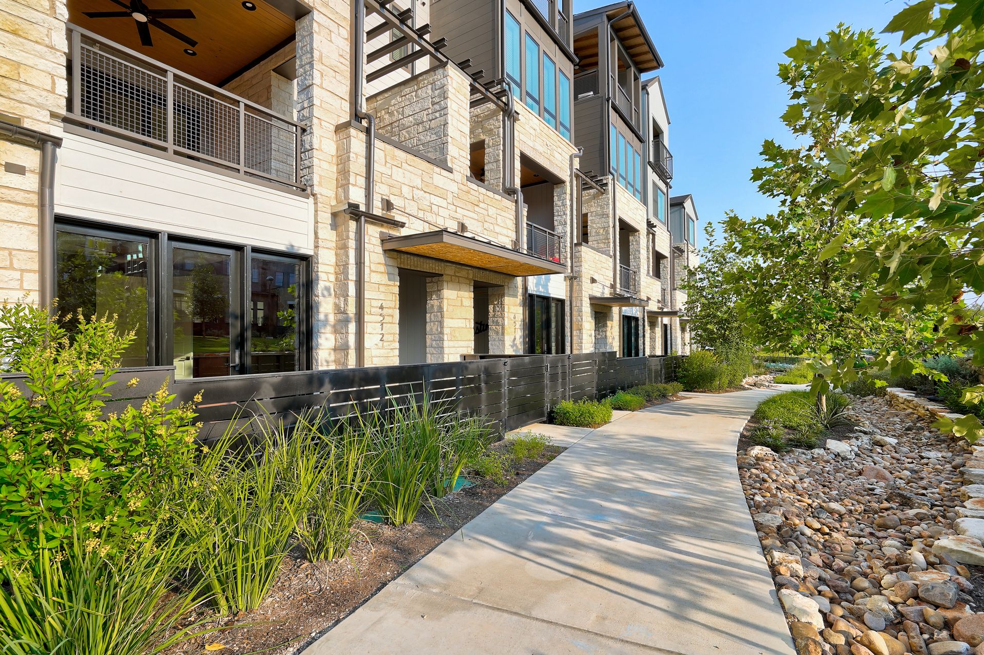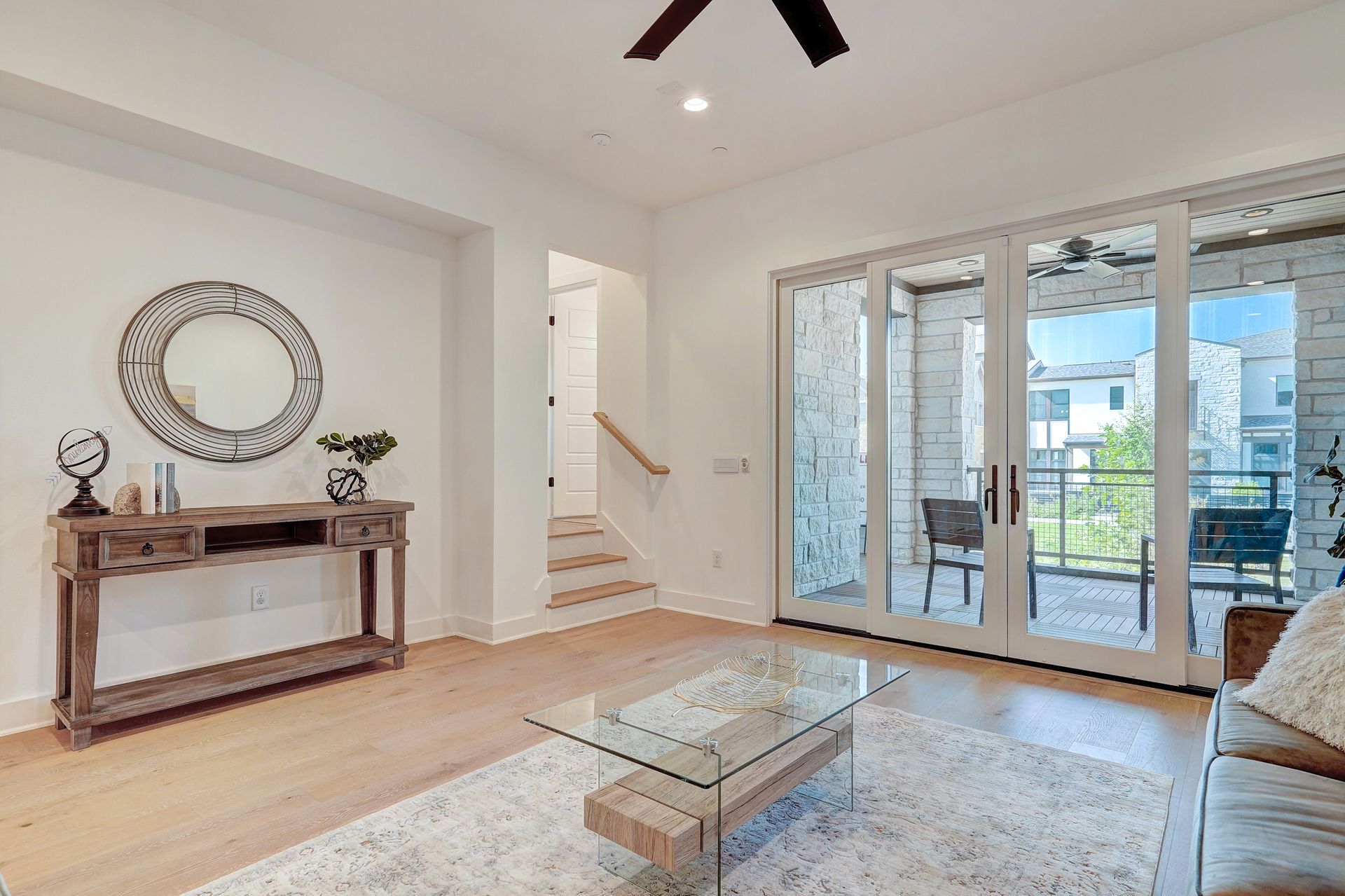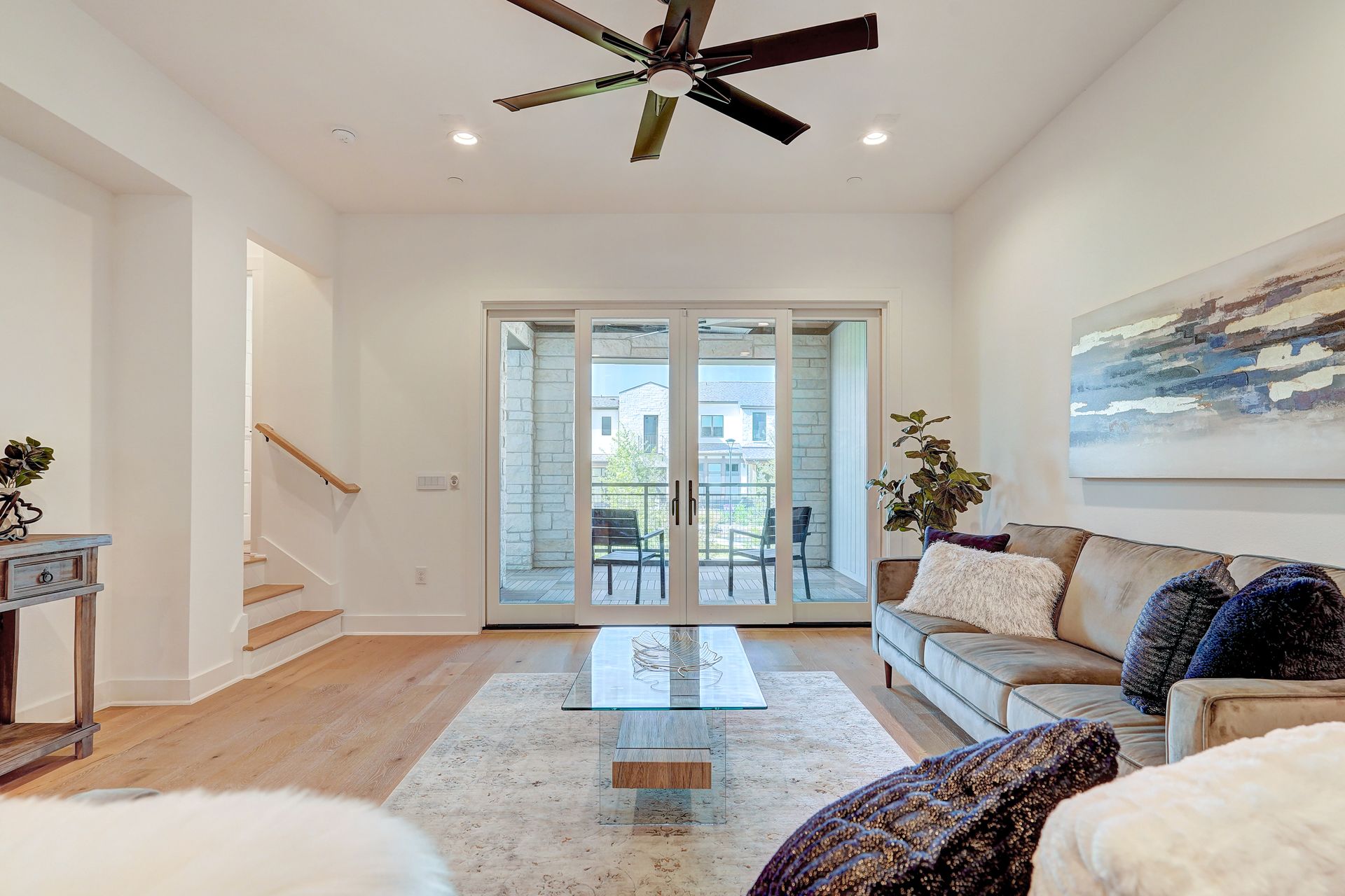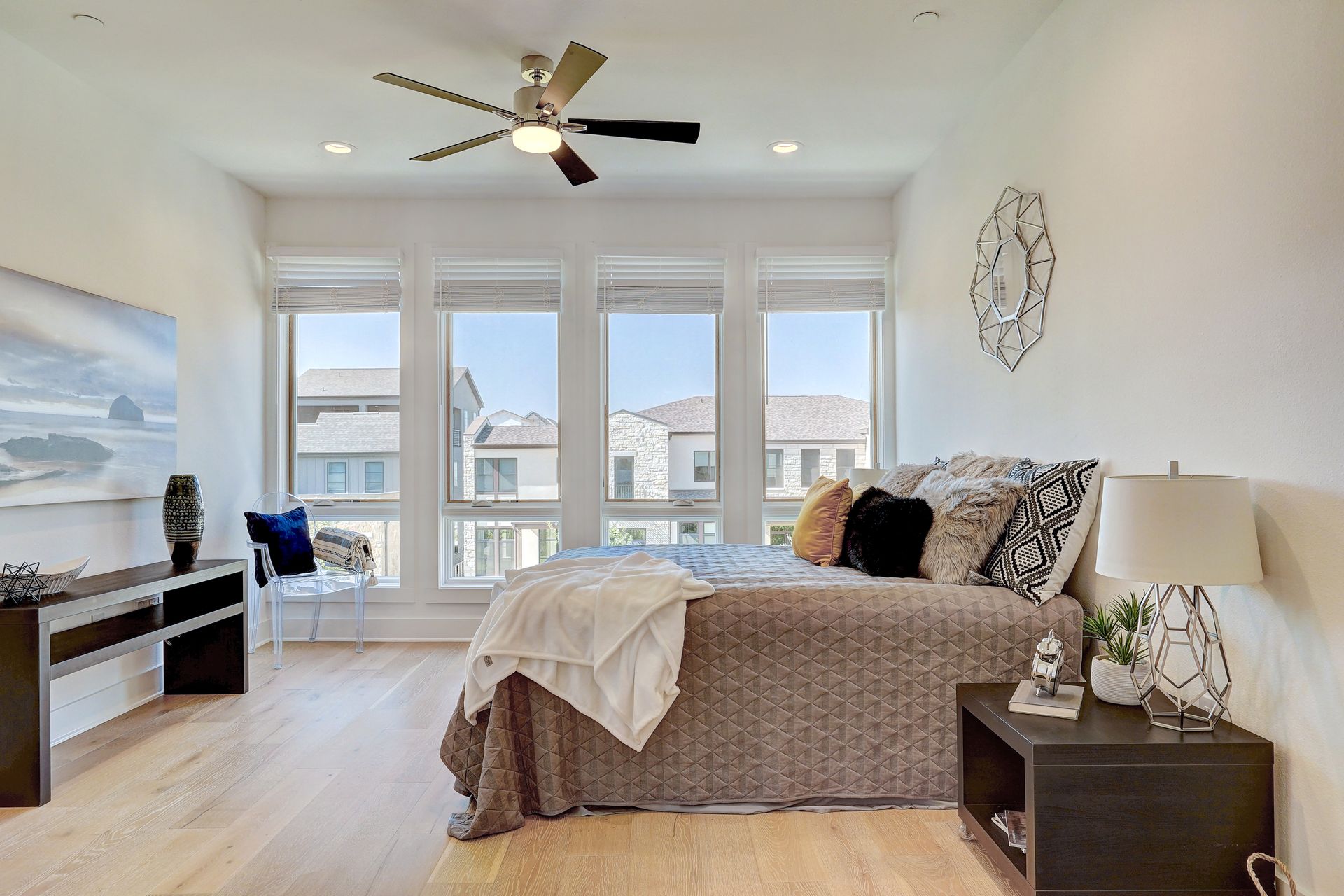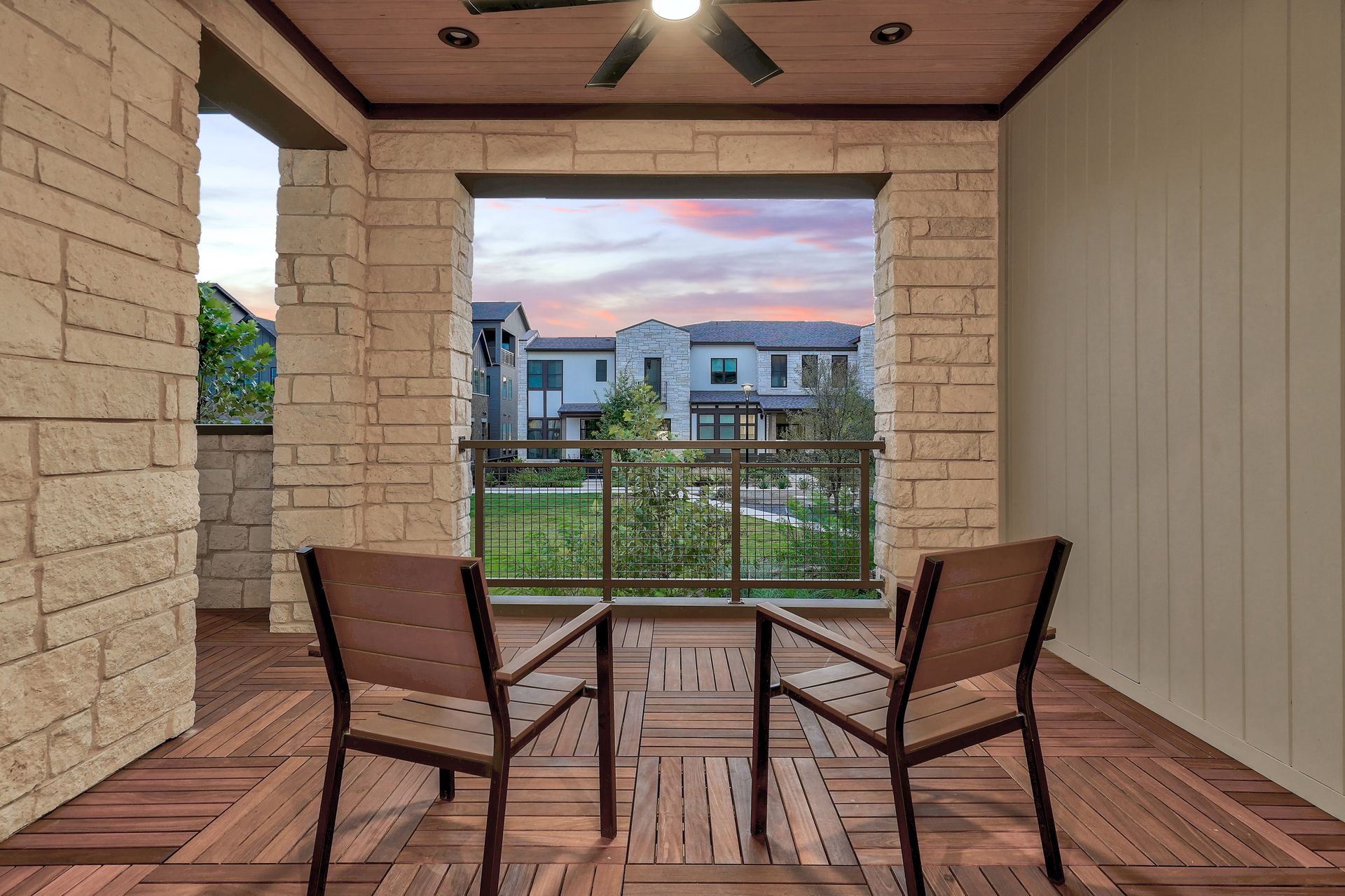 This stunning luxury townhome is ready for immediate move-in. The Grove is centrally located five miles from UT, downtown, Zilker, the Capitol & The Domain. Numerous upgraded features including hardwood flooring, herringbone caps on stairs, quartz counters throughout, extra lighting, & fans plus a bonus office nook. The ground level features a fenced front yard, flexible den/office space with a full bath and elevator entrance. The gourmet kitchen has abundant cabinets, backsplash, pantry, and an oversized island. The large dining and living rooms unfold onto a large covered balcony. Endless owner's suite with double vanities, separate shower & tub and a massive custom-built walk-in closet. The top floor has a bedroom/bath plus an enormous bonus room that opens to a covered deck. Enjoy incredible downtown views & watch the gorgeous sunset! Walking distance to hiking & bike trails, ponds, manicured green space and parks with shops and dining coming soon. Don't miss this amazing residence in the heart of Austin!