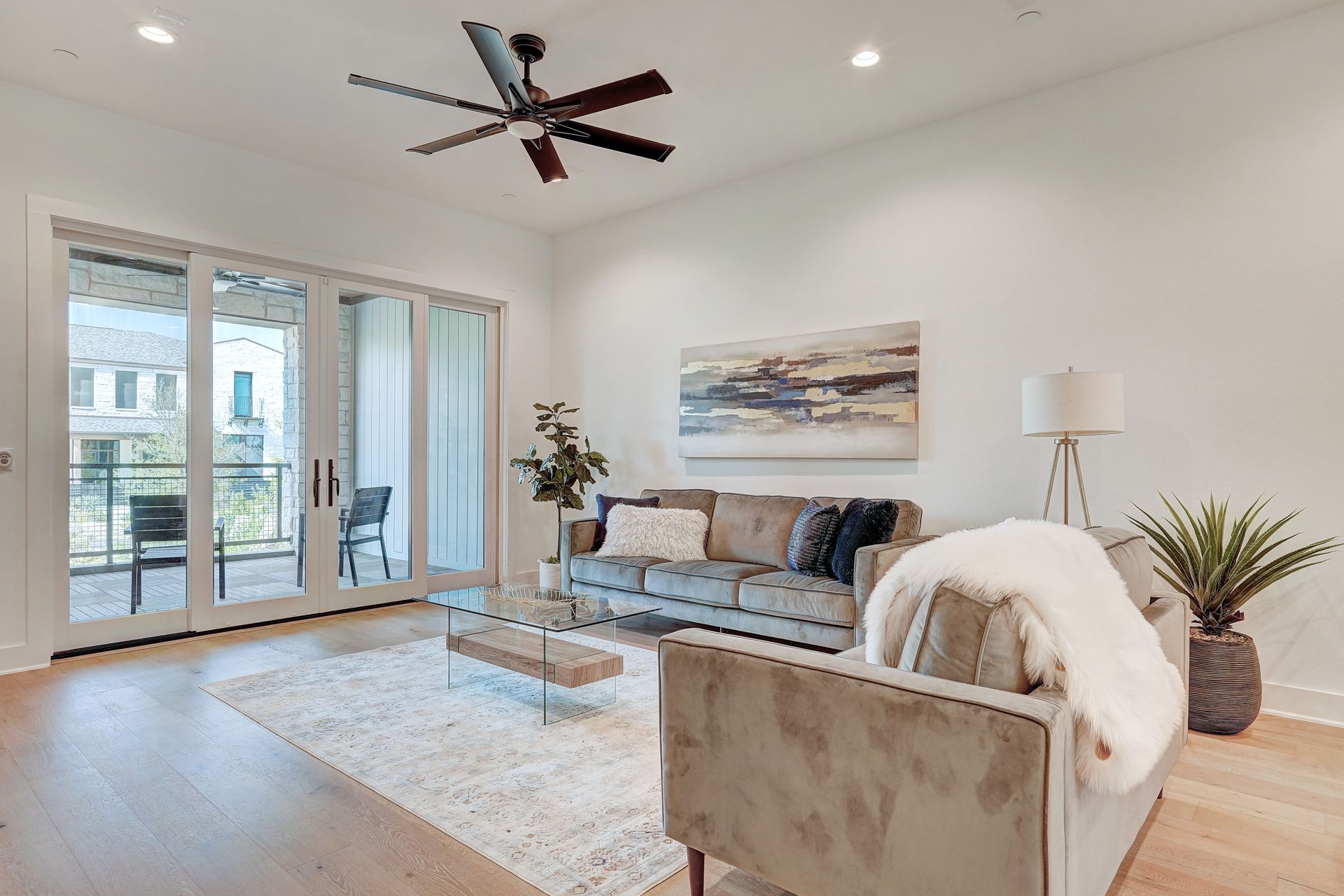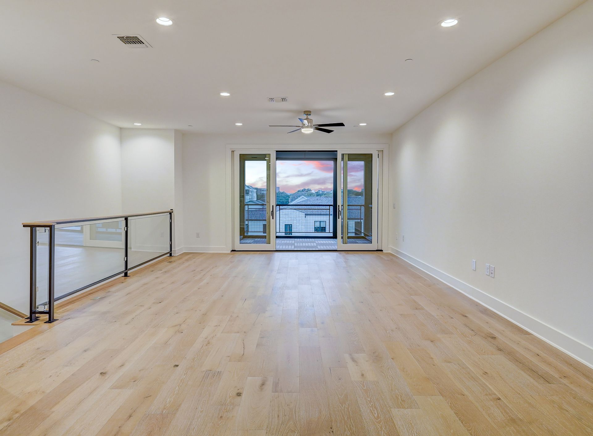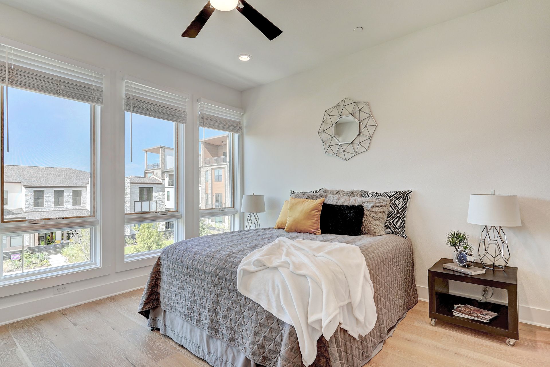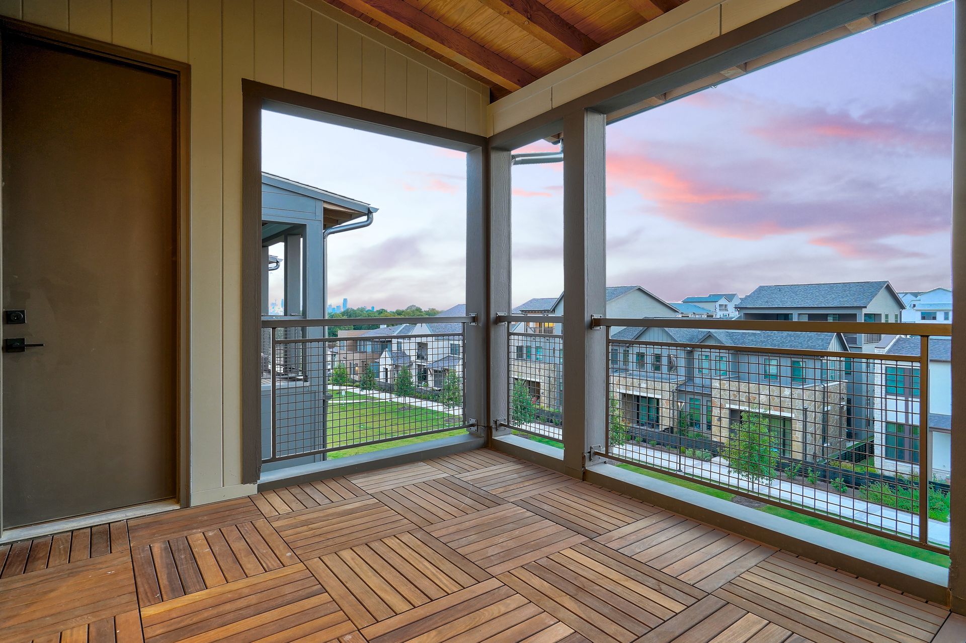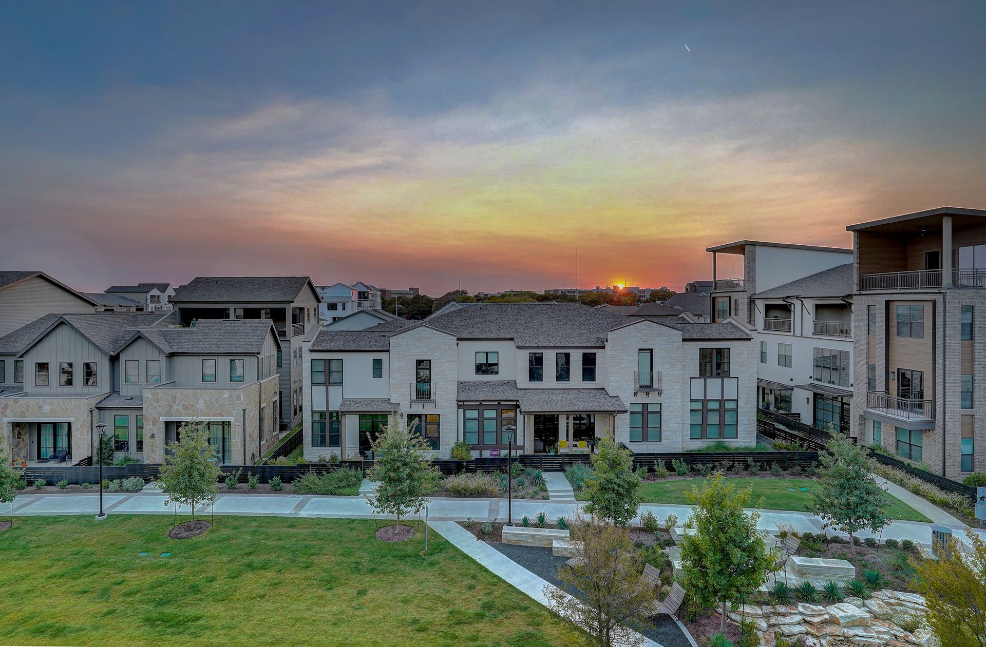 This stunning luxury townhome is ready for immediate move-in. The Grove is centrally located five miles from UT, downtown, Zilker, the Capitol & The Domain. Numerous upgraded features including hardwood flooring, herringbone caps on stairs, quartz counters throughout, extra lighting, & fans plus a bonus office nook. The ground level features a fenced front yard, flexible den/office space with a full bath and elevator entrance. The gourmet kitchen has abundant cabinets, backsplash, pantry, and an oversized island. The large dining and living rooms unfold onto a large covered balcony. Endless owner's suite with double vanities, separate shower & tub and a massive custom-built walk-in closet. The top floor has a bedroom/bath plus an enormous bonus room that opens to a covered deck. Enjoy incredible downtown views & watch the gorgeous sunset! Walking distance to hiking & bike trails, ponds, manicured green space and parks with shops and dining coming soon. Don't miss this amazing residence in the heart of Austin!