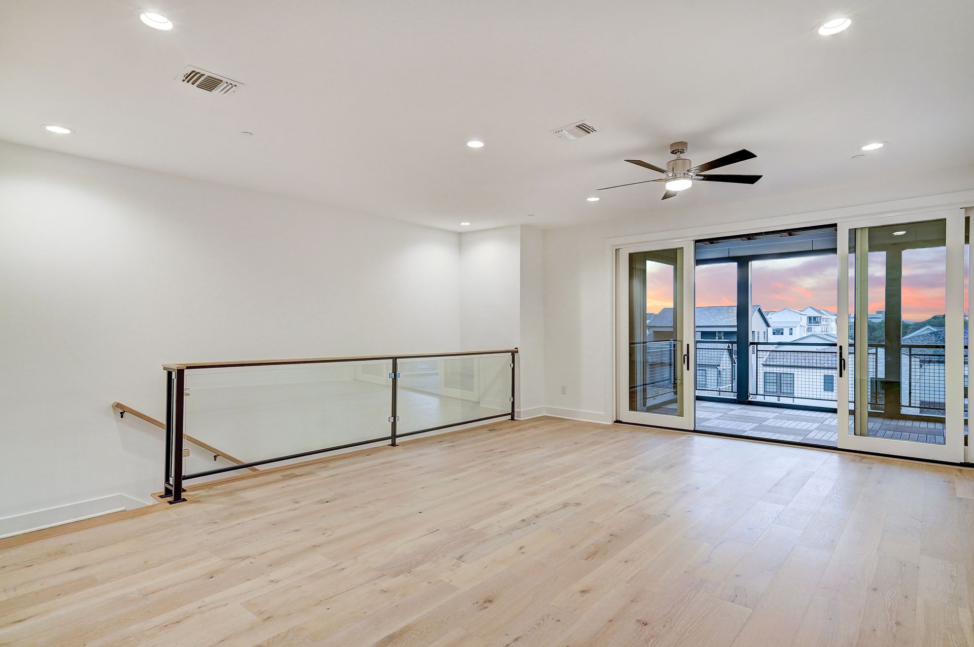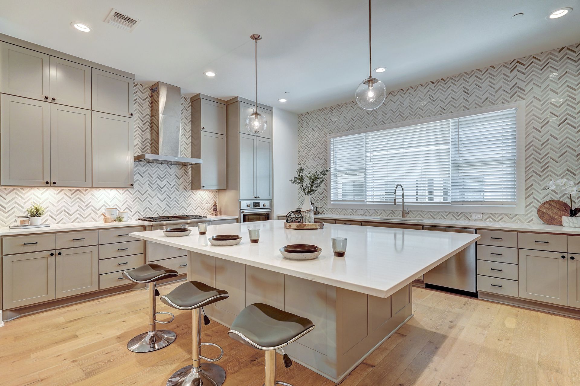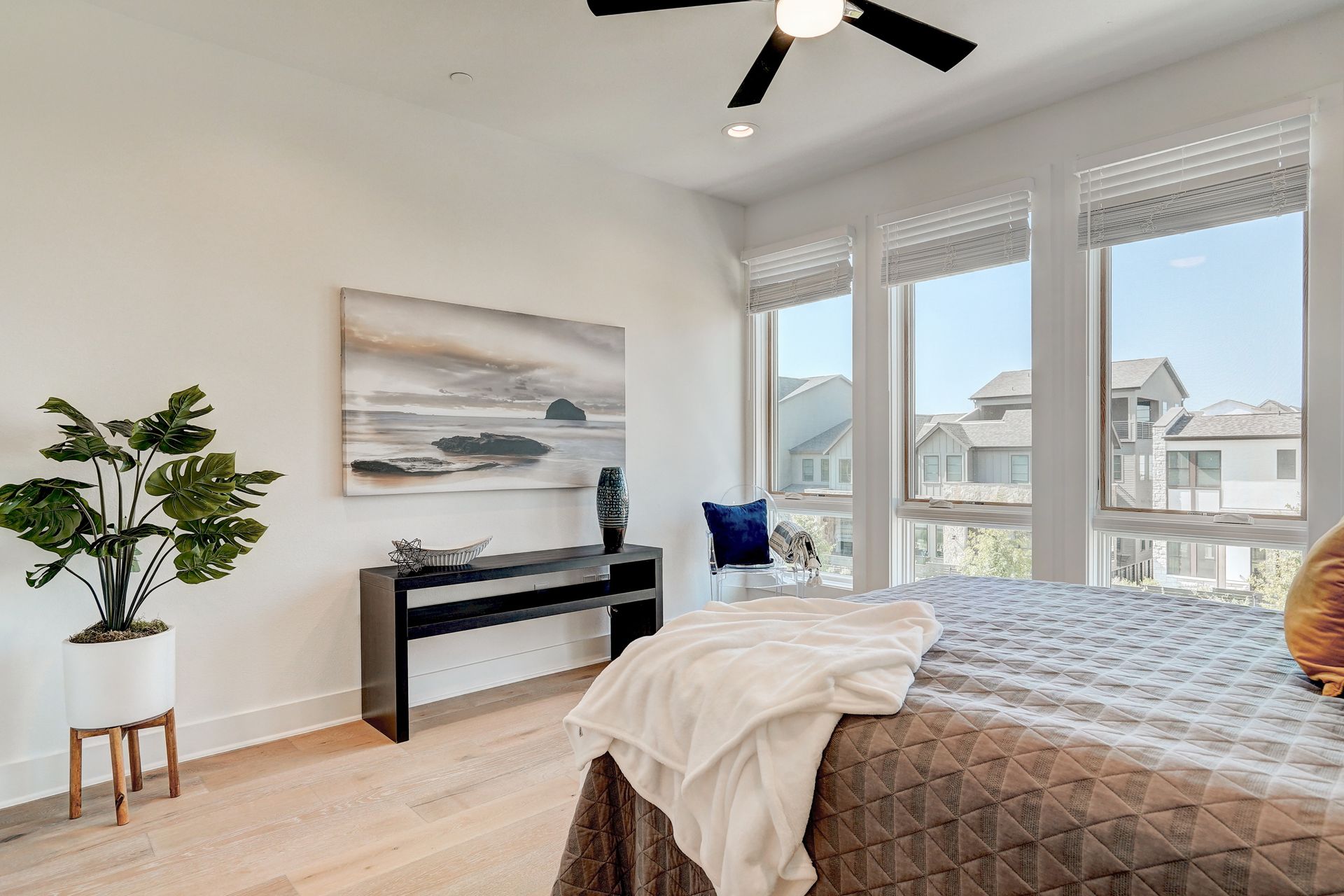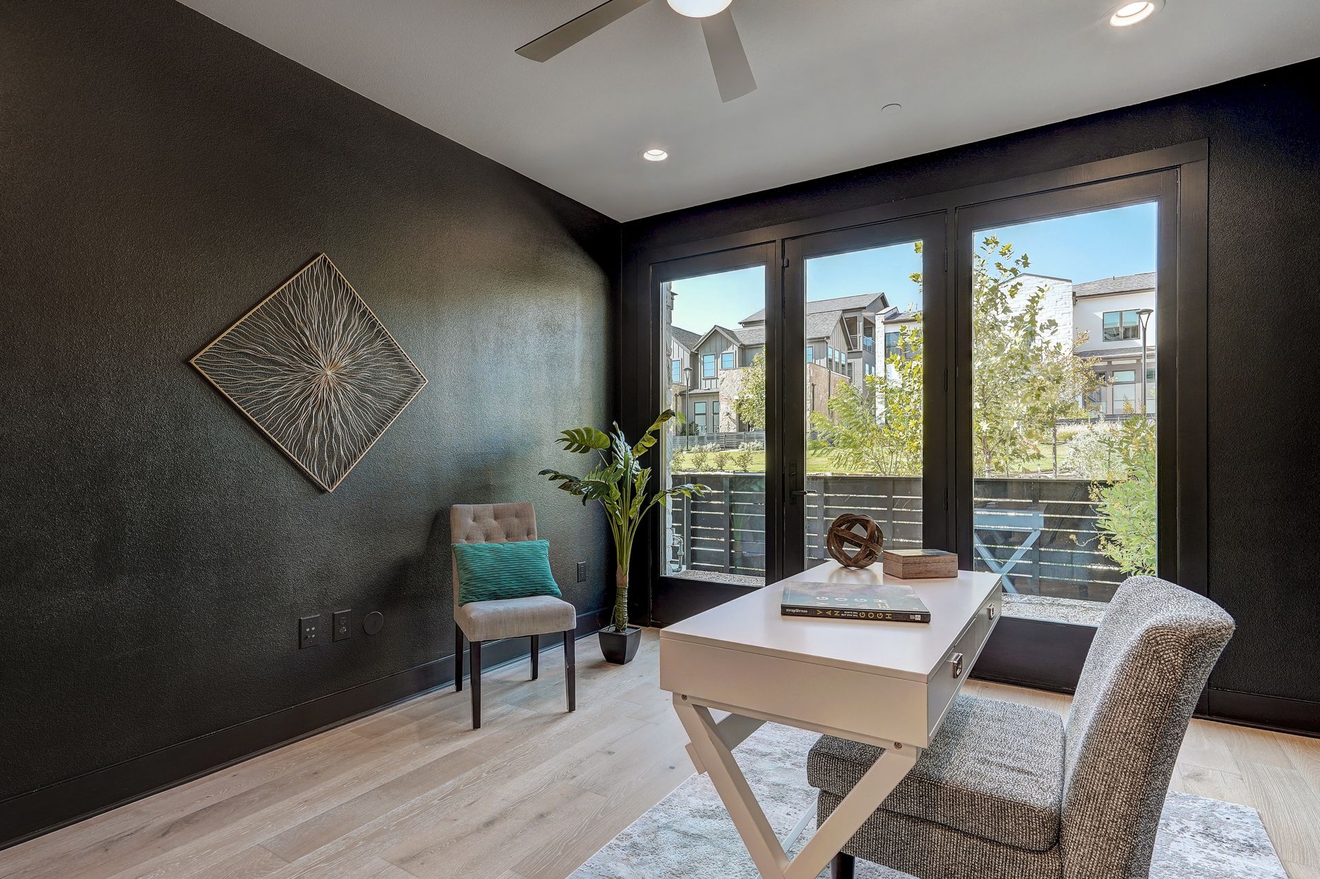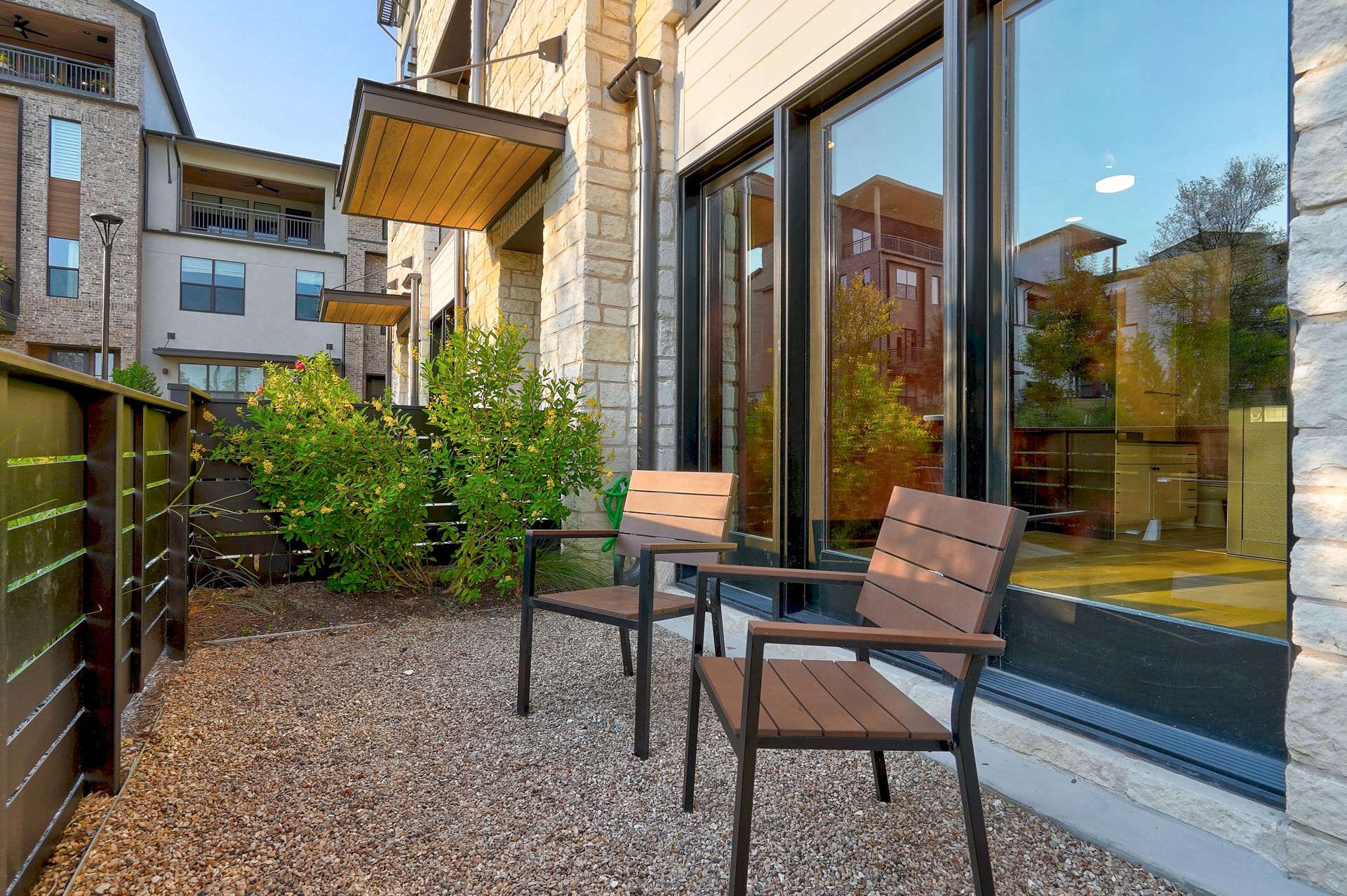 This stunning luxury townhome is ready for immediate move-in. The Grove is centrally located five miles from UT, downtown, Zilker, the Capitol & The Domain. Numerous upgraded features including hardwood flooring, herringbone caps on stairs, quartz counters throughout, extra lighting, & fans plus a bonus office nook. The ground level features a fenced front yard, flexible den/office space with a full bath and elevator entrance. The gourmet kitchen has abundant cabinets, backsplash, pantry, and an oversized island. The large dining and living rooms unfold onto a large covered balcony. Endless owner's suite with double vanities, separate shower & tub and a massive custom-built walk-in closet. The top floor has a bedroom/bath plus an enormous bonus room that opens to a covered deck. Enjoy incredible downtown views & watch the gorgeous sunset! Walking distance to hiking & bike trails, ponds, manicured green space and parks with shops and dining coming soon. Don't miss this amazing residence in the heart of Austin!