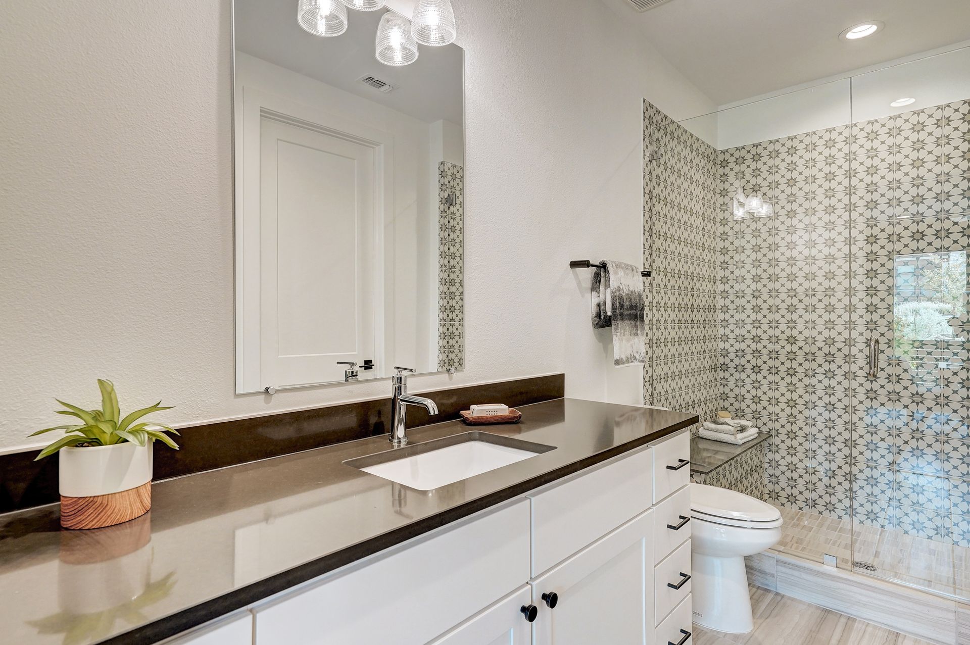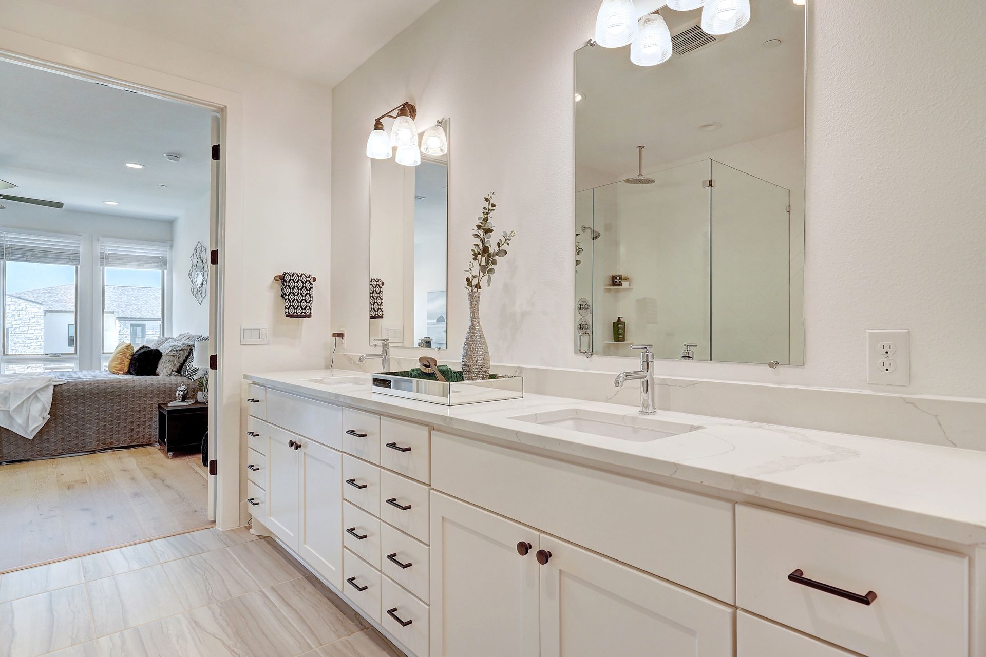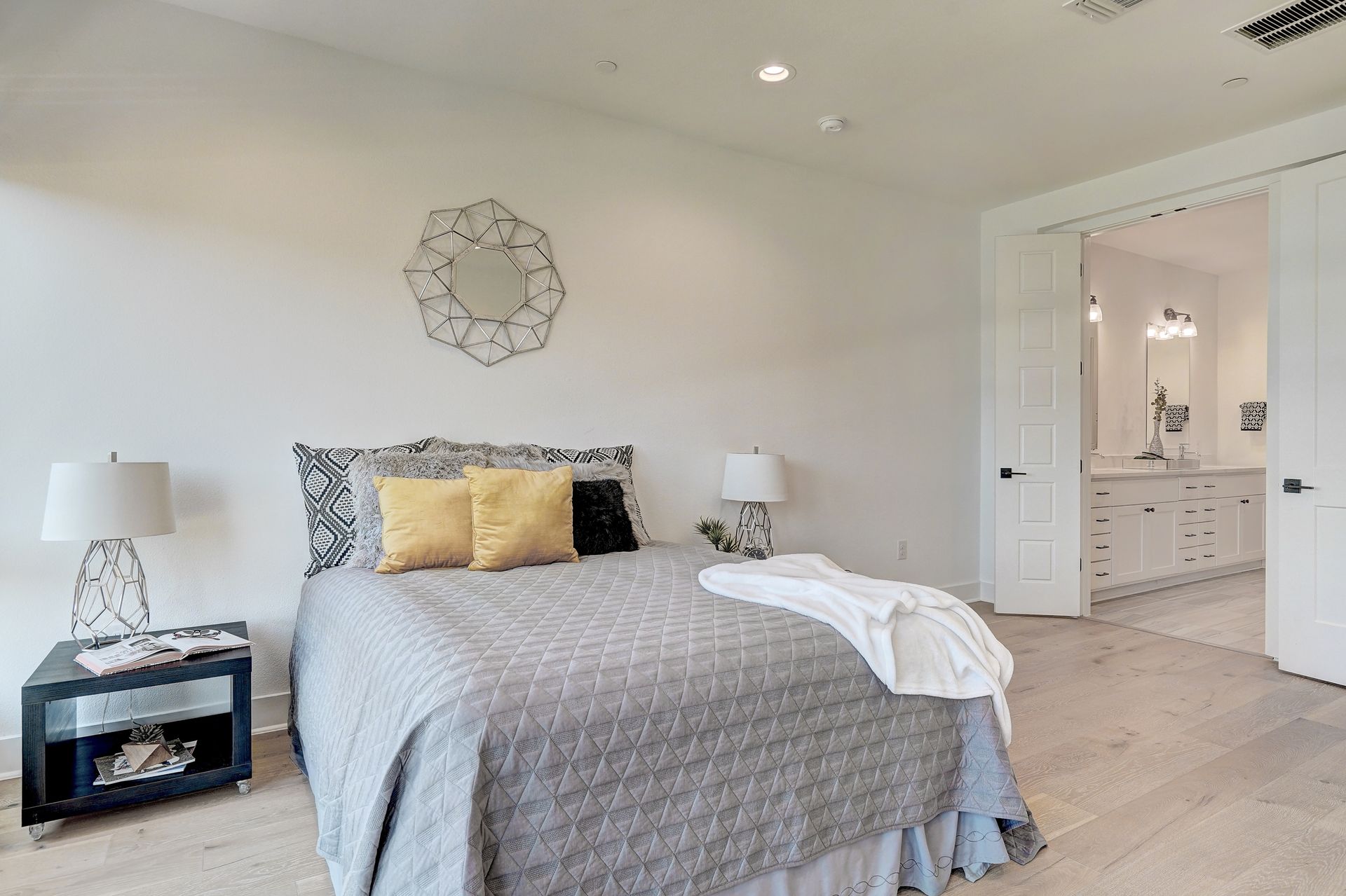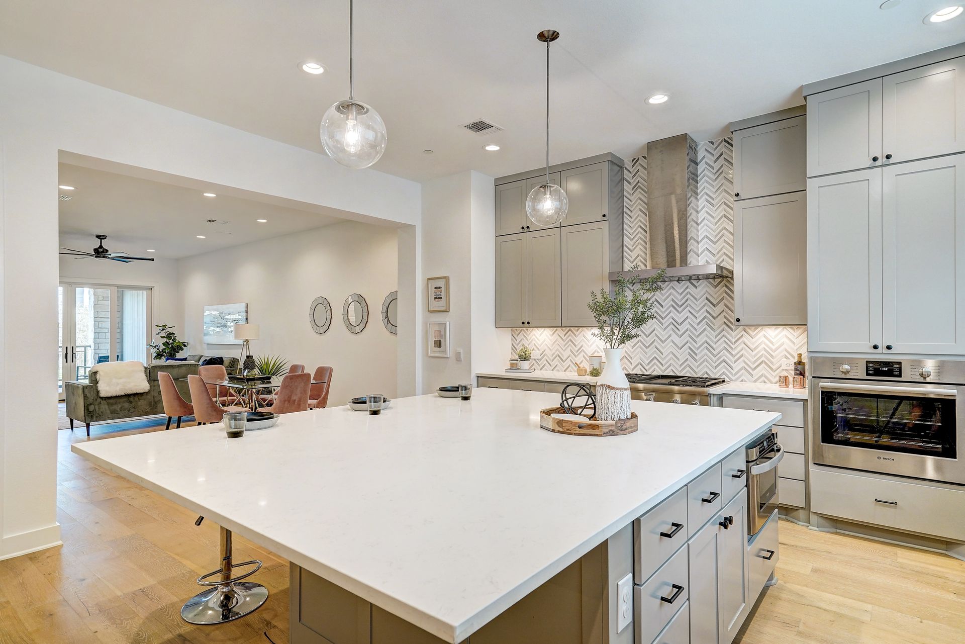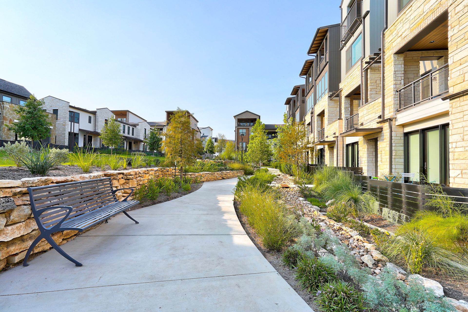 This stunning luxury townhome is ready for immediate move-in. The Grove is centrally located five miles from UT, downtown, Zilker, the Capitol & The Domain. Numerous upgraded features including hardwood flooring, herringbone caps on stairs, quartz counters throughout, extra lighting, & fans plus a bonus office nook. The ground level features a fenced front yard, flexible den/office space with a full bath and elevator entrance. The gourmet kitchen has abundant cabinets, backsplash, pantry, and an oversized island. The large dining and living rooms unfold onto a large covered balcony. Endless owner's suite with double vanities, separate shower & tub and a massive custom-built walk-in closet. The top floor has a bedroom/bath plus an enormous bonus room that opens to a covered deck. Enjoy incredible downtown views & watch the gorgeous sunset! Walking distance to hiking & bike trails, ponds, manicured green space and parks with shops and dining coming soon. Don't miss this amazing residence in the heart of Austin!