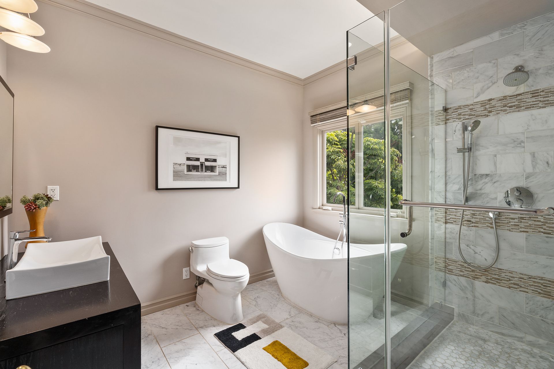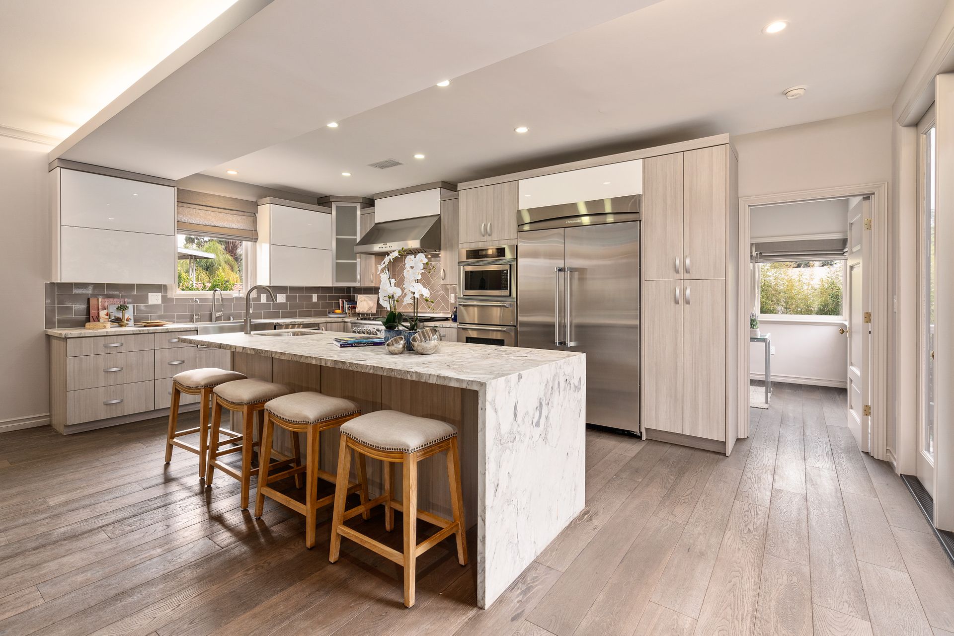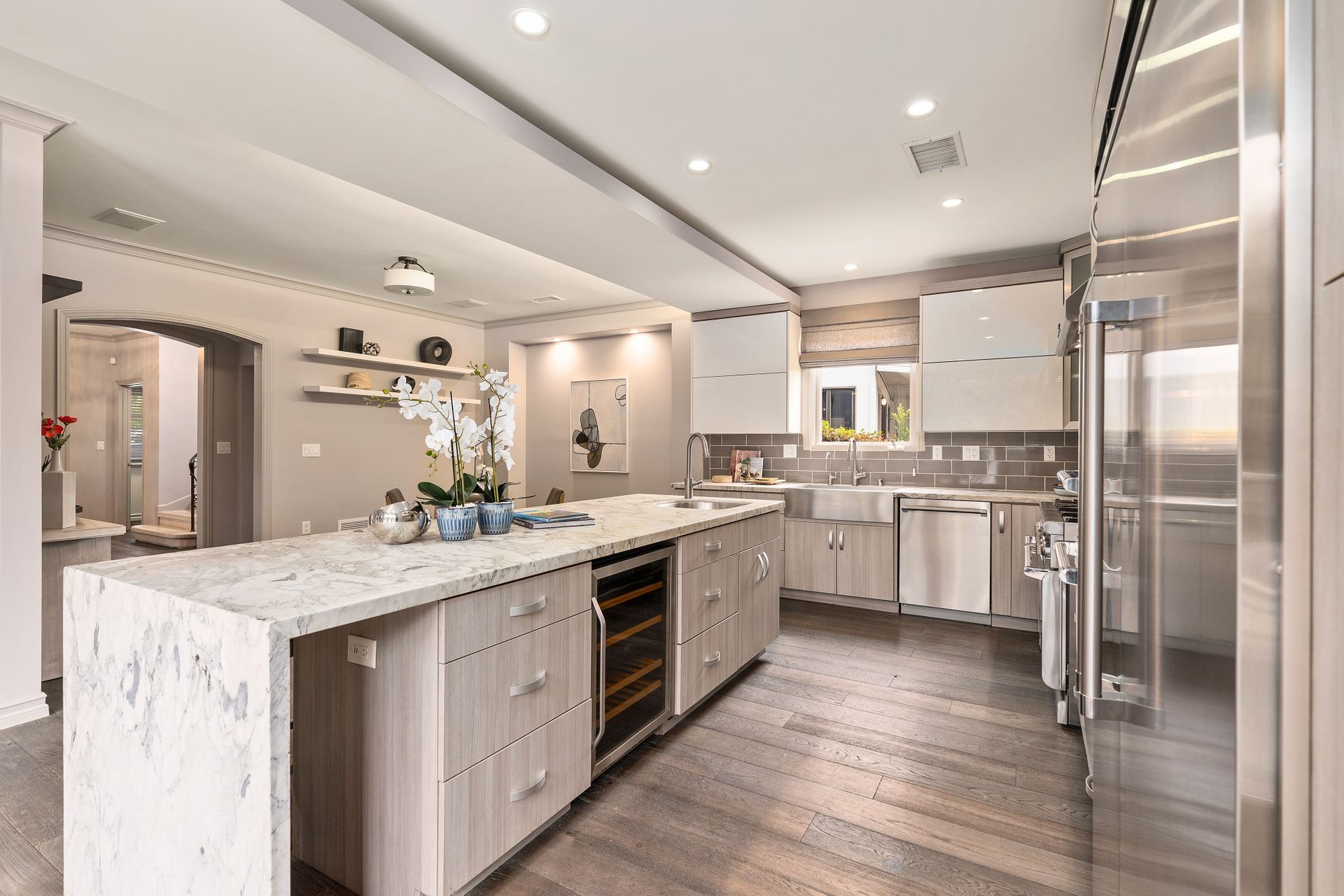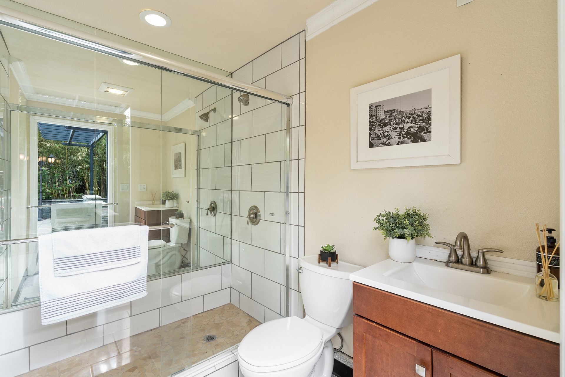 As you enter through the front door, be prepared to expect the unexpected. This updated, modern home, featuring four bedrooms, five baths will be sure to impress and wow you. Your own private Shangri-La awaits. Entering through the front door you are welcomed by the grand staircase, stained glass window and inlaid tile in the foyer. You will then be drawn through the home to the French doors onto a large entertainer’s deck leading you to the lush, terraced and landscaped backyard with a private saltwater pool and spa. Features of the home include two master suites...each with a walk-in closet and deep soaking tubs. Enjoy the charm and coziness provided by the two fireplaces...one that anchors the living room and the other in the front master suite. For the epicurean a large cook’s kitchen awaits you complete with a grand center island, Thermador suite of stainless-steel appliances, a breakfast area and an Edgestein wine refrigerator. Other features of the home include a wine cellar, outlets for up to three electrical vehicle charging stations, solar panels, an outdoor gas barbecue, gas fire pit and a separate room off the pool area ideal for home gym, office, yoga/zen retreat. The two-car garage is equipped with built-in work and storage cabinets along with your own air compressor. Private and gated.