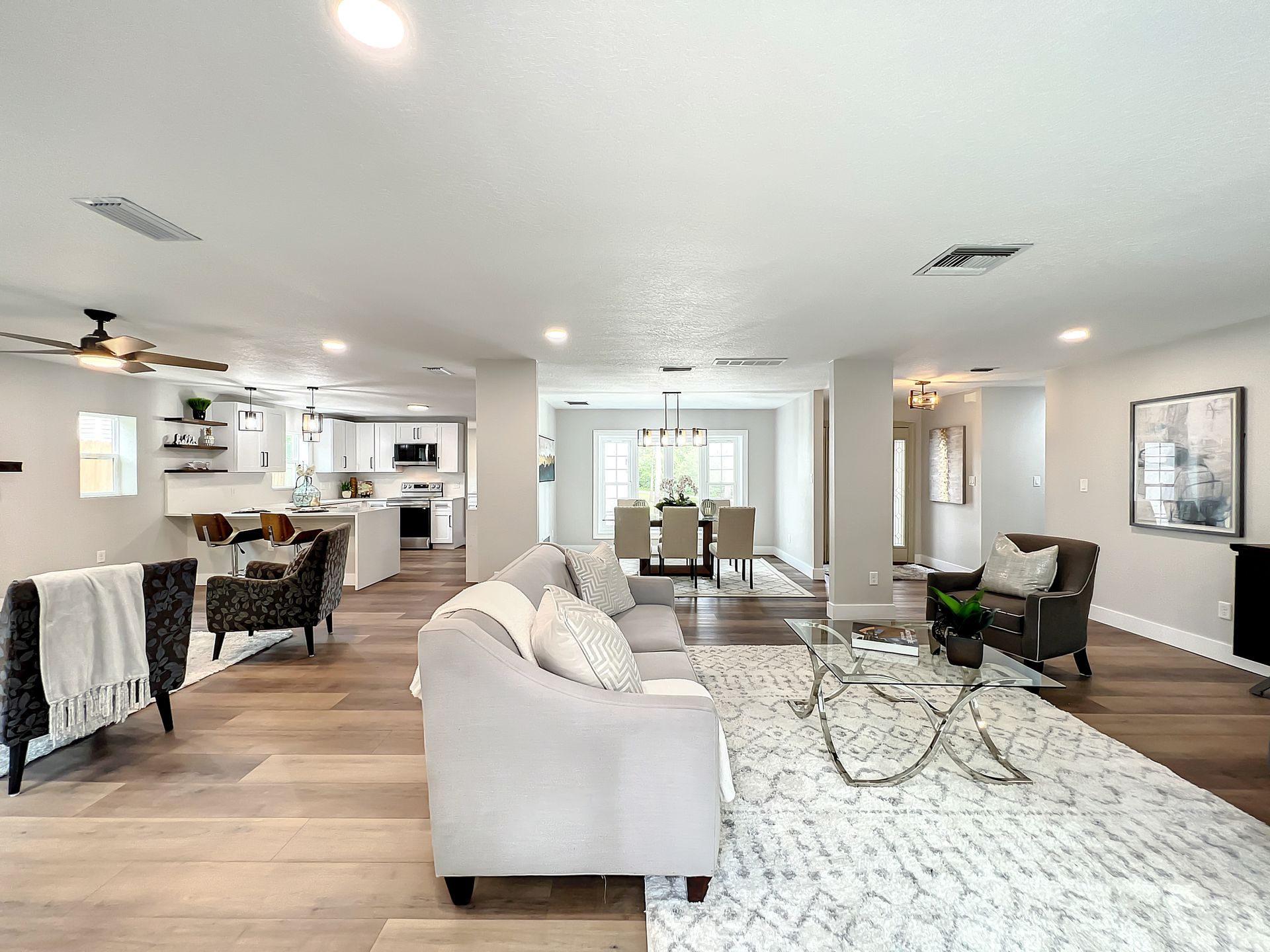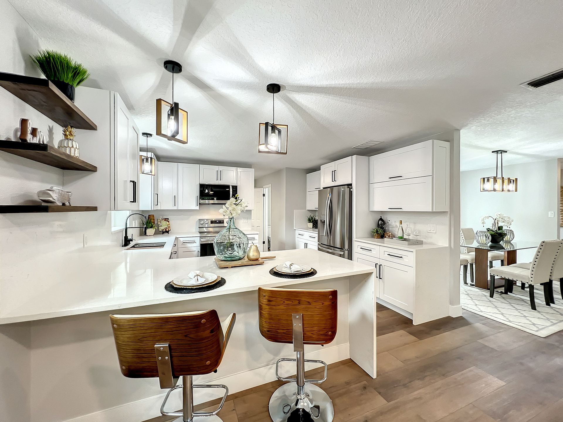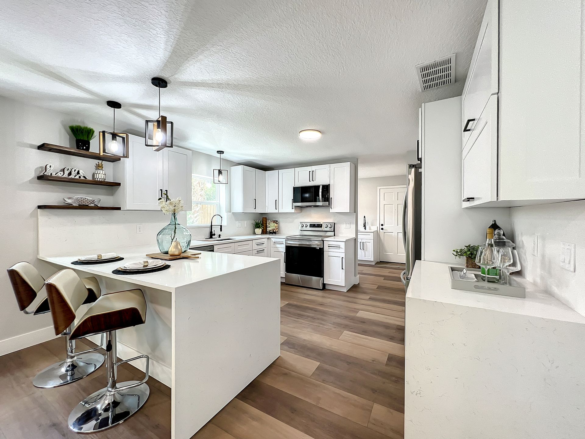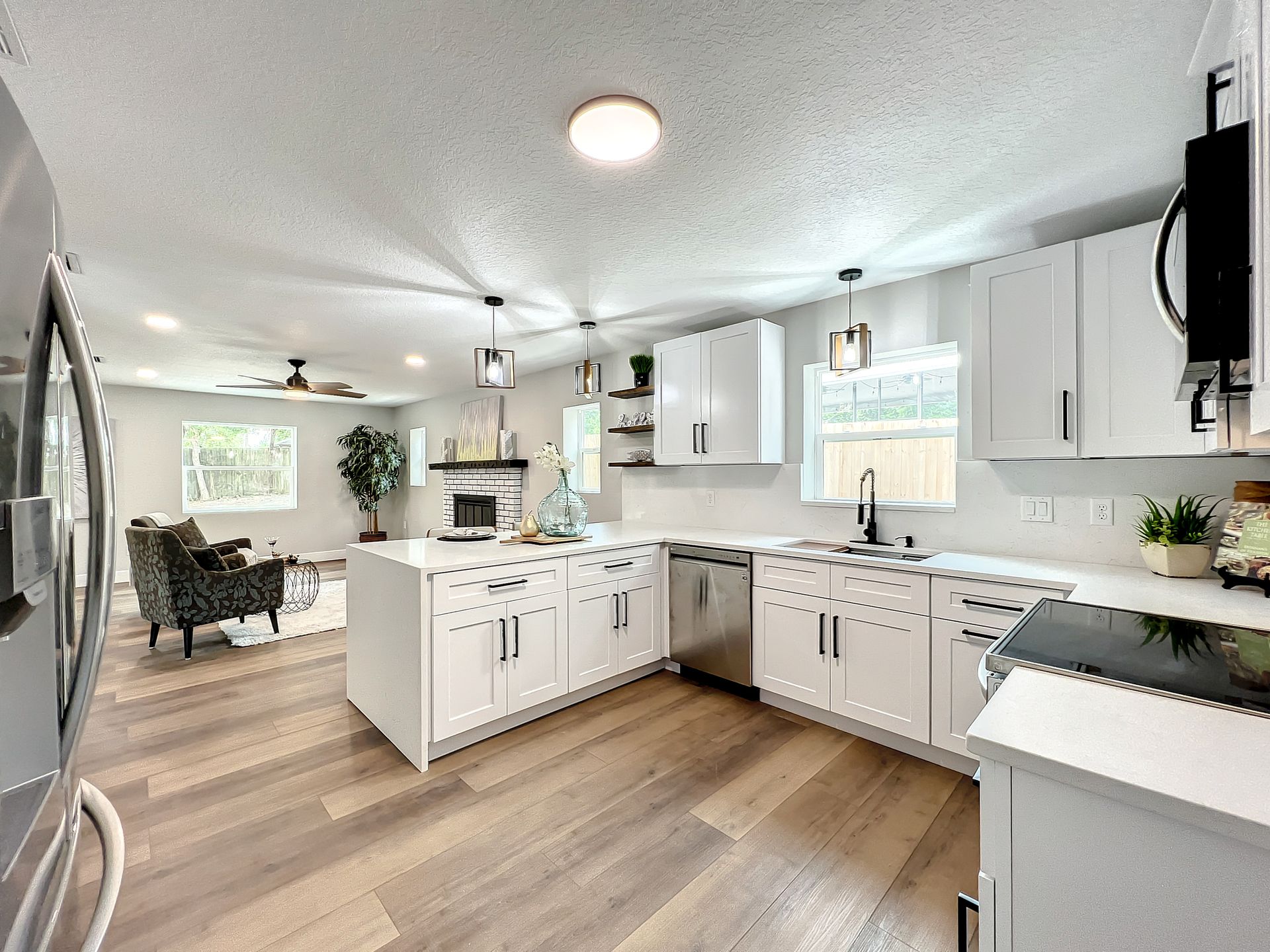 Extraordinary and Stunning family home nestled in the desirable and highly sought-after Sanlando Springs Subdivision. Remarkable property that is tastefully renovated and absolutely gorgeous with luxurious and modern finishes. As you step into the foyer, you will be captivated with the open and practical living space. The living room enjoys double sliding patio doors and great view of the outdoor living areas by the patio and private backyard. The dining room is open to the living room and overlooks the front yard via the beautiful bay window. The charming family room provides cozy space by the wood burning fireplace. The all new lavish kitchen with solid wood cabinets, Quartz counter tops and backsplash, stainless steel appliances, and a vast peninsula accommodating 4 barstools great for entertainment and family gatherings. The laundry room by the kitchen offers additional cabinets and a pantry. A powder room / half bath is conveniently located by the laundry room and the garage. The charming and spacious Master Suite enjoys a large walk-in closet, 3 windows overlooking the yard and a sliding patio door overlooking the patio and serene backyard. The luxurious all new master bath comes with double sinks and marble shower and matt black fixtures. The 3 additional good sized bedrooms enjoy a hall / guest bathroom with a double sink vanity, and a bathtub shower with white subway tiles. There is plenty of storage space in the hallway closet and the large linen closet. You will enjoy time in the expansive back yard that could accommodate any outdoor living ideas you would like to implement. The side fenced yard has plenty of room for a boat, RV, or a shed, or event a dog run. Spacious garage with plenty of space for storage or a work bench. Roof 2018, brand new AC in 2023, new electric panel and all new devices and fixtures, upgraded plumbing, new water heater in 2022, new well water equipment in 2022, new sliding doors & some new windows.