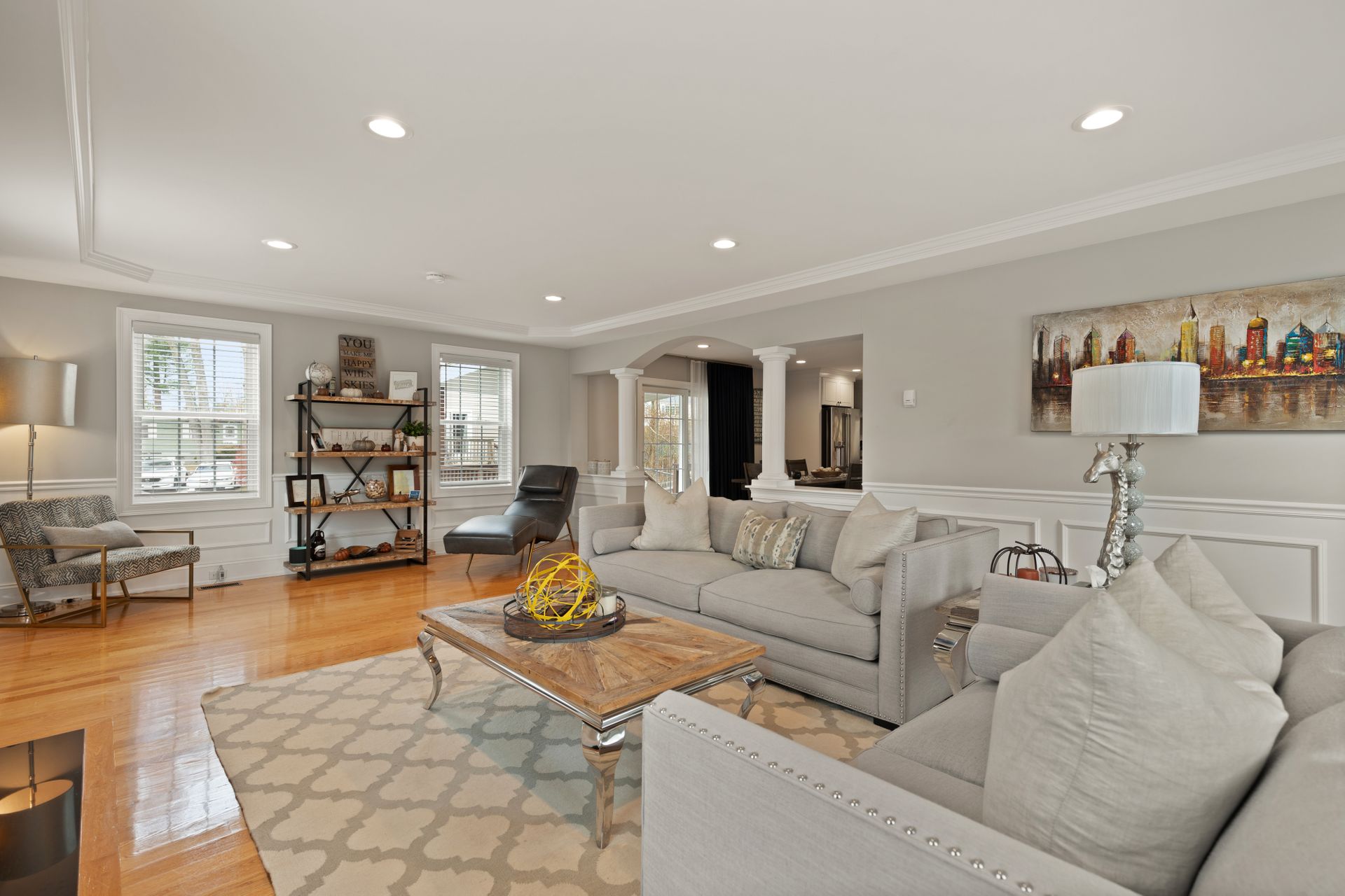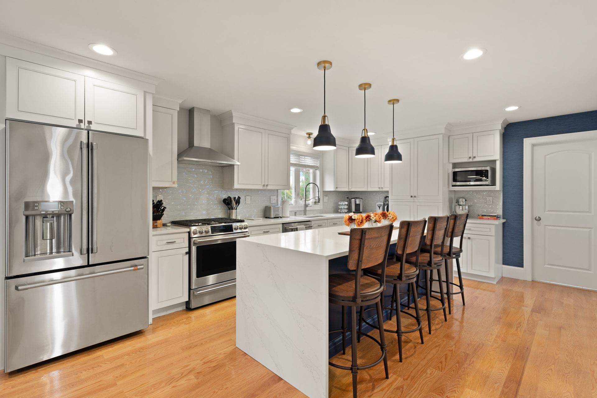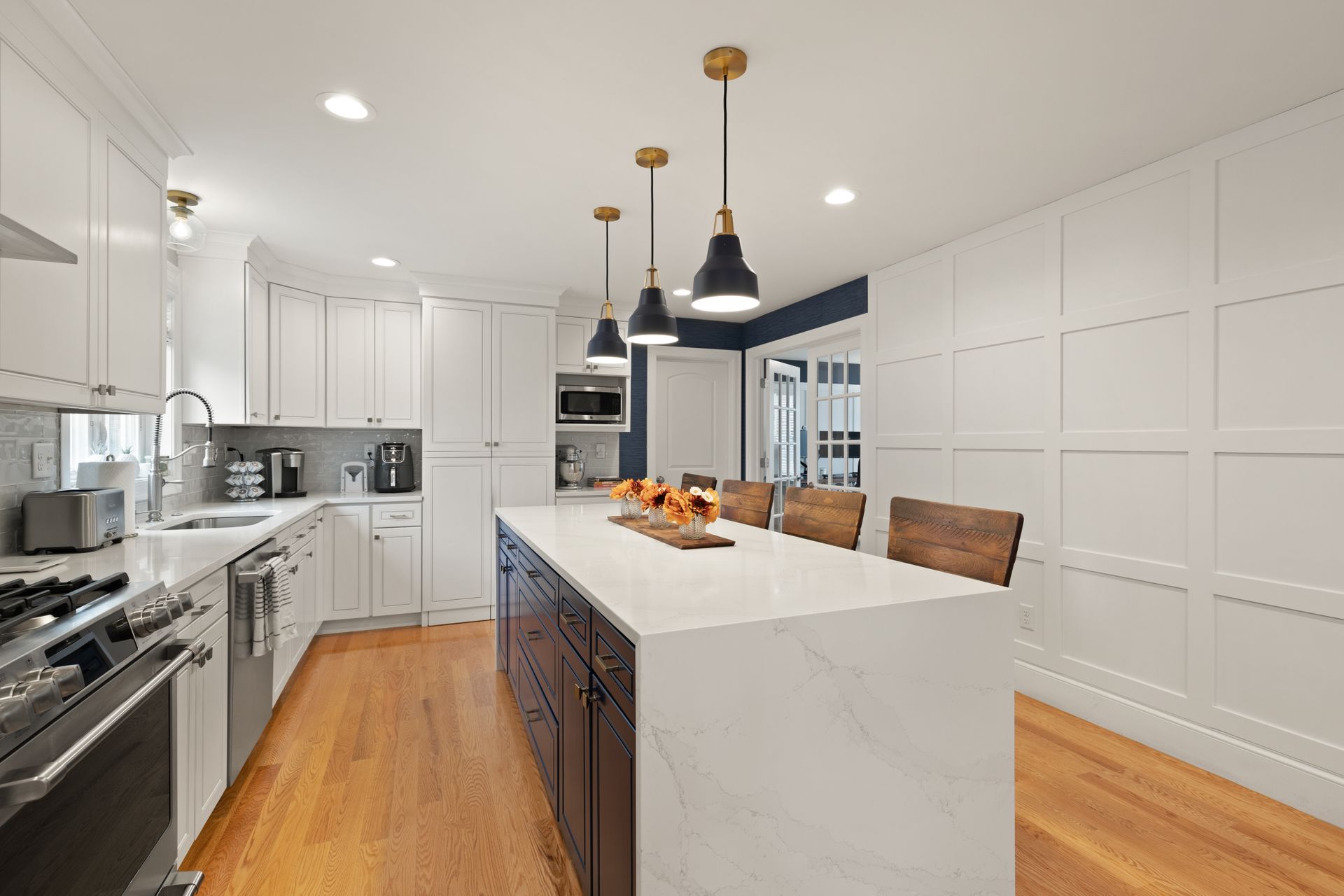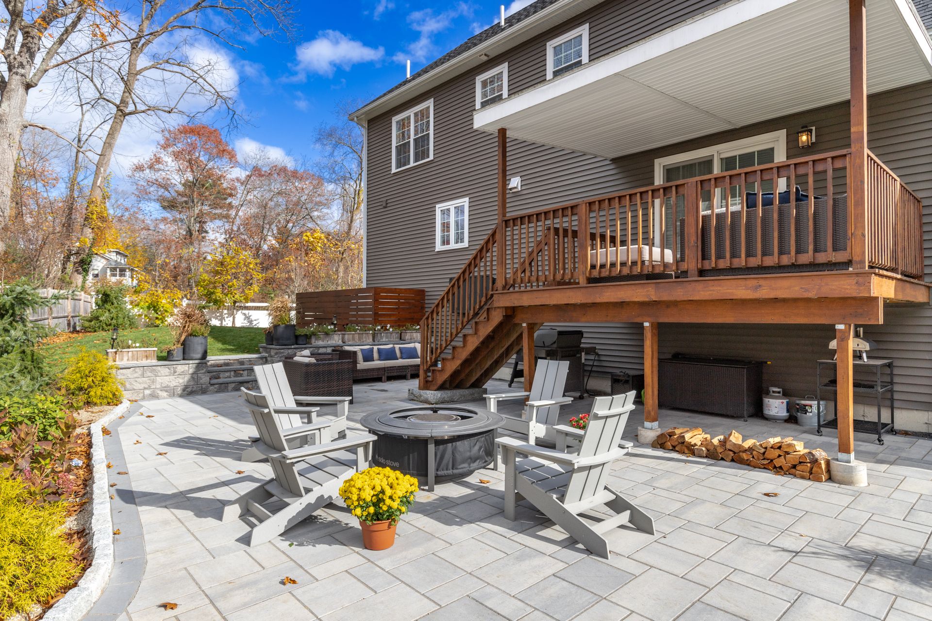Stunning better than new property near the Burlington Line. A welcoming foyer greets you into this home. View your open floor plan with hardwood flooring, separated by pillars and arches between the kitchen, dining and great rooms. Lots of trim with chair rails, shadow boxes and crown molding throughout the first floor accented by recessed lighting. Enter your gorgeous kitchen with an eight-foot island, quartz counters, stainless steel high end Cafe appliances and a huge hideaway pantry. The formal living space doubles as an office with Glass French Doors. The second floor displays a large primary en suite bedroom with gigantic walk-in closet, a bathroom with soaking tub, huge tiled shower, double vanity and granite counters. Main upstairs bath has a double vanity and granite counters. Three Bedrooms round out the second floor. Use the Walk-up attic for future expansion and storage. The surprise is a 1,000 square foot basement unfinished but with a rubber floor, used as a home gym and it's amazing! A Large deck overlooks beautiful mature plantings that will create a beautiful border between yards. The new stone patio of 1,000 square feet enhances the landscaping with impressive walkways and walls creating a magnificent fenced in backyard. Large two car garage and parking for four more cars in the driveway. A one of a kind Colonial!