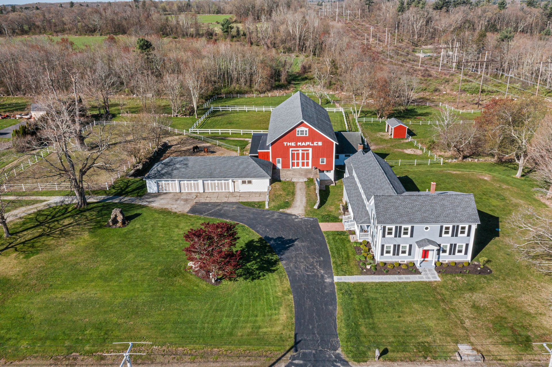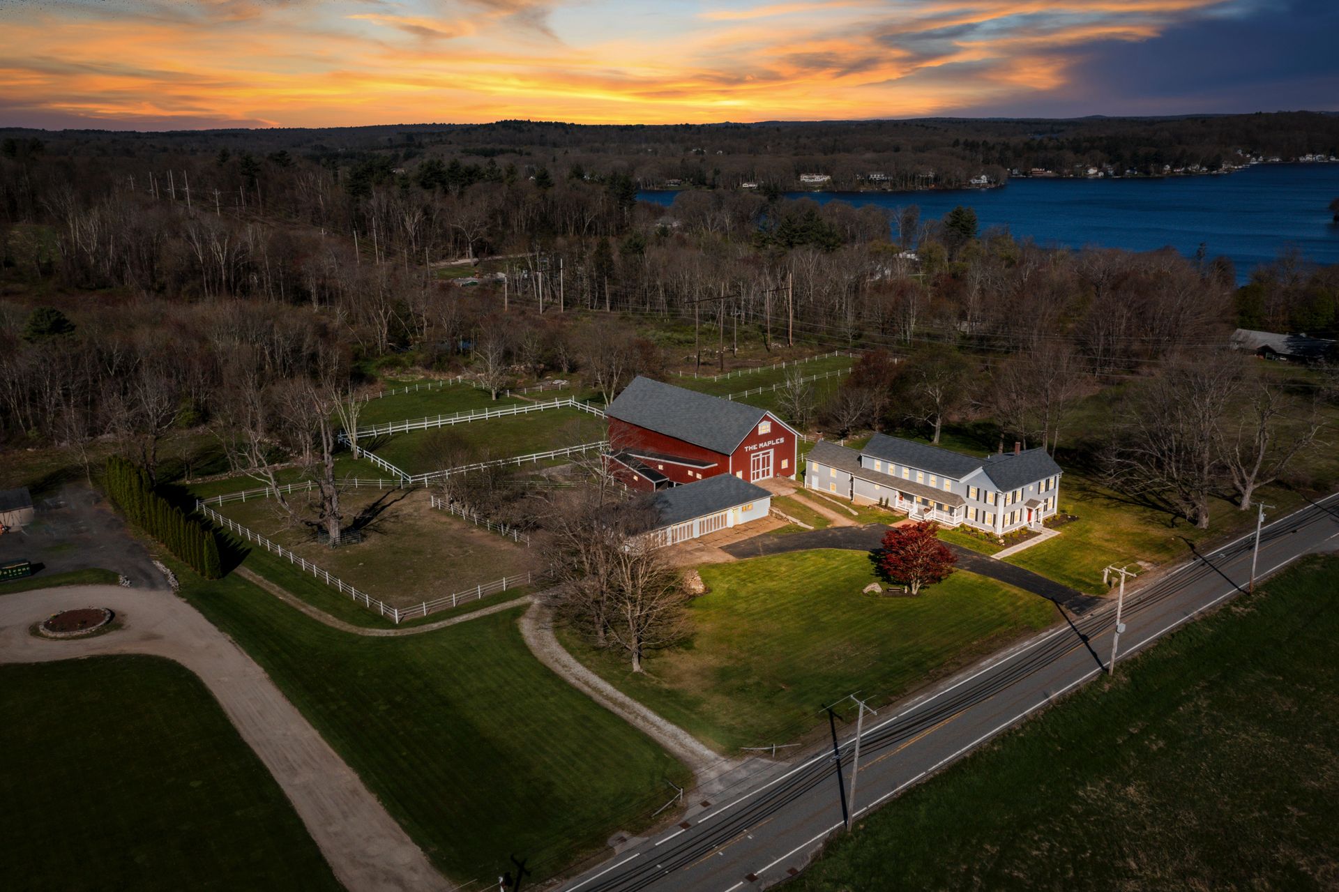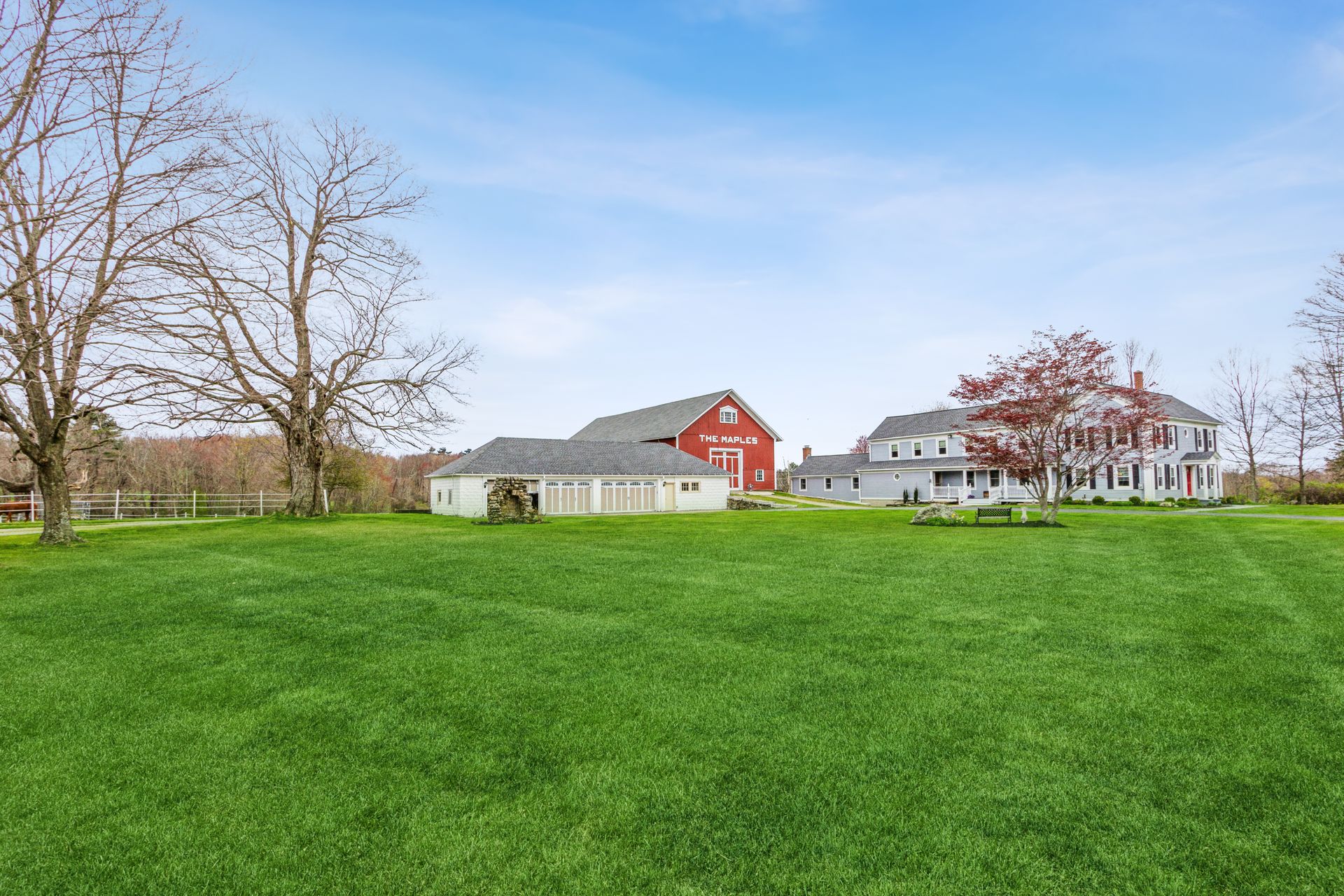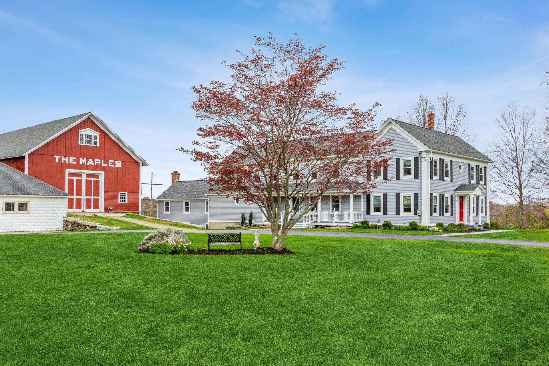 Picturesque and iconic 10+ acre Equestrian property and residence, known as "The Maples" farm will delight you! A beautifully updated and modernized 4,200 square foot Colonial home offers the character of yesteryear with today's amenities. The lovely formal dining room and the massive remodeled Kitchen with granite, stainless steel, dining area and efficient pellet stove make great gathering places! Great Room has beamed vaulted ceilings, stone fireplace and wide plank wood floors! Enormous light-filled primary suite with nine windows has remodeled granite bathroom and walk-in closet. Two more remodeled full baths! This home has been meticulously maintained and has all newer systems, roof and windows. Wonderful three-story 3,700 square foot barn with original hewn wood floors, 10 newer large stalls, tack room, hayloft, enclosed ramp structure, power/water, storage. Lighted 150x100 outdoor arena, two acres of pastures with expansion potential, RAMM fencing and two large Run-Ins. Four plus bay garage! Relax on the spacious patio and enjoy gorgeous scenic views, seasonal lake views and steps to the beach. Just magnificent!