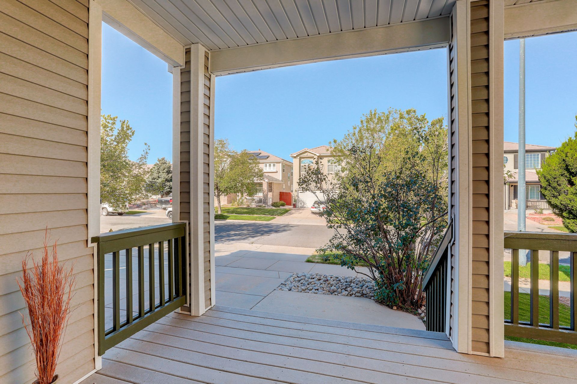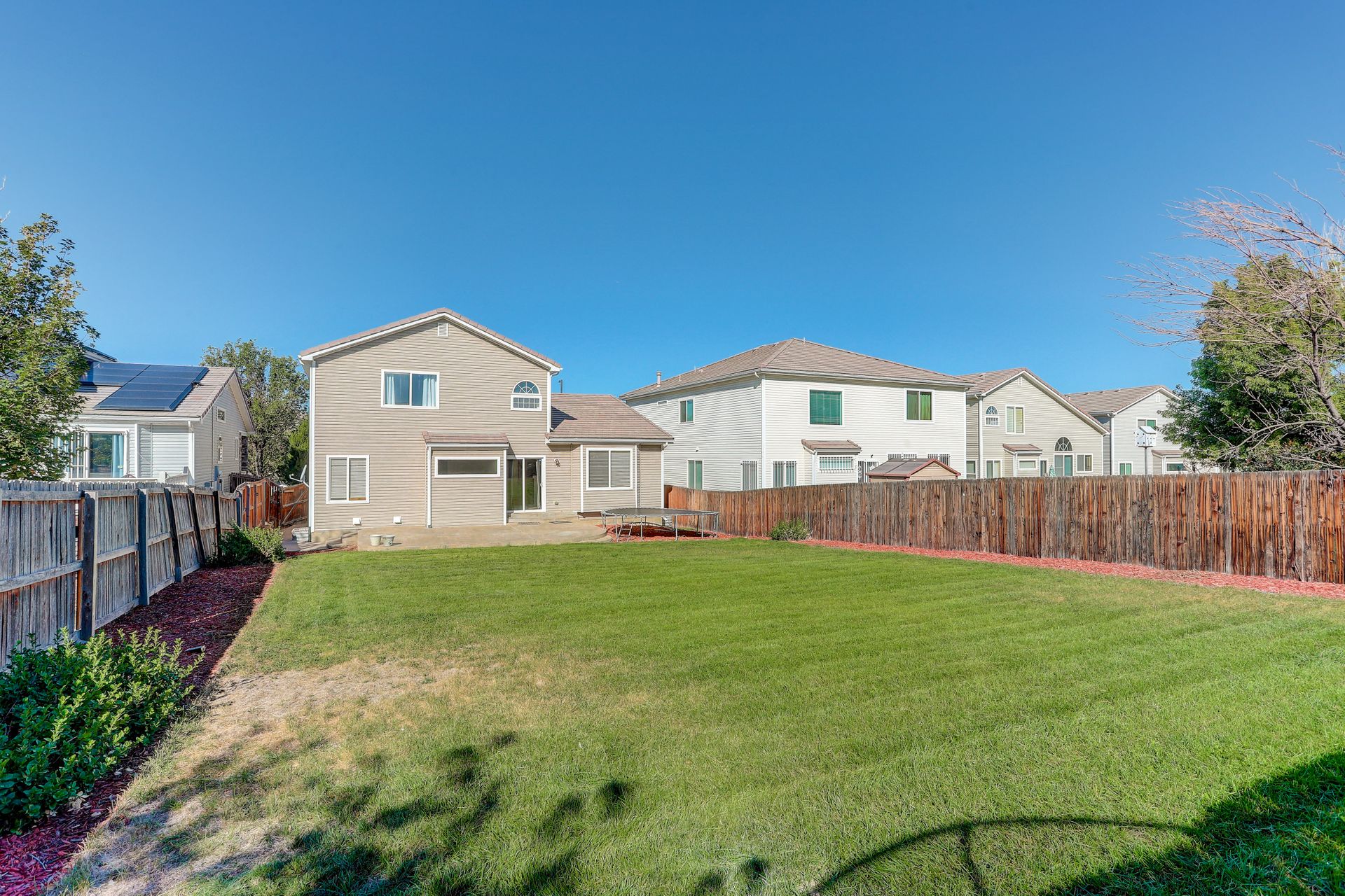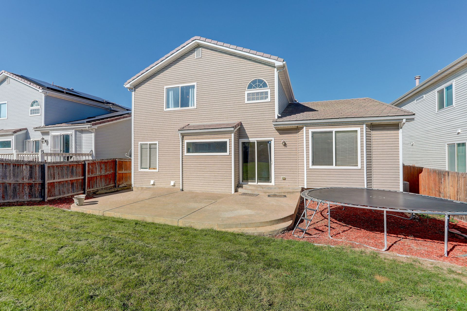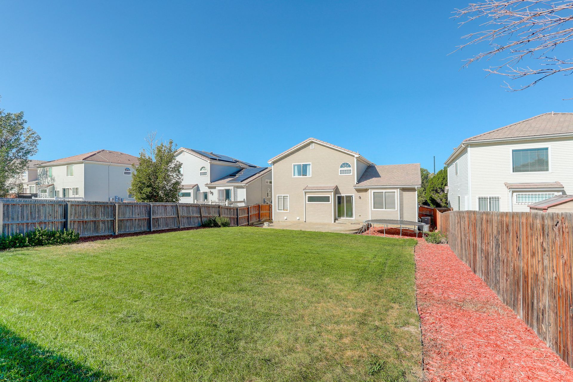 ASSUMABLE VA LOAN AT 3.0%! ($457,000 approx outstanding balance; $2693.21 current PITI.) This Green Valley Ranch light, bright and open two-story has LVP floors throughout the main level and features...kitchen with vaulted ceilings, maple cabinetry, Palladian window, all SS/black appliances included, peninsula with counter bar seating and built-in pantry cabinet...dining area with bay window overlooking the backyard and living room...living room with TV/entertainment center bump out, 5.1 surround sound wiring, corner office space, walkout to patio and easy access to the powder bath with pedestal sink...and main level laundry with storage closet and shelf. Upstairs you'll find the...sunny primary bedroom with French doors, walk-in closet, included TV and ensuite bath with extended vanity, corner garden tub, separate shower, Palladian/glass block window and LVP floor...2nd, 3rd and 4th bedrooms with new carpet and good-sized closets...full hall bath with large vanity and easy-care tub/shower surround. The unfinished basement features 9' ceilings, full bath rough-in and 2 water heaters. Outside, you'll enjoy the...finished and insulated 3-car garage...back patio that's shaded in the afternoon...large, fully fenced backyard with trampoline and sprinkler system...covered front porch...front yard with low maintenance artificial turf...and proximity to neighborhood parks and schools. Green Valley Ranch is conveniently located near to shopping, dining, I-70, 470 and DIA, too!