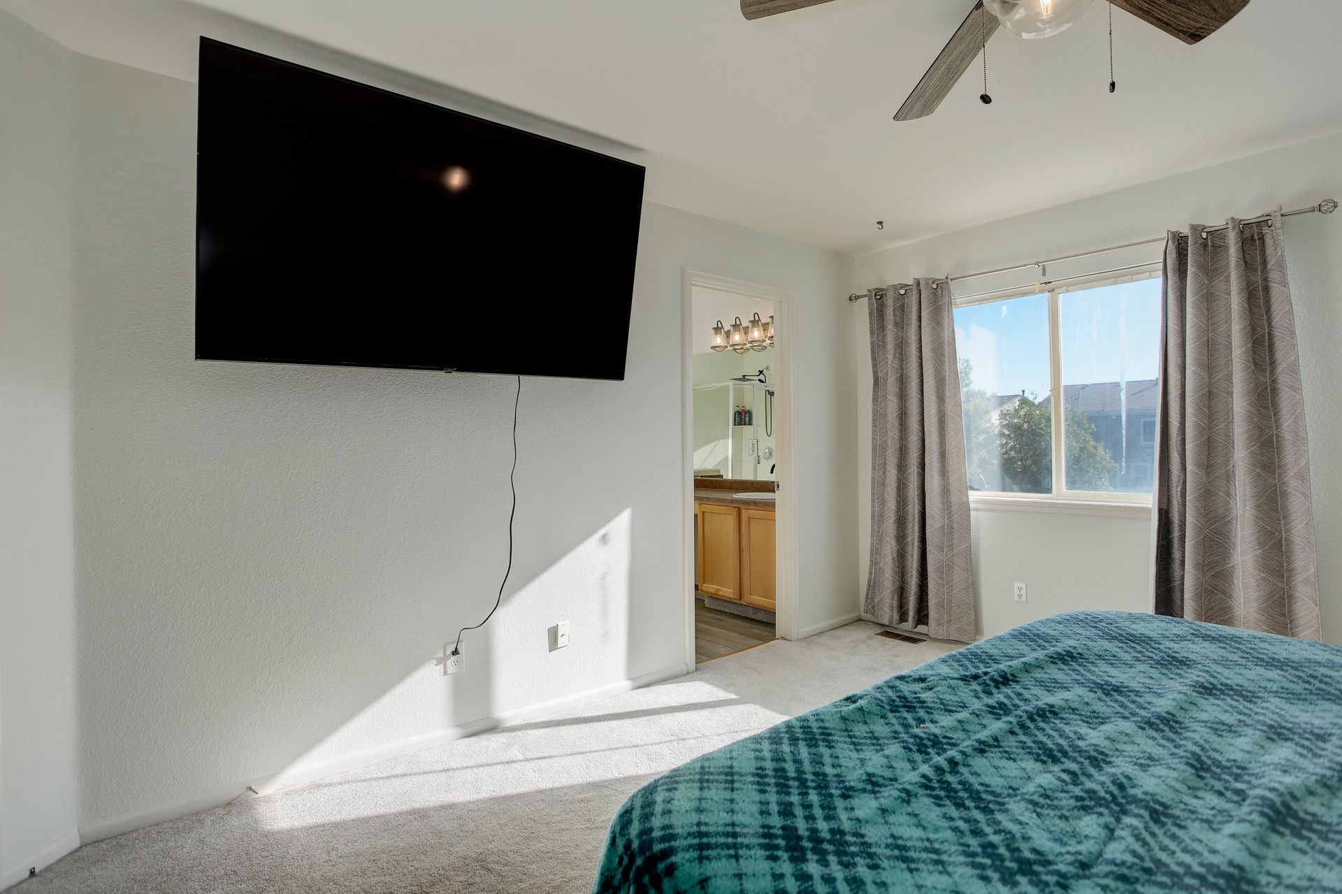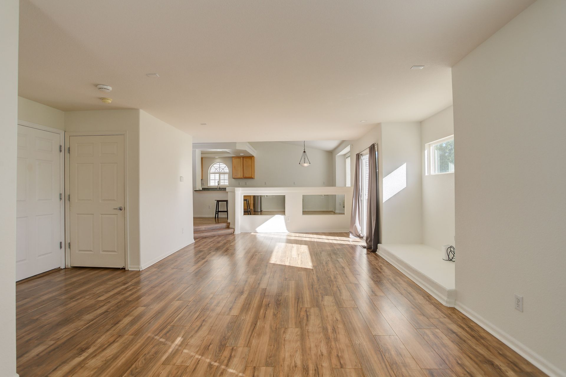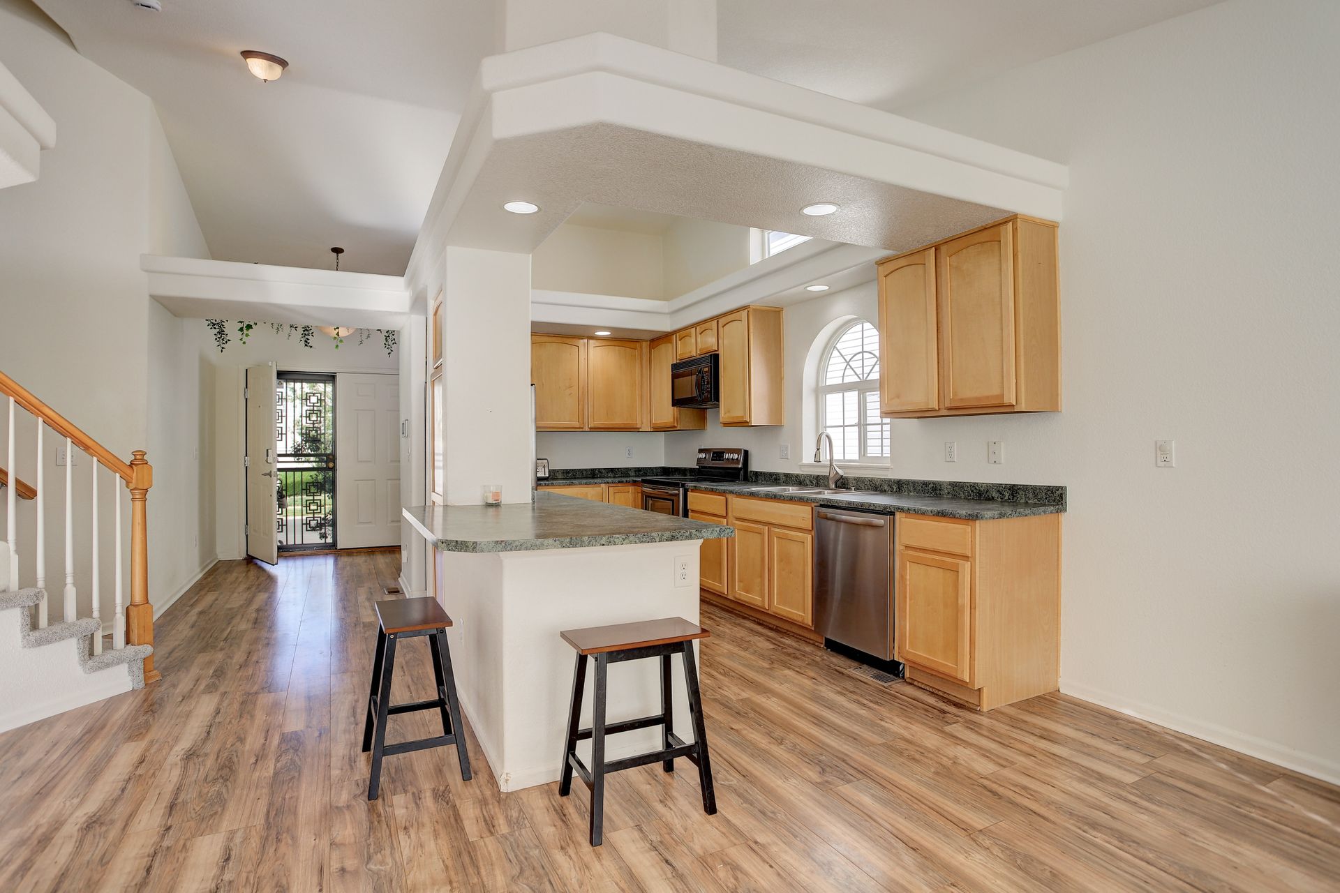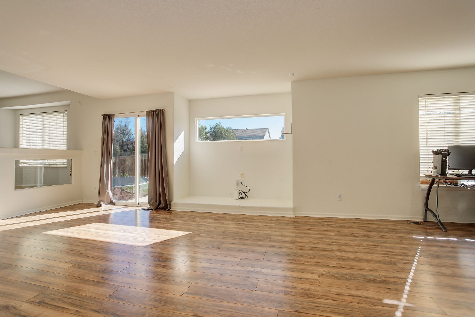 ASSUMABLE VA LOAN AT 3.0%! ($457,000 approx outstanding balance; $2693.21 current PITI.) This Green Valley Ranch light, bright and open two-story has LVP floors throughout the main level and features...kitchen with vaulted ceilings, maple cabinetry, Palladian window, all SS/black appliances included, peninsula with counter bar seating and built-in pantry cabinet...dining area with bay window overlooking the backyard and living room...living room with TV/entertainment center bump out, 5.1 surround sound wiring, corner office space, walkout to patio and easy access to the powder bath with pedestal sink...and main level laundry with storage closet and shelf. Upstairs you'll find the...sunny primary bedroom with French doors, walk-in closet, included TV and ensuite bath with extended vanity, corner garden tub, separate shower, Palladian/glass block window and LVP floor...2nd, 3rd and 4th bedrooms with new carpet and good-sized closets...full hall bath with large vanity and easy-care tub/shower surround. The unfinished basement features 9' ceilings, full bath rough-in and 2 water heaters. Outside, you'll enjoy the...finished and insulated 3-car garage...back patio that's shaded in the afternoon...large, fully fenced backyard with trampoline and sprinkler system...covered front porch...front yard with low maintenance artificial turf...and proximity to neighborhood parks and schools. Green Valley Ranch is conveniently located near to shopping, dining, I-70, 470 and DIA, too!