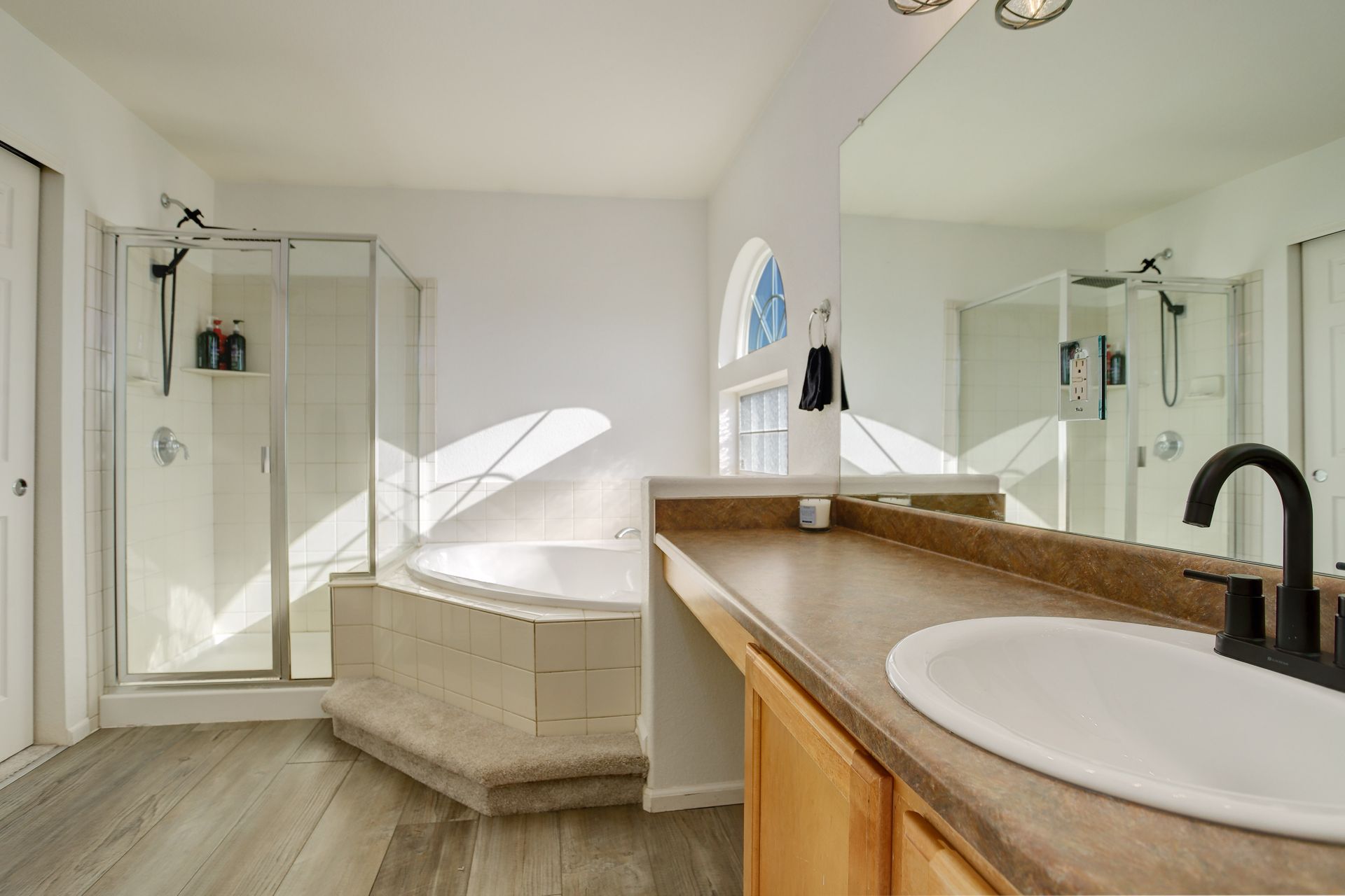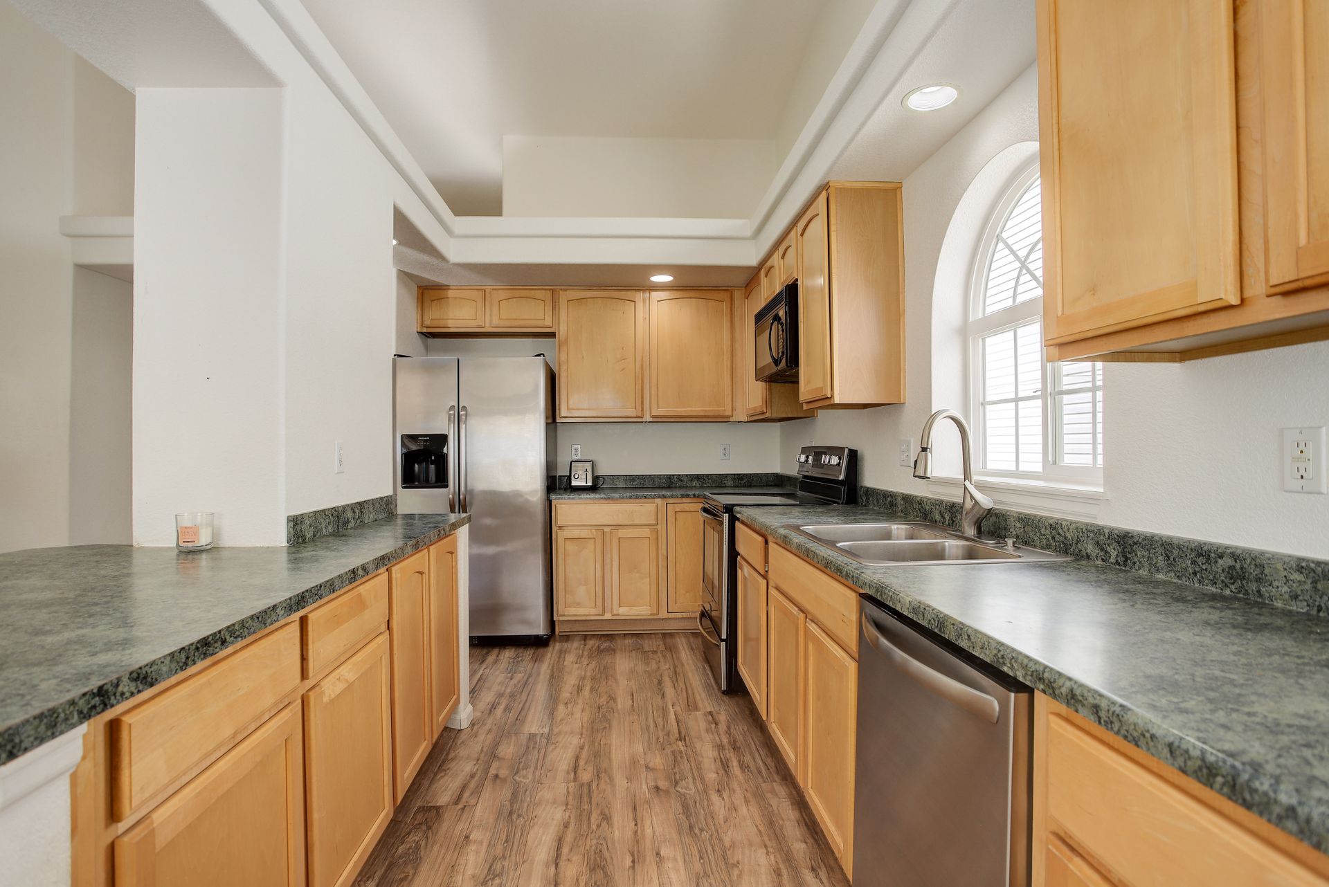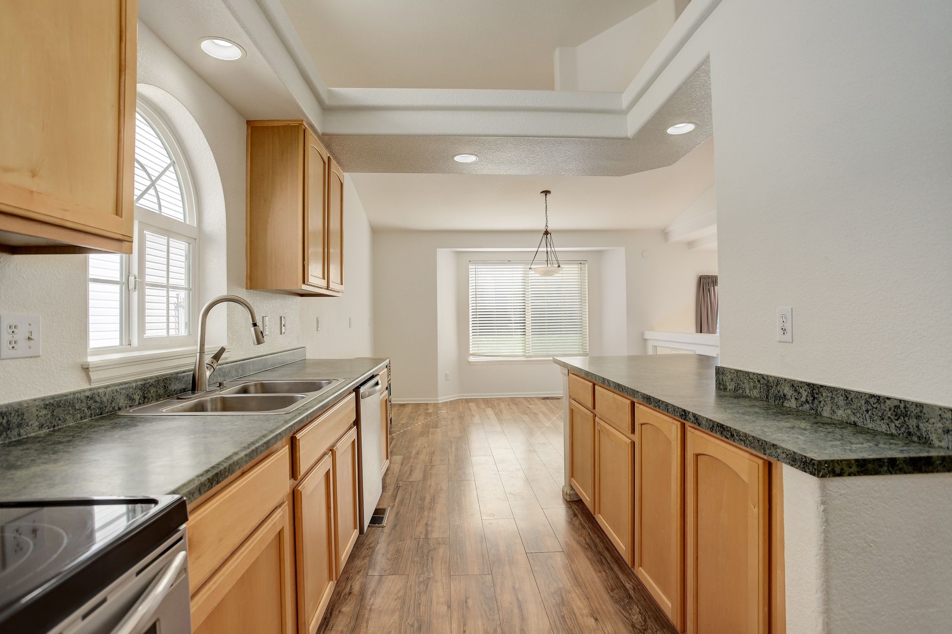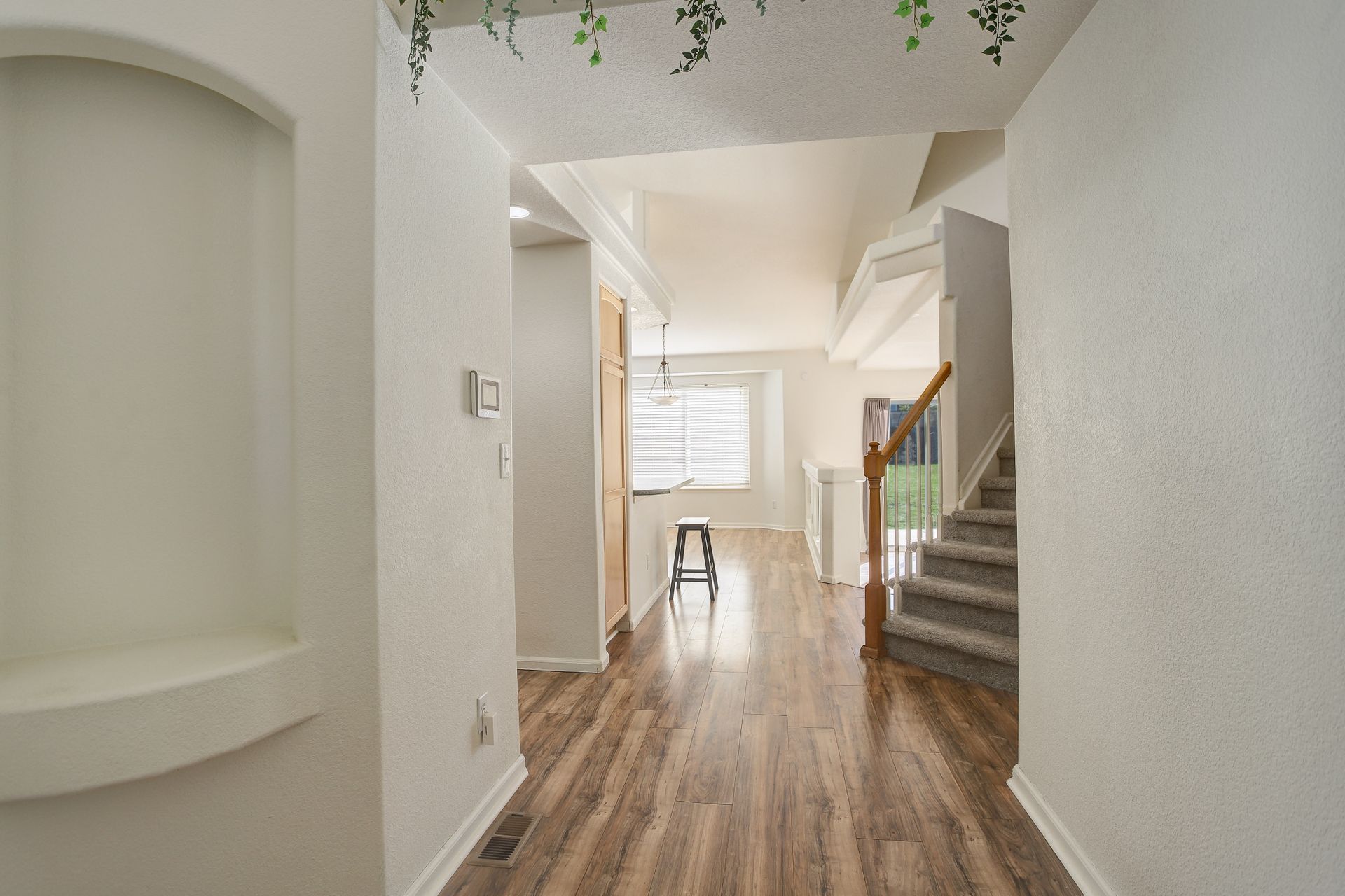 ASSUMABLE VA LOAN AT 3.0%! ($457,000 approx outstanding balance; $2693.21 current PITI.) This Green Valley Ranch light, bright and open two-story has LVP floors throughout the main level and features...kitchen with vaulted ceilings, maple cabinetry, Palladian window, all SS/black appliances included, peninsula with counter bar seating and built-in pantry cabinet...dining area with bay window overlooking the backyard and living room...living room with TV/entertainment center bump out, 5.1 surround sound wiring, corner office space, walkout to patio and easy access to the powder bath with pedestal sink...and main level laundry with storage closet and shelf. Upstairs you'll find the...sunny primary bedroom with French doors, walk-in closet, included TV and ensuite bath with extended vanity, corner garden tub, separate shower, Palladian/glass block window and LVP floor...2nd, 3rd and 4th bedrooms with new carpet and good-sized closets...full hall bath with large vanity and easy-care tub/shower surround. The unfinished basement features 9' ceilings, full bath rough-in and 2 water heaters. Outside, you'll enjoy the...finished and insulated 3-car garage...back patio that's shaded in the afternoon...large, fully fenced backyard with trampoline and sprinkler system...covered front porch...front yard with low maintenance artificial turf...and proximity to neighborhood parks and schools. Green Valley Ranch is conveniently located near to shopping, dining, I-70, 470 and DIA, too!