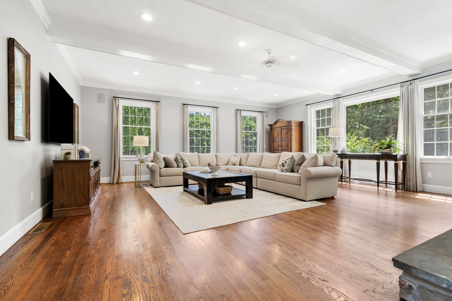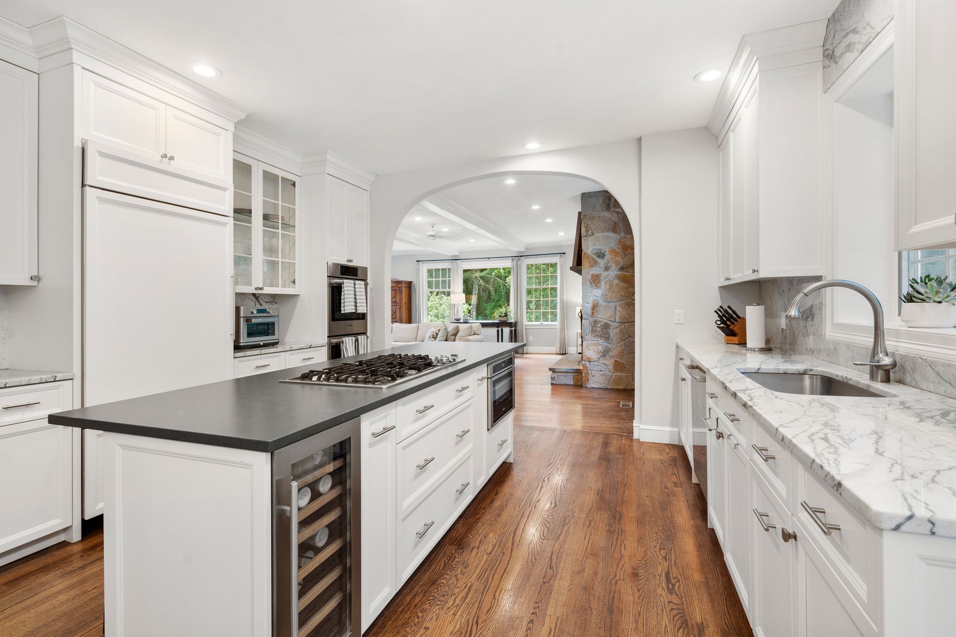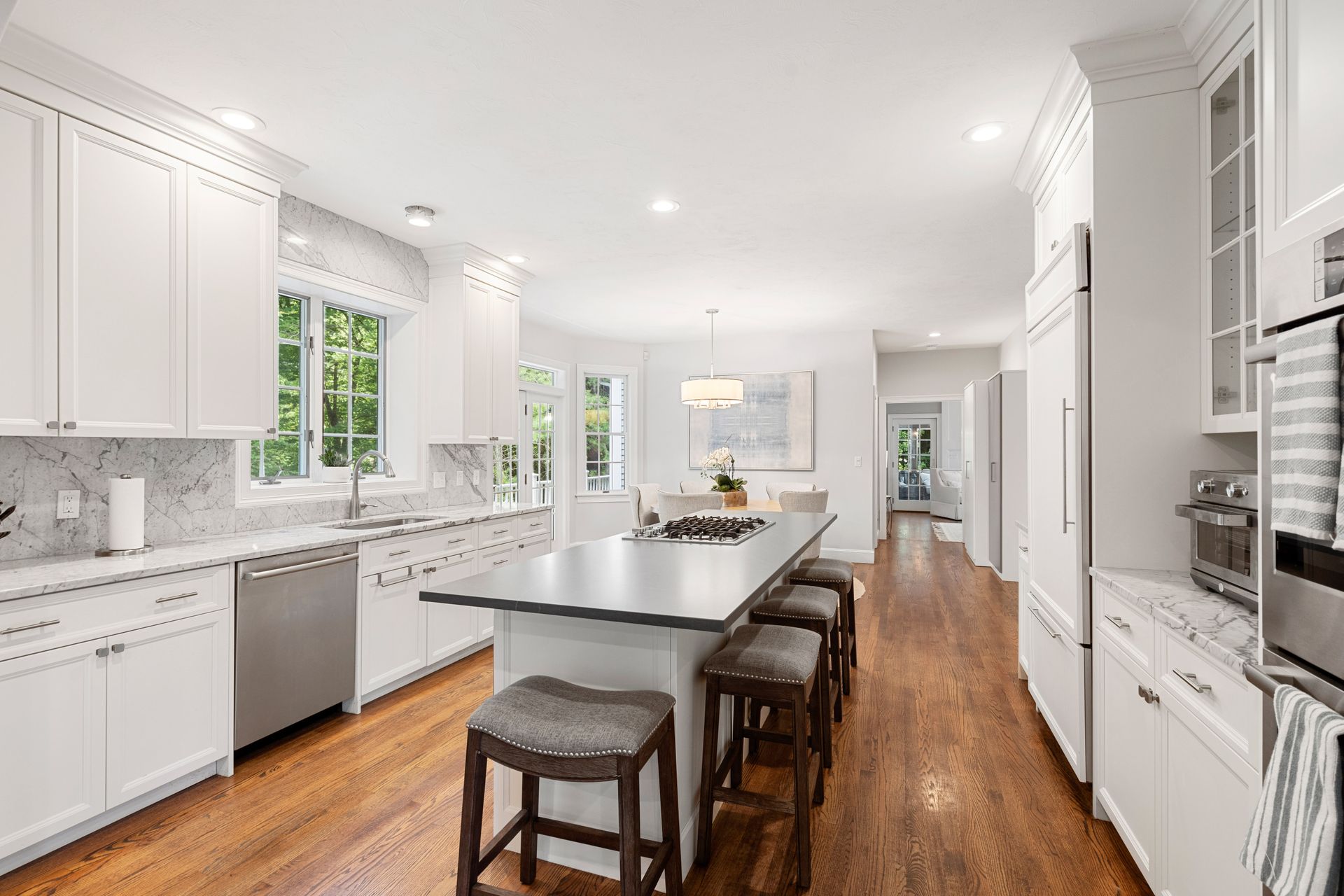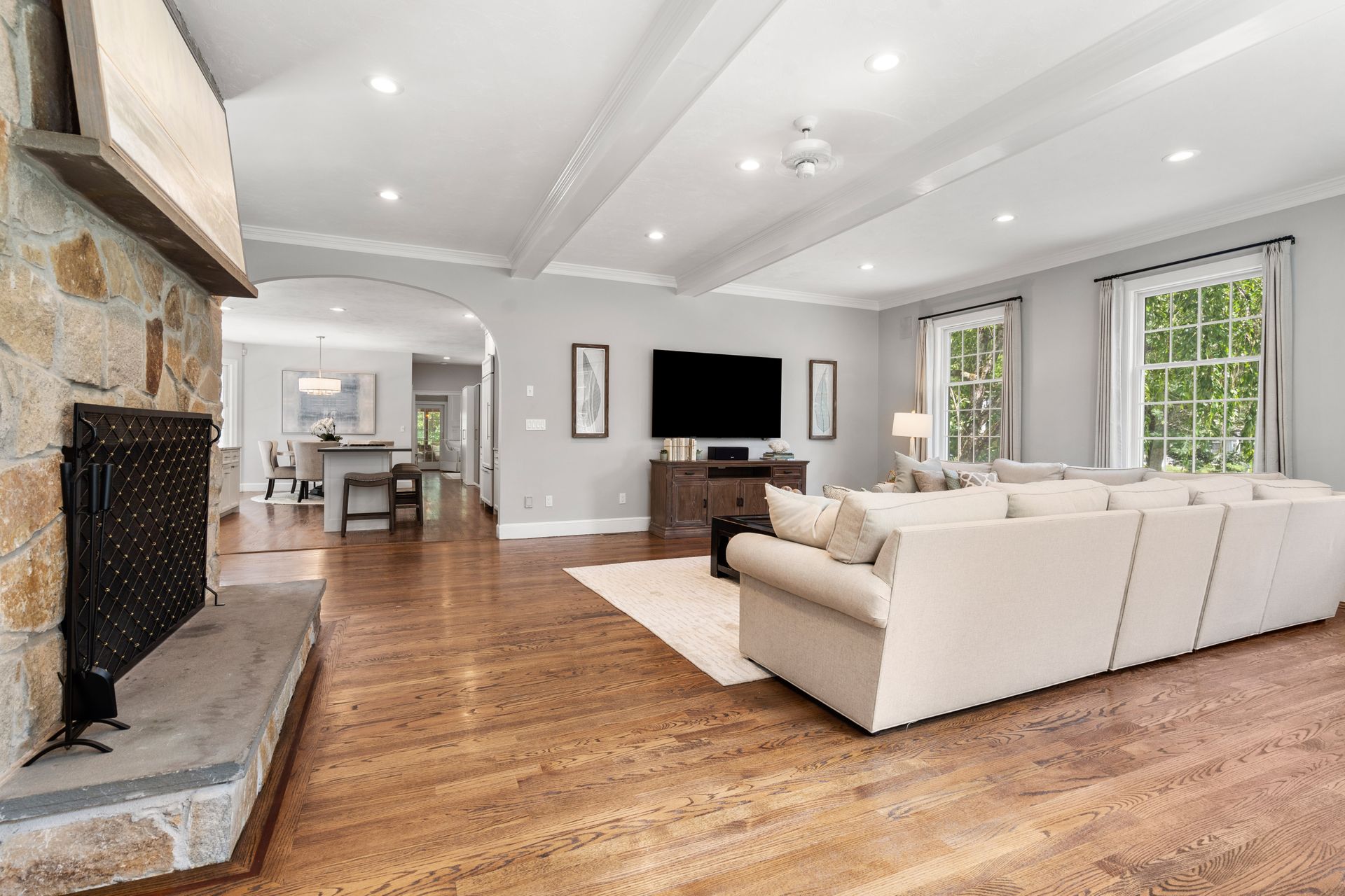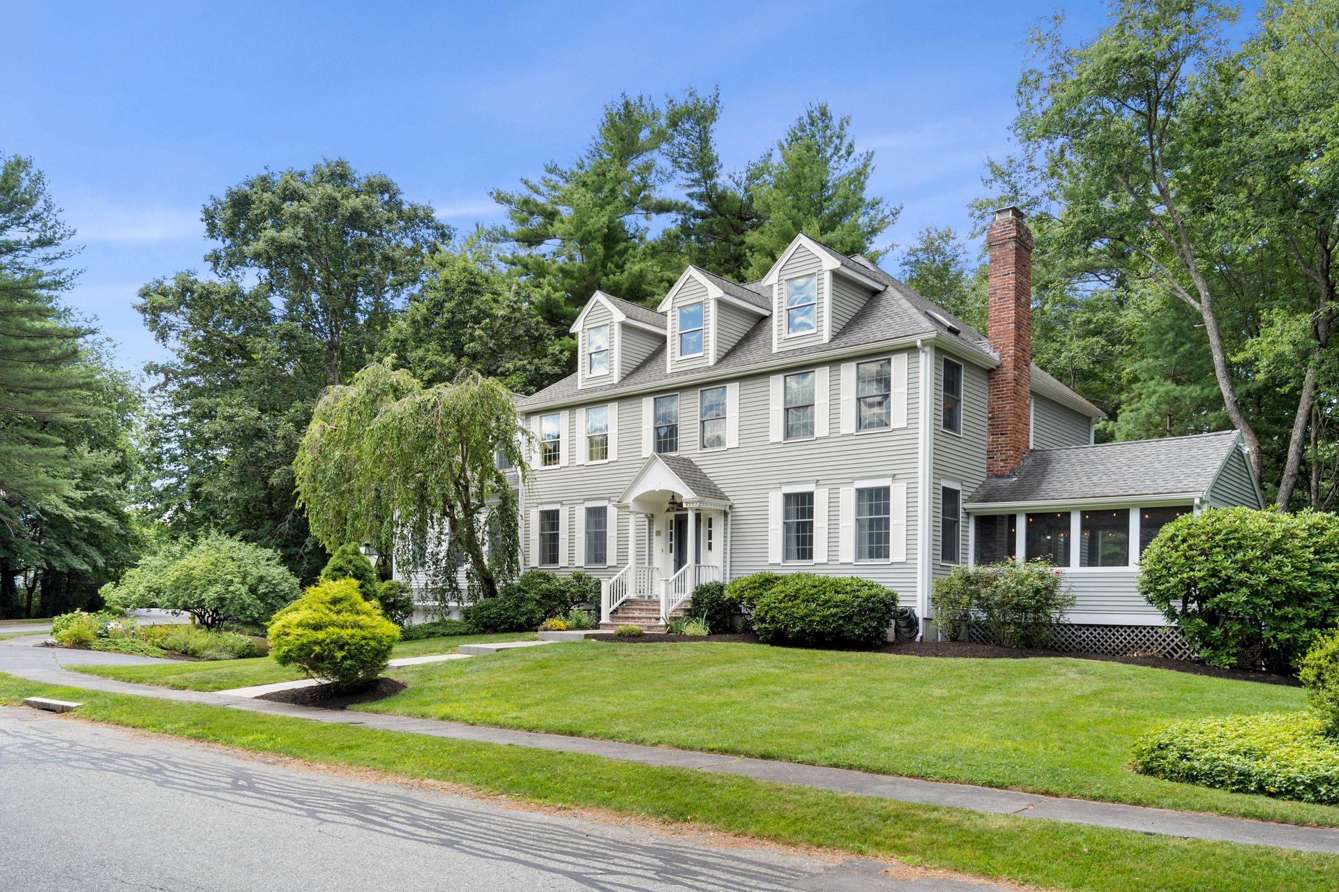 Beautifully appointed Contemporary Colonial on 1.63 acres is sited on a cul-de-sac by conservation land. High ceilings, elaborate detailings, open floor plan in this six bed, five bath home. Gourmet kitchen with an oversized island and quartz countertops, built-in wine fridge, custom cabinetry, and state-of-the-art appliances. 26 by 23 foot family/living room with elegant fireplace, great for entertaining. Oversized windows and French doors highlight the nature that surrounds this home. There's a stately dining room, office, formal living room and a sunroom leading to deck. Primary suite boasts vaulted ceiling with skylights, walk-in closet, ensuite with a luxurious soaking tub and 150 jet shower. Second suite with private bath and three additional bedrooms and bath. Walk out lower level has two large bonus rooms, bed and bath that could easily be used as au pair quarters. Ideally located next to Ridge Hill Reservation and 10 minute drive to Wellesley Center for shops, restaurants and train to Boston.