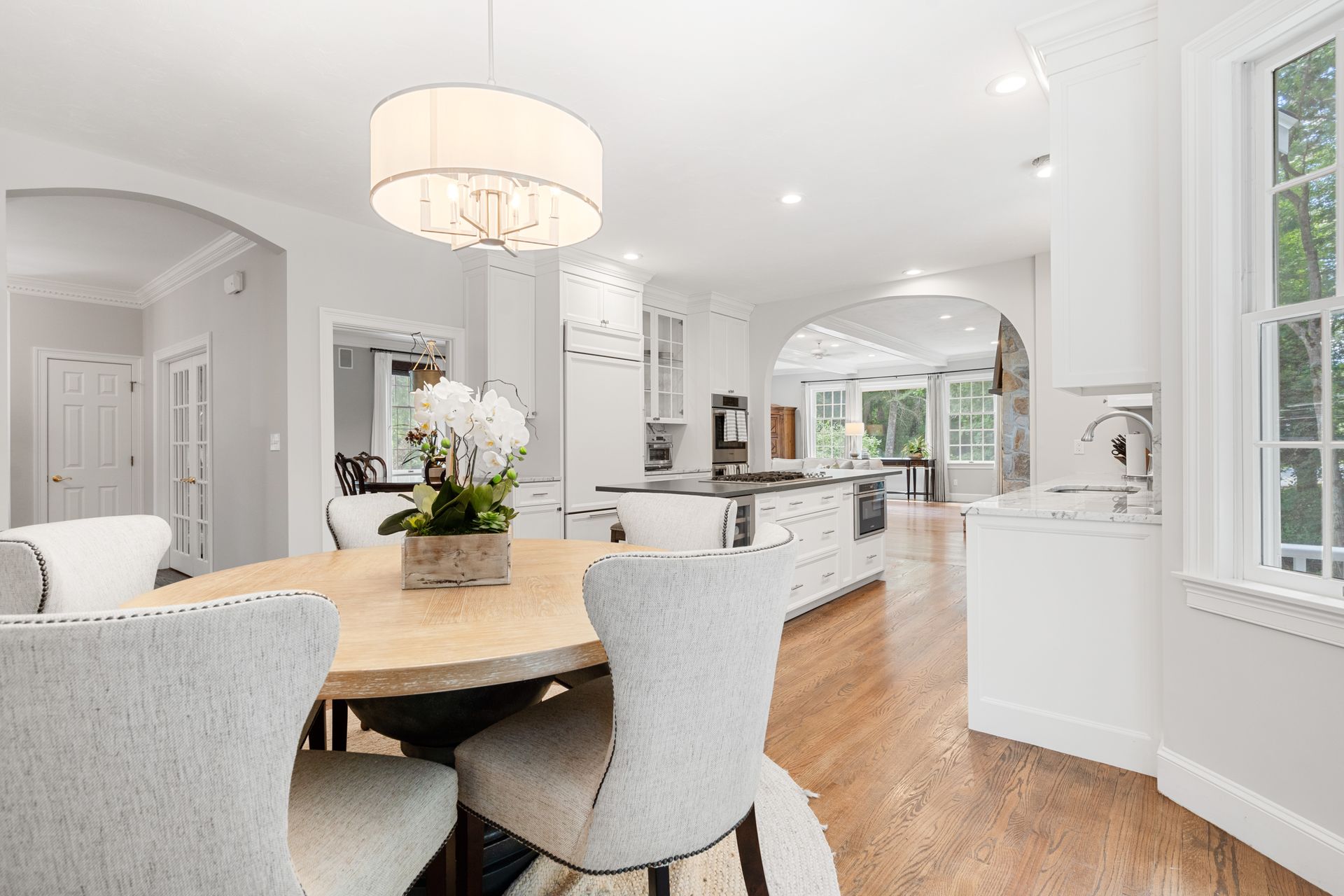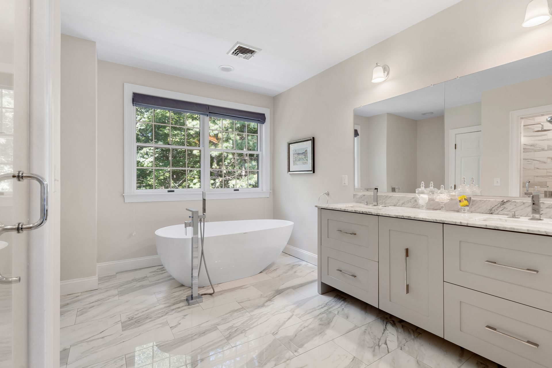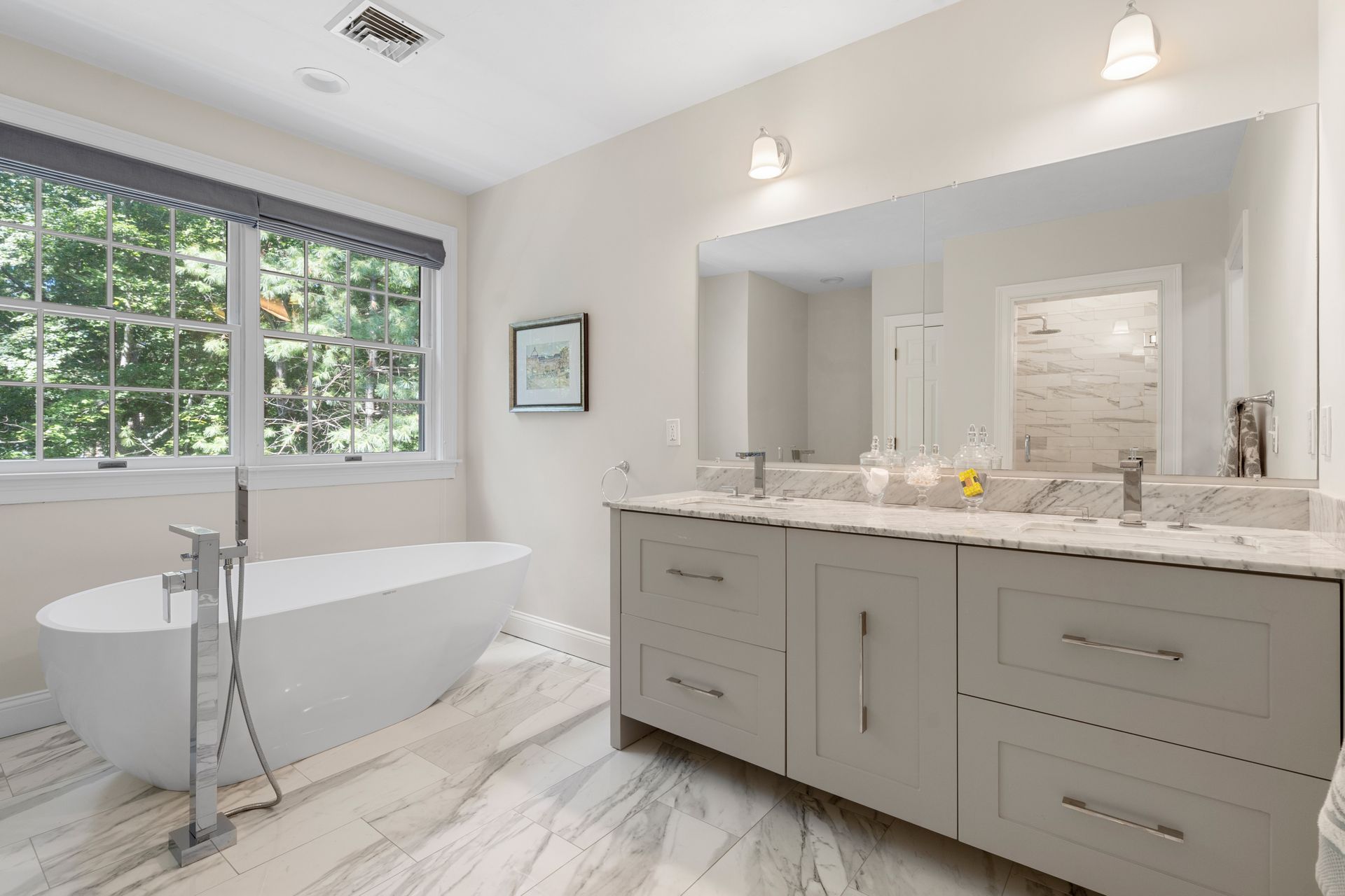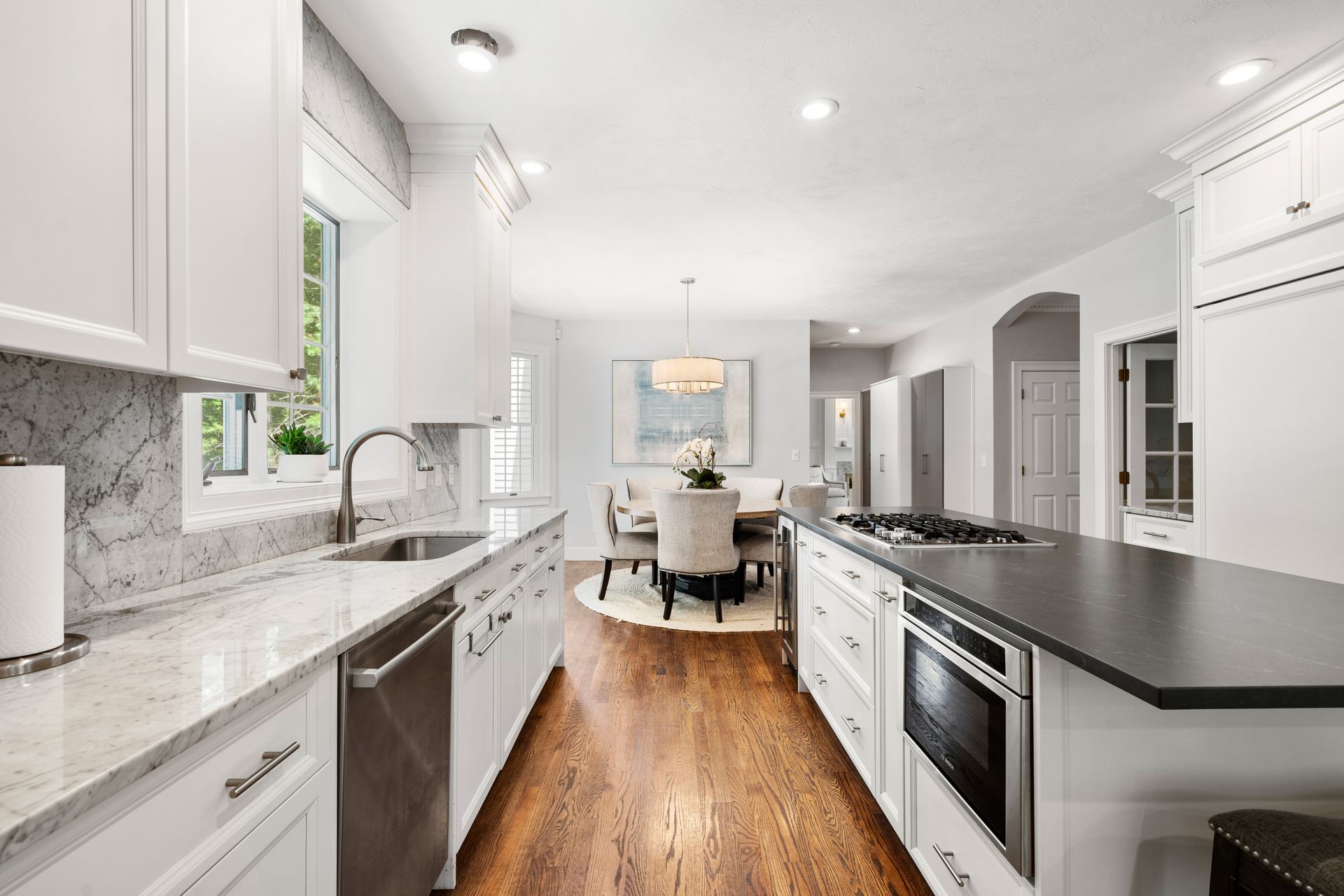 Beautifully appointed Contemporary Colonial on 1.63 acres is sited on a cul-de-sac by conservation land. High ceilings, elaborate detailings, open floor plan in this six bed, five bath home. Gourmet kitchen with an oversized island and quartz countertops, built-in wine fridge, custom cabinetry, and state-of-the-art appliances. 26 by 23 foot family/living room with elegant fireplace, great for entertaining. Oversized windows and French doors highlight the nature that surrounds this home. There's a stately dining room, office, formal living room and a sunroom leading to deck. Primary suite boasts vaulted ceiling with skylights, walk-in closet, ensuite with a luxurious soaking tub and 150 jet shower. Second suite with private bath and three additional bedrooms and bath. Walk out lower level has two large bonus rooms, bed and bath that could easily be used as au pair quarters. Ideally located next to Ridge Hill Reservation and 10 minute drive to Wellesley Center for shops, restaurants and train to Boston.