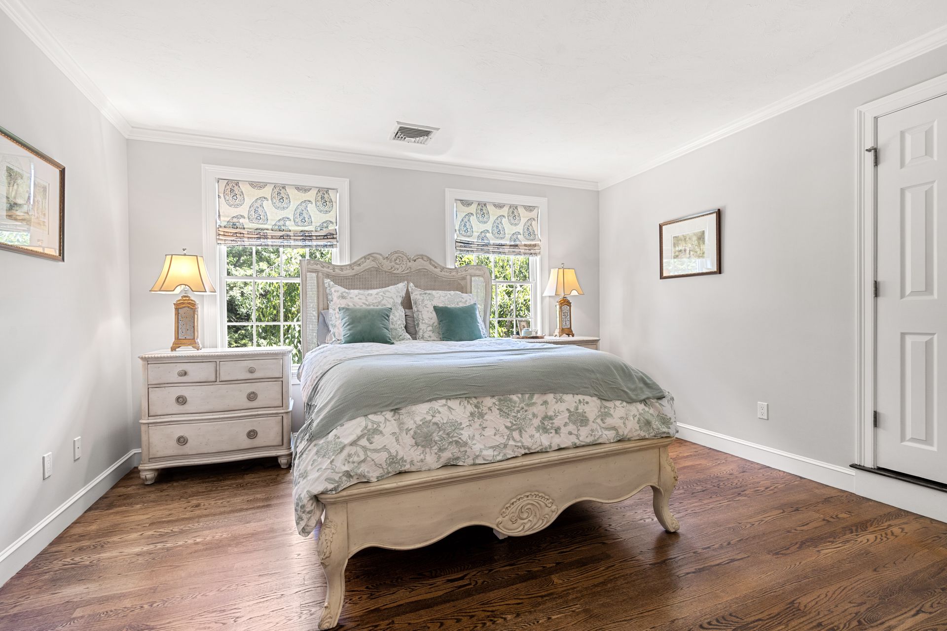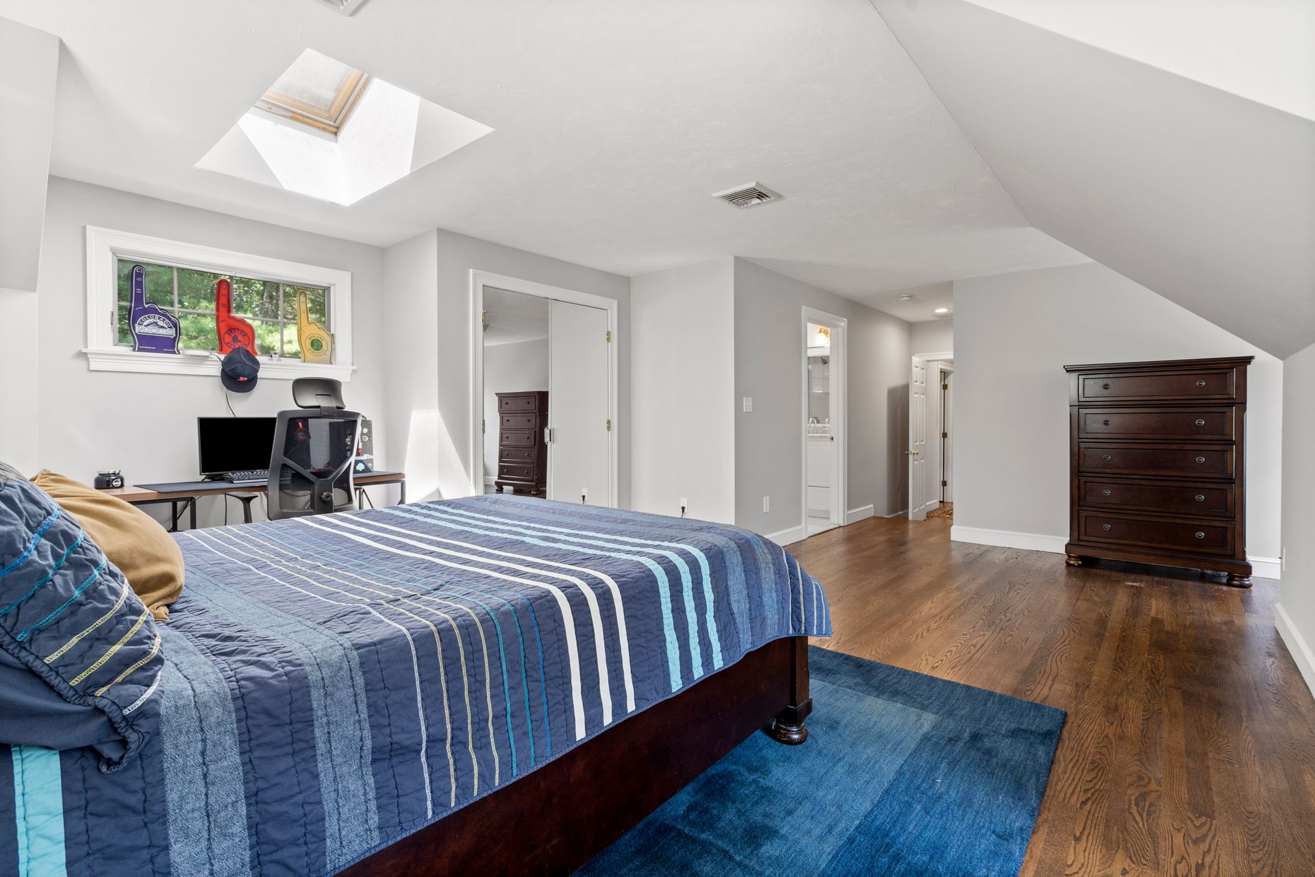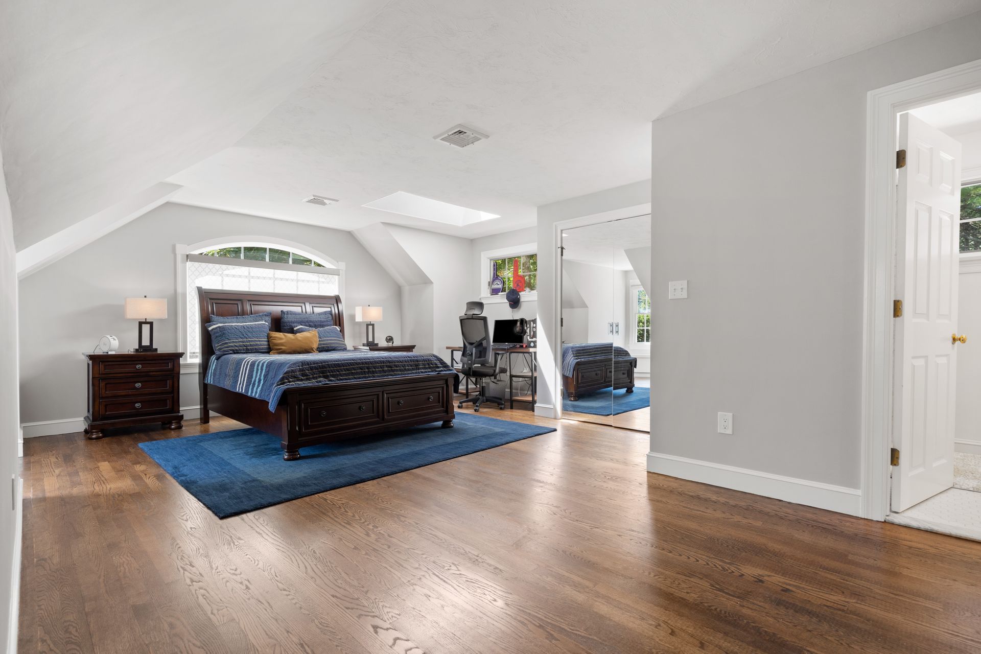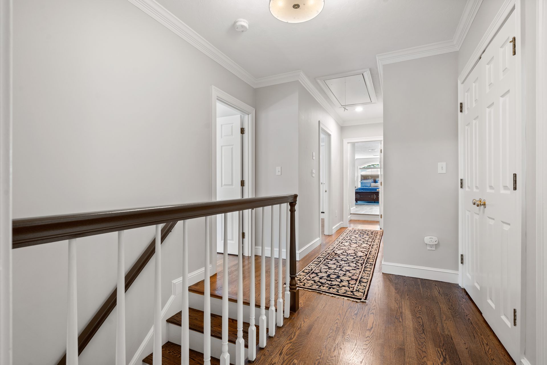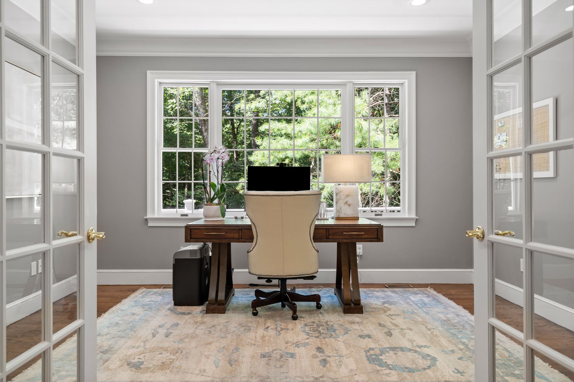 Beautifully appointed Contemporary Colonial on 1.63 acres is sited on a cul-de-sac by conservation land. High ceilings, elaborate detailings, open floor plan in this six bed, five bath home. Gourmet kitchen with an oversized island and quartz countertops, built-in wine fridge, custom cabinetry, and state-of-the-art appliances. 26 by 23 foot family/living room with elegant fireplace, great for entertaining. Oversized windows and French doors highlight the nature that surrounds this home. There's a stately dining room, office, formal living room and a sunroom leading to deck. Primary suite boasts vaulted ceiling with skylights, walk-in closet, ensuite with a luxurious soaking tub and 150 jet shower. Second suite with private bath and three additional bedrooms and bath. Walk out lower level has two large bonus rooms, bed and bath that could easily be used as au pair quarters. Ideally located next to Ridge Hill Reservation and 10 minute drive to Wellesley Center for shops, restaurants and train to Boston.
