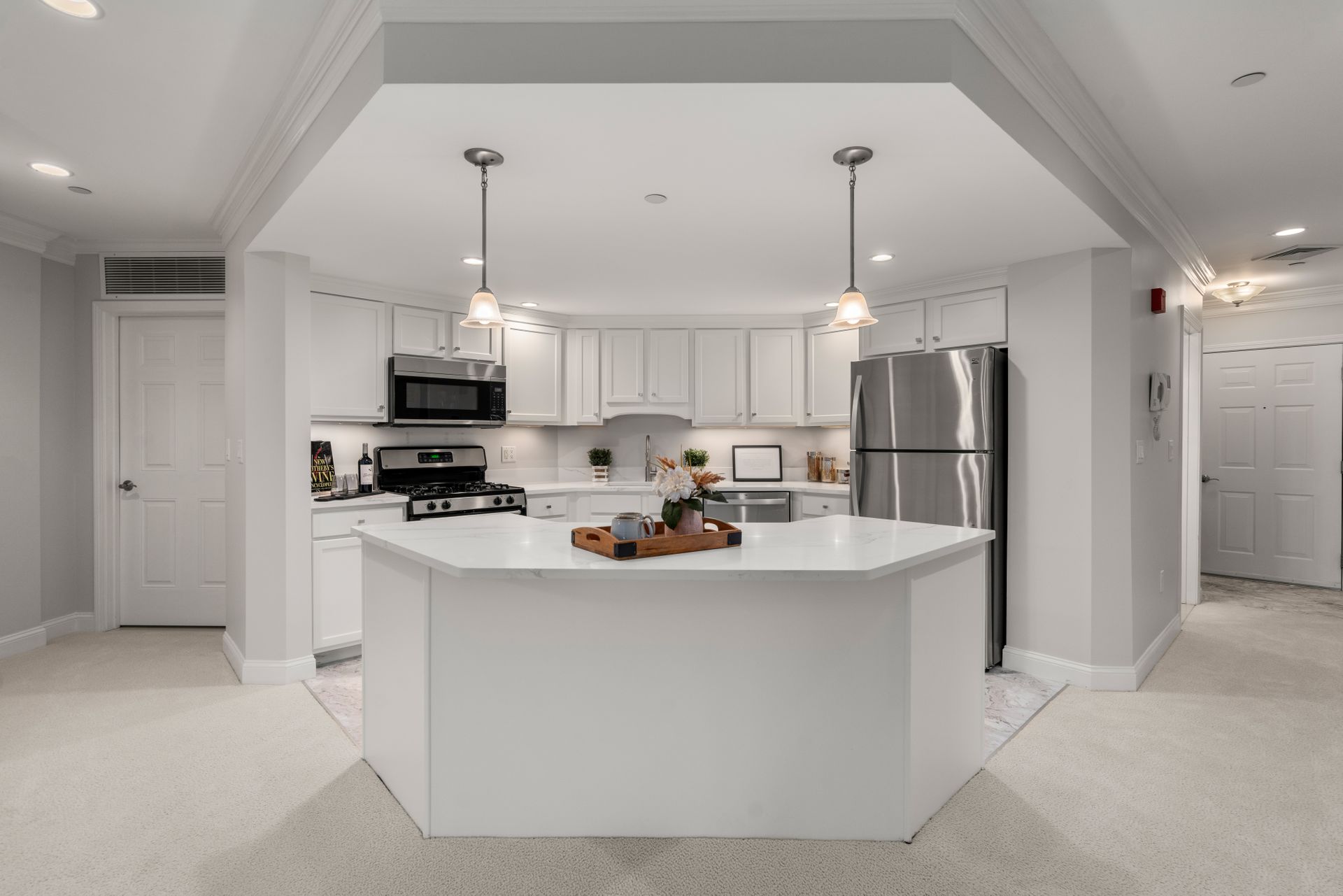 The epitome of luxury living at Pheasant Hill, a prestigious 55+ community tailored for those who cherish lifestyle and effortless, one-level, maintenance-free living! Step into this impeccably renovated two-bedroom, two-bathroom unit with new plush carpeting & fresh paint offering breathtaking views of serene nature that will leave you in awe. The modern kitchen features an open-concept layout, new contemporary flooring, young appliances complemented by gleaming quartz countertops, and a spacious center island perfect for entertaining guests. Retreat to the owner's suite, where brand-new carpeting meets dual closets, and indulge in the updated bath equipped with a tub, a shower, pristine quartz finishes, and a double vanity. The second bedroom welcomes you with plush wall-to-wall carpeting and ample closet space, ensuring comfort and convenience for guests. The second full bathroom does not fall short of expectations; it is spacious with a shower and is set against chic quartz countertops. Whether unwinding by the gas fireplace or soaking in the tranquil vistas from your private deck, this home radiates warmth and relaxation. Convenience is at your fingertips with in-unit laundry, underground heated parking, additional exterior parking, and a dedicated storage unit. For guests, ample parking and a charming picnic area for outdoor gatherings are available. Elevator service guarantees easy accessibility for all residents. Beyond just a residence, our community offers an array of amenities, including common area gathering rooms and a fully equipped exercise facility. Plus, we welcome your small companions with open arms, as we are proudly pet-friendly. Nestled just minutes away from premier shopping destinations, top-rated restaurants, and easy access to Rte 495, this idyllic retreat seamlessly blends convenience with luxury living.