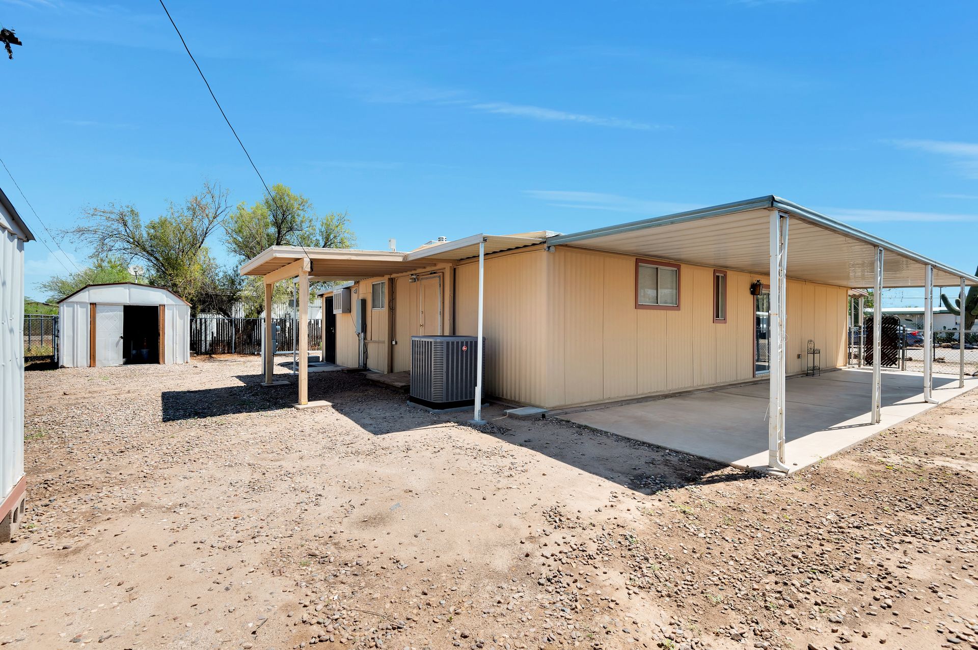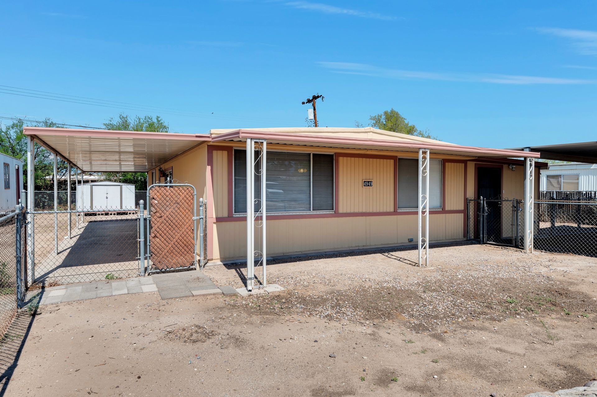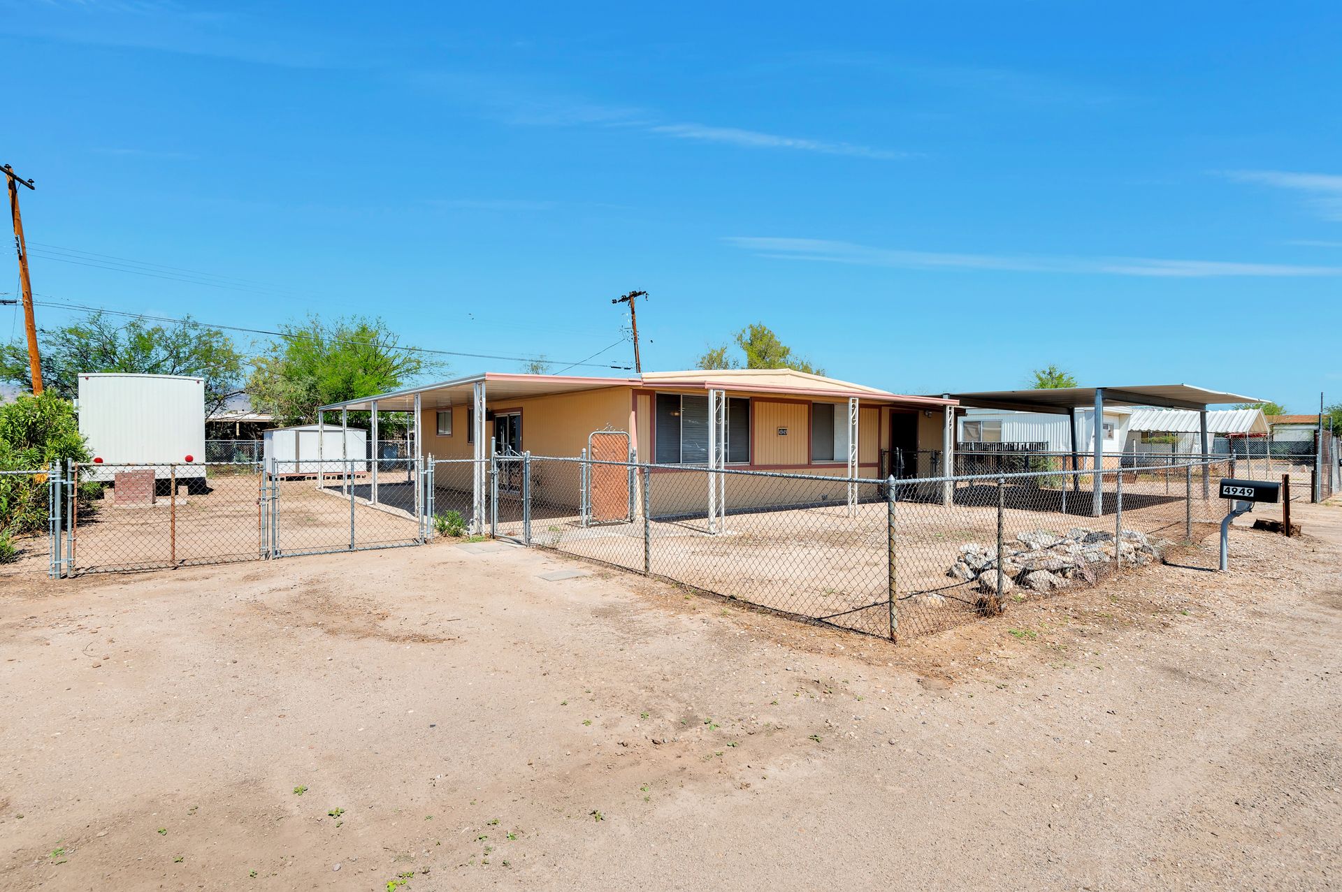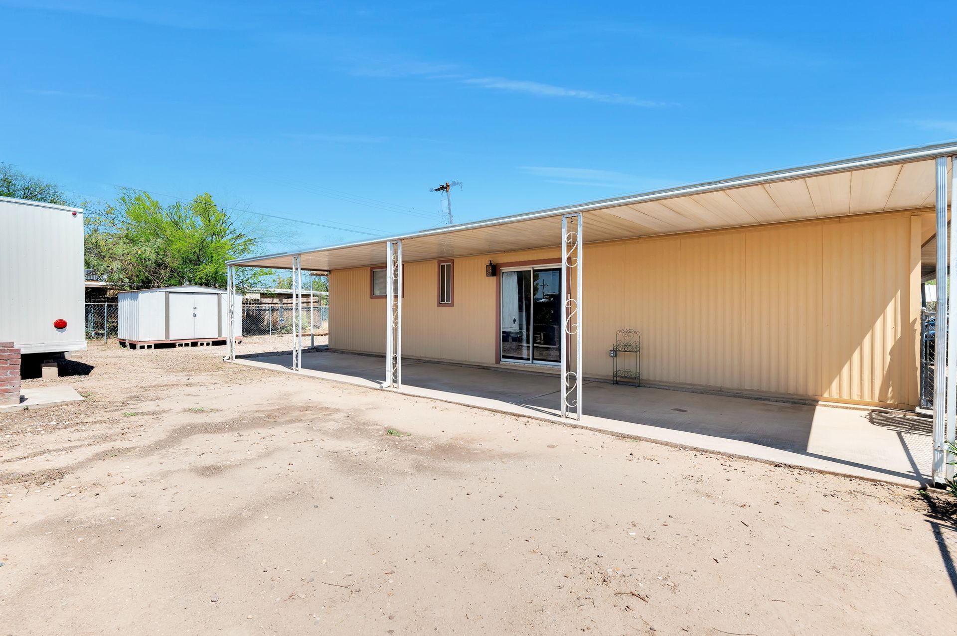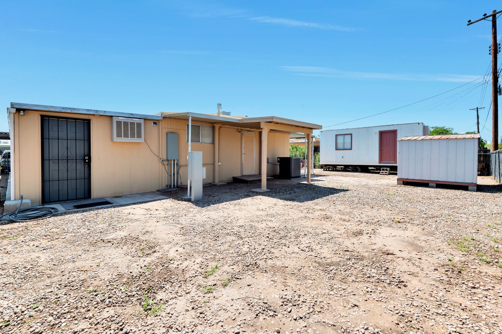 Welcome to this beautifully updated and remodeled home that is complete with updated kitchen cabinets and countertops, laminate wood flooring, tape and textured throughout, a bathroom remodel with crafted tile work. The Arizona room is located on the North side with zoned air wall unit. Climate controlled mobile outbuilding on SW side of the property can be used as a guest room, workshop, or storage; complete with a second electric pedestal, water meter, and sewer hookup. The RV sized driveway allows for you to park on either side of the property. This home is turnkey ready to live in! The owners remodeled the home for a personal living space but decided to sell instead—grab it before they change their mind! Cash only, mobile guest unit conveys with property.