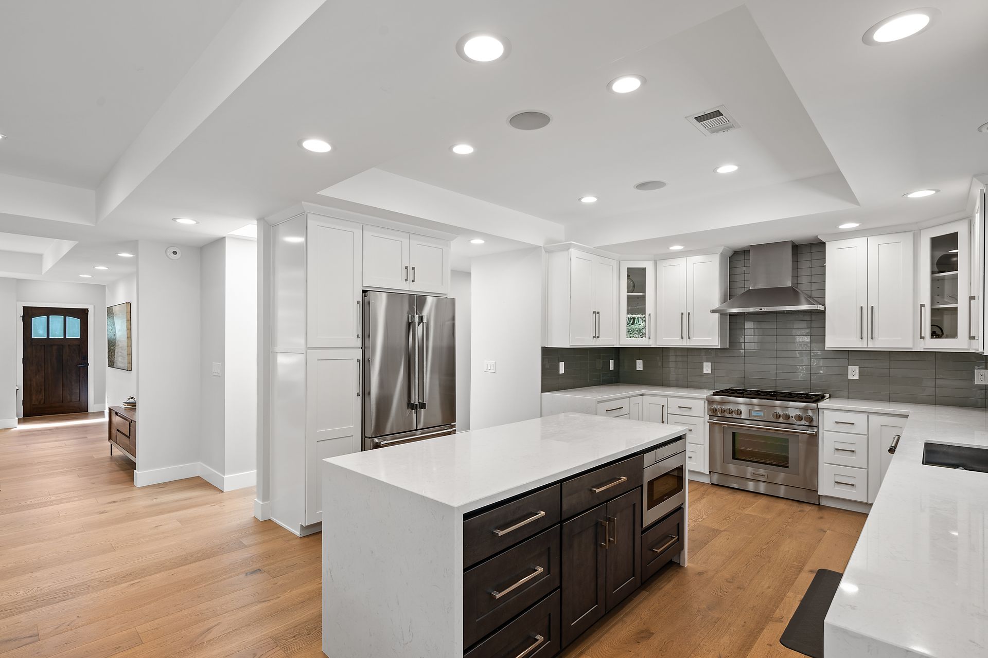 Luxury: A gorgeous kitchen comes appointed with all the home chef might need including: stainless steel appliances, updated cabinetry, Quartz counters and center island and Thermador stove, microwave and dishwasher. Recently replaced wiring, lighting and plumbing fixtures, upgraded HVAC, tankless water heater, double pane windows and water and scratch-resistant flooring all speak to the high-end features of this home.
