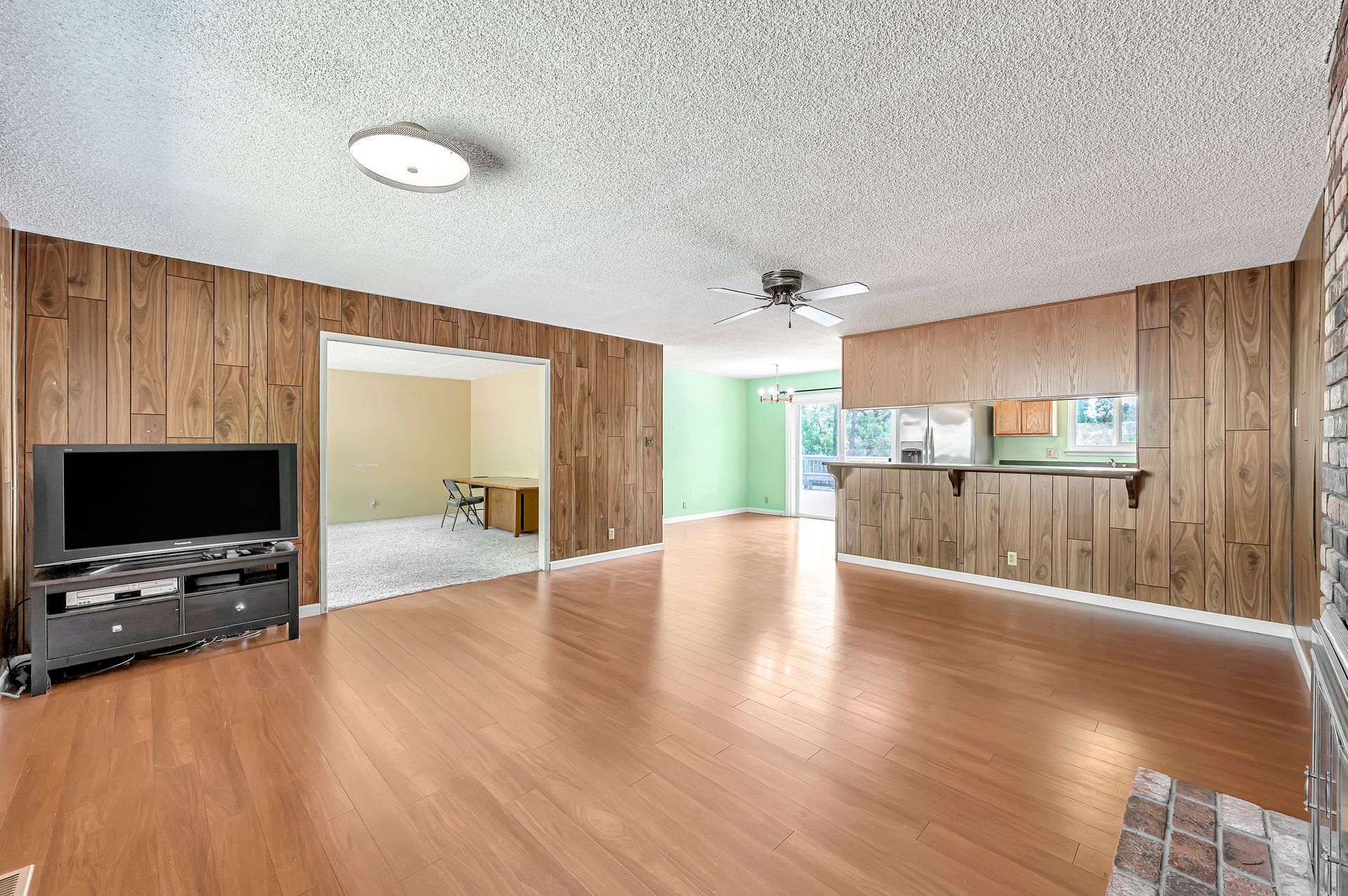 - Large family room with fireplace, opens to kitchen and eat-in space