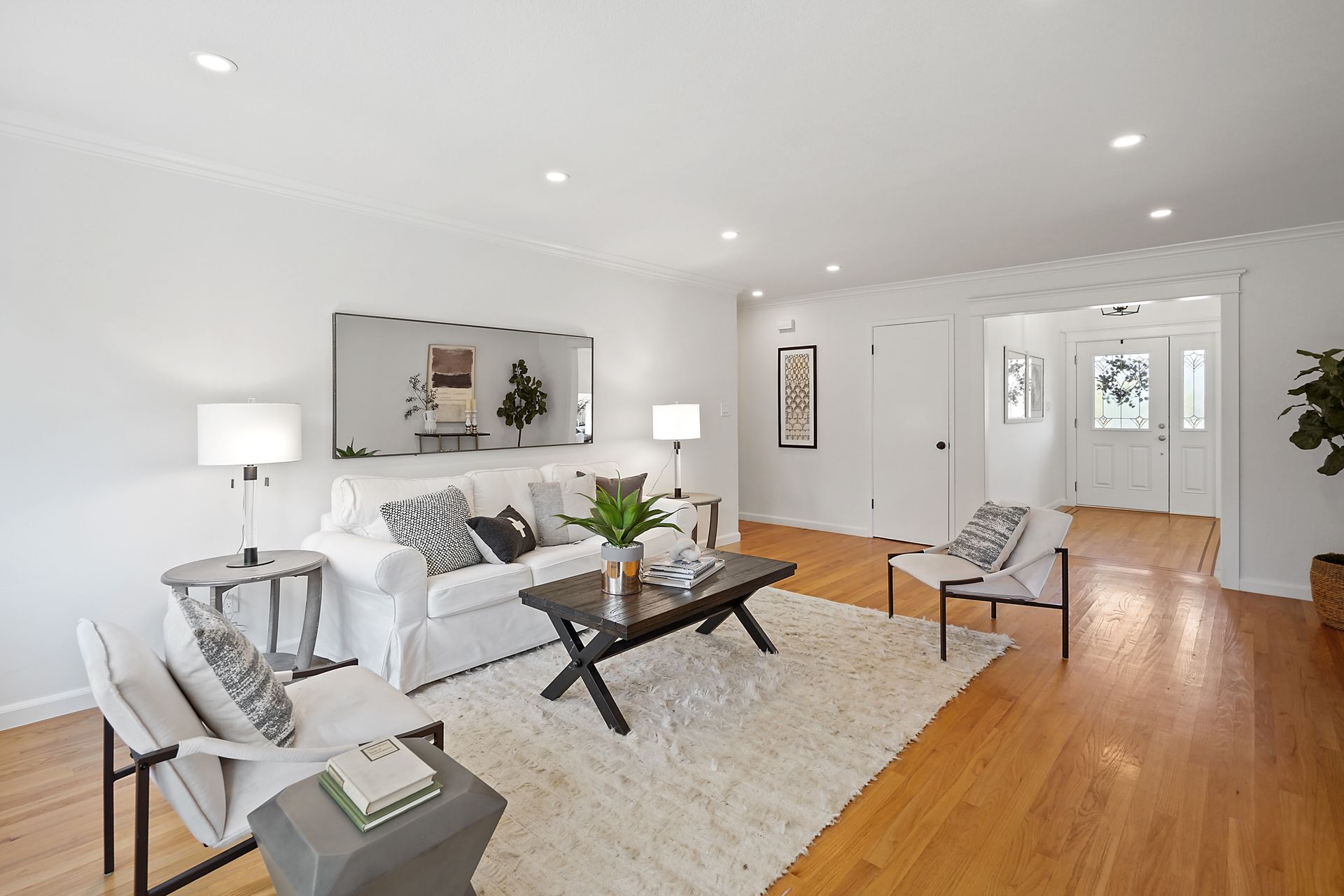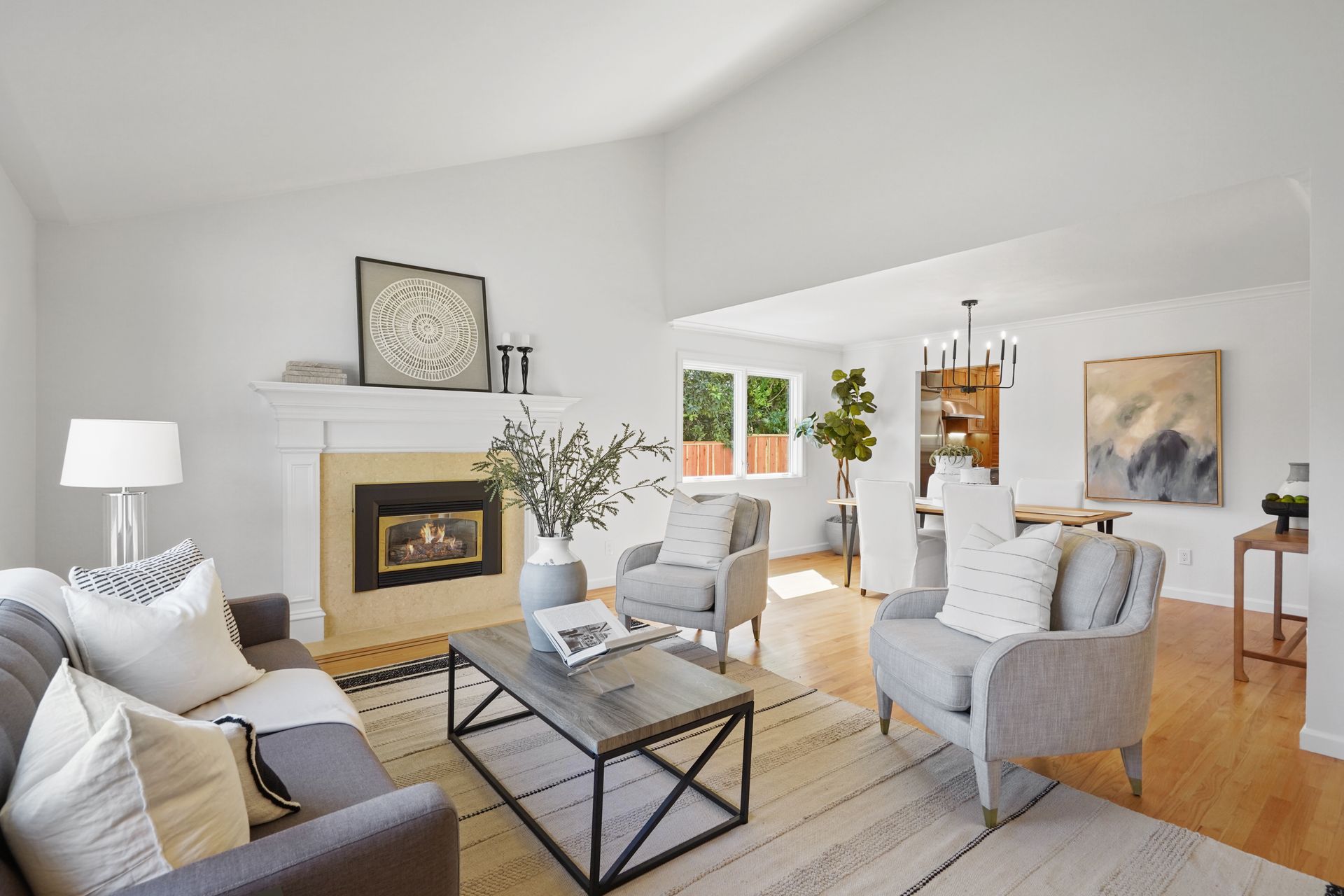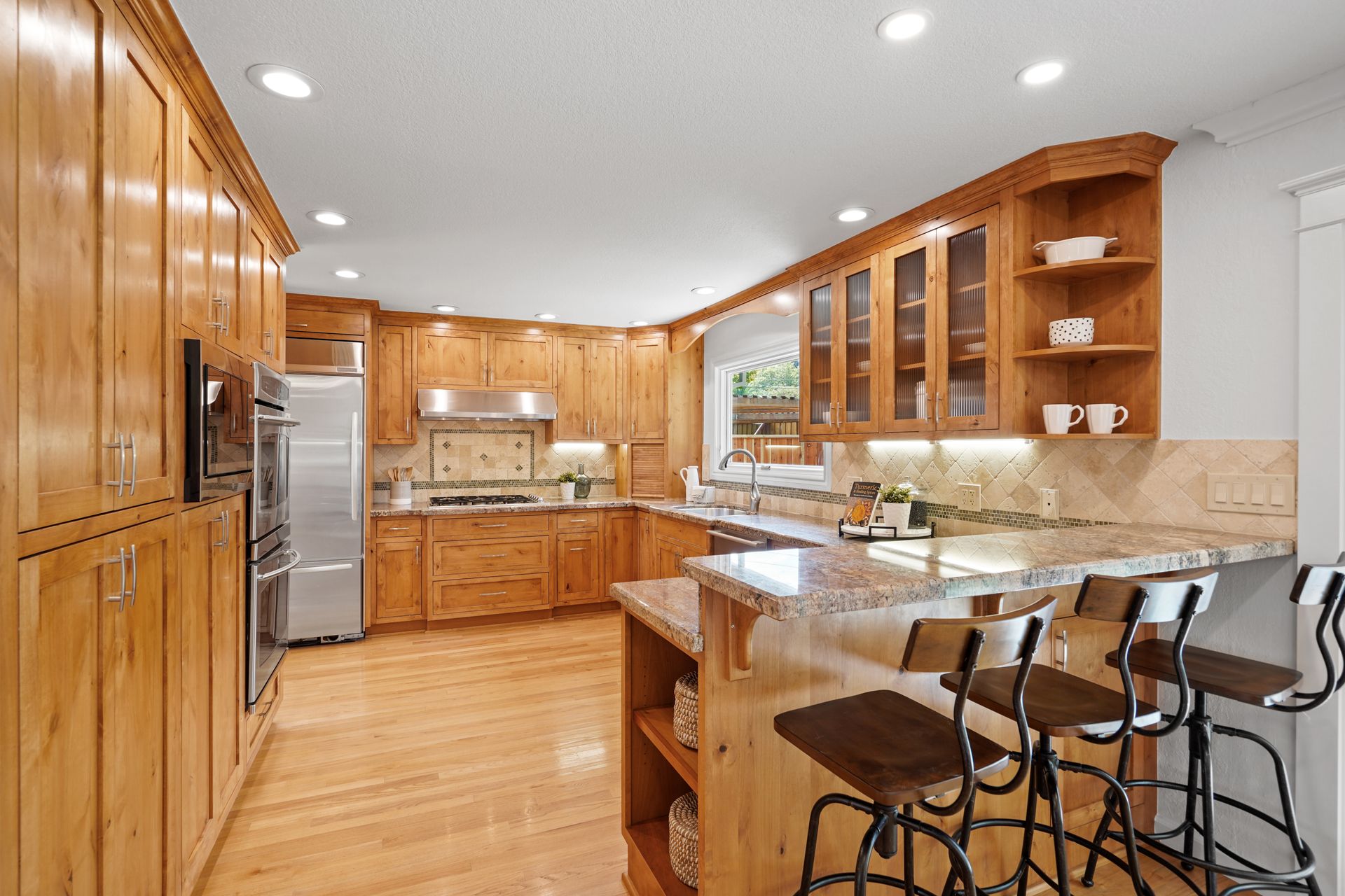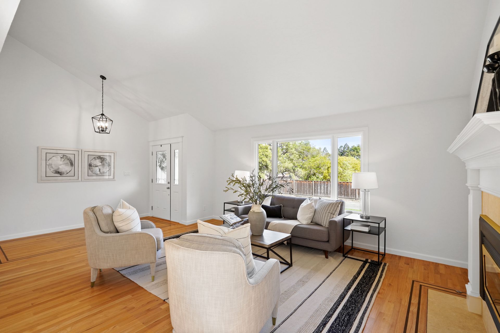Situated on a private court in the heart of Larkey Ranch, this four bedroom, two bathroom, single-story home is an absolute gem! An updated chef's kitchen boasts gleaming granite counters and backsplash, rich wood cabinetry, stainless steel appliances and a large peninsula island. The gourmet kitchen opens into a spacious living room with views of the lush and colorful outdoor surround. Featuring vaulted ceilings, pristine hardwood floors and a fireplace, the light-filled family room flows effortlessly into the generous sized dining area – ideal for special gatherings with guests.