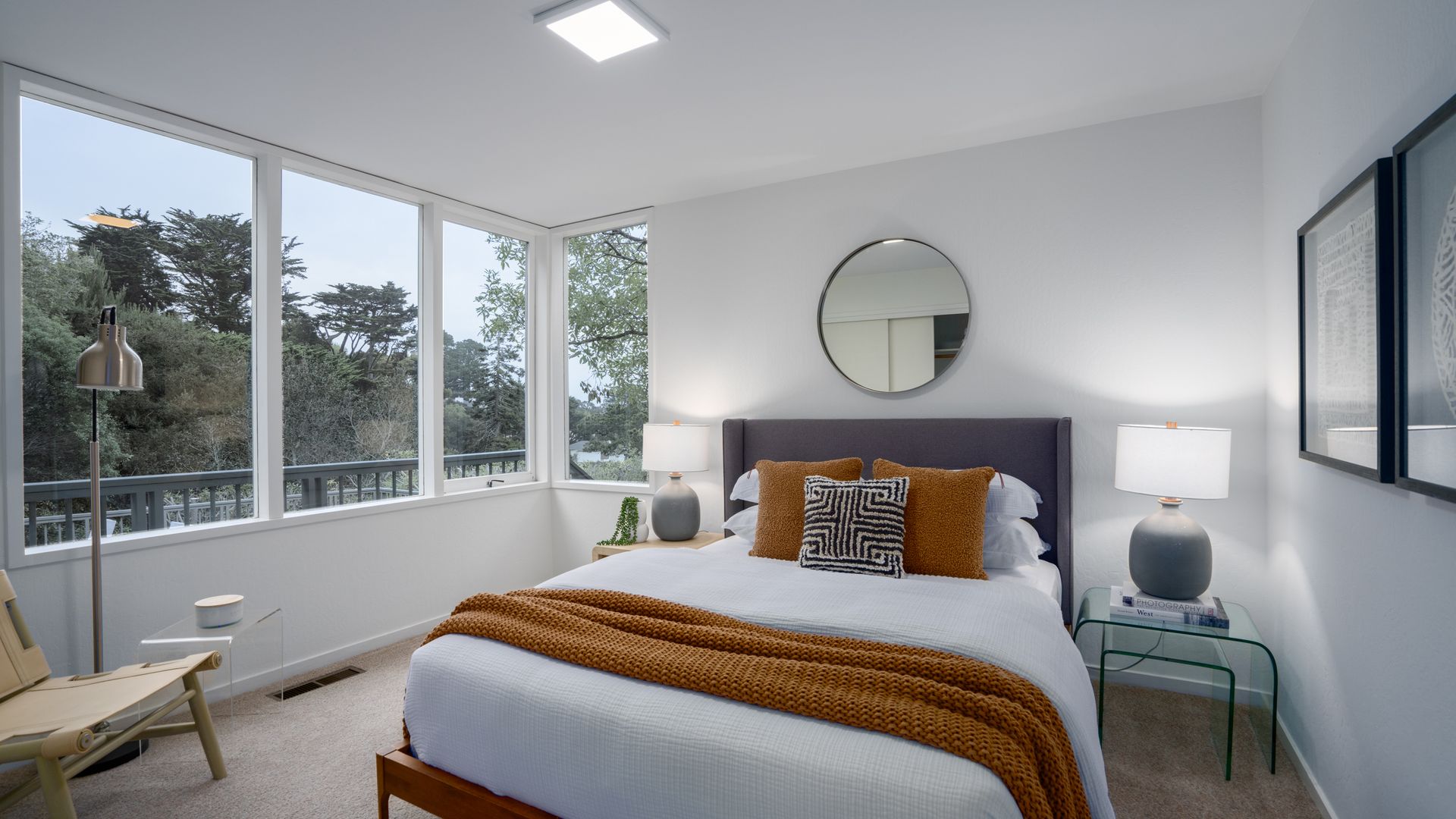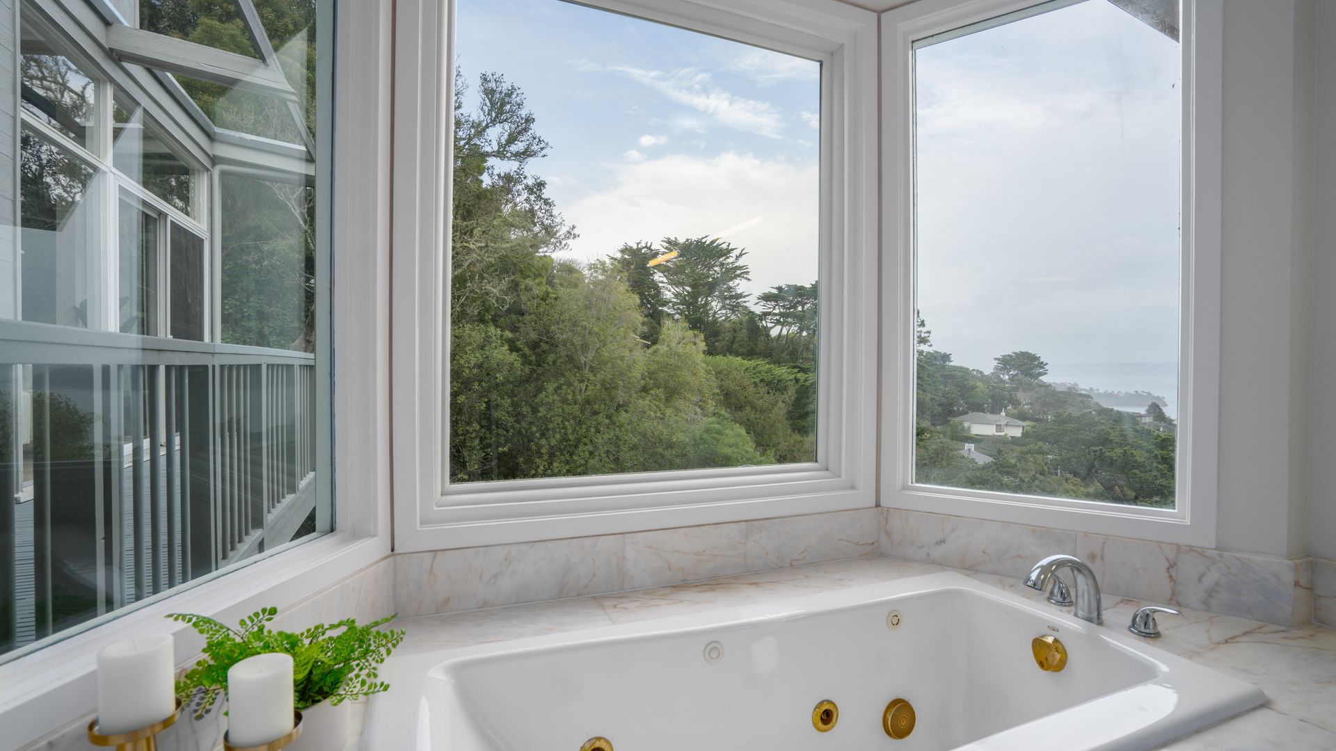 The primary bedroom suite offers a sitting area, a large walk-in closet and a view deck. A luxurious bathroom has a separate bathtub and shower and enjoys the beautiful views.