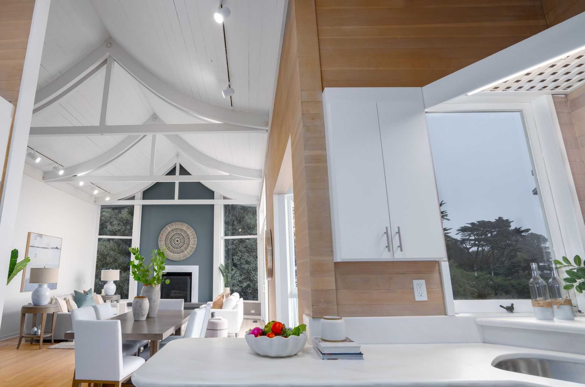 This architecturally dramatic home boasts soaring high ceilings, view decks, walls of glass and skylights. This large four bedroom, two bath home is about 3,398 square feet and enjoys beautiful views from most rooms and the swimming pool area.