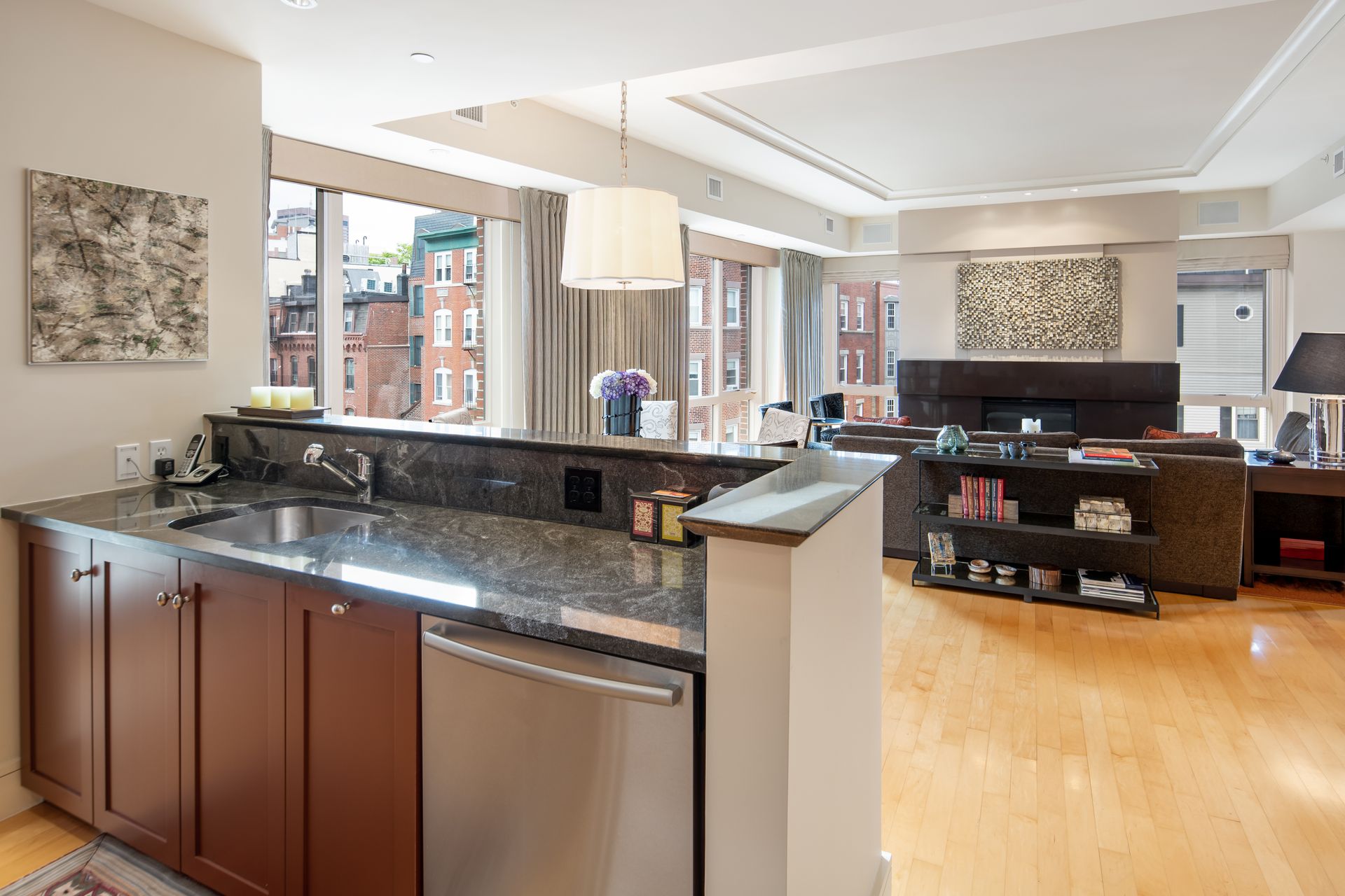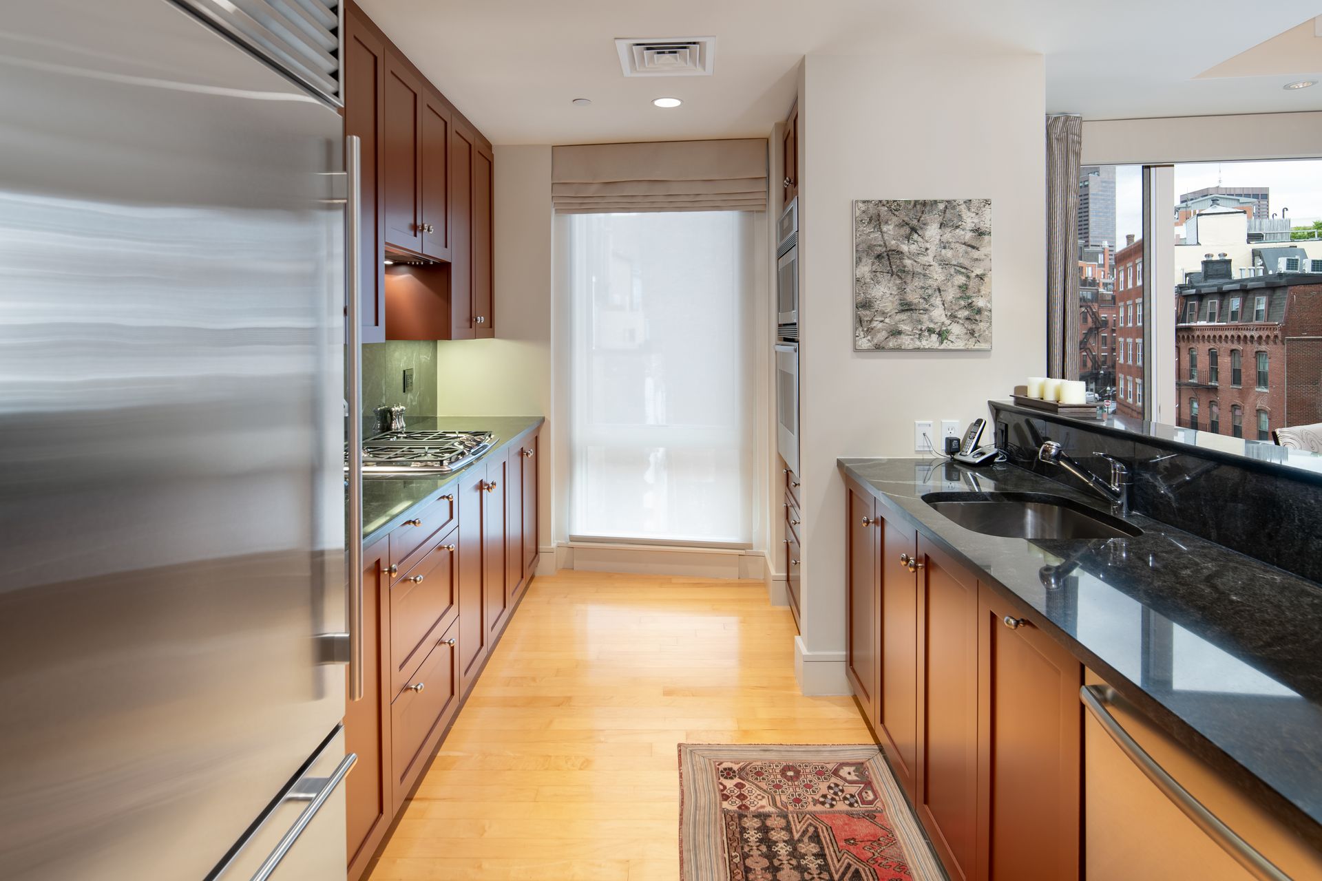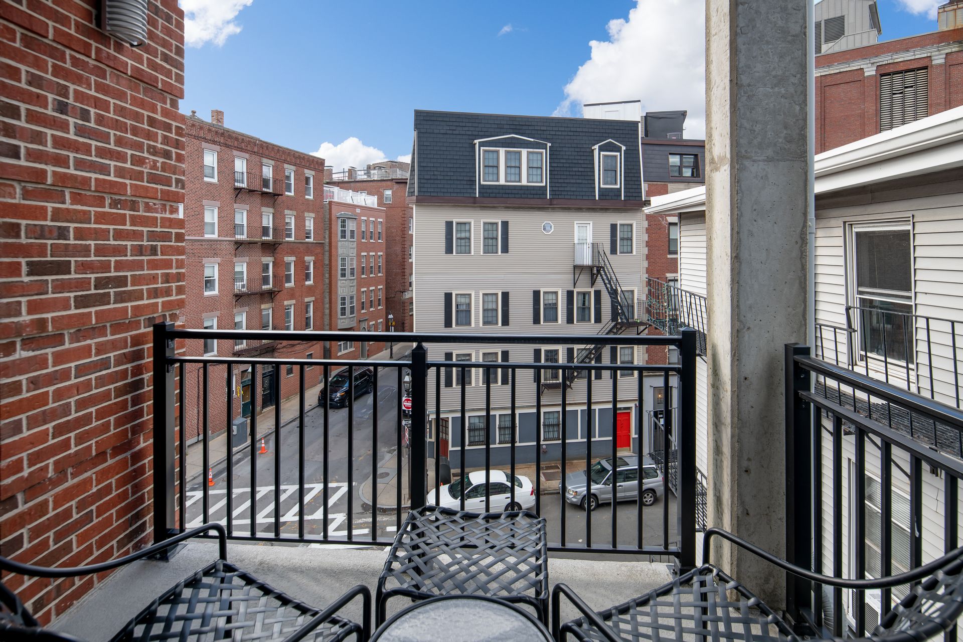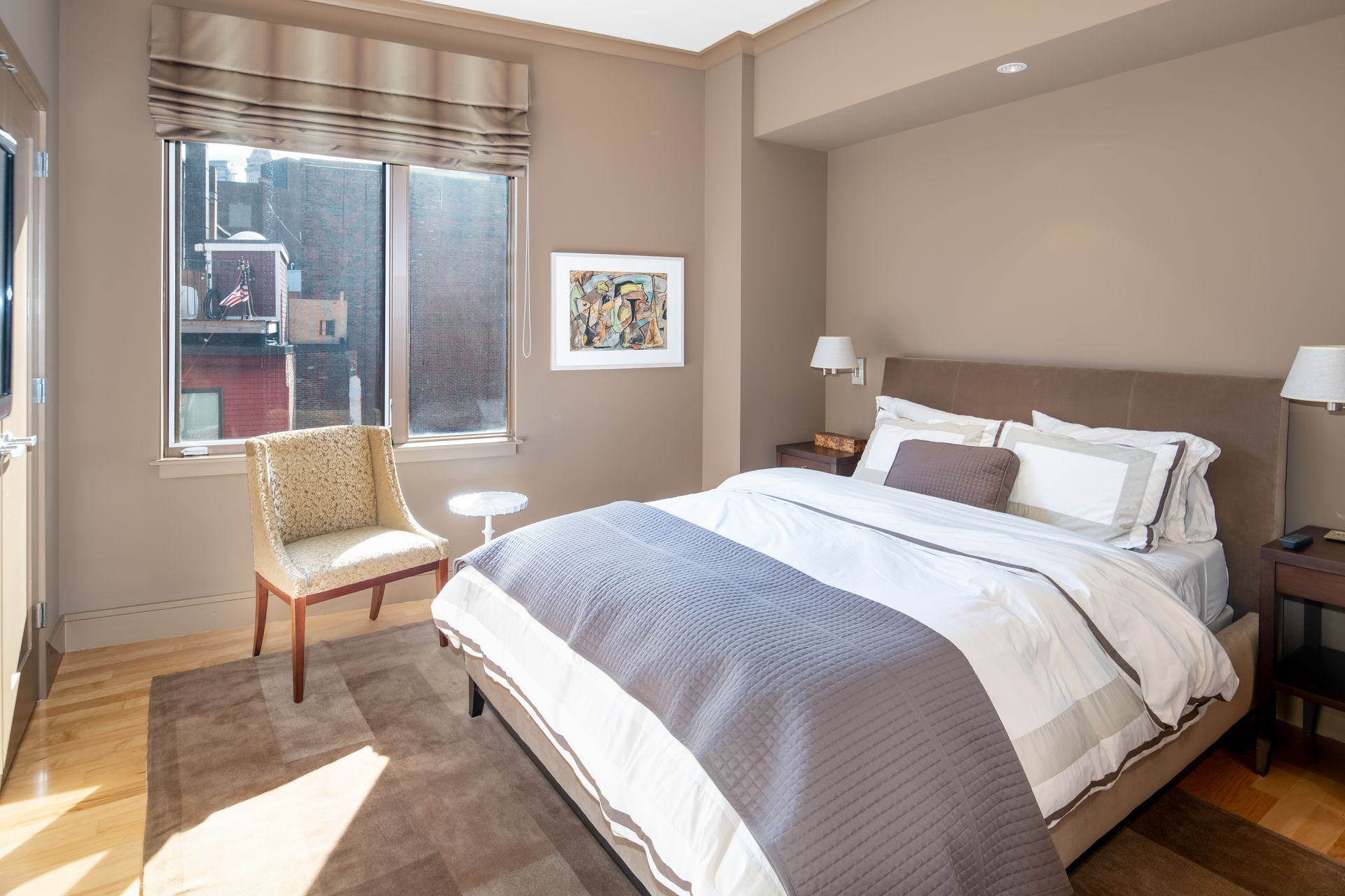 Exquisite 3 bedroom, 2.5 bath corner home in 8 unit Boutique Building just steps from the Waterfront! This unit has gleaming hardwood floors throughout, spacious living/dining room, custom fireplace, window treatments, tray ceiling & crown mouldings. Open kitchen with stainless steel appliances, black granite counters & separate wine room with custom cabinetry and back-lit geometric wine rack. Spacious master bedroom with custom fitted walk-in closet and built-in writing desk. Master bath with limestone shower and tub, glass mosaic accents, upgraded marble & walnut cabinetry. Guest bedroom with upgraded recessed lighting and swing arm bedside wall lamps and full upgraded bath. Third bedroom with custom drapery and private balcony. Guest powder room with marble tile floor and floating walnut vanity. Also included washer/dryer, deeded garage parking & storage. Great location! Walking distance to Financial District, historic Faneuil Hall and North End restaurants and shopping.