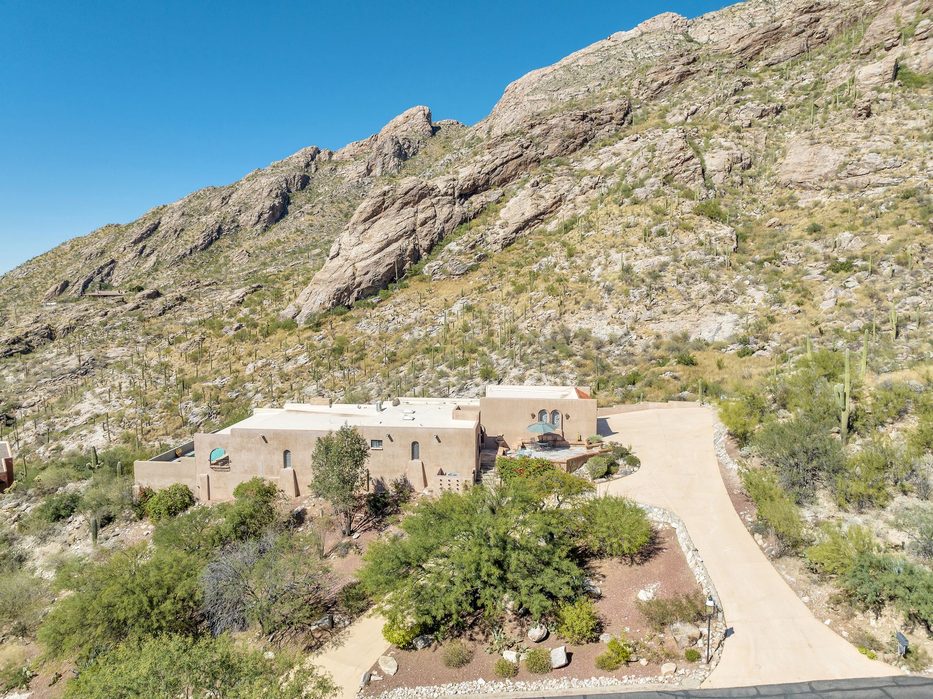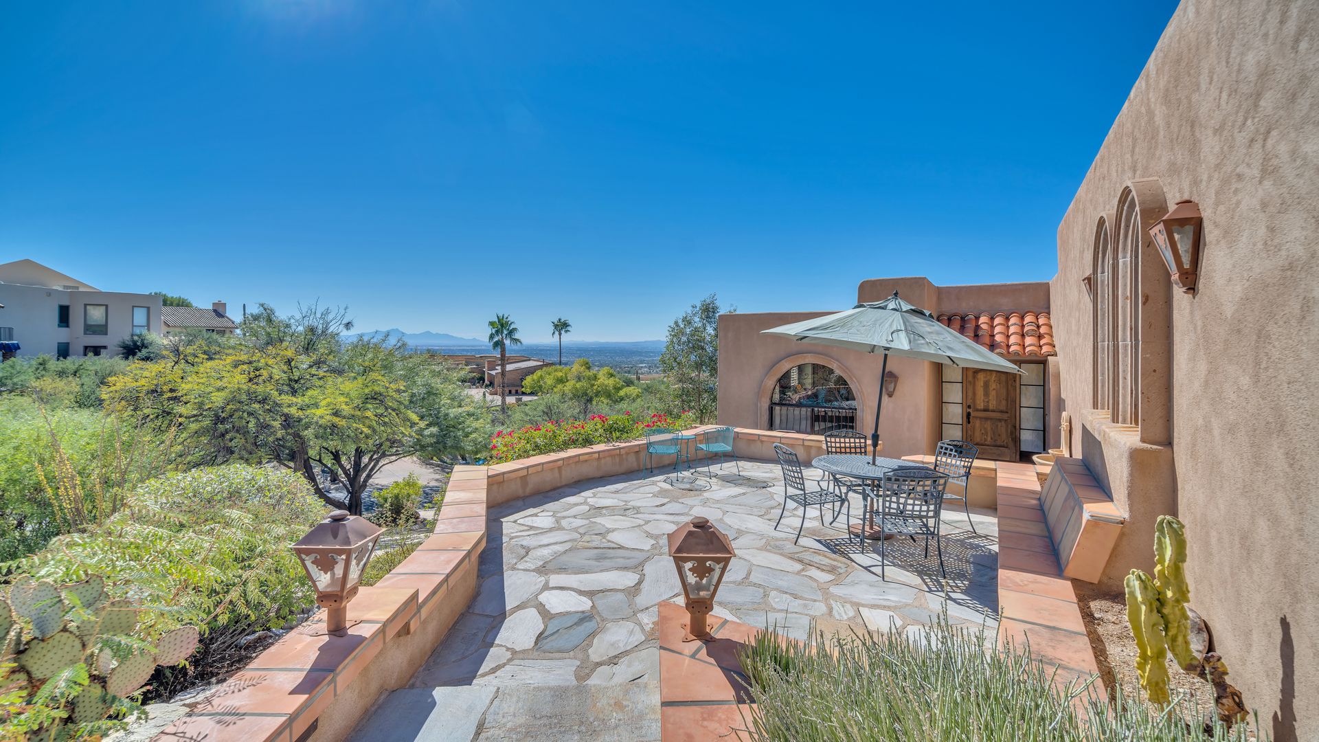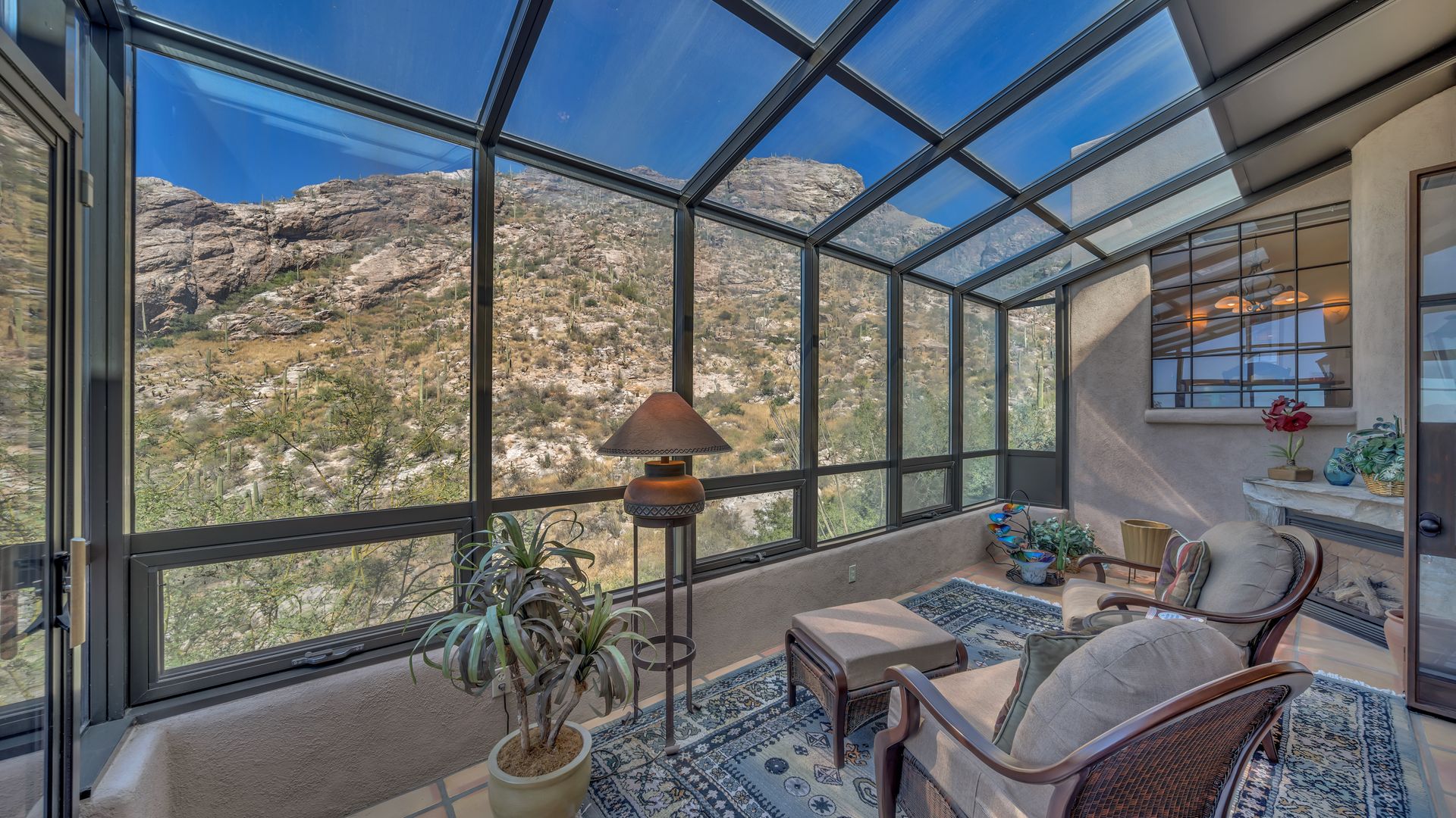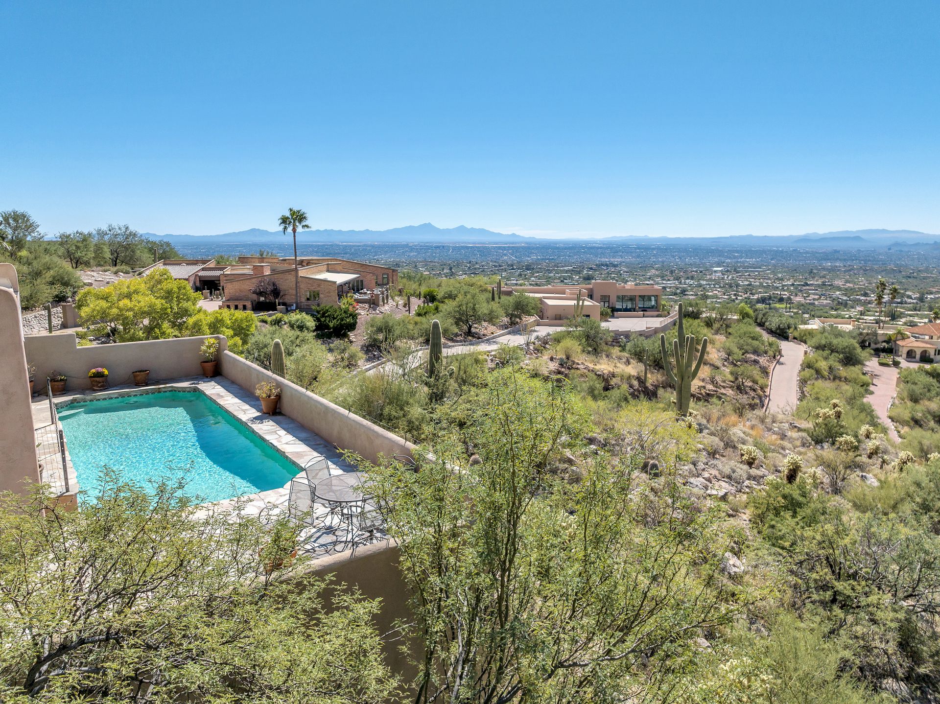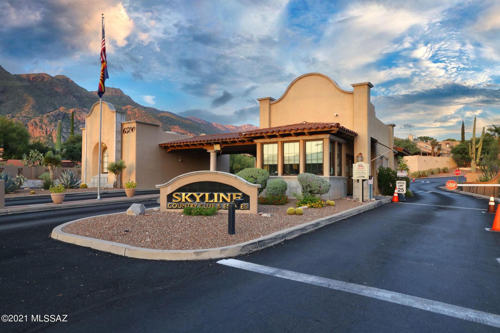 Welcome to Skyline Country Club living as it was designed to be enjoyed. This gated enclave is at the top of the Santa Catalina Foothills and borders the Coronado National Forest. Yes, this estate of more than five acres can be yours. Enjoy this ideal sized Hacienda with custom wrought iron doors, hand plastered walls, exposed vigas (beams), gourmet kitchen, world-wide sourced stonework and wood details, vintage accents, cornice crown molding, coved concaved ceilings, meticulously built courtyard, and an impeccably designed sparkling pool overlooking the entire city of Tucson, Arizona. The 180-degree view glass atrium Arizona Room is unmatched. Designed and built by famed Architect and Builder, David Fraker. Relax, Read, Write, Work, Entertain, Play. This is HOME.
