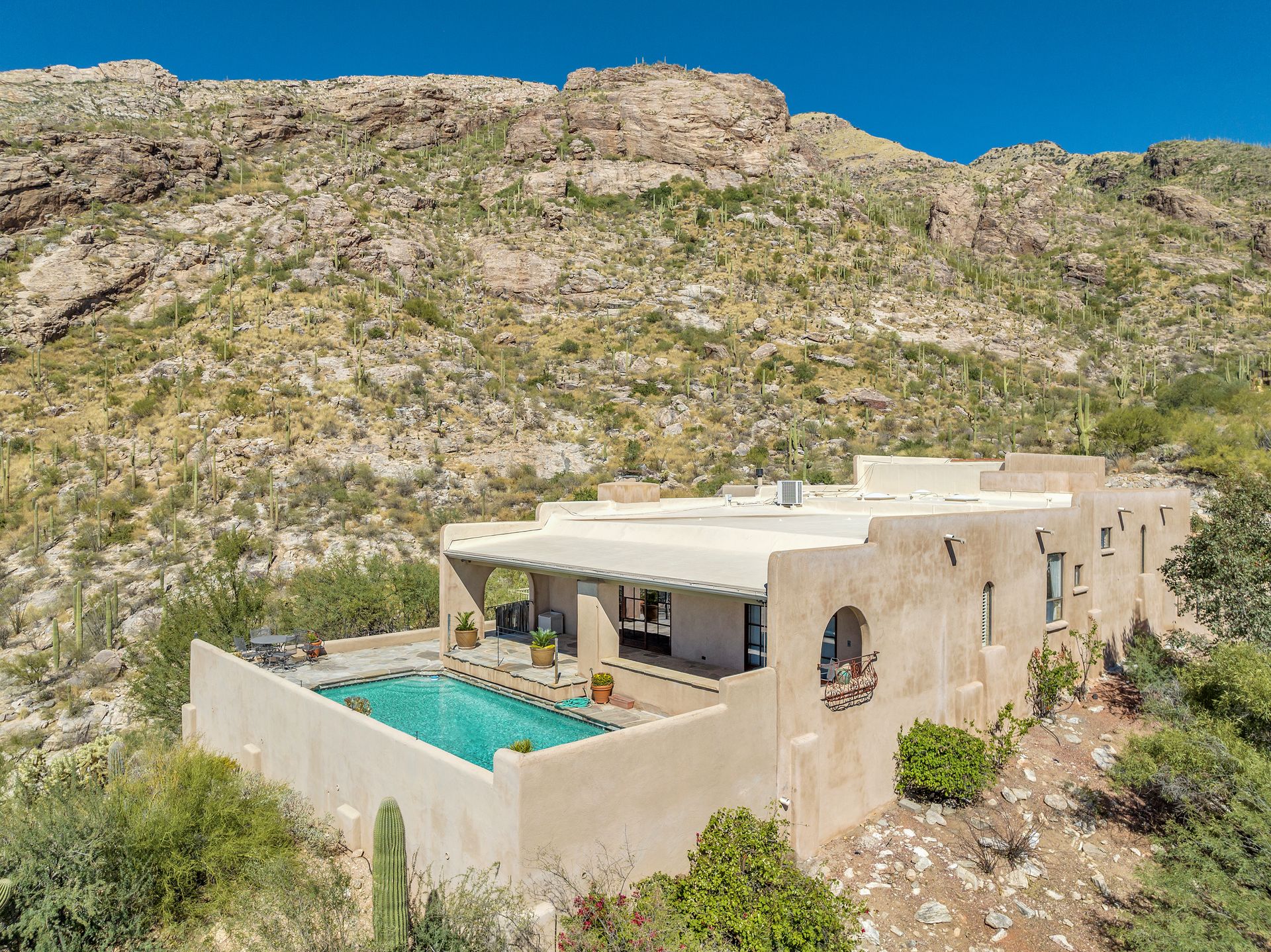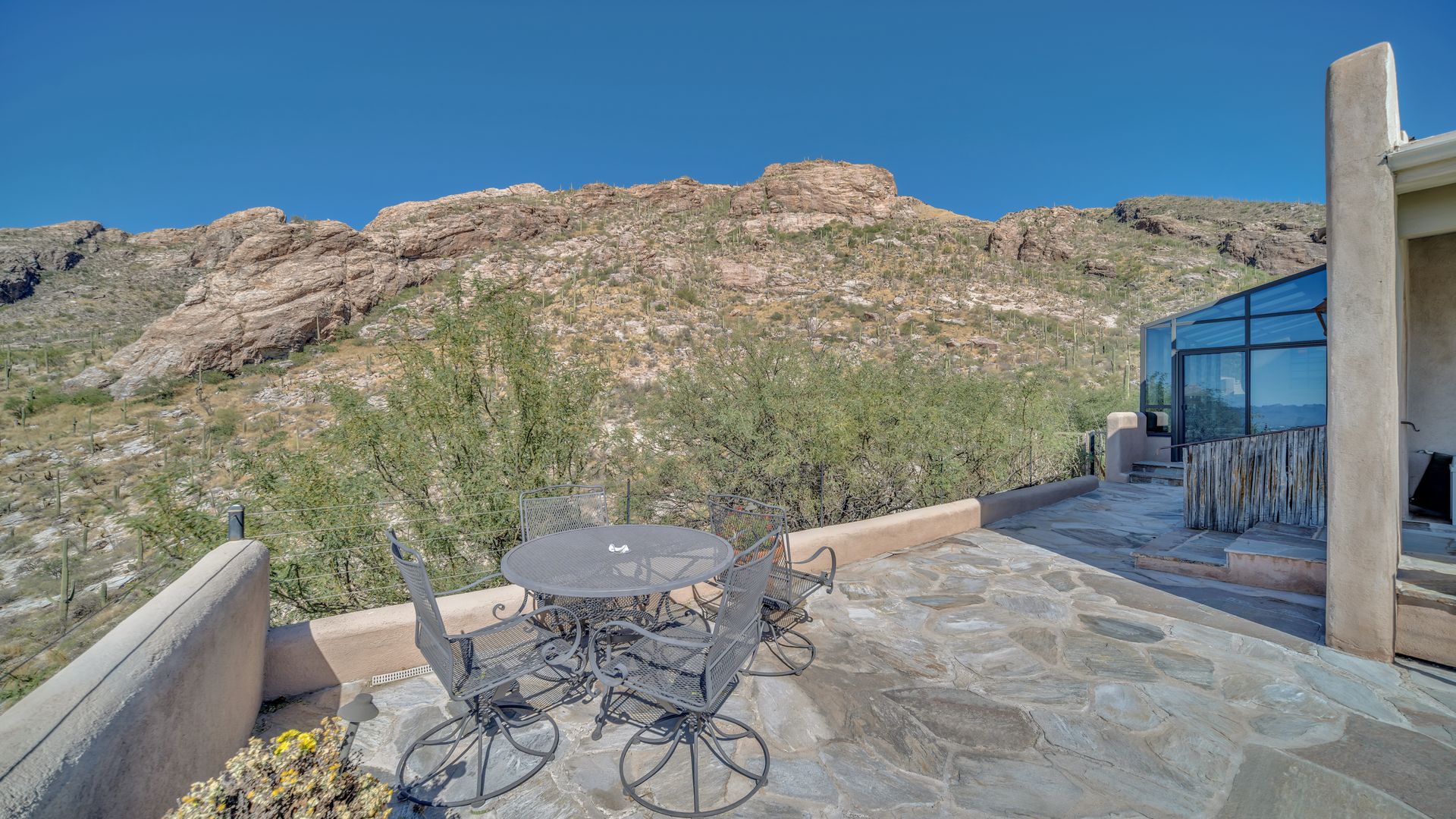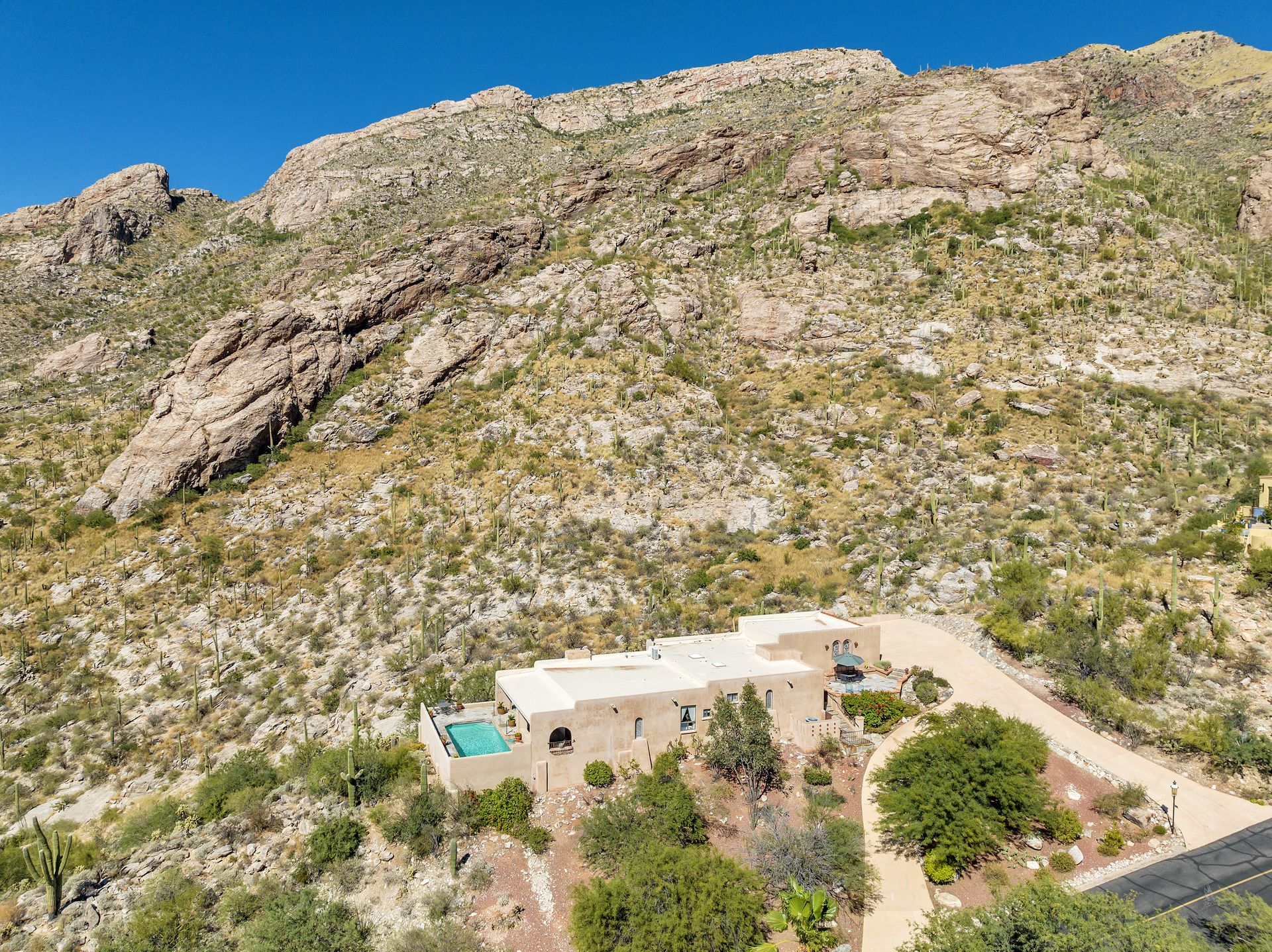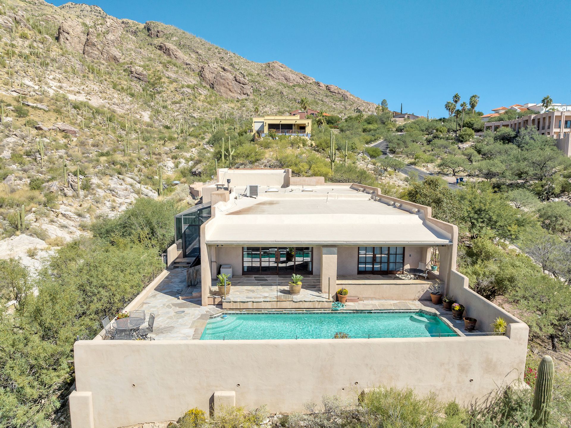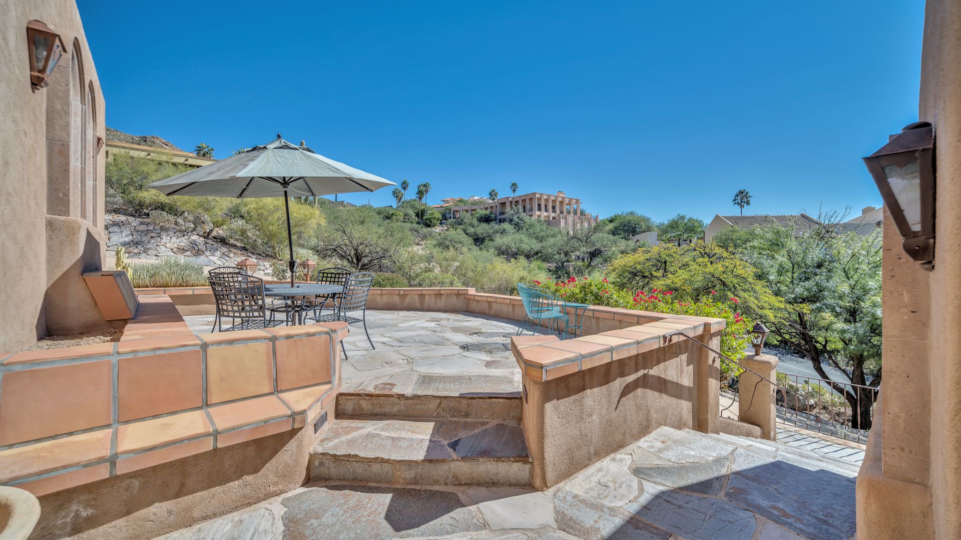 Welcome to Skyline Country Club living as it was designed to be enjoyed. This gated enclave is at the top of the Santa Catalina Foothills and borders the Coronado National Forest. Yes, this estate of more than five acres can be yours. Enjoy this ideal sized Hacienda with custom wrought iron doors, hand plastered walls, exposed vigas (beams), gourmet kitchen, world-wide sourced stonework and wood details, vintage accents, cornice crown molding, coved concaved ceilings, meticulously built courtyard, and an impeccably designed sparkling pool overlooking the entire city of Tucson, Arizona. The 180-degree view glass atrium Arizona Room is unmatched. Designed and built by famed Architect and Builder, David Fraker. Relax, Read, Write, Work, Entertain, Play. This is HOME.