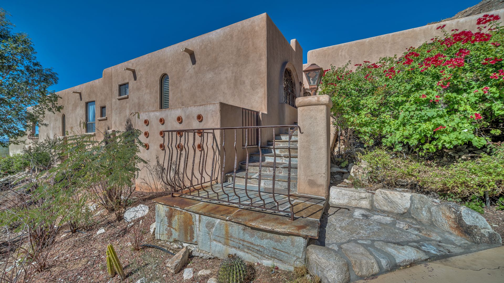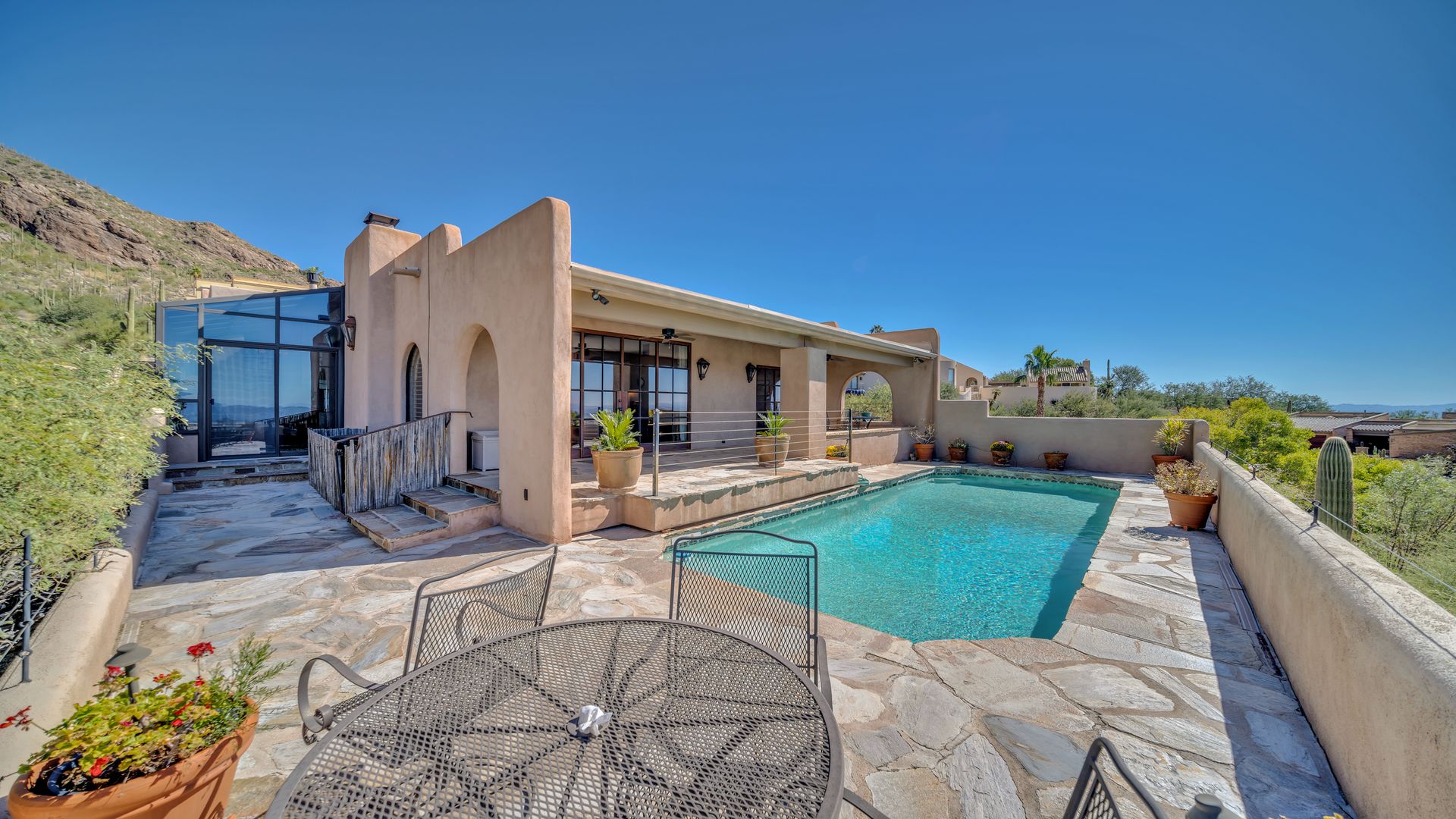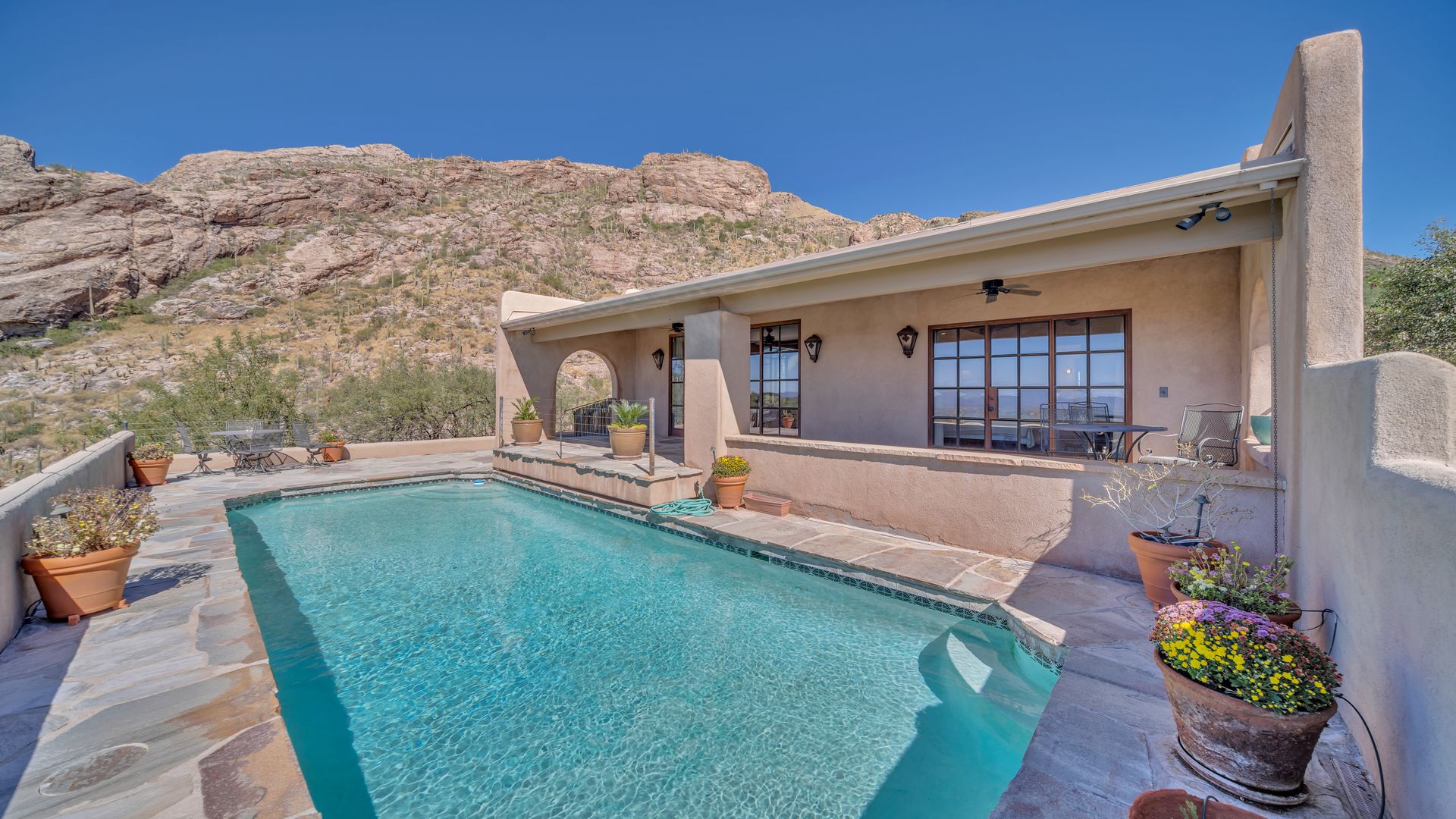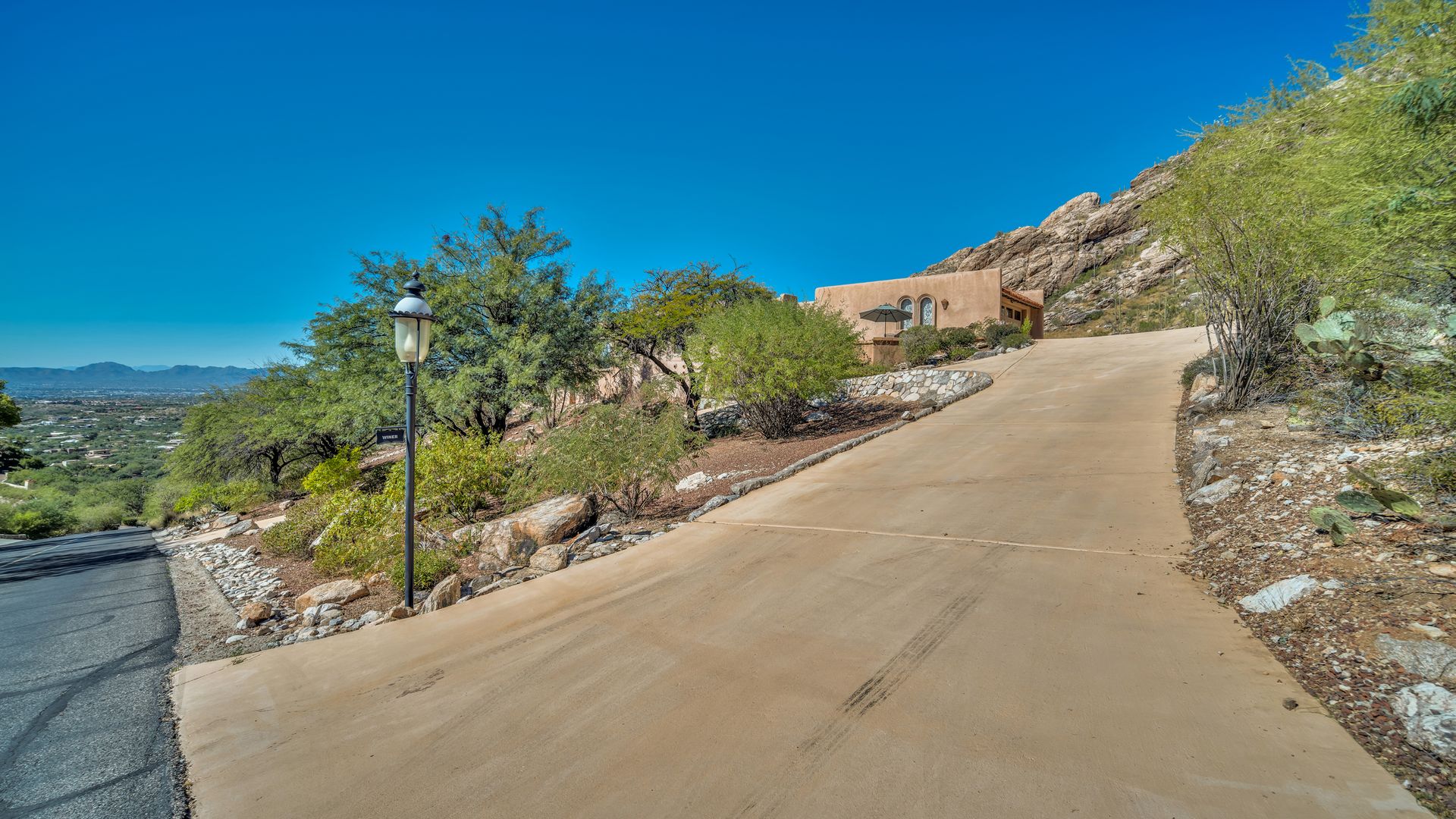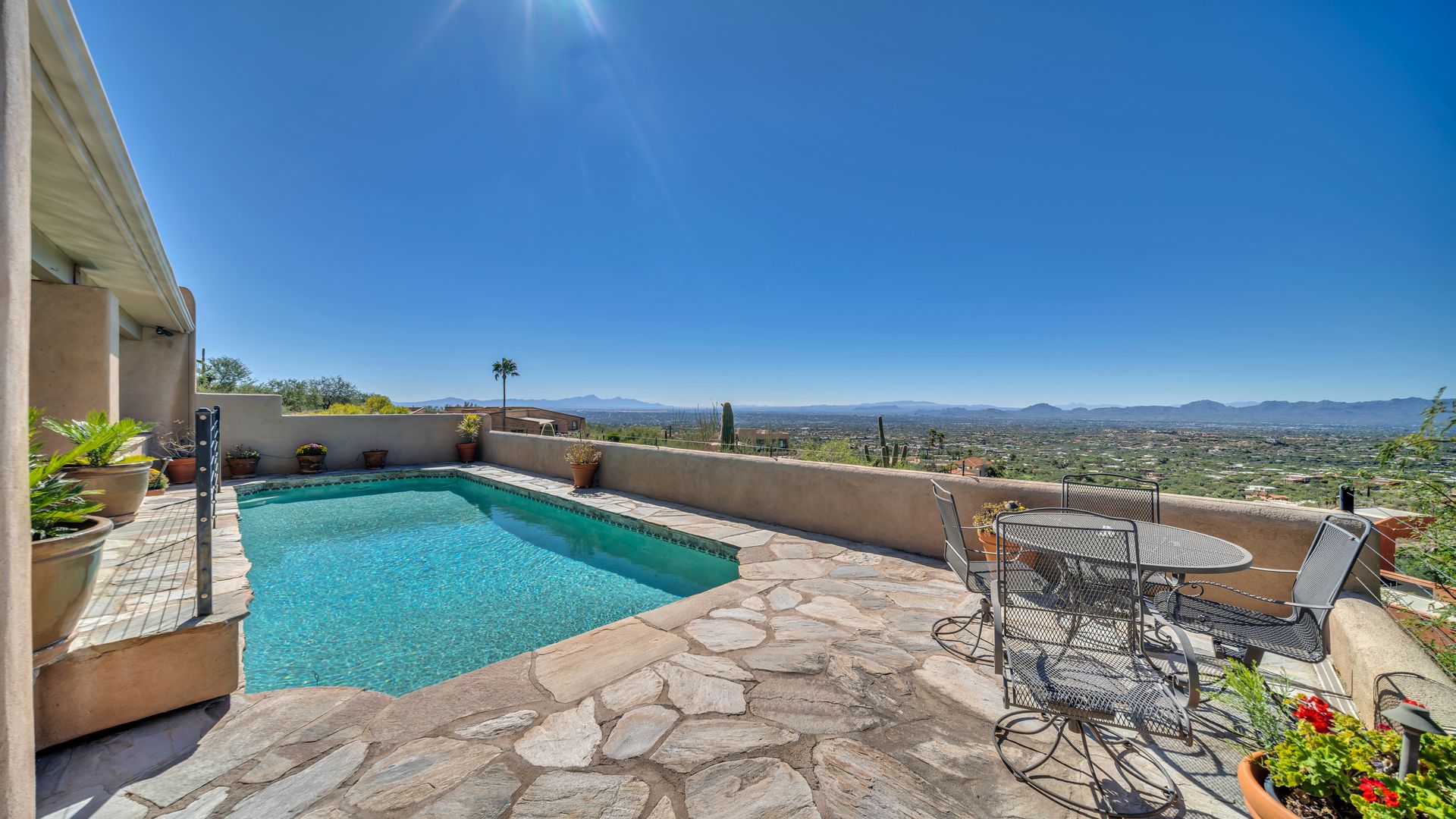 Welcome to Skyline Country Club living as it was designed to be enjoyed. This gated enclave is at the top of the Santa Catalina Foothills and borders the Coronado National Forest. Yes, this estate of more than five acres can be yours. Enjoy this ideal sized Hacienda with custom wrought iron doors, hand plastered walls, exposed vigas (beams), gourmet kitchen, world-wide sourced stonework and wood details, vintage accents, cornice crown molding, coved concaved ceilings, meticulously built courtyard, and an impeccably designed sparkling pool overlooking the entire city of Tucson, Arizona. The 180-degree view glass atrium Arizona Room is unmatched. Designed and built by famed Architect and Builder, David Fraker. Relax, Read, Write, Work, Entertain, Play. This is HOME.