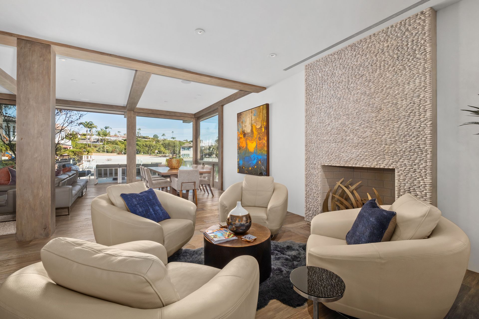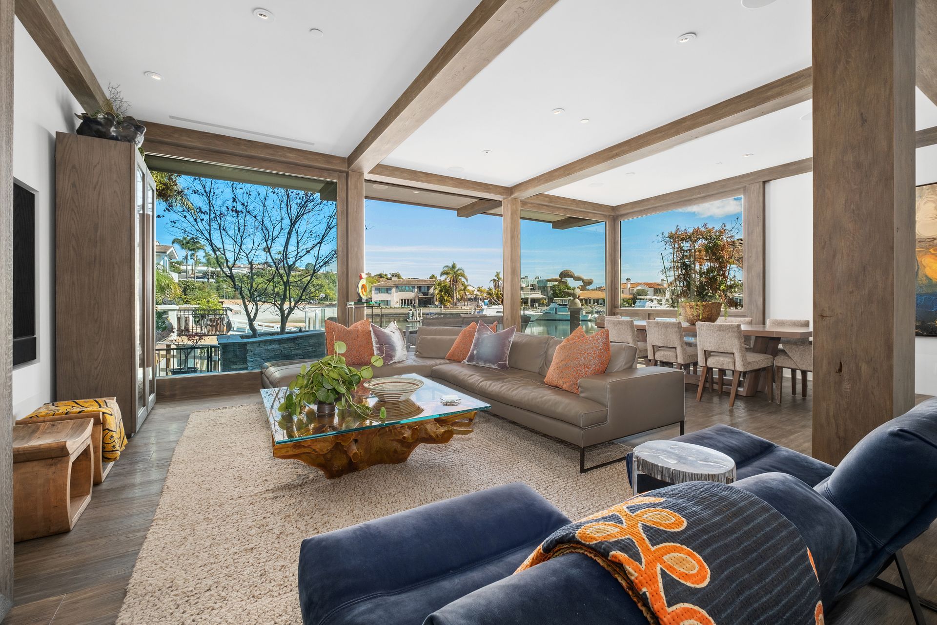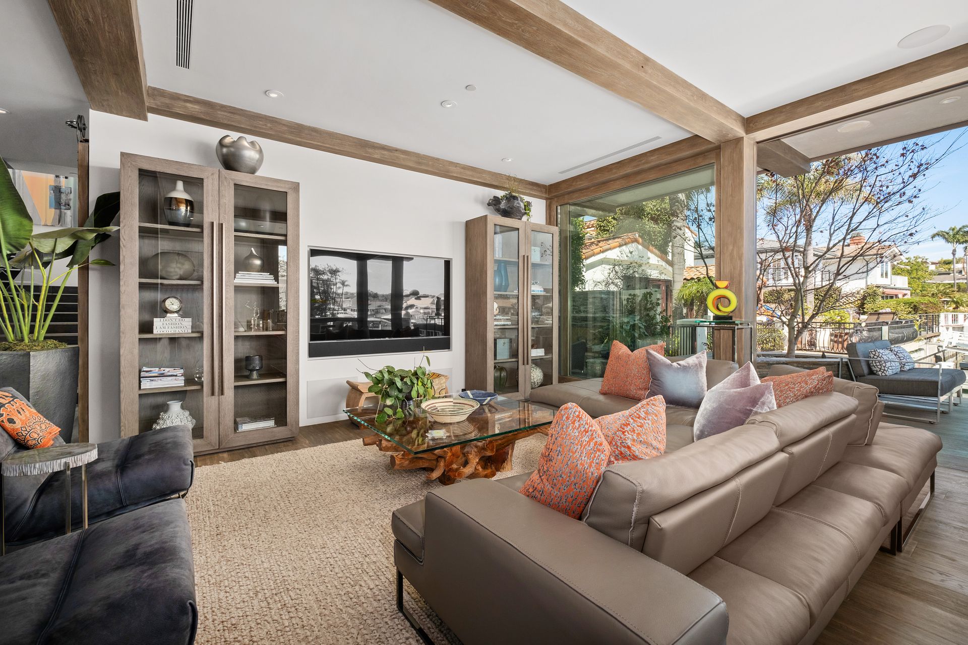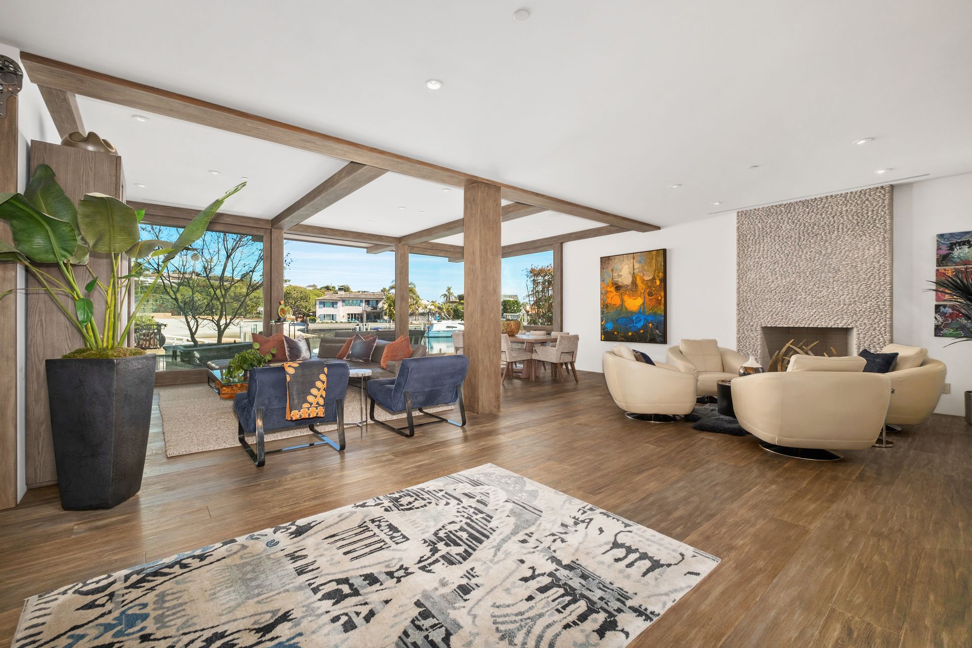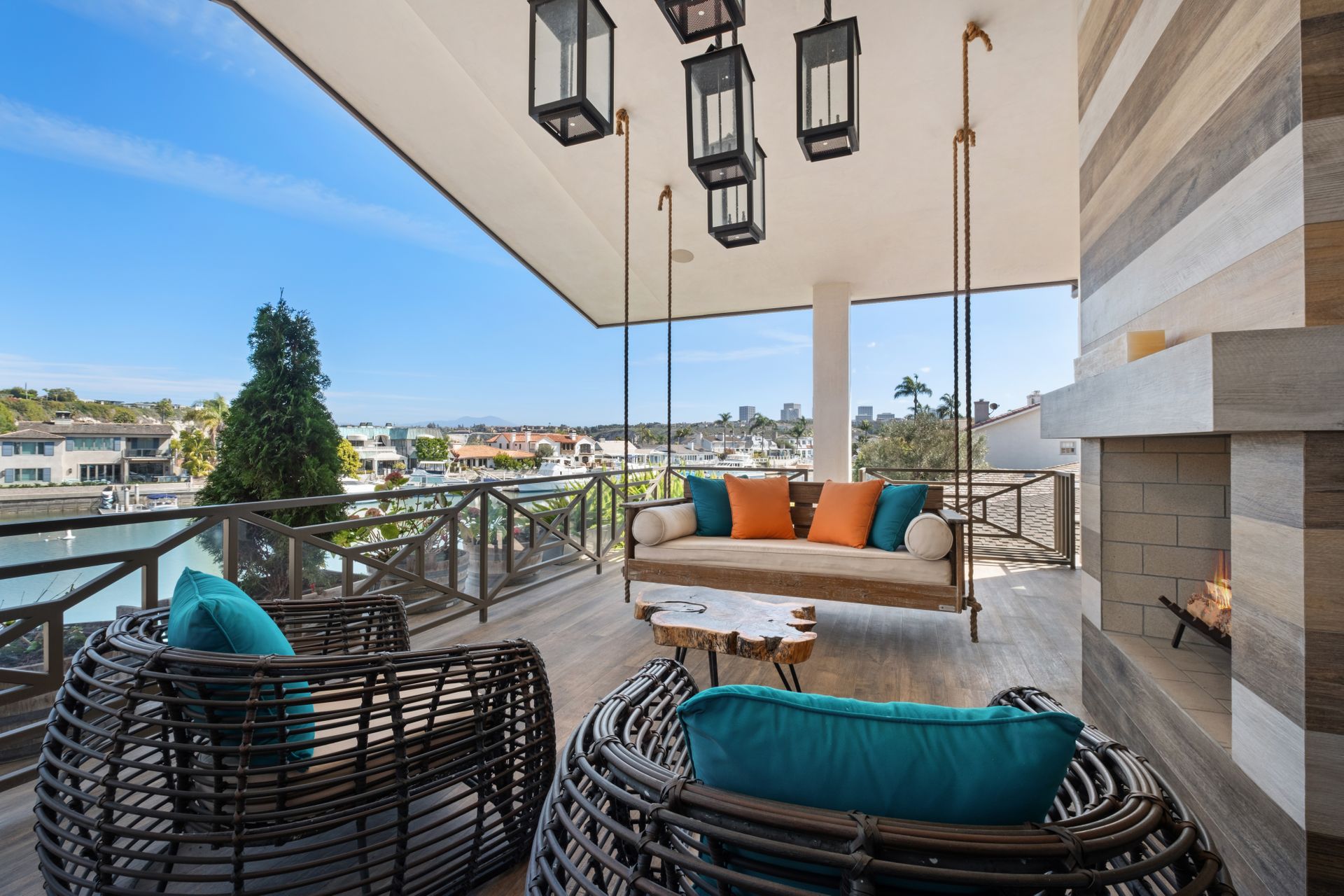 Tranquility and peace await your arrival. The custom-appointed beveled glass front doors are an inspiration leading to the foyer of this home of sophistication, elegance, and serenity with open views of the back bay, deck, and private dock. Entering inside brings you to the large living room and dining room with sliding glass doors leading to the deck and fireplace. The kitchen with custom Italian individually set tiles, wood cabinets, and an Italian Ilve Majestic oven will conjure up your true culinary senses. Also included is a kitchen counter bar with a spectacular ceiling-mounted lighting fixture, prep sink, and wine refrigerator, and Butler's pantry with a separate sink, dishwasher, and ice maker. Next to the kitchen is a large laundry room that includes a washer/dryer. Adjoining the foyer is a spacious office with a sliding glass door. The guest bathroom with custom vanity and stainless sink is next to a grand first-floor en-suite bedroom that includes a large shower and separate stainless steel tub, and a handcrafted vanity with crystal sink. The floating glass staircase is a piece of art, leading to three large en-suite bedrooms on the second level. The primary bedroom is an enormous space including extensive closets and mirrors. The bedroom area has views of the back bay, mountains, Fashion Island, and city lights. The upper deck features open views, a wood-burning fireplace, and a specially made sofa swing. At the top of the stairs is another en-suite bedroom with privacy. Around the window-lined hallway is another expansive bedroom with a service bar capable of housing several guests. There are electric window shades throughout the home as well as Smart Home cameras, locks, lighting, etc. On the exterior of this bayside property, is a secluded deck with a fireplace and glass rails leading to the privately owned dock capable of housing a 55-foot yacht. Click here for a virtual tour.