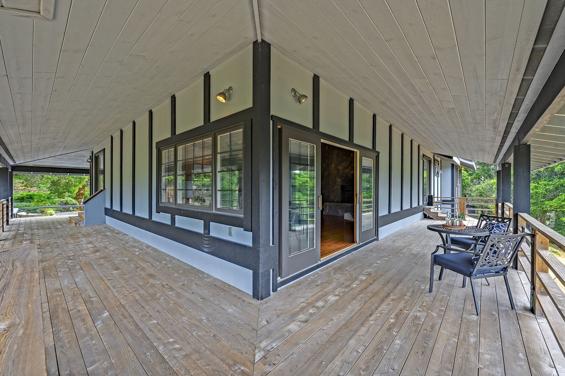 Situated on approximately three acres, this approximately 2,368 square foot, three-bedroom, two-bath home has an Asian influence and lots of appeal. Featuring a large eat-in kitchen and living room with vaulted ceilings and a spectacular floor-to-ceiling stone fireplace with hardwood floors in the living room, dining room and hallway. Most of the rooms are open to the outside, with a large wraparound deck covering three-quarters of the home. The deck is made with a very durable imported wood from the Philippines. The primary bedroom is quite large with access to a deck, cedar lined closet and there is a bonus room behind it. The primary bath is also very large with a walk-in shower, double sink, separate toilet, a closet and room for more. One of the most unique concepts about the home is that there are no gutters, when it rains, the rain falls into troughs built around the home to create a water feature. There is a large two-car carport, and the basement has a storage room and space for more. All of this is on approximately three acres of land on a private road.