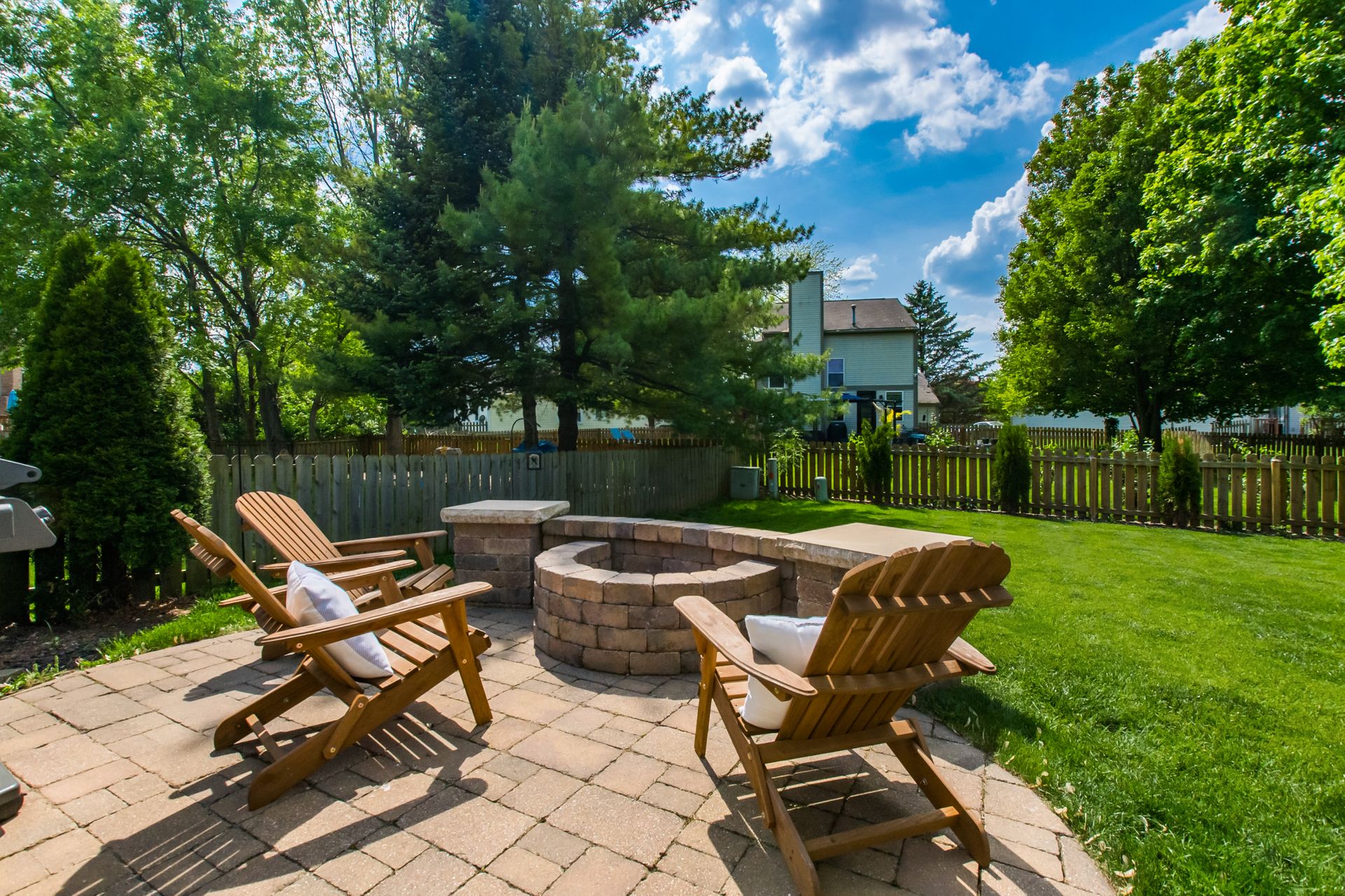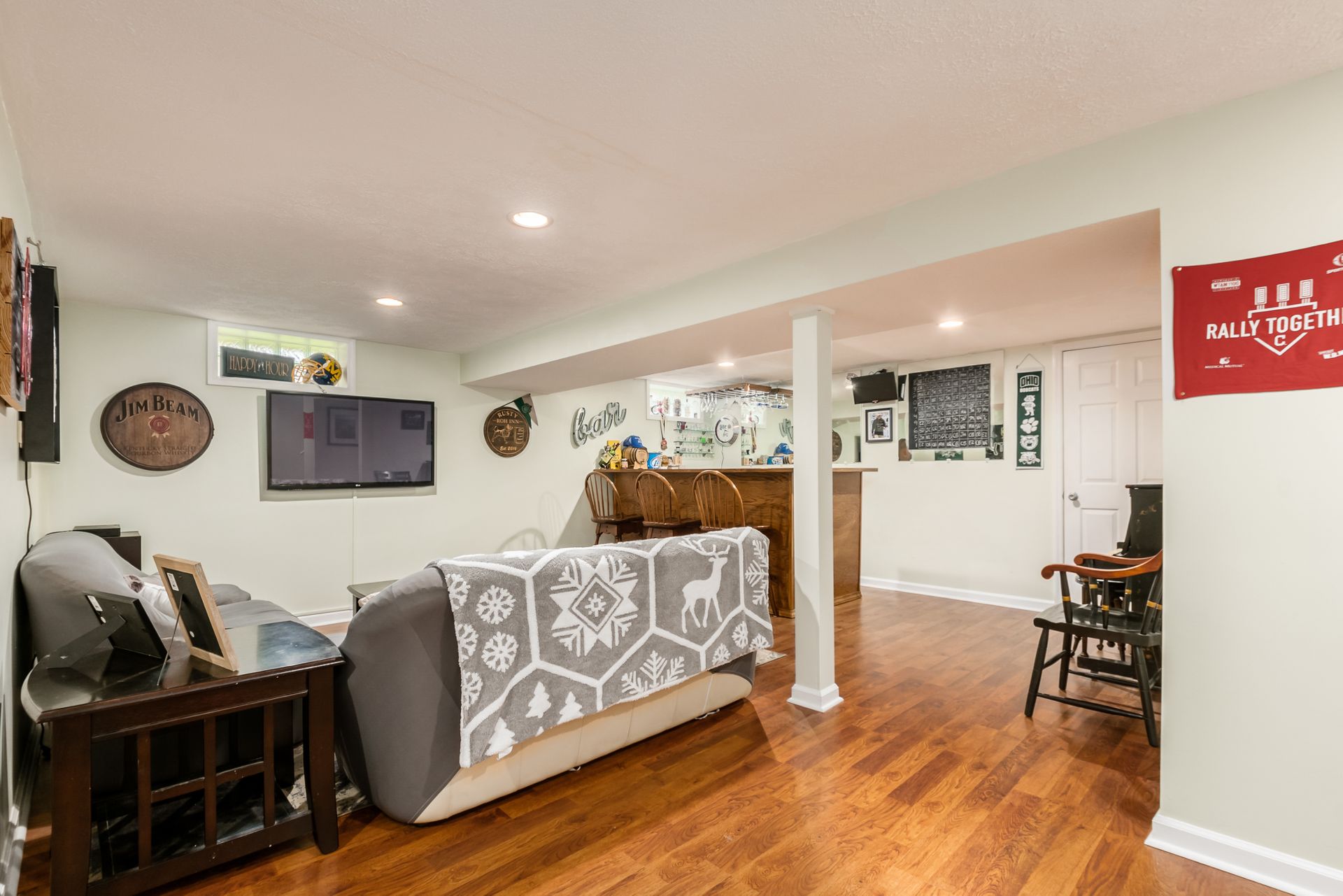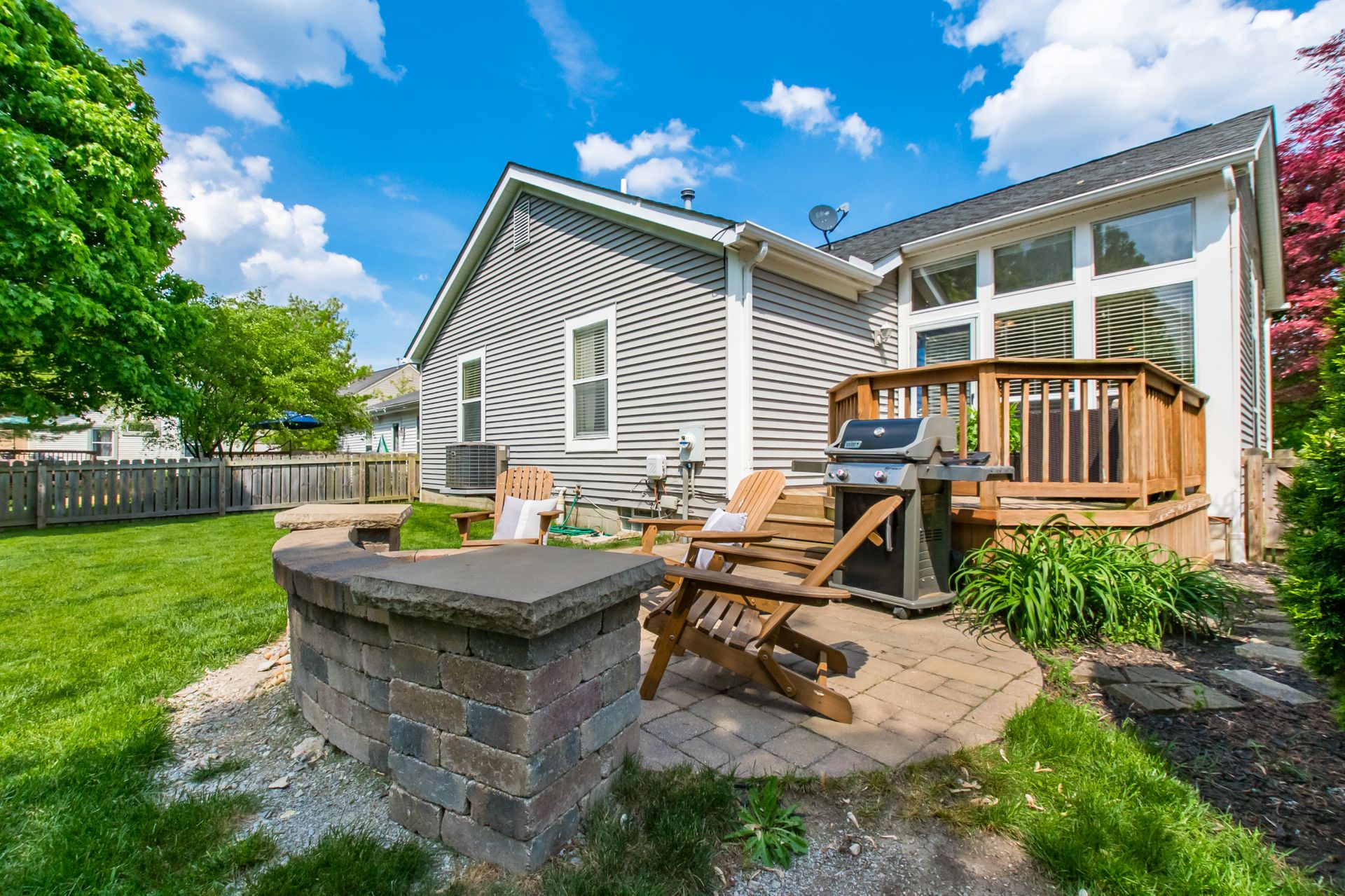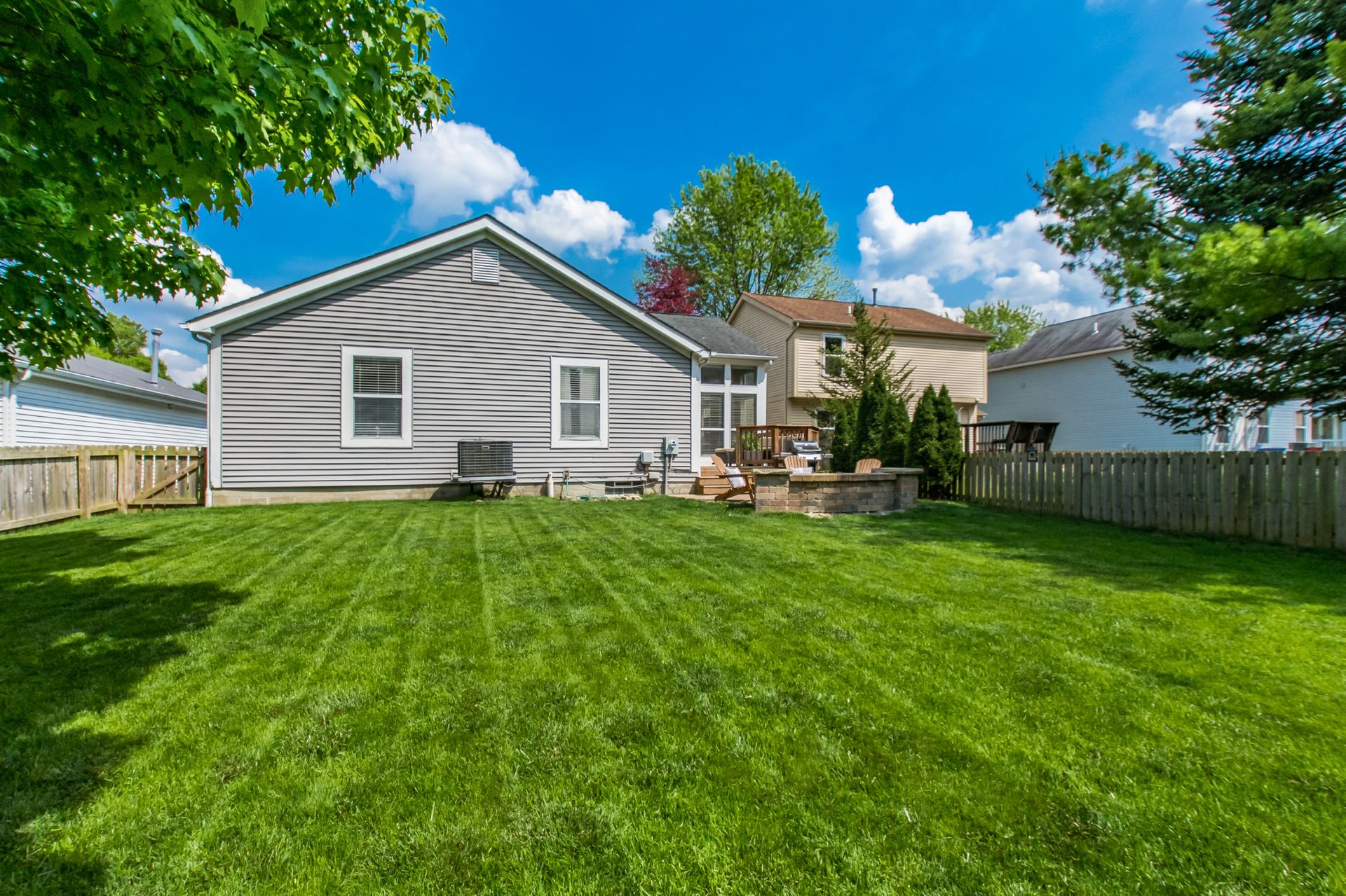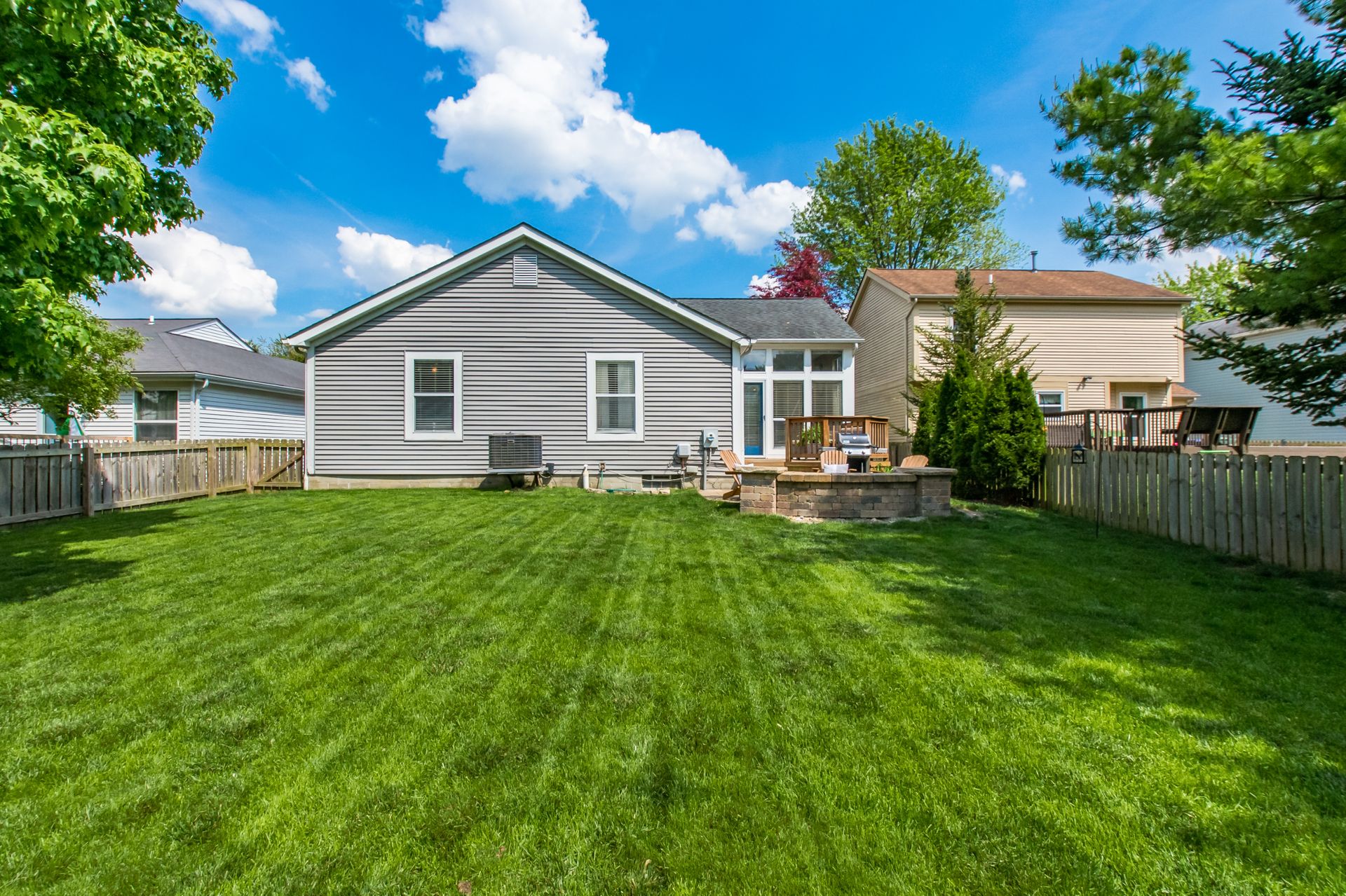 Open and airy one-story with plenty of natural light and an abundance of windows! Stainless appliances in the roomy, eat-in kitchen conveniently located next to laundry/mud room. High ceilings enhance the openness. Master suite has awesome dual closet space. Lower level has large built-in bar, recreation space, play space and/or movie viewing. Plus, ample storage room. Bring the outdoors in with an awesome deck to paver patio and built-in firepit. Plenty of green space in fully fenced backyard.