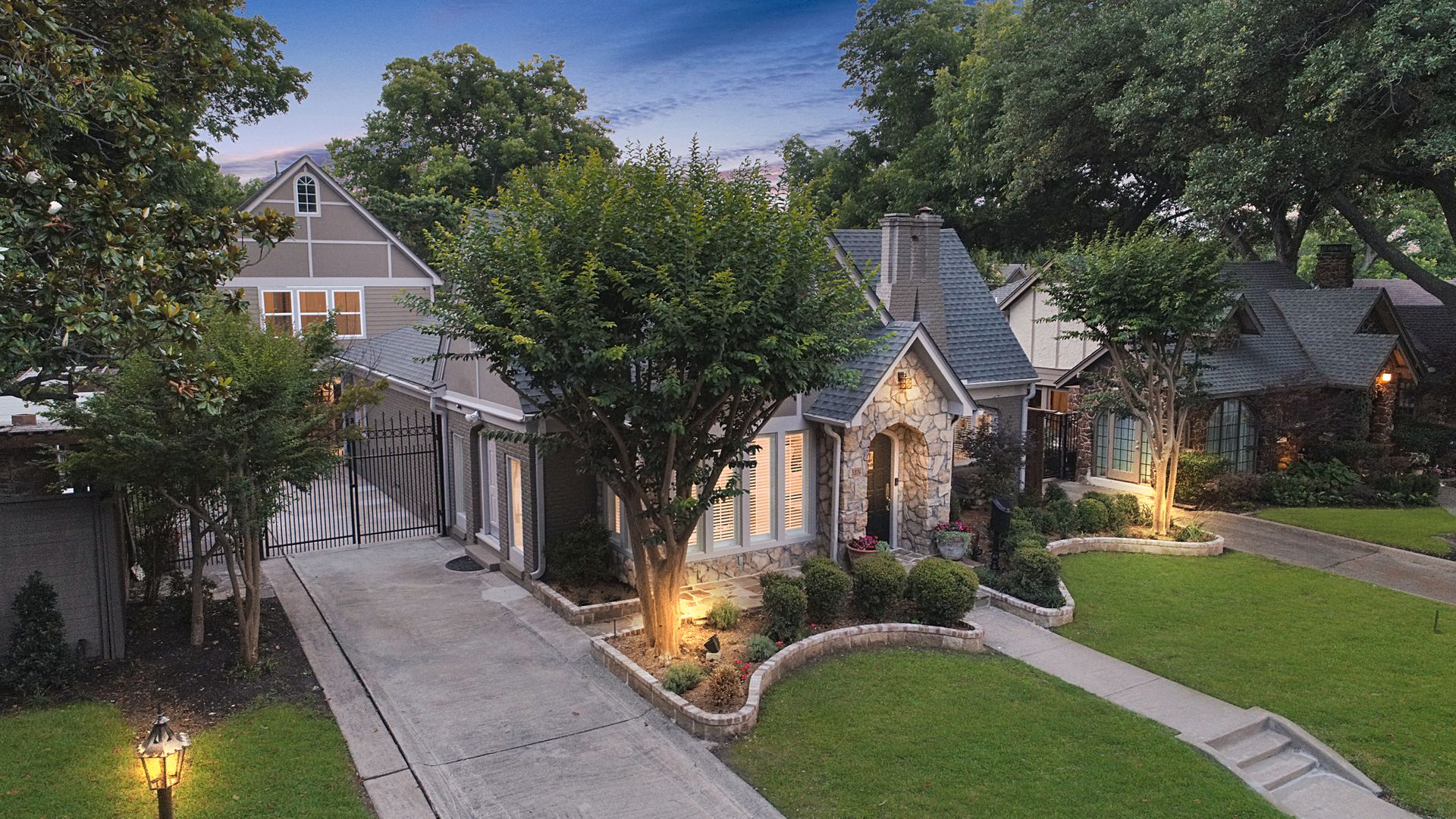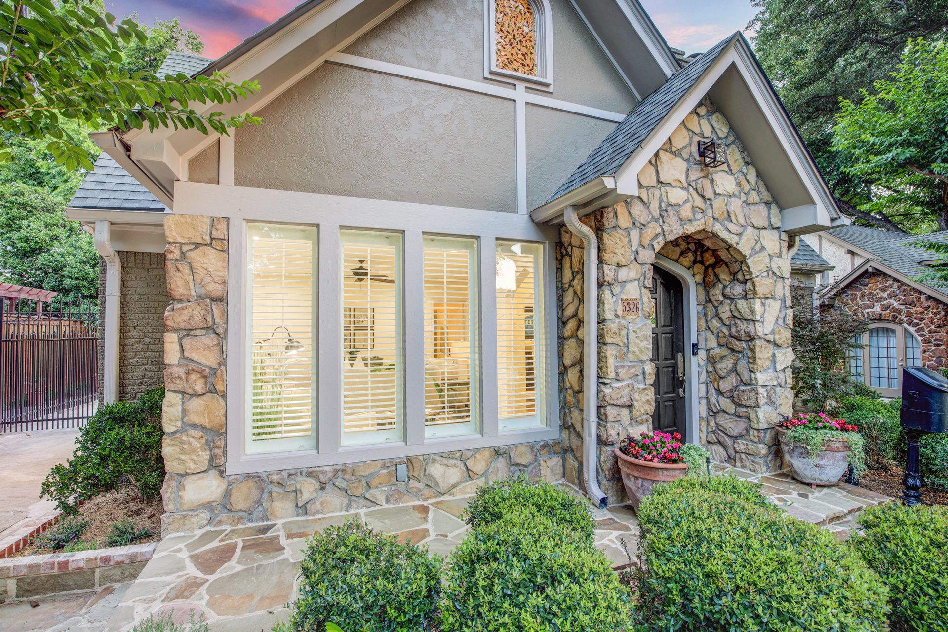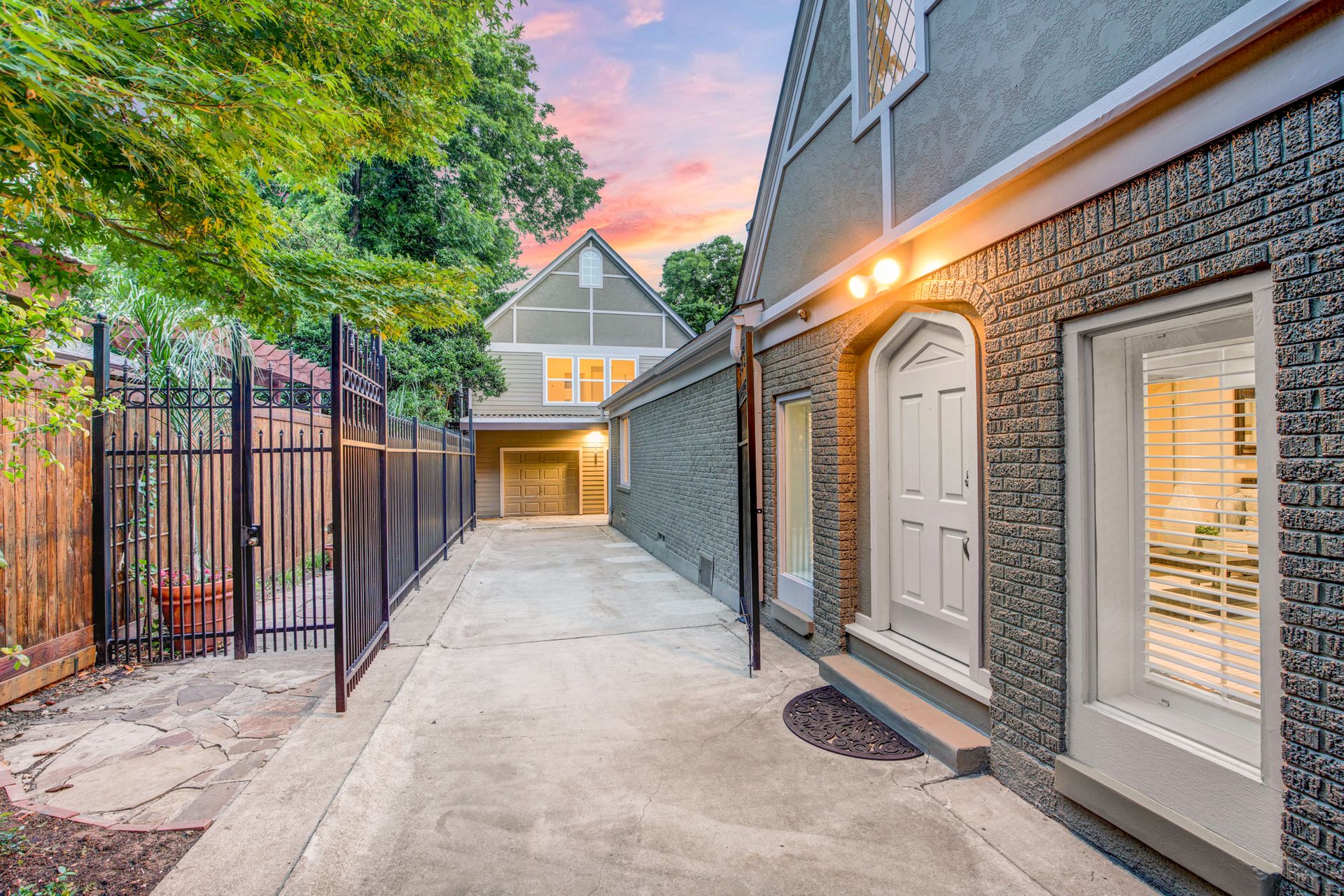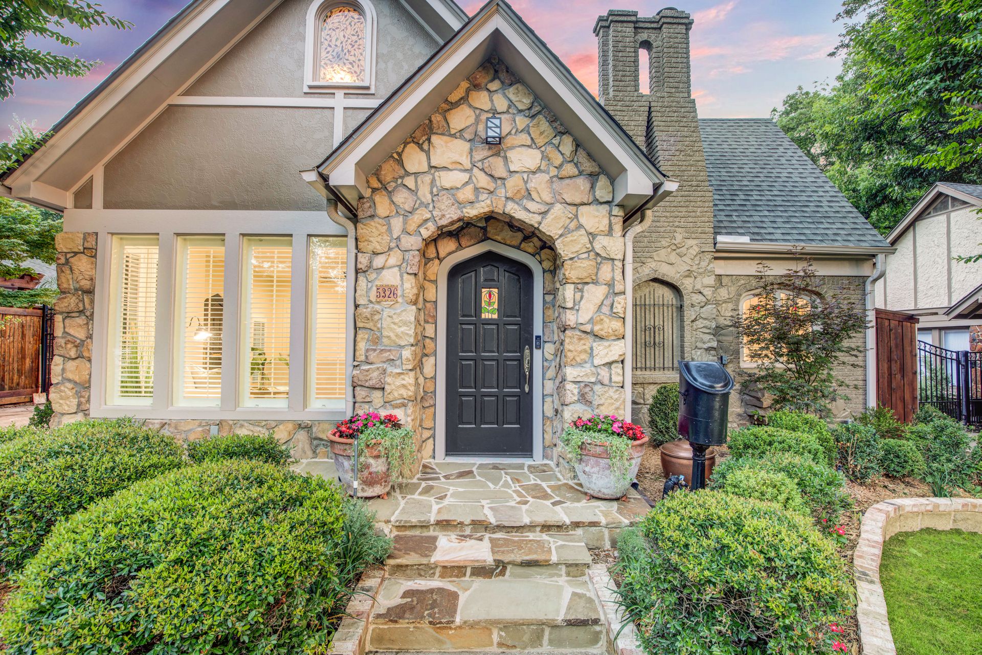 This classic 1925 Tudor has been masterfully updated and features a seamless melding of historic architectural charm and modern living. Fabulous kitchen is outftted with a large commercial Viking gas range and vent hood, pot filler, built-in refrigerator, and center island with wine fridge. There are four bedrooms and three full bathrooms in the main house. Numerous stained glass cathedral glass windows with historic Tudor appeal, and dual pane windows throughout. Large primary bedroom with ensuite bathroom with dual closets. Oversized detached garage with separate storage room and half bath. There is a spacious 633 square foot apartment above the garage (not included in total square footage) with living, bedroom, bath, and kitchen that is perfect for guests or rental income property. Wrought iron driveway gate and pedestrian gate provide separate access to garage apartment offering privacy and convenience. Beautiful low maintenance backyard with large deck, flagstone patio and lush landscape.