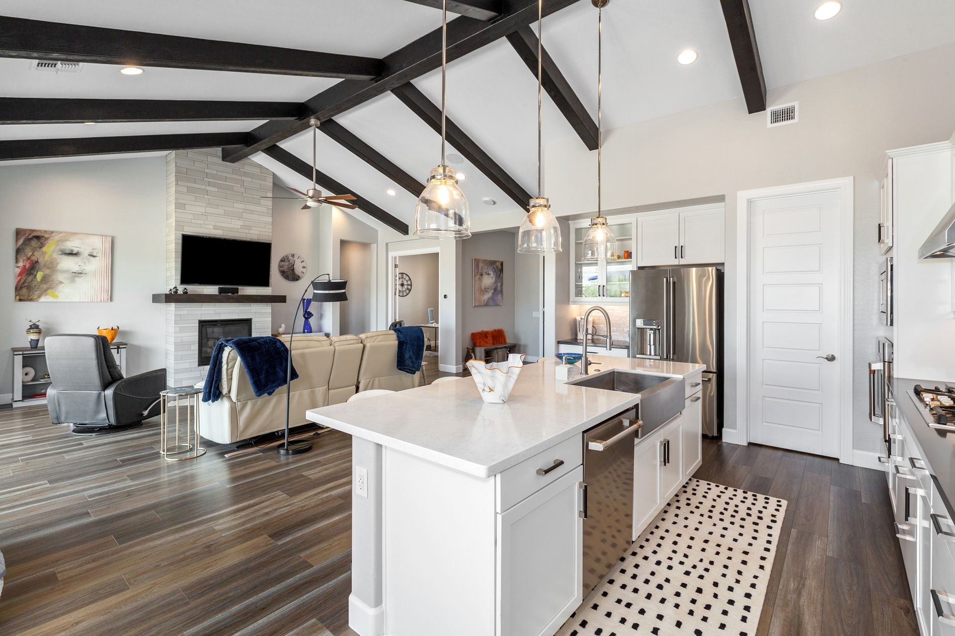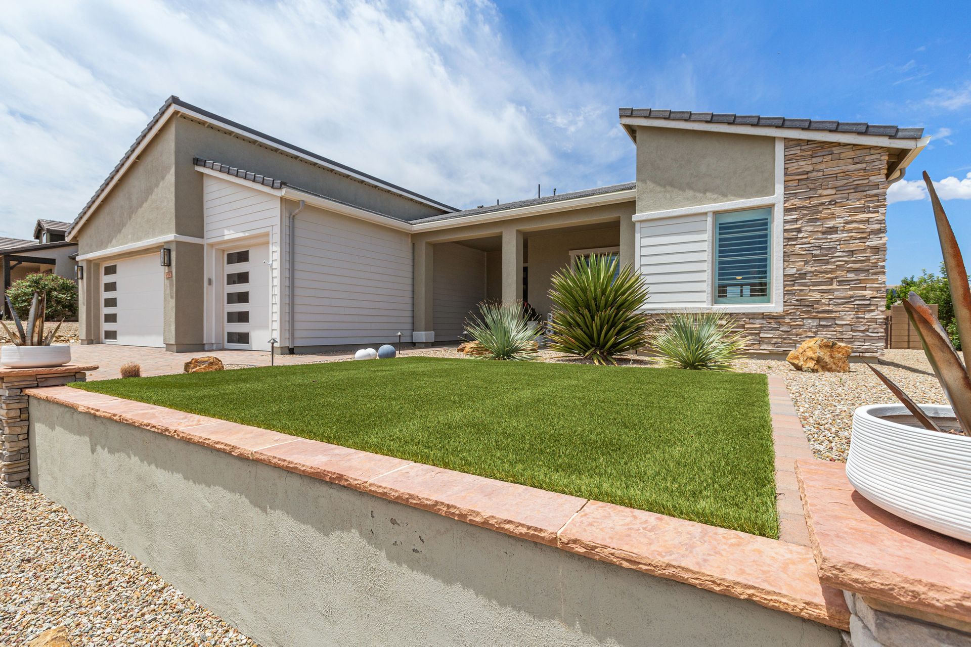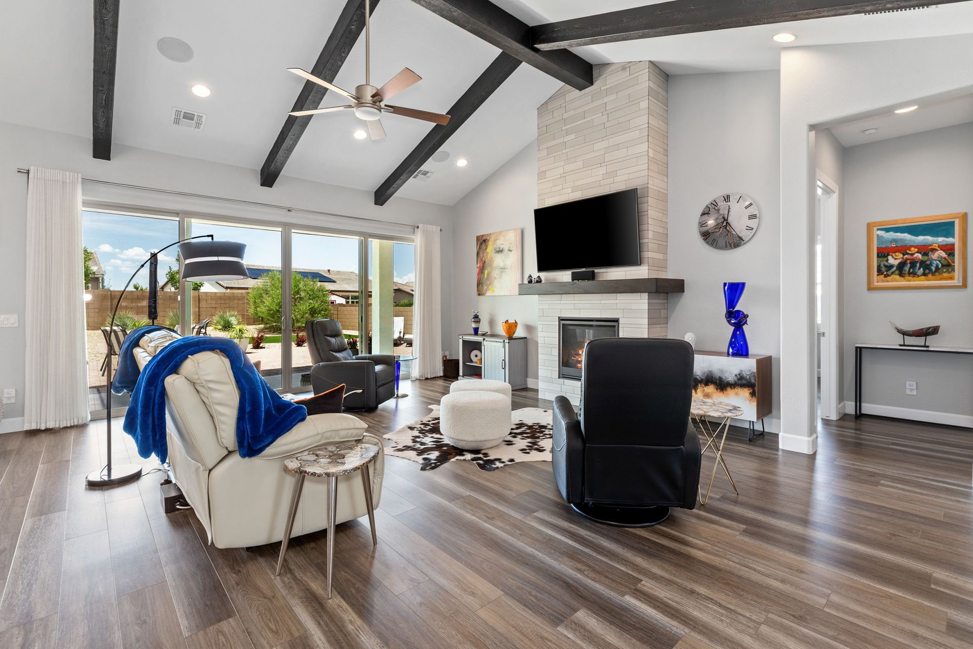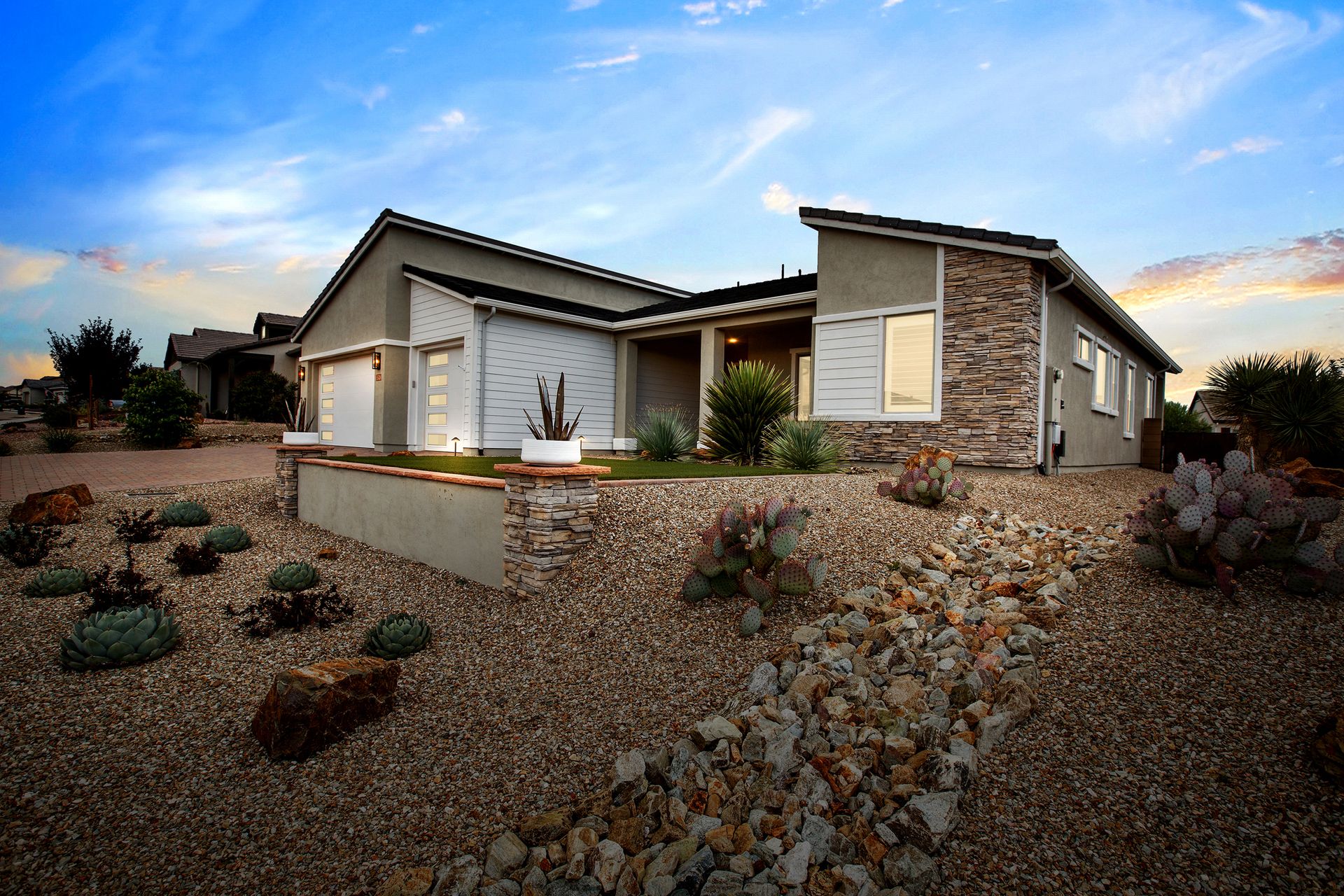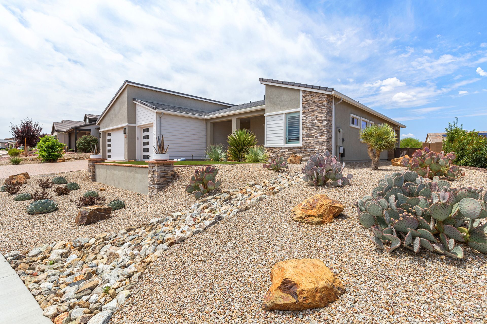 Magnificent modern style home in sought-after Granite Dells Estates! This 3 bed/2.5 bath + office, ''Sunflower floor plan'', has the elegance of modern design influences. The front yard invites you with a calming splash of green turf. Make your way to the main entry through the covered patio with seating area. Enter through the modern paneled front door into the entry vestibule with an immediate view of the open floor plan with vaulted ceilings, wood beams, floor-to-ceiling custom tiled fireplace and massive sun-drenched windows. The incredible chef's kitchen is equipped with a suite of GE Café including; refrigerator/freezer, gas cooktop, dishwasher, and baker's French-door wall oven. The kitchen cabinets are a crisp white with stainless pulls and just the right amount of stylish glass door upper cabinets. There's ample counter space with a huge island, quartz countertops, stylish pendant lights, stainless farm sink, designer backsplash, and walk-in pantry. The flooring throughout the home is luxury polymer plank flooring (no carpet). The primary bedroom is an elegant retreat with ensuite that has quartz counters w/dual sinks, freestanding tub, custom tiled glass shower, and a large walk-in closet. This split floor plan has two guest bedrooms with a hall bath. The laundry hallway includes Samsung washer/dryer, features a drop zone and a powder room. There is added quality with upgraded cabinets, quartz counters, paddle fans, custom tile and plantation shutters throughout. Enjoy the indoor-outdoor living with this Large (.29 Acre) lot that has an oversized paver patio, aqua-glass firepit, relaxing turf areas, and maturing trees. The insulated garage is extra-large with 4 ft extension, and includes wall storage cabinets, ceiling mounted storage and a workbench. Also, includes a whole house water purification system. This gem in Granite Dells Estates won't last long! MLS#6733825