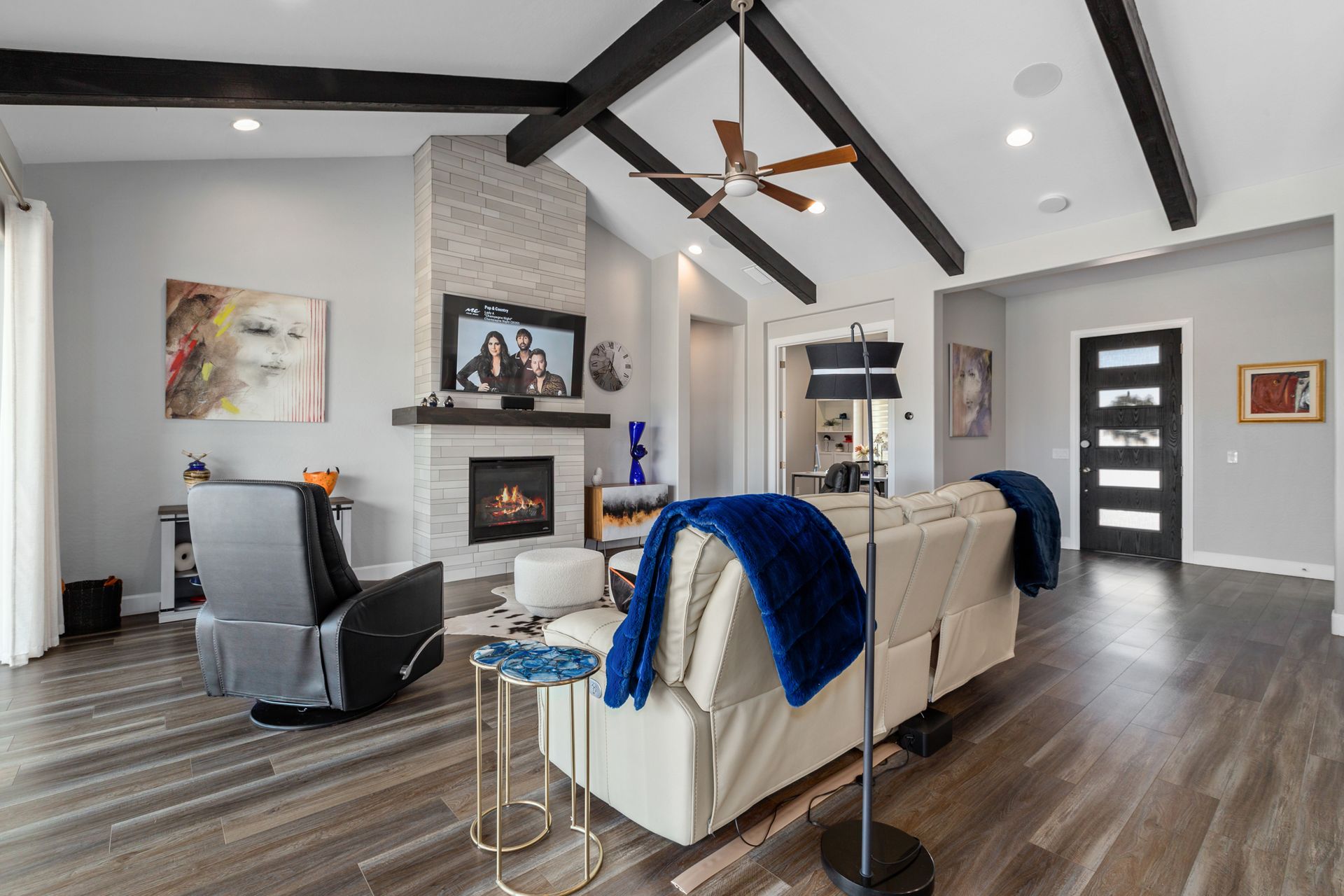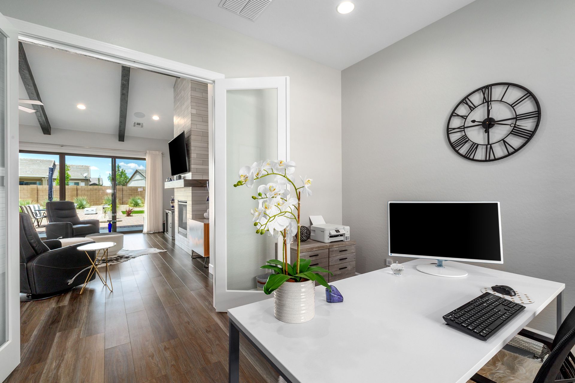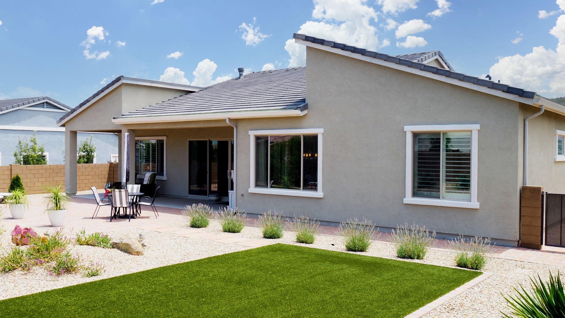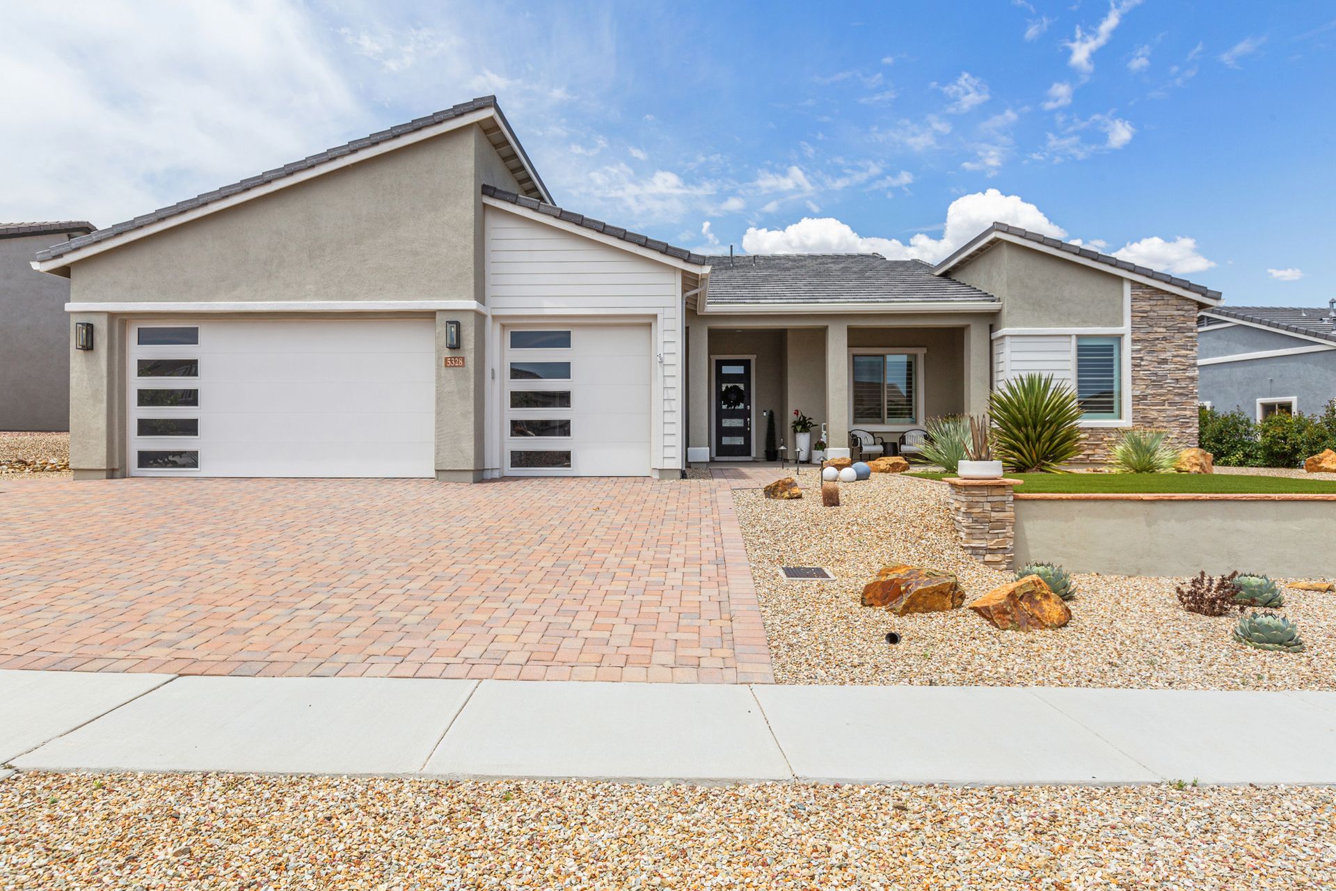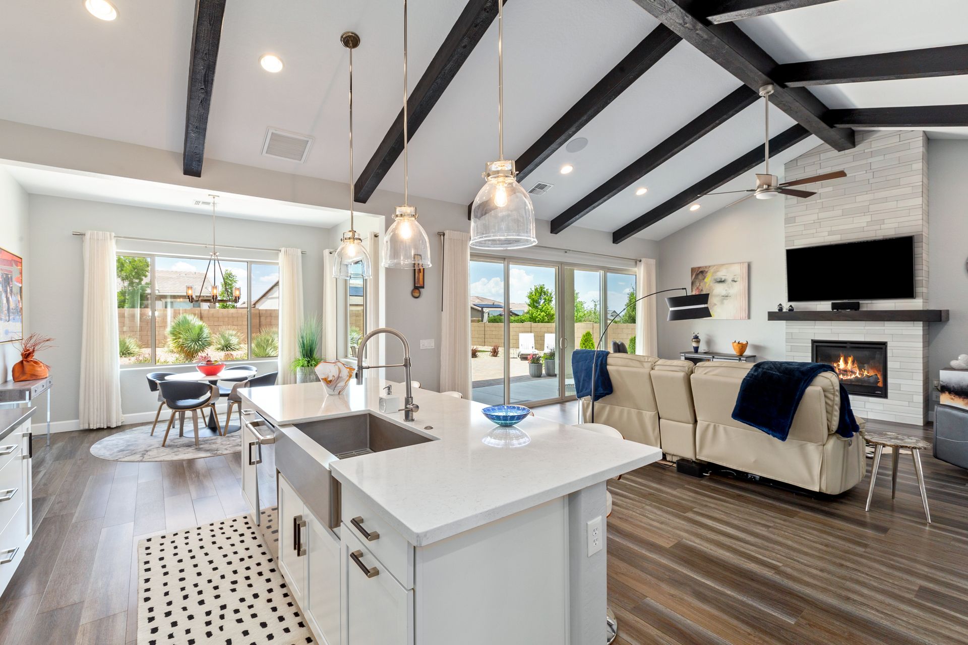 Magnificent modern style home in sought-after Granite Dells Estates! This 3 bed/2.5 bath + office, ''Sunflower floor plan'', has the elegance of modern design influences. The front yard invites you with a calming splash of green turf. Make your way to the main entry through the covered patio with seating area. Enter through the modern paneled front door into the entry vestibule with an immediate view of the open floor plan with vaulted ceilings, wood beams, floor-to-ceiling custom tiled fireplace and massive sun-drenched windows. The incredible chef's kitchen is equipped with a suite of GE Café including; refrigerator/freezer, gas cooktop, dishwasher, and baker's French-door wall oven. The kitchen cabinets are a crisp white with stainless pulls and just the right amount of stylish glass door upper cabinets. There's ample counter space with a huge island, quartz countertops, stylish pendant lights, stainless farm sink, designer backsplash, and walk-in pantry. The flooring throughout the home is luxury polymer plank flooring (no carpet). The primary bedroom is an elegant retreat with ensuite that has quartz counters w/dual sinks, freestanding tub, custom tiled glass shower, and a large walk-in closet. This split floor plan has two guest bedrooms with a hall bath. The laundry hallway includes Samsung washer/dryer, features a drop zone and a powder room. There is added quality with upgraded cabinets, quartz counters, paddle fans, custom tile and plantation shutters throughout. Enjoy the indoor-outdoor living with this Large (.29 Acre) lot that has an oversized paver patio, aqua-glass firepit, relaxing turf areas, and maturing trees. The insulated garage is extra-large with 4 ft extension, and includes wall storage cabinets, ceiling mounted storage and a workbench. Also, includes a whole house water purification system. This gem in Granite Dells Estates won't last long! MLS#6733825