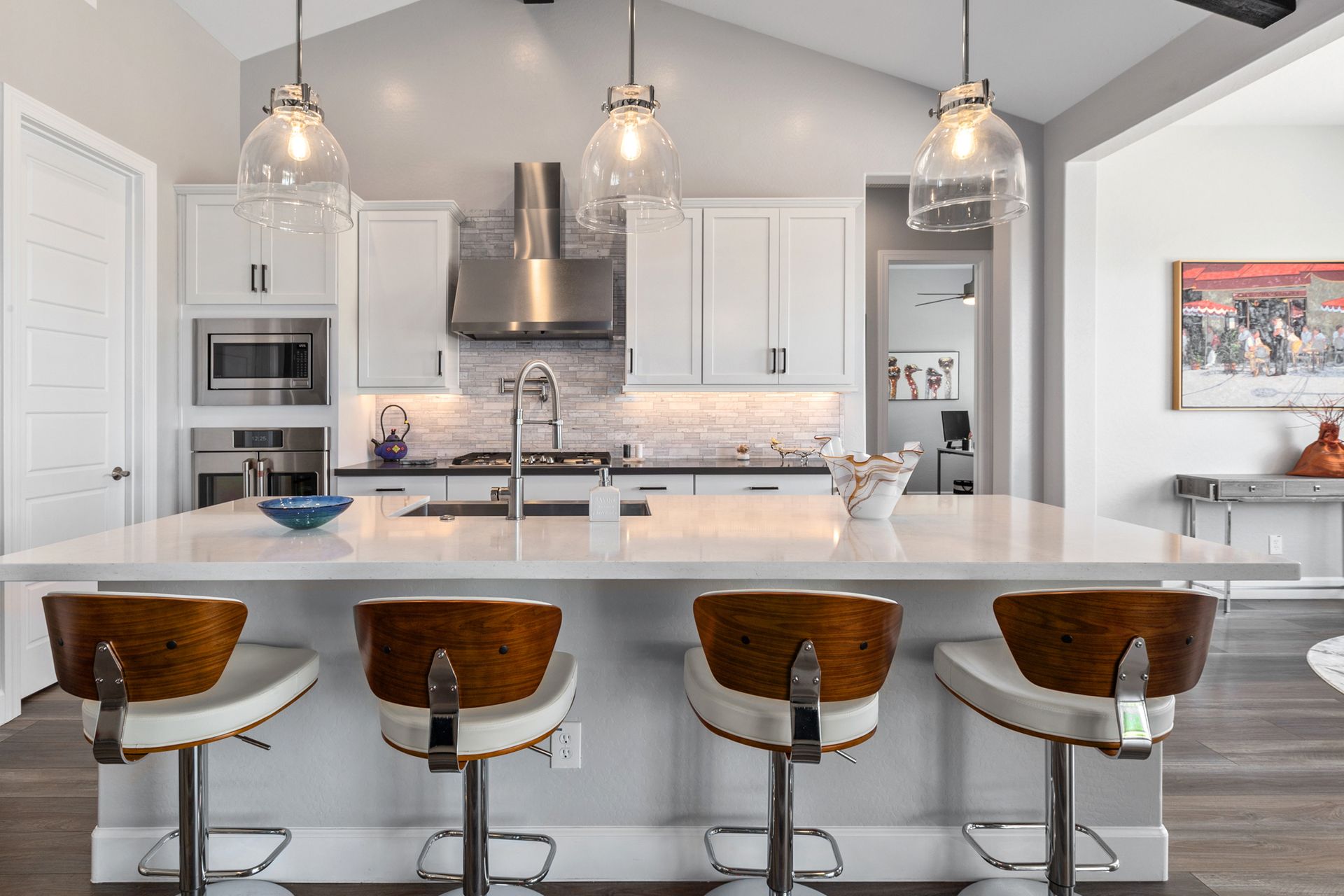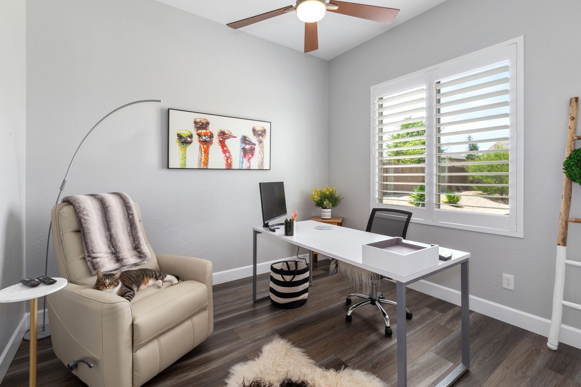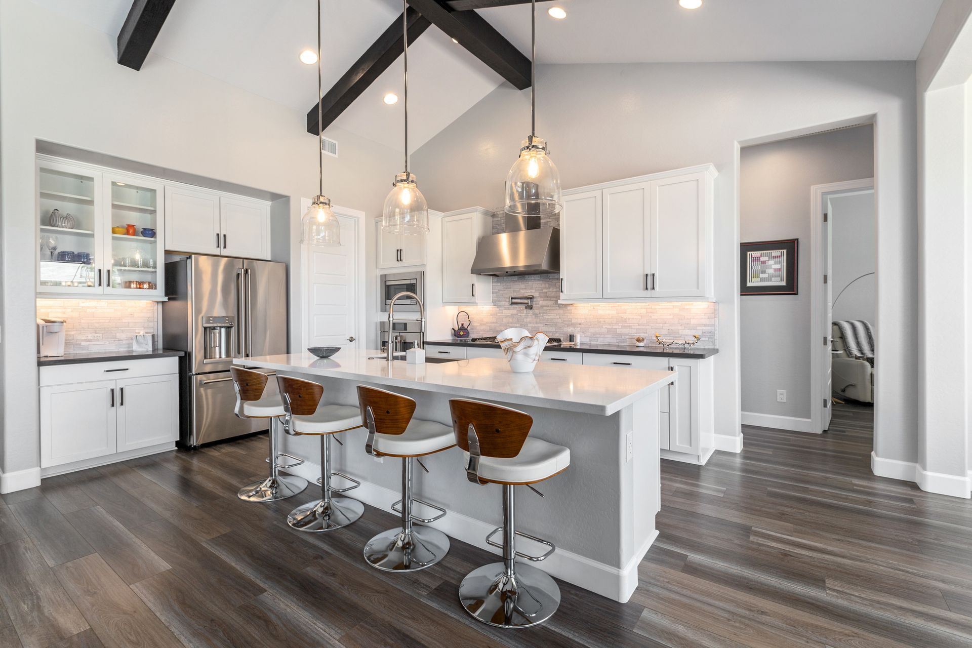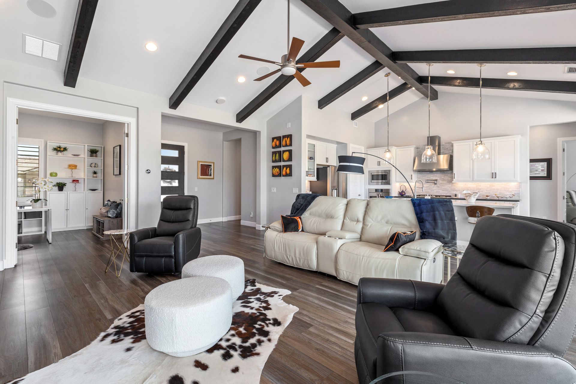 Magnificent modern style home in sought-after Granite Dells Estates! This 3 bed/2.5 bath + office, ''Sunflower floor plan'', has the elegance of modern design influences. The front yard invites you with a calming splash of green turf. Make your way to the main entry through the covered patio with seating area. Enter through the modern paneled front door into the entry vestibule with an immediate view of the open floor plan with vaulted ceilings, wood beams, floor-to-ceiling custom tiled fireplace and massive sun-drenched windows. The incredible chef's kitchen is equipped with a suite of GE Café including; refrigerator/freezer, gas cooktop, dishwasher, and baker's French-door wall oven. The kitchen cabinets are a crisp white with stainless pulls and just the right amount of stylish glass door upper cabinets. There's ample counter space with a huge island, quartz countertops, stylish pendant lights, stainless farm sink, designer backsplash, and walk-in pantry. The flooring throughout the home is luxury polymer plank flooring (no carpet). The primary bedroom is an elegant retreat with ensuite that has quartz counters w/dual sinks, freestanding tub, custom tiled glass shower, and a large walk-in closet. This split floor plan has two guest bedrooms with a hall bath. The laundry hallway includes Samsung washer/dryer, features a drop zone and a powder room. There is added quality with upgraded cabinets, quartz counters, paddle fans, custom tile and plantation shutters throughout. Enjoy the indoor-outdoor living with this Large (.29 Acre) lot that has an oversized paver patio, aqua-glass firepit, relaxing turf areas, and maturing trees. The insulated garage is extra-large with 4 ft extension, and includes wall storage cabinets, ceiling mounted storage and a workbench. Also, includes a whole house water purification system. This gem in Granite Dells Estates won't last long! MLS#6733825