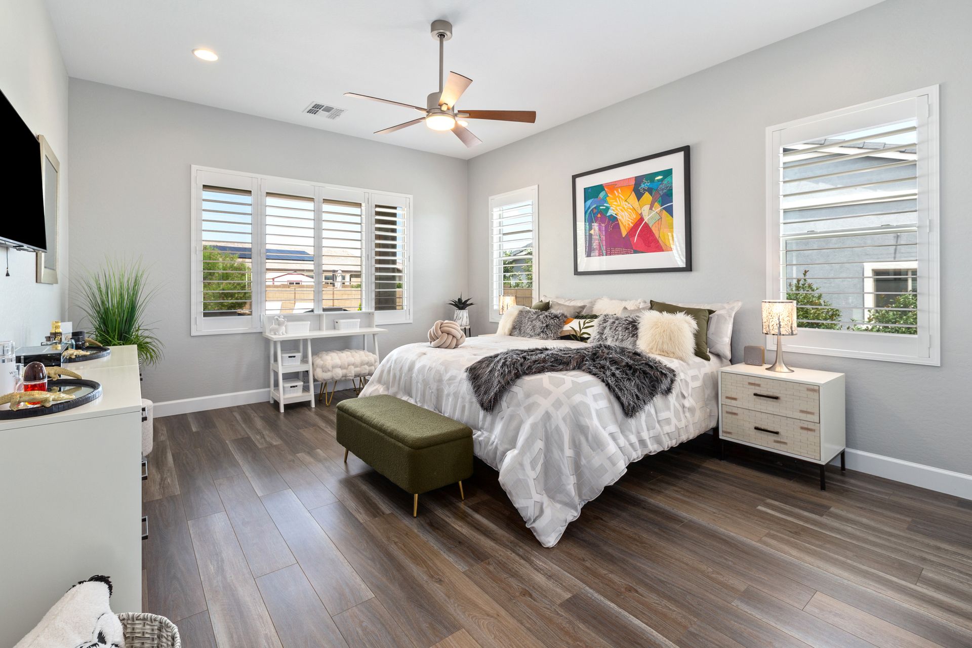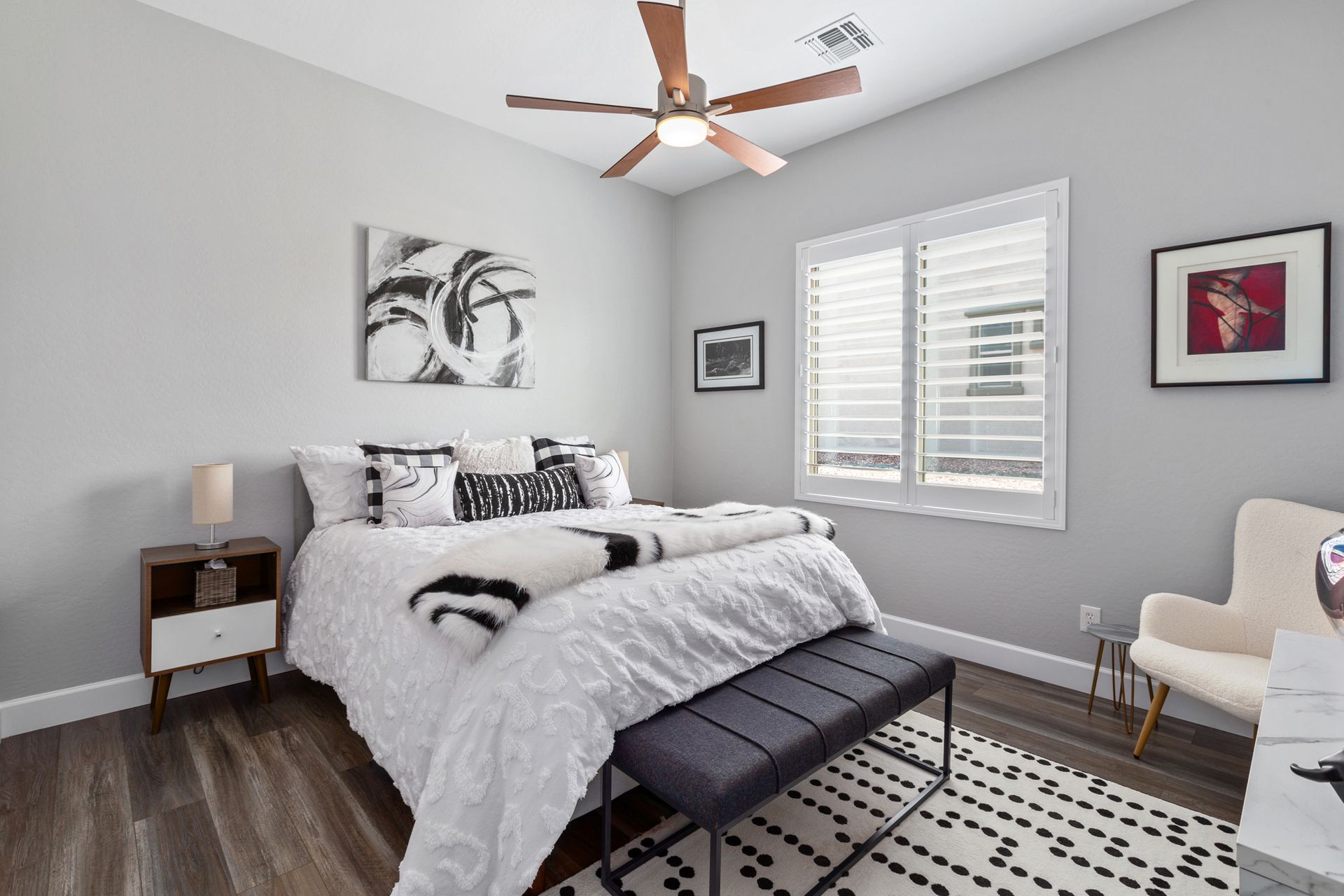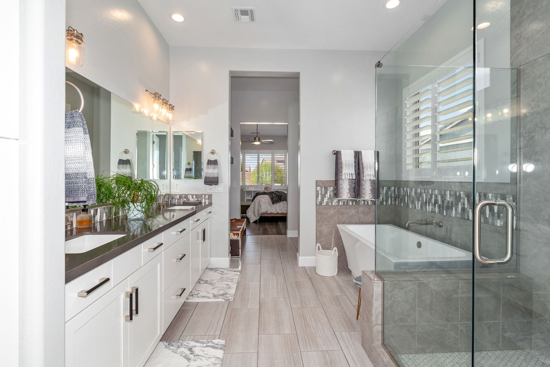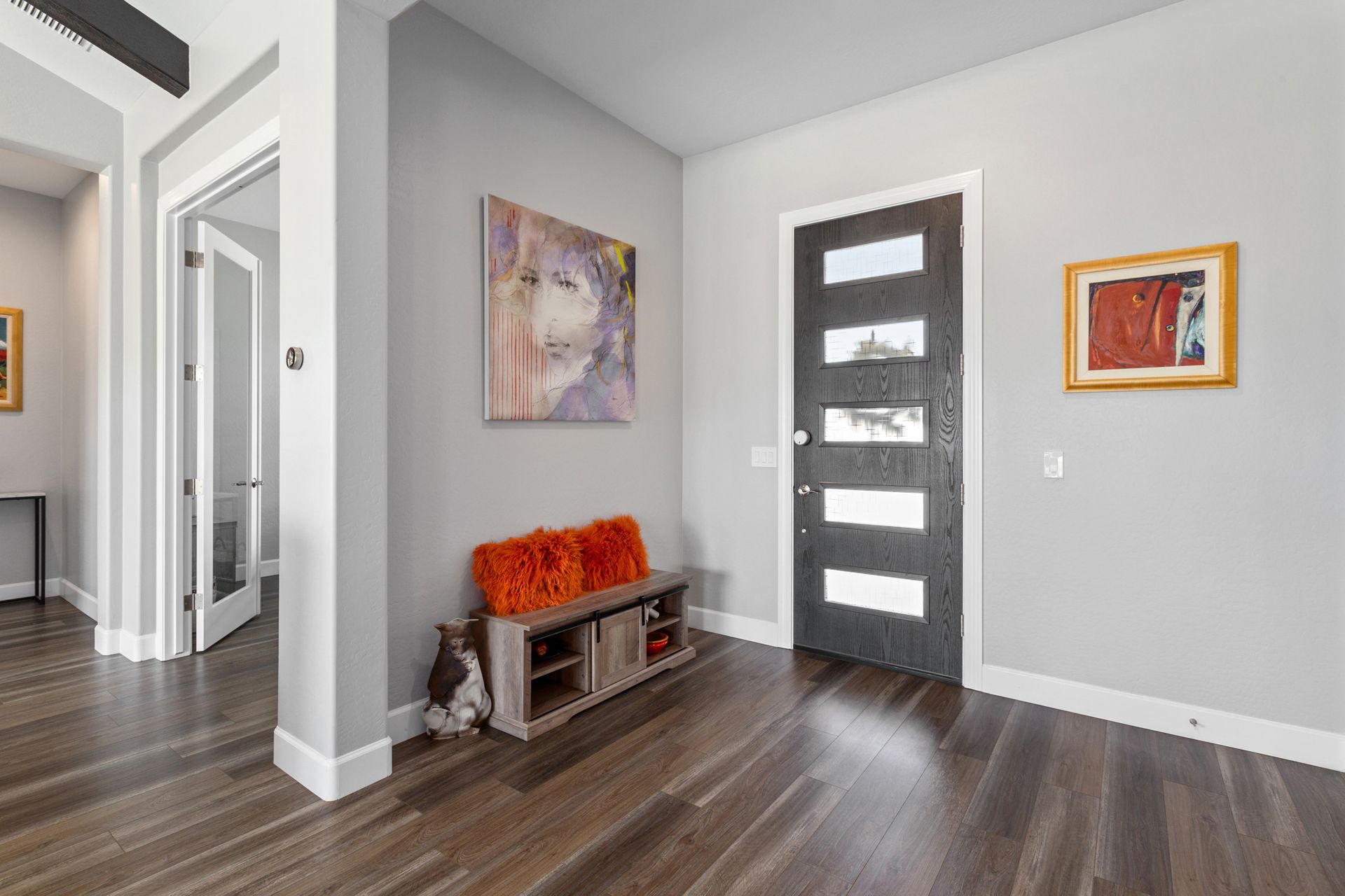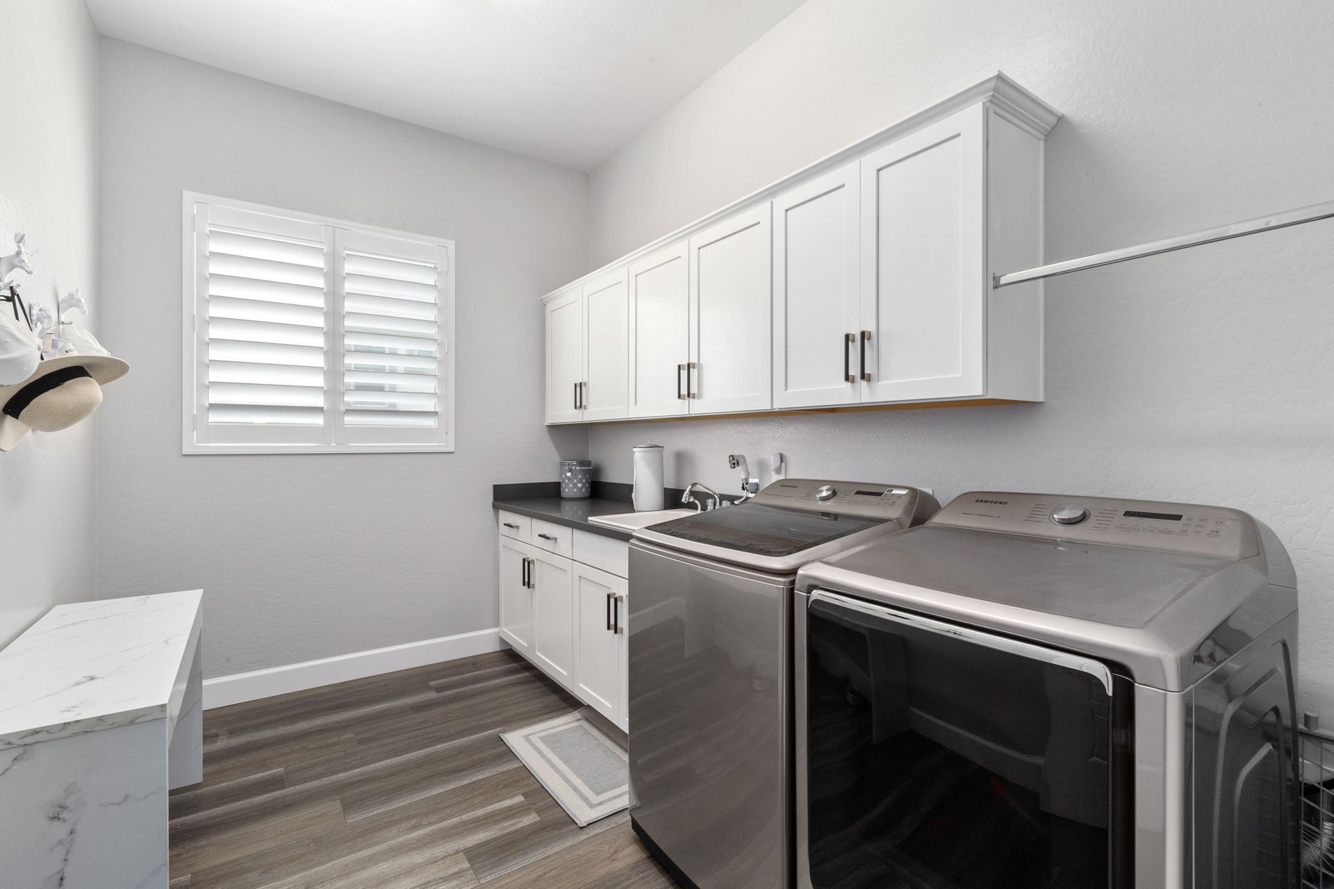 Magnificent modern style home in sought-after Granite Dells Estates! This 3 bed/2.5 bath + office, ''Sunflower floor plan'', has the elegance of modern design influences. The front yard invites you with a calming splash of green turf. Make your way to the main entry through the covered patio with seating area. Enter through the modern paneled front door into the entry vestibule with an immediate view of the open floor plan with vaulted ceilings, wood beams, floor-to-ceiling custom tiled fireplace and massive sun-drenched windows. The incredible chef's kitchen is equipped with a suite of GE Café including; refrigerator/freezer, gas cooktop, dishwasher, and baker's French-door wall oven. The kitchen cabinets are a crisp white with stainless pulls and just the right amount of stylish glass door upper cabinets. There's ample counter space with a huge island, quartz countertops, stylish pendant lights, stainless farm sink, designer backsplash, and walk-in pantry. The flooring throughout the home is luxury polymer plank flooring (no carpet). The primary bedroom is an elegant retreat with ensuite that has quartz counters w/dual sinks, freestanding tub, custom tiled glass shower, and a large walk-in closet. This split floor plan has two guest bedrooms with a hall bath. The laundry hallway includes Samsung washer/dryer, features a drop zone and a powder room. There is added quality with upgraded cabinets, quartz counters, paddle fans, custom tile and plantation shutters throughout. Enjoy the indoor-outdoor living with this Large (.29 Acre) lot that has an oversized paver patio, aqua-glass firepit, relaxing turf areas, and maturing trees. The insulated garage is extra-large with 4 ft extension, and includes wall storage cabinets, ceiling mounted storage and a workbench. Also, includes a whole house water purification system. This gem in Granite Dells Estates won't last long! MLS#6733825