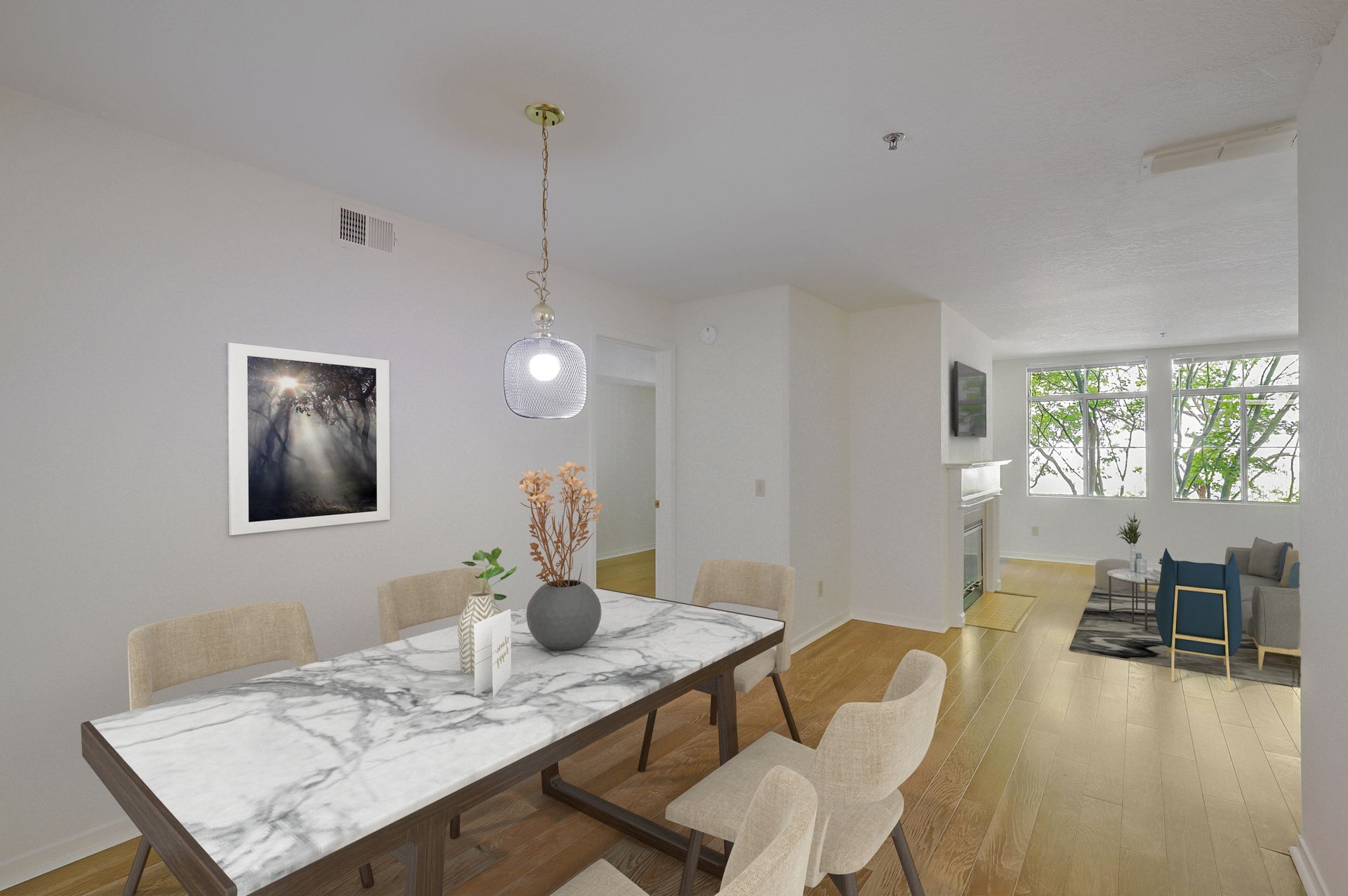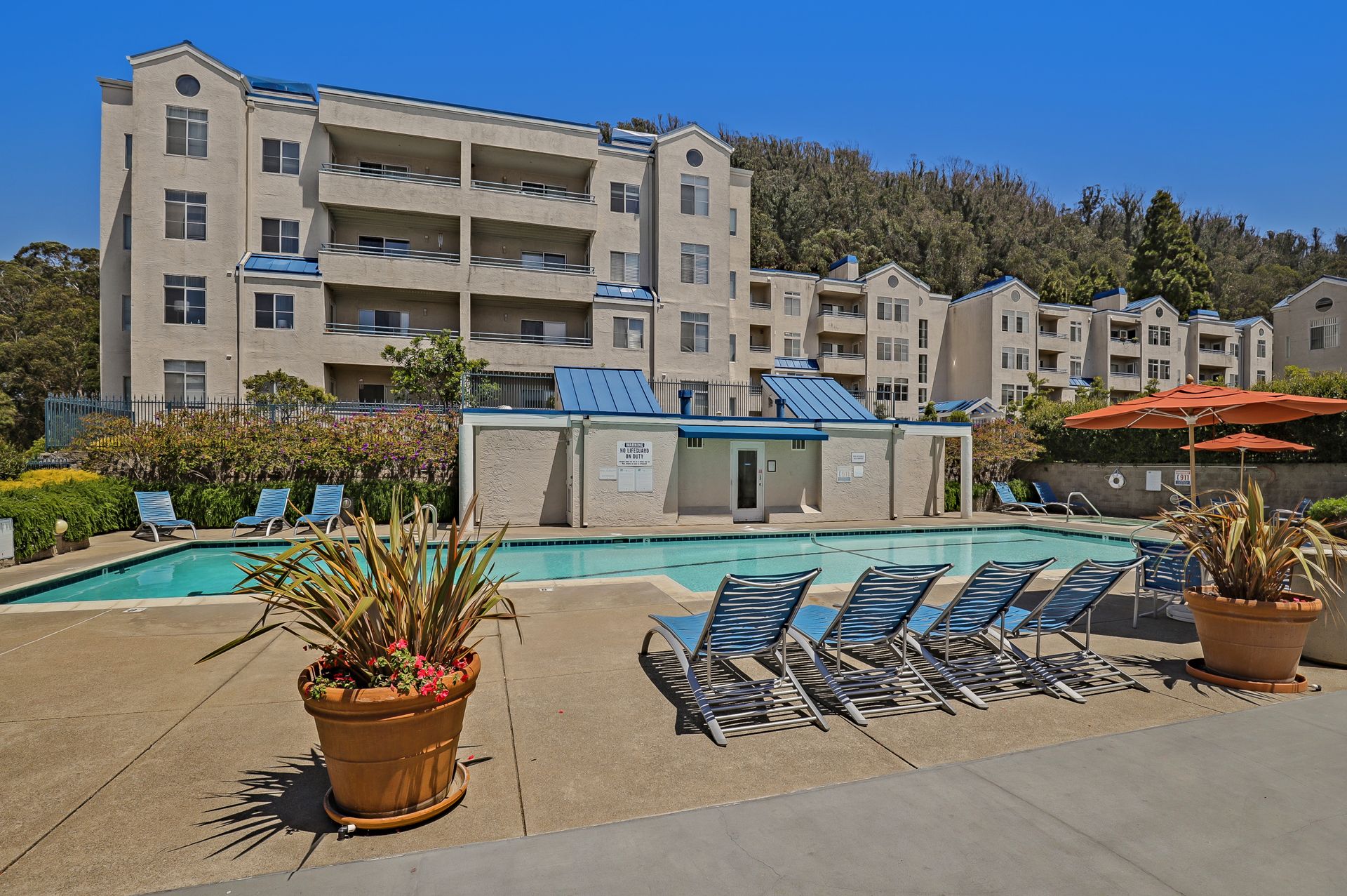 Fabulous second floor unit located in the back of the property looking over the hillside. Two bedroom, two bath. The two bedrooms are separate primary suites. Very private living in a resort like community. Heat and hot water community provided. 2 deeded Garage parking spaces, pool, gym, BBQ area, tennis and much more! Close to all transportation options. Located next door to the Ranch 99 shopping center. Come home to your wonderful Albany retreat!