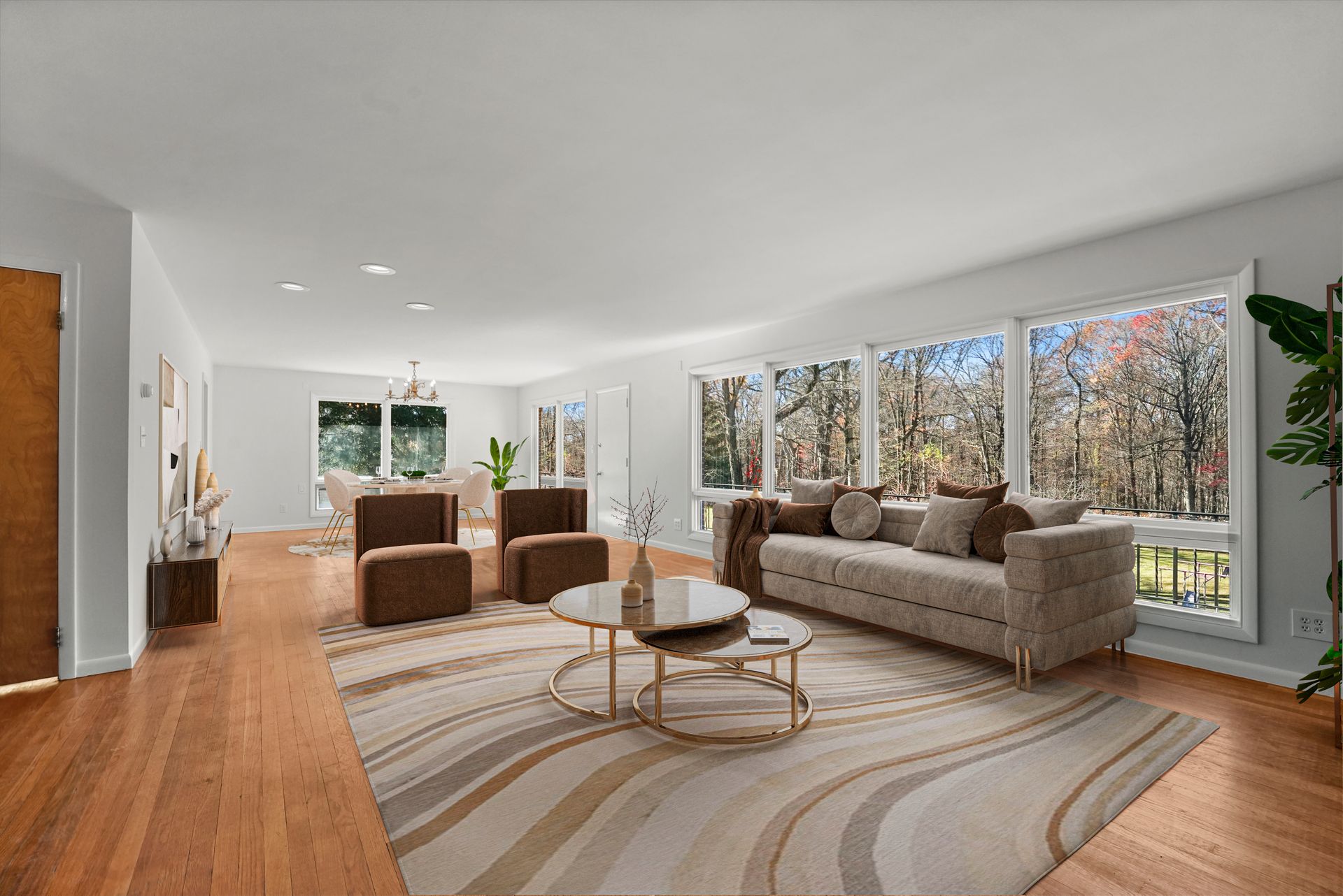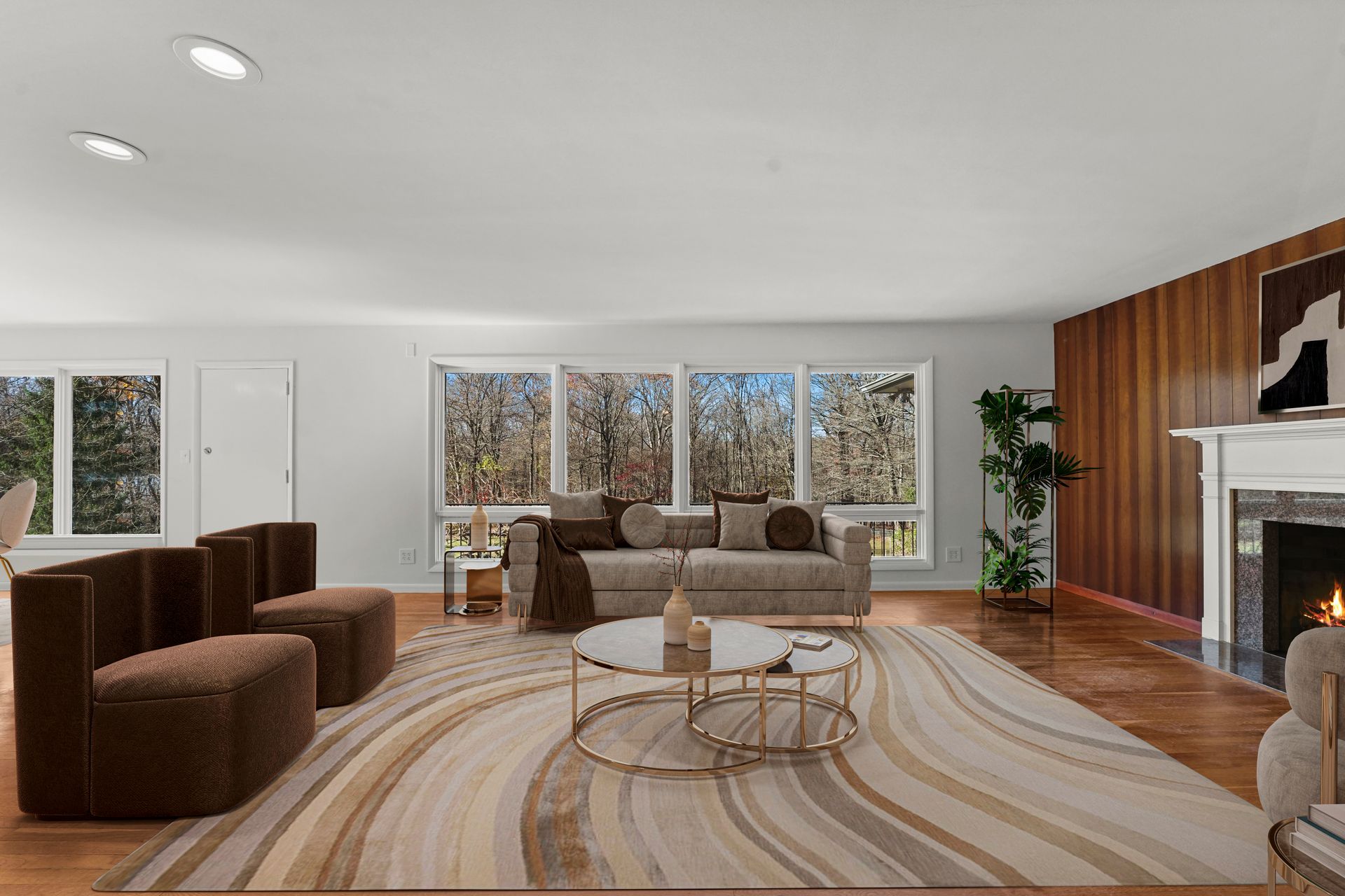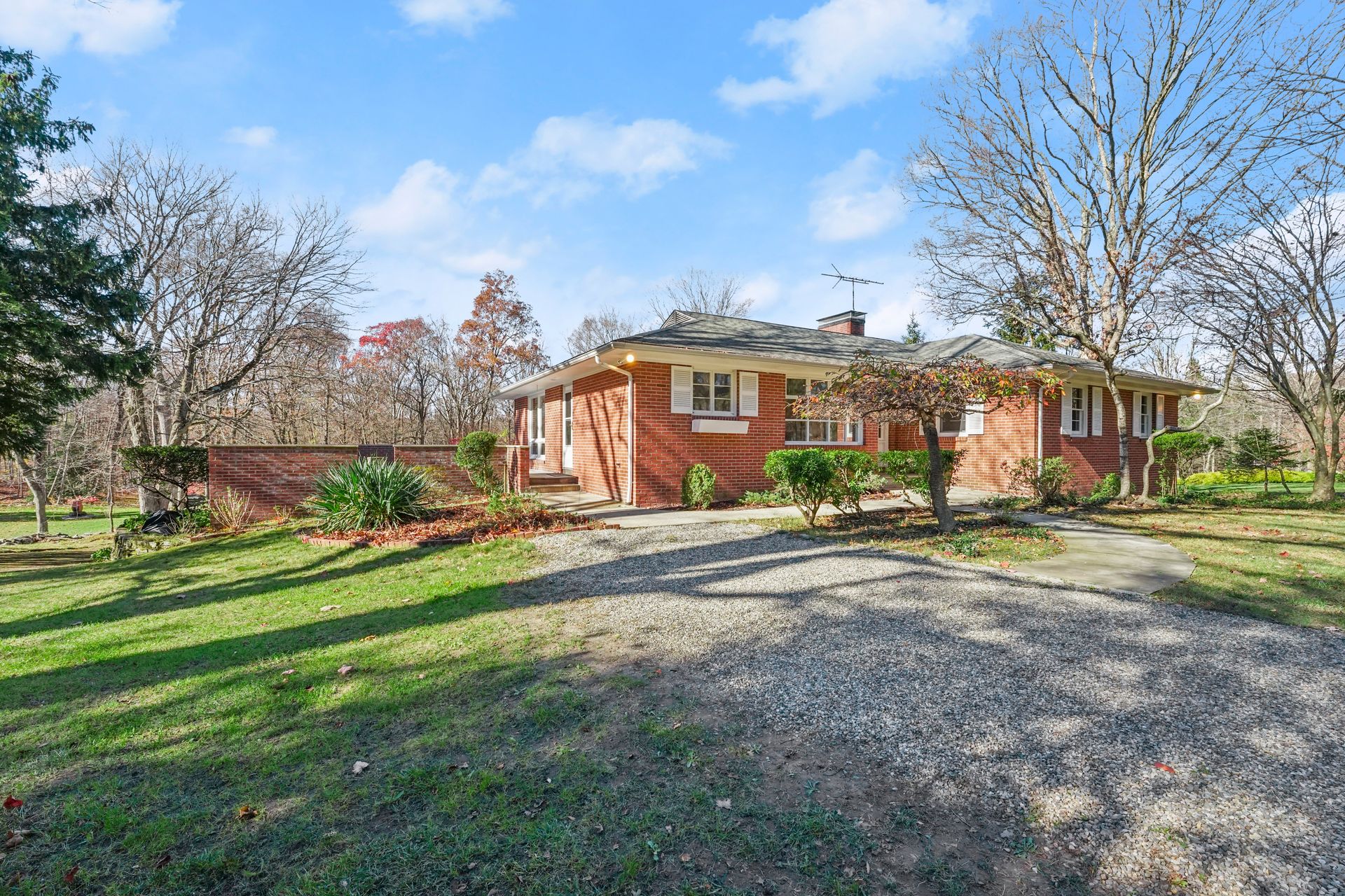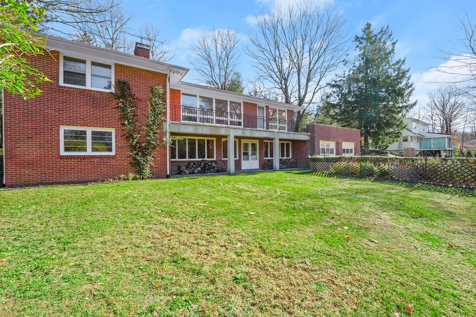 Your breath will be taken away as you enter the foyer and see the spectacular view through the oversized windows in the living room. An open floor plan with lots of windows, enhance this mid-century modern Ranch home that was designed by the original owner in 1962. The spacious living and dining rooms also feature a fireplace, a hidden paneled closet and door to the balcony. The kitchen has a large eating area with a bay window, cherry wood cabinets and a door to the side patio. Down the hall is the primary bedroom boasting two double closets and a full private bath. Two additional good-sized rooms and a hall bath complete this wing. The main level has hardwood floors, a cedar closet and some unique hidden storage areas. On the lower level enjoy a large family room with lots of windows, glass door to the back yard and a wood burning stove. The approximate 900 square feet on this level also includes a fourth bedroom/den, wet bar, full bath, workshop, door to the garage, laundry and storage. Sitting on over two and a half acres, this home has a private outdoor setting with mature trees, gardens, rock walls and out cropping, lawns and is great for entertaining and recreation.