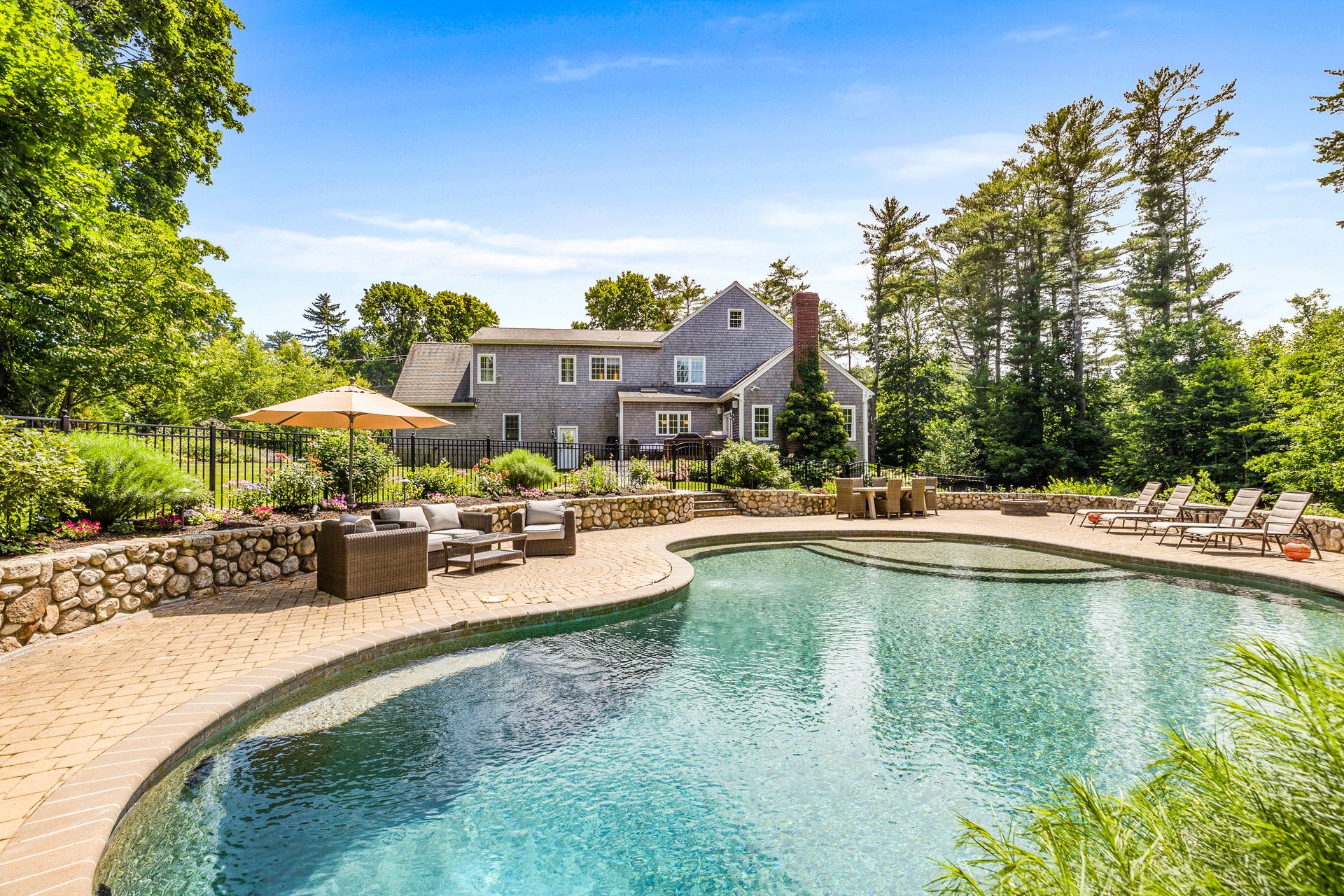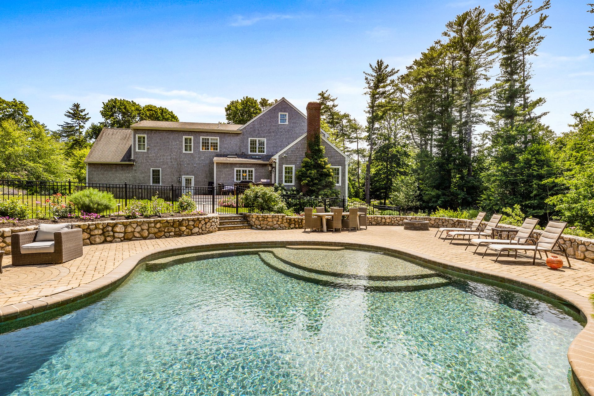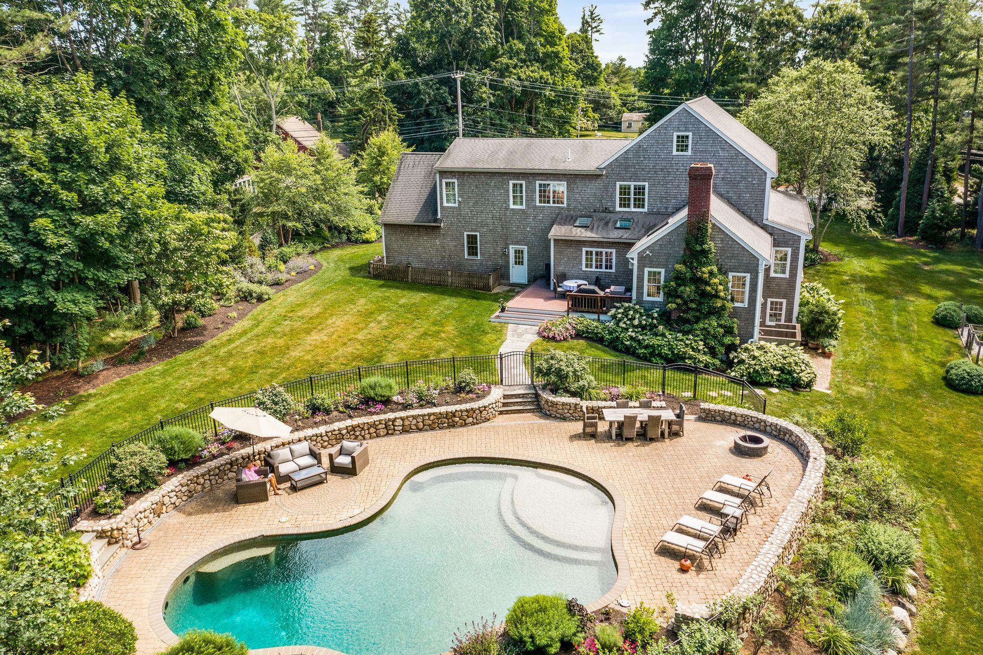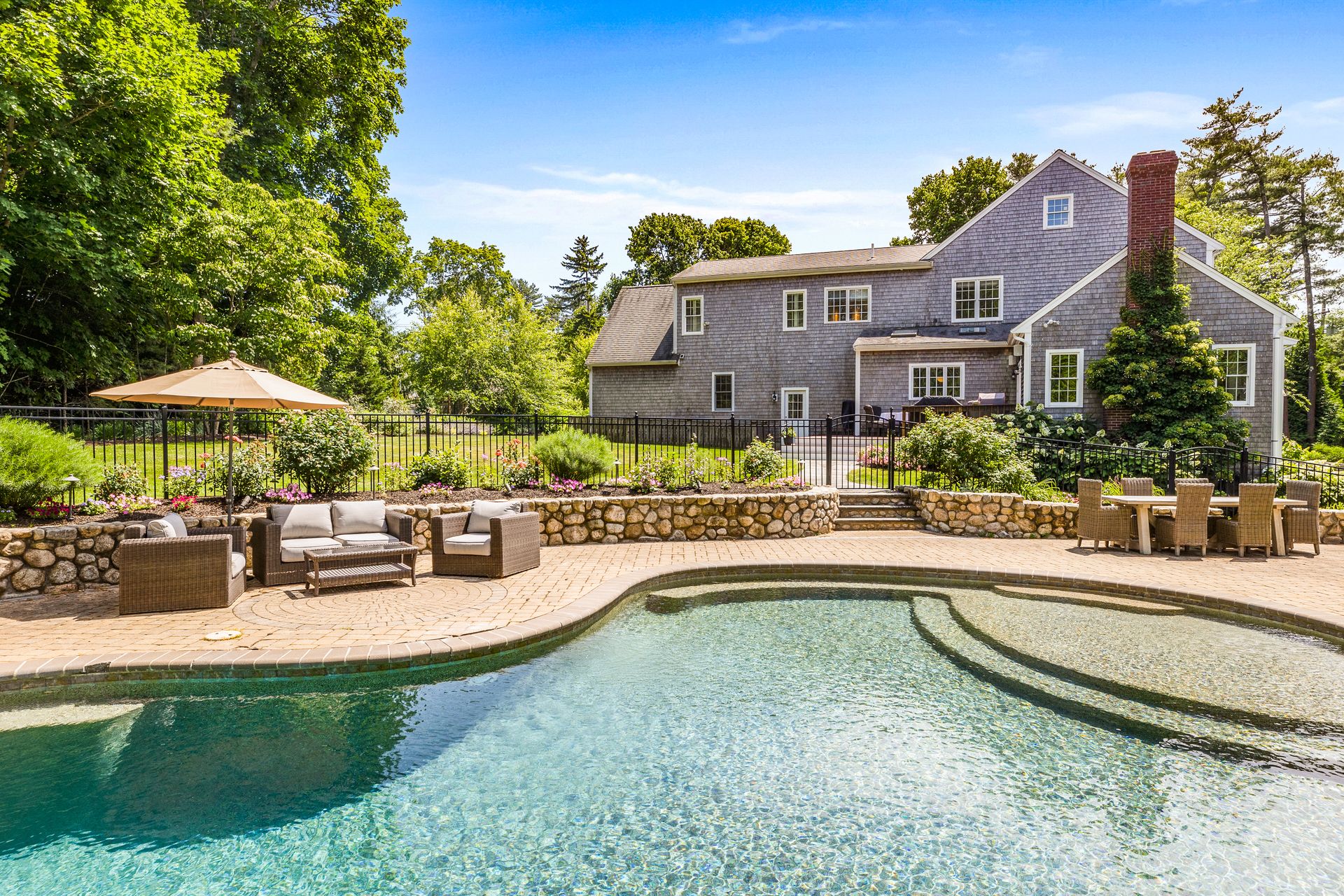This elegant home with a wrap-around porch has been tastefully updated with the comforts of today's living. Exquisite details throughout this open floor plan include high ceilings, wainscoting, oversized windows, custom cabinetry and three fireplaces. Perfect layout for entertaining with a gourmet kitchen, formal dining and living rooms. The den with French doors opens to a deck overlooking a gorgeous in-ground pool surrounded by a manicured yard and beautiful stonework. The second level boasts two new bathrooms with designer finishes and WaterWorks fixtures, a home office and five gracious bedrooms including a private main suite with fireplace and walk-in closet. Fabulous finished, walk-out lower level has a well-crafted wet bar, full bathroom, media and exercise room with barn doors. An outdoor shower, stone fire pit, three-car garage and plentiful garden area enhance this property. Sidewalk leads to the school campus and nearby shops and restaurants. In town, must-see opportunity!