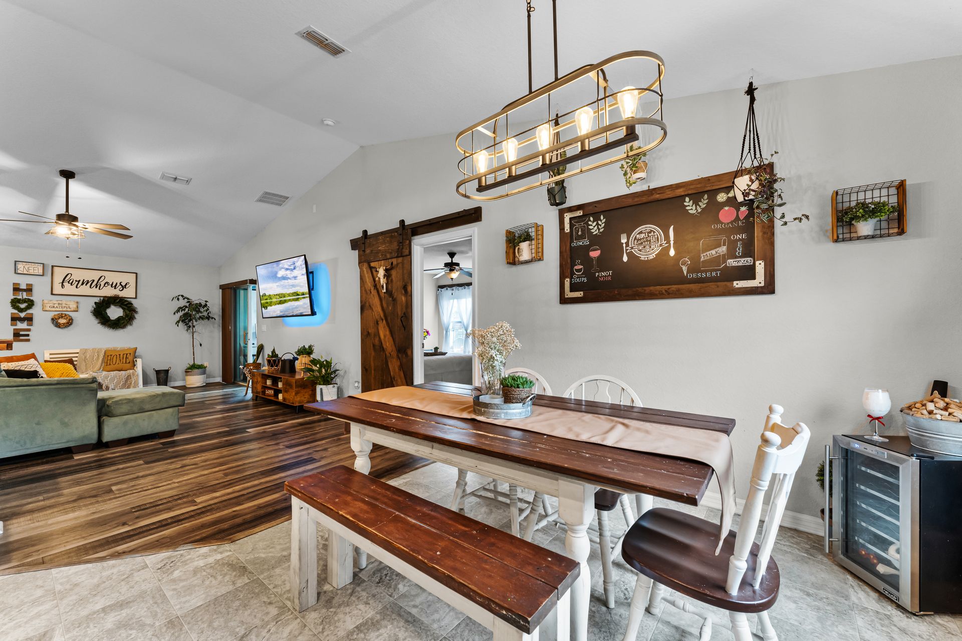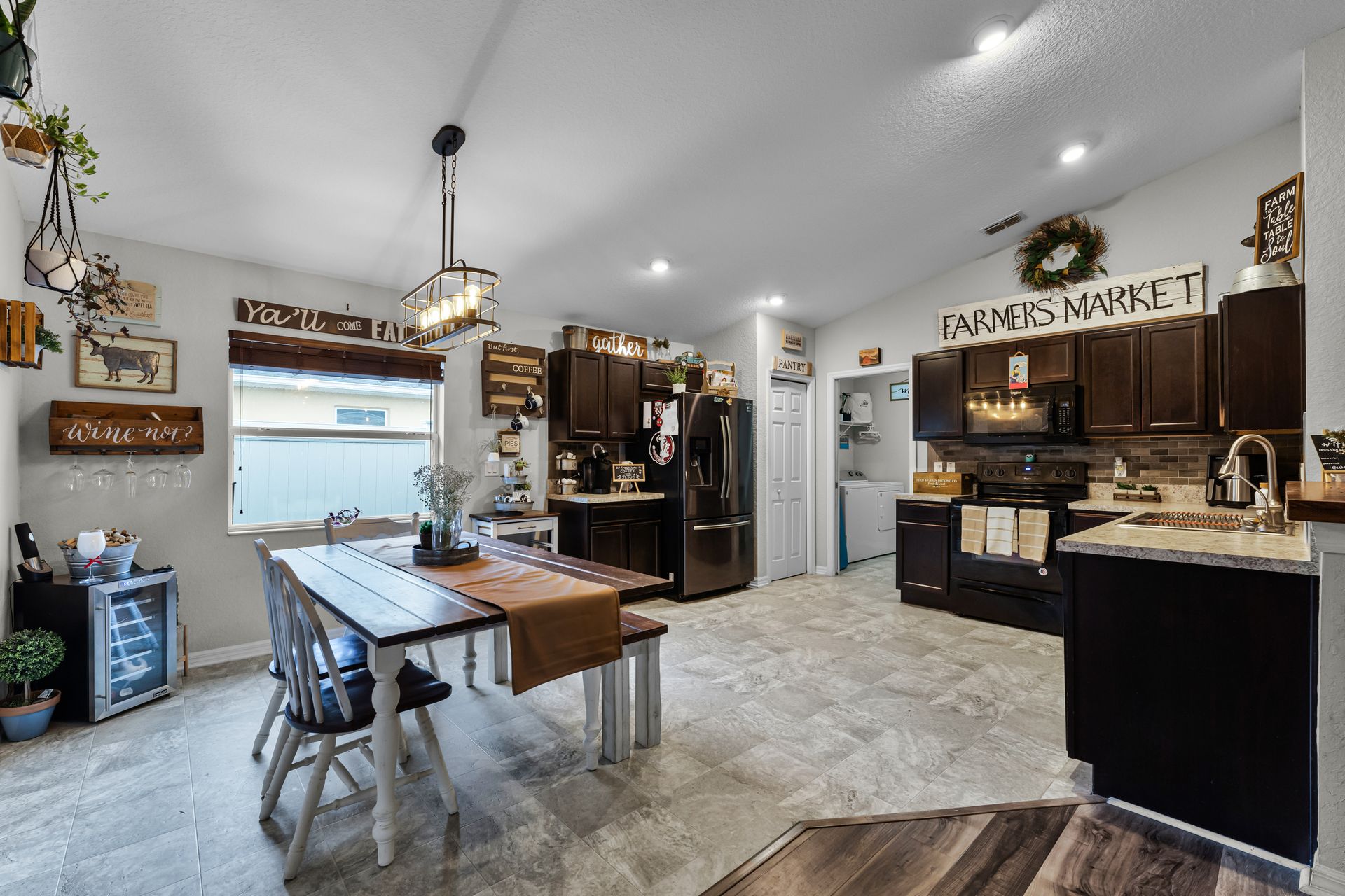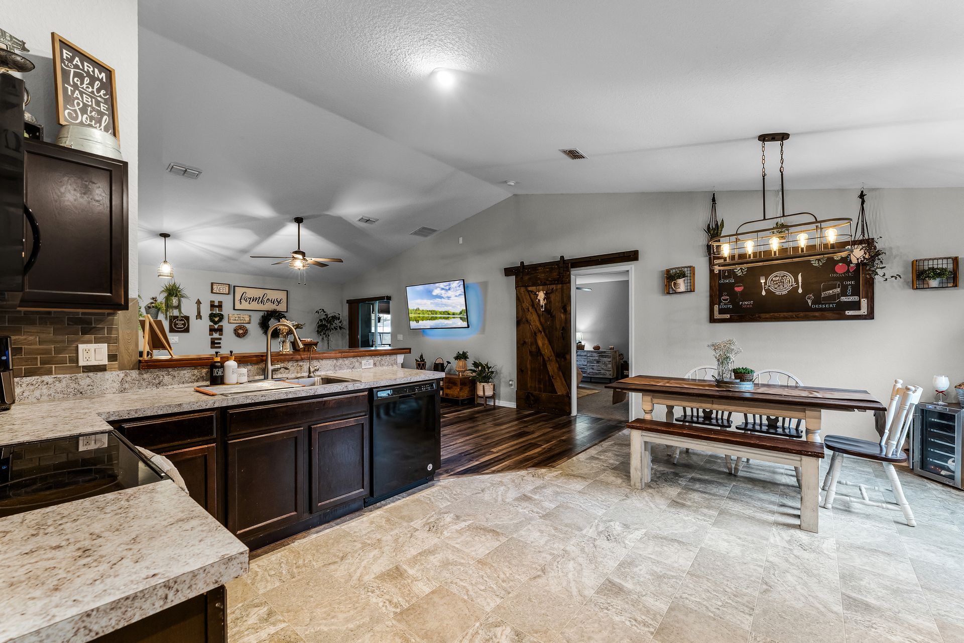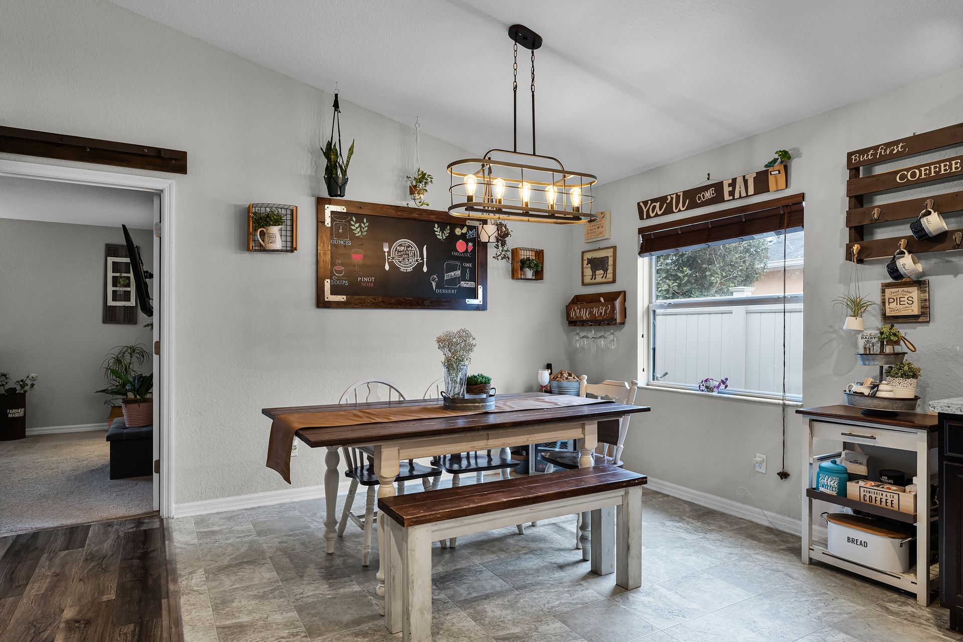 Head inside this charming three bedroom, two bathroom home with roughly 1,485 square feet of beautifully designed space. From the moment you enter, the warm vinyl floors and open layout set the tone for a welcoming, spacious feel. The Great Room, at the heart of the home, is perfect for gatherings and opens to a stunning, upgraded kitchen that leads into a dining area highlighted by an elegant light fixture.