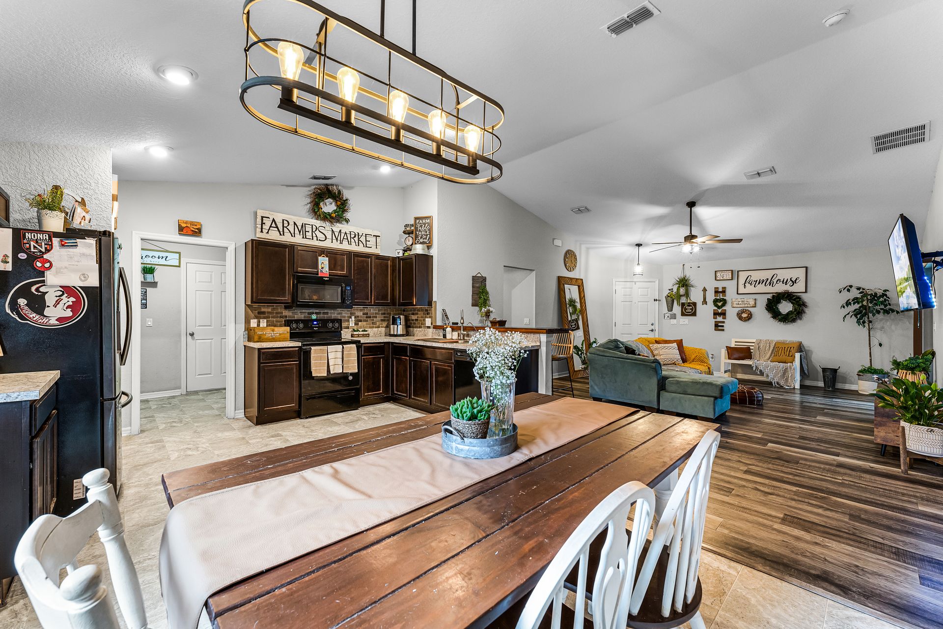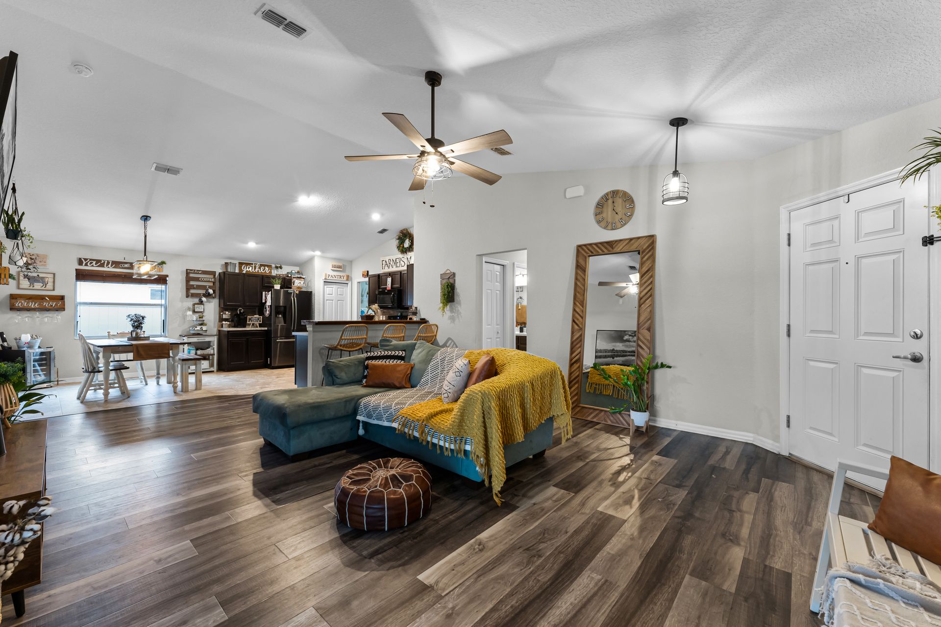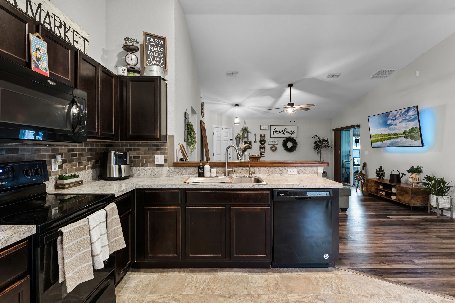Head inside this charming three bedroom, two bathroom home with roughly 1,485 square feet of beautifully designed space. From the moment you enter, the warm vinyl floors and open layout set the tone for a welcoming, spacious feel. The Great Room, at the heart of the home, is perfect for gatherings and opens to a stunning, upgraded kitchen that leads into a dining area highlighted by an elegant light fixture.
