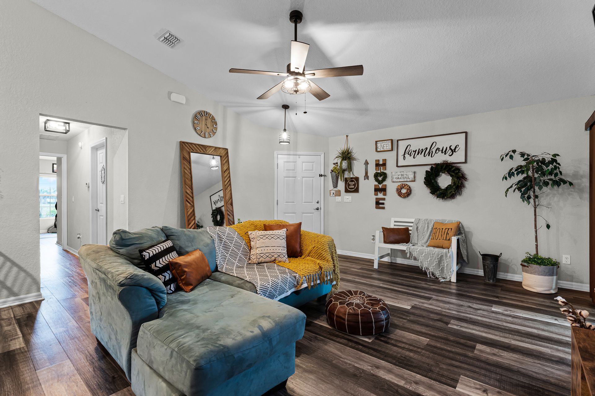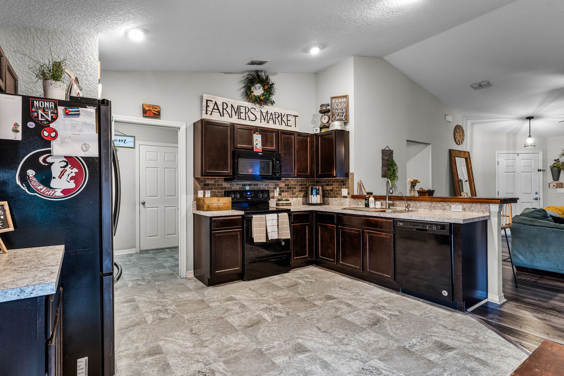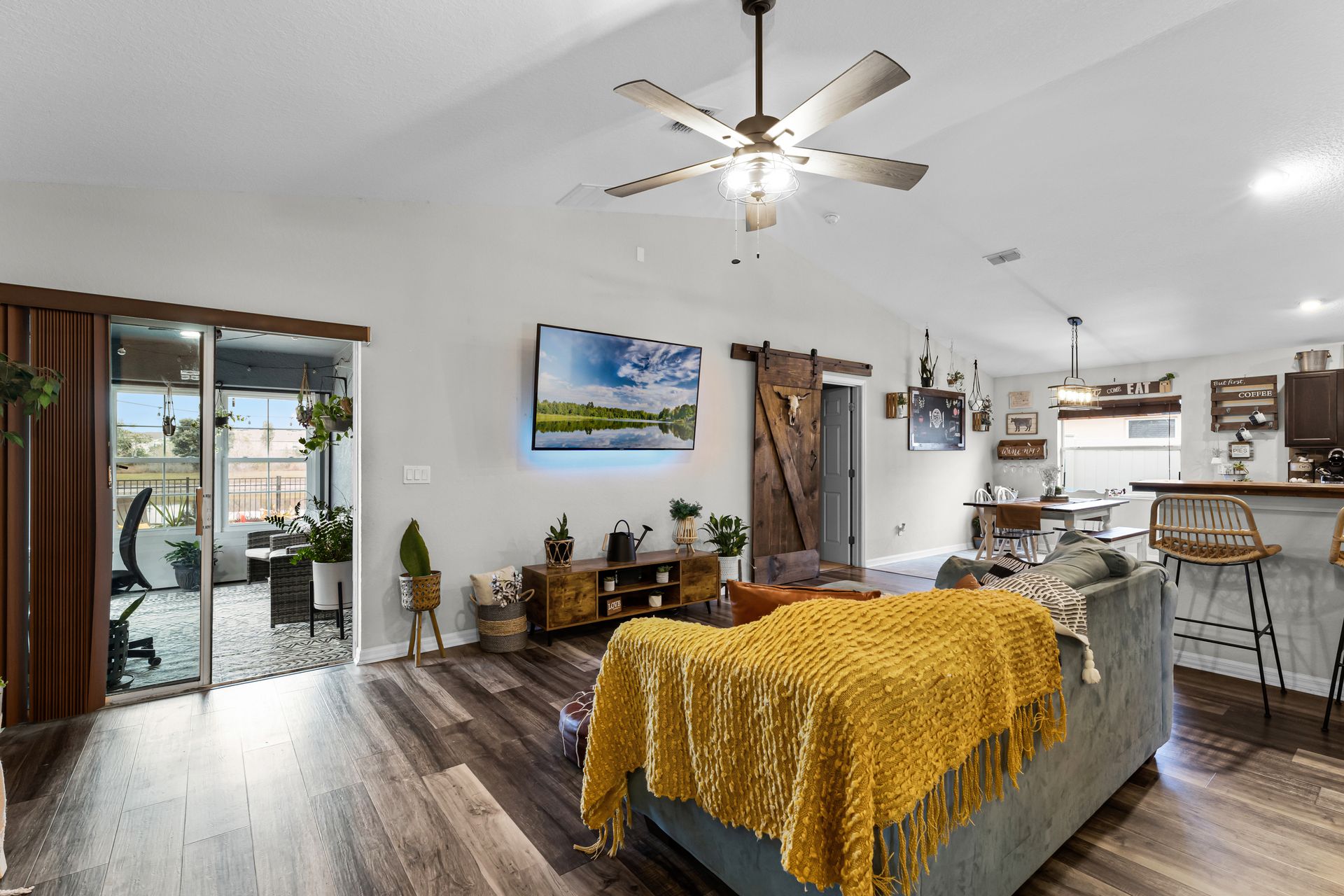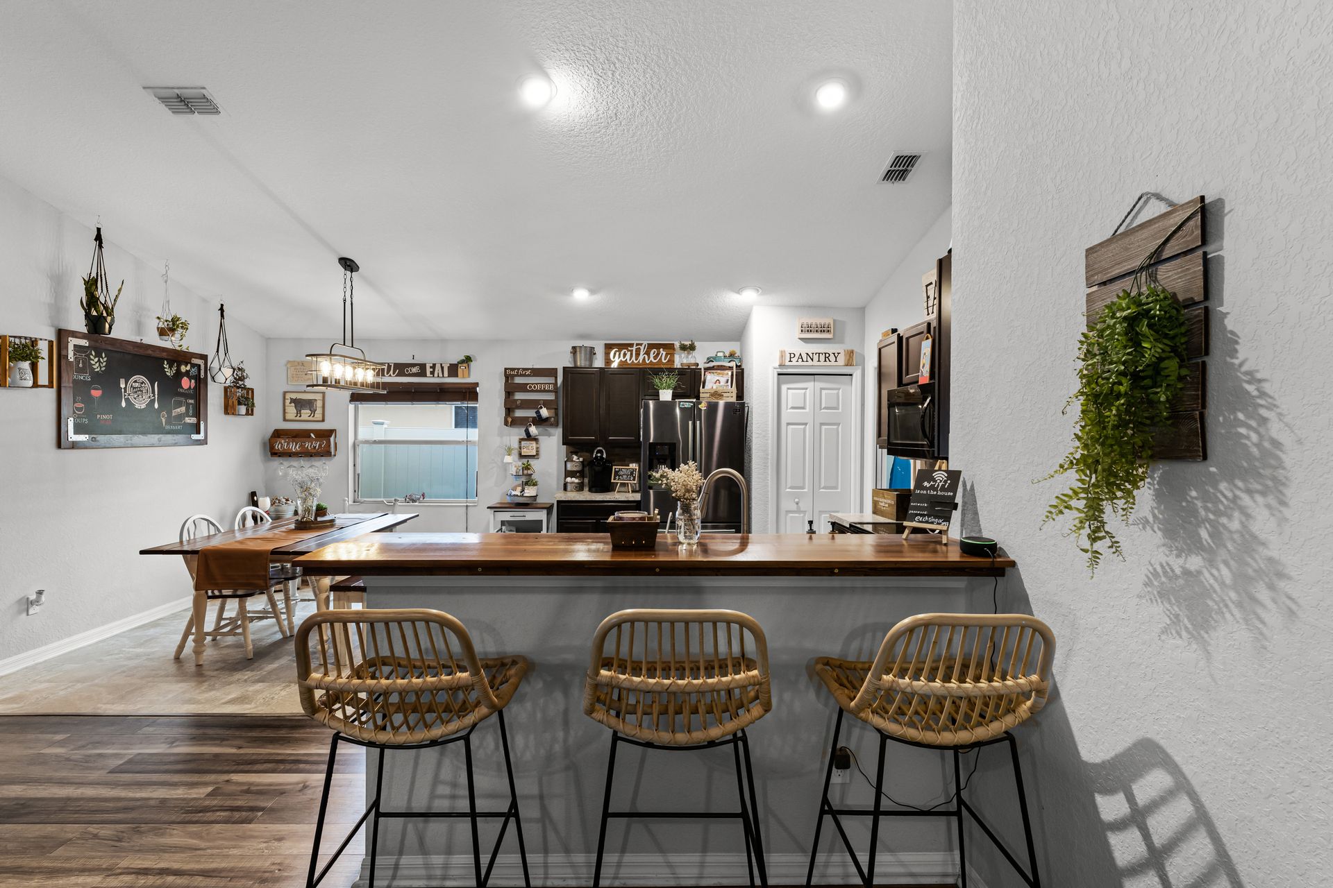 Head inside this charming three bedroom, two bathroom home with roughly 1,485 square feet of beautifully designed space. From the moment you enter, the warm vinyl floors and open layout set the tone for a welcoming, spacious feel. The Great Room, at the heart of the home, is perfect for gatherings and opens to a stunning, upgraded kitchen that leads into a dining area highlighted by an elegant light fixture.