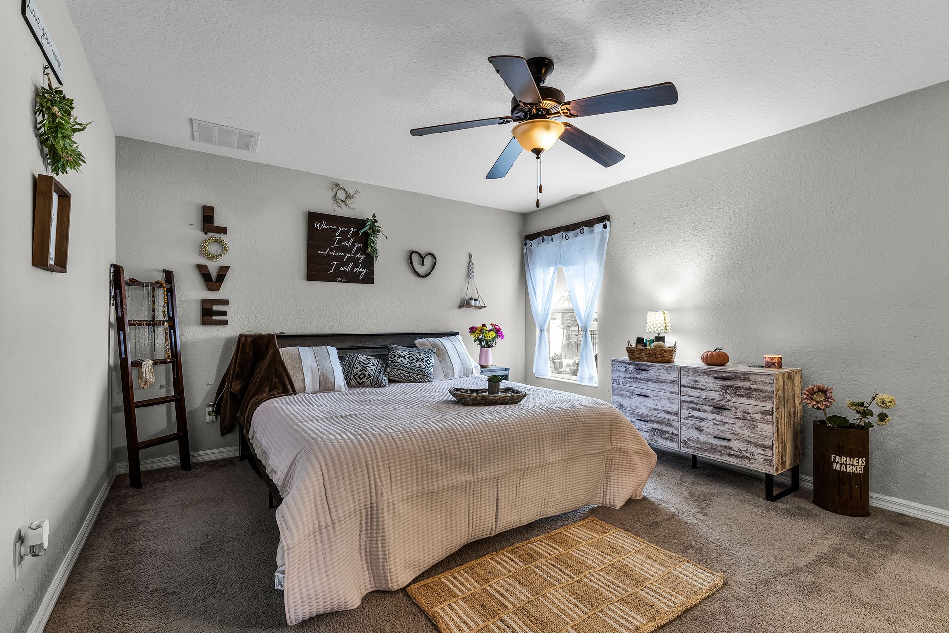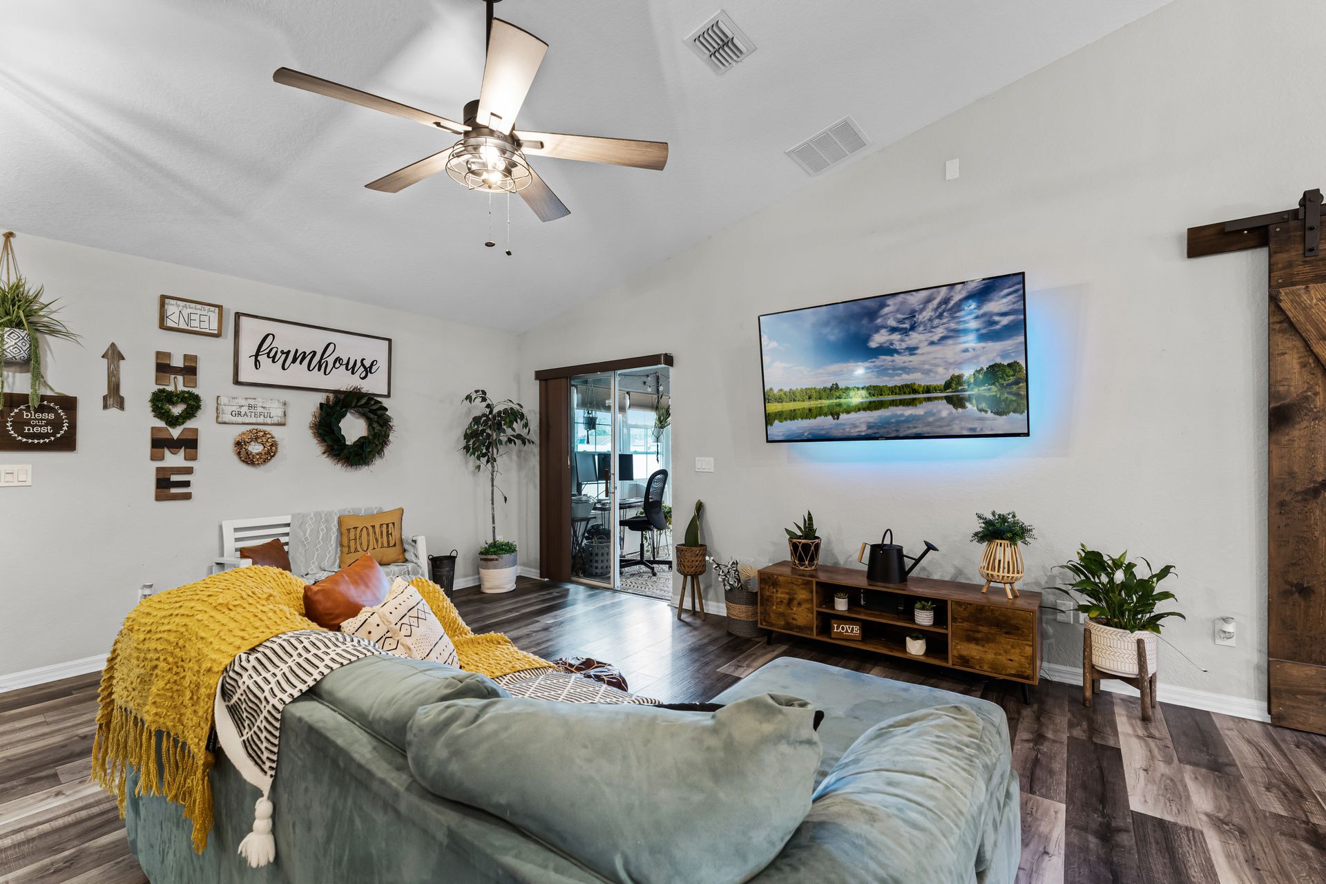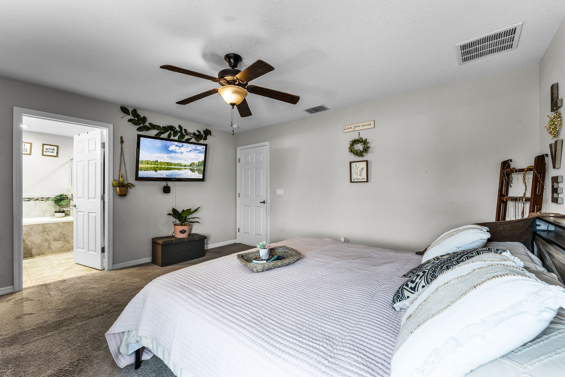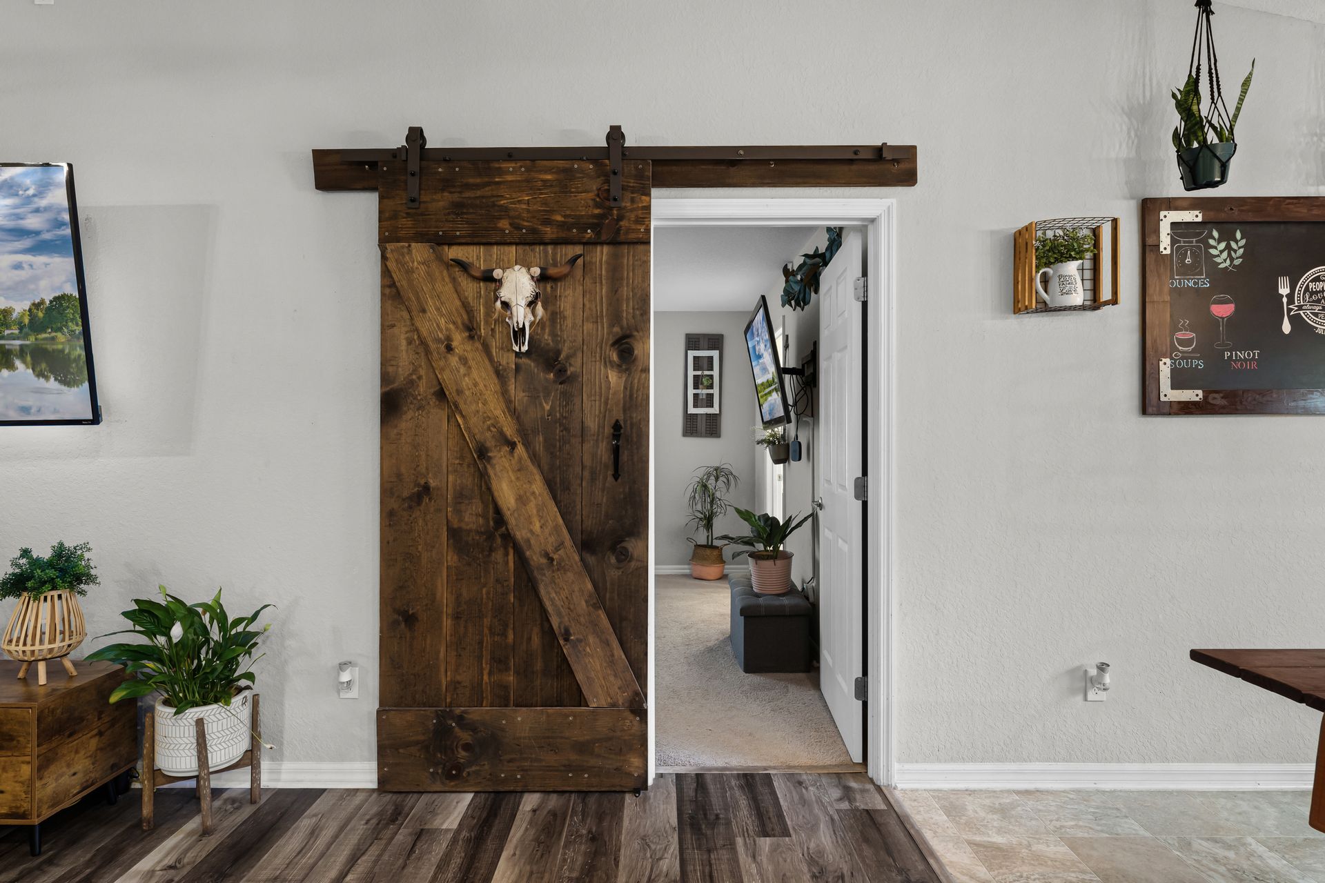 A custom barn door leads you into your spacious primary suite, which includes a luxurious ensuite with double sinks and a tub/shower combo. Two additional bedrooms provide plenty of space for guests, with privacy just down the hall.