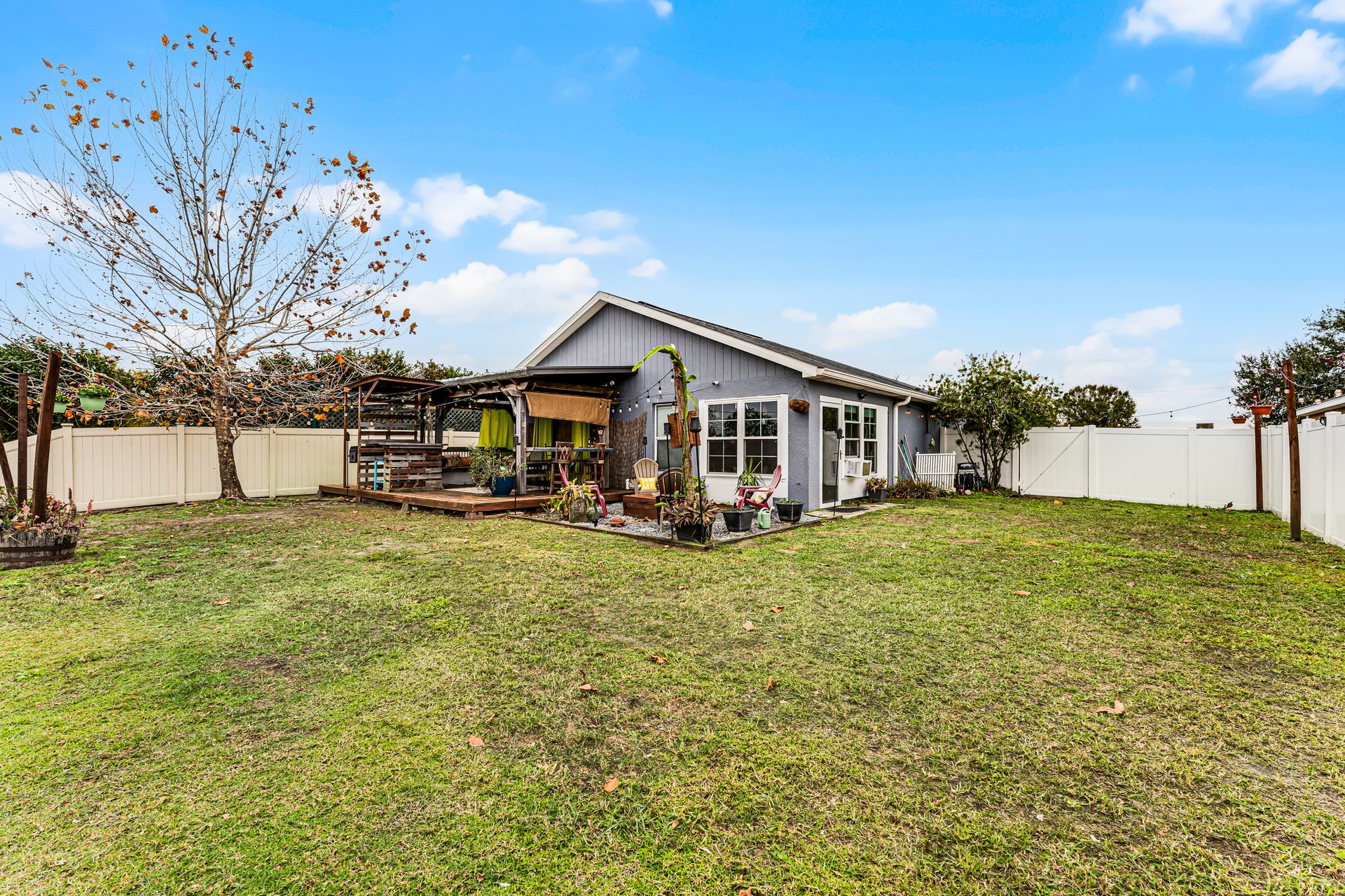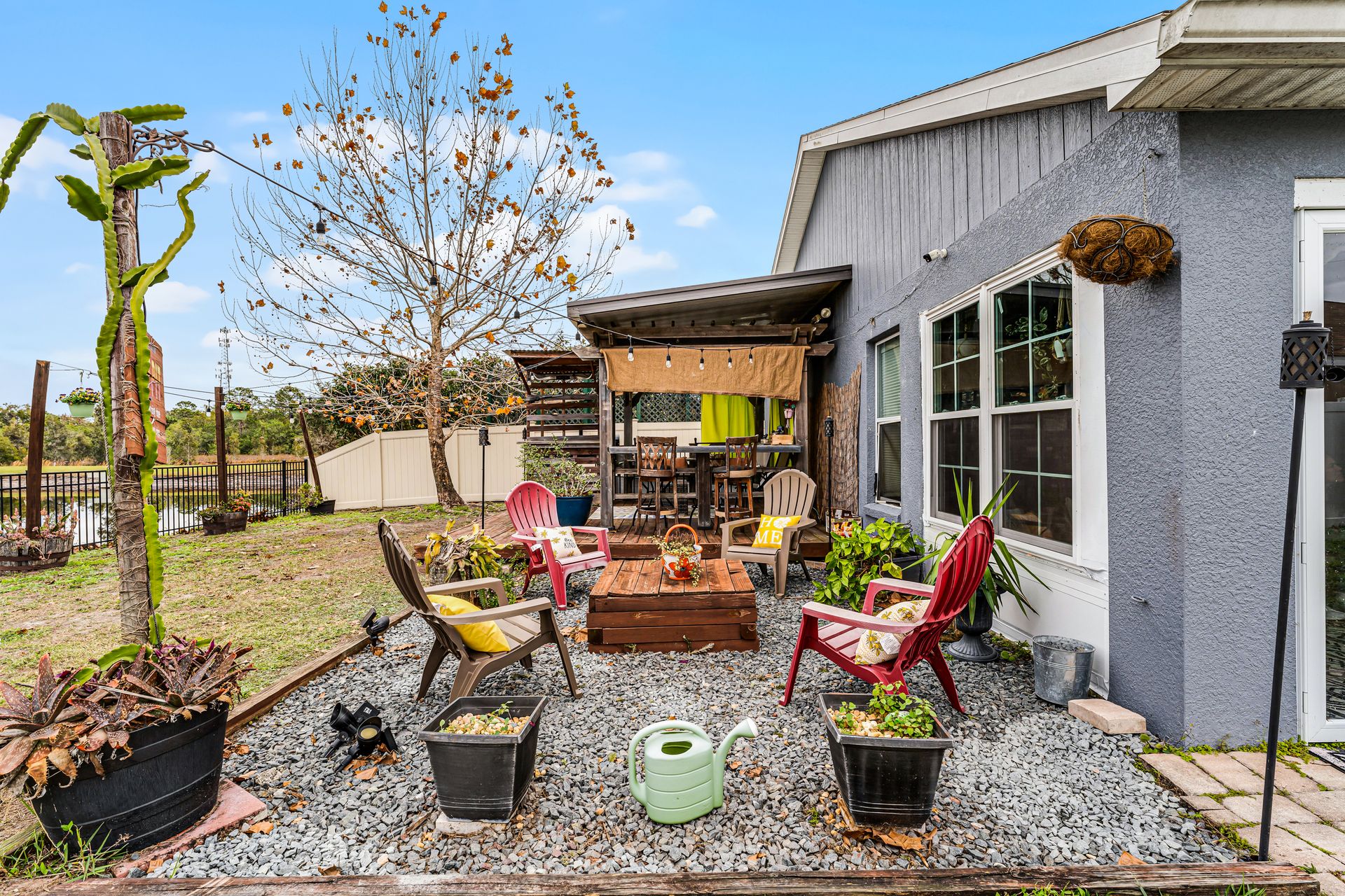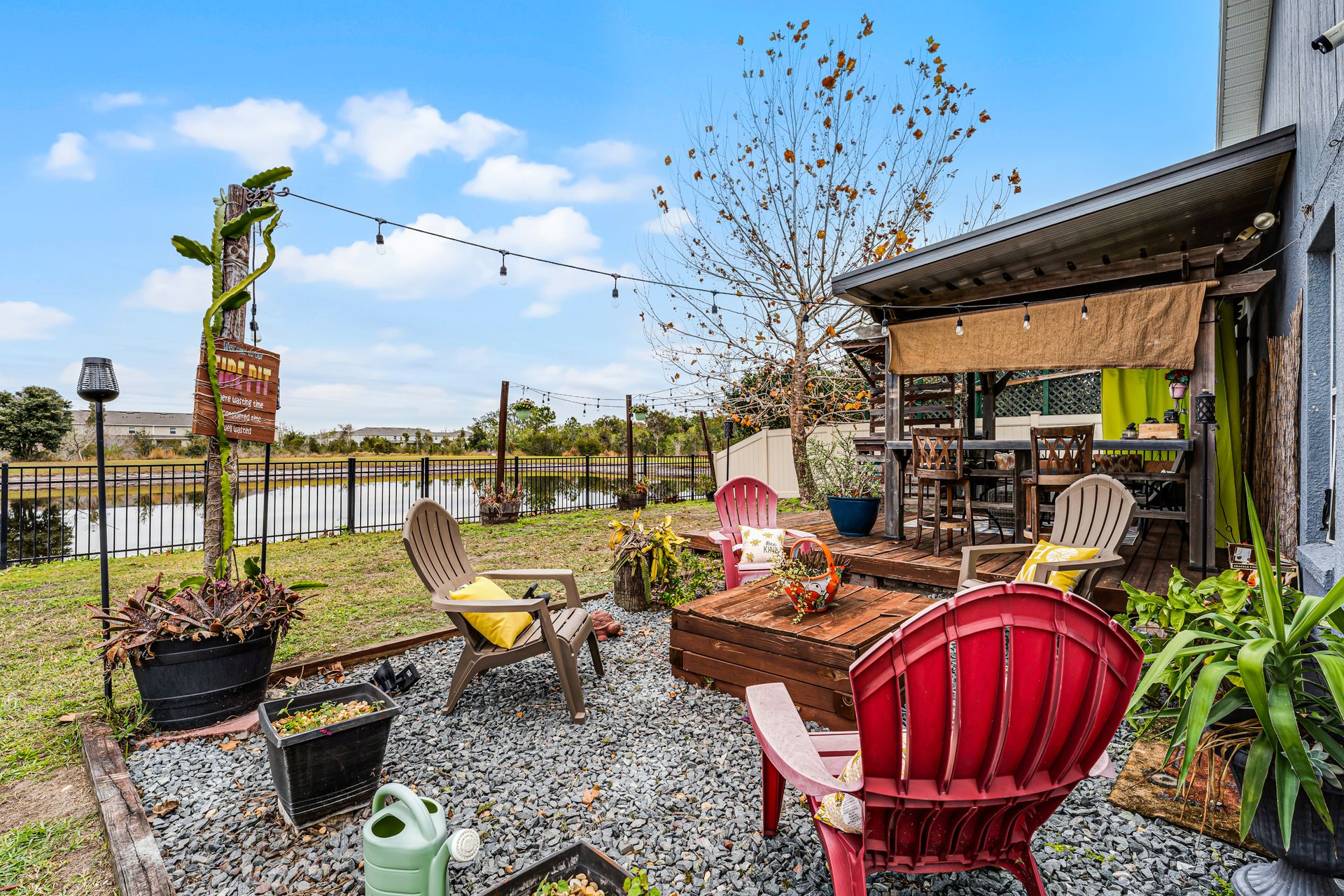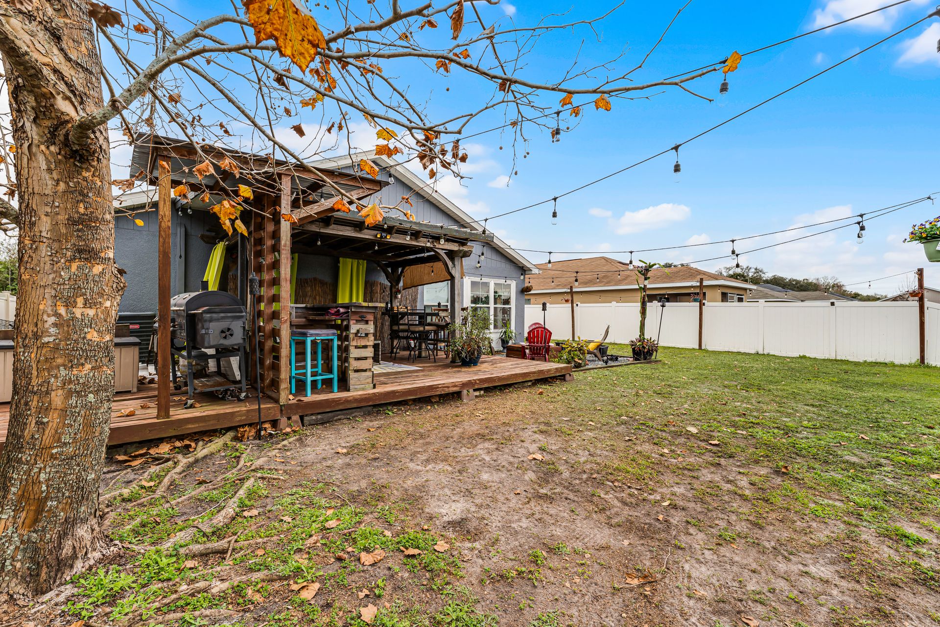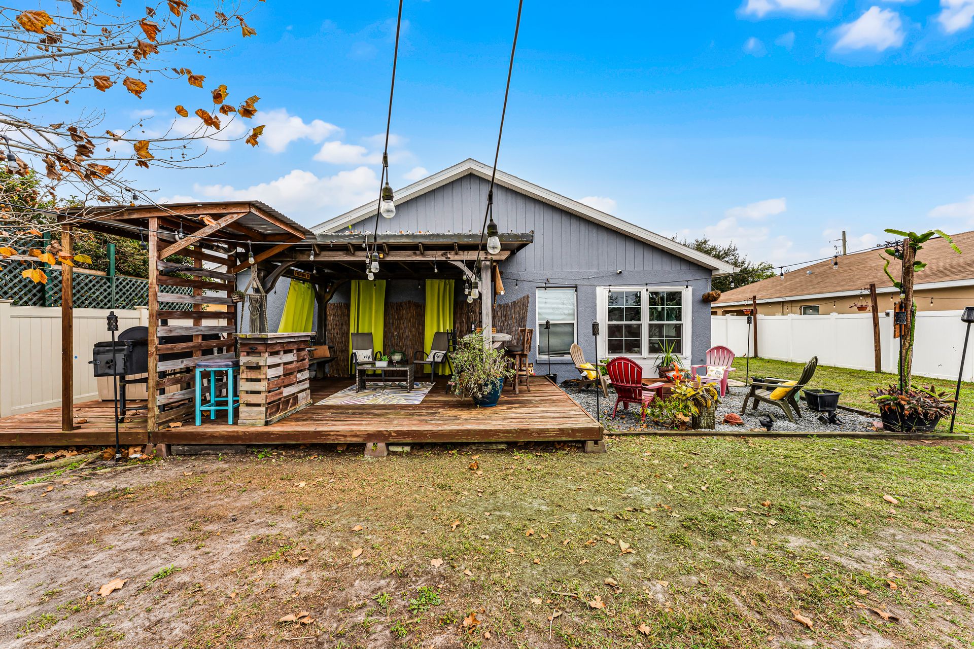 Enjoy year-round comfort in the closed-in Florida room, which seamlessly connects to your backyard oasis. This retreat features several gathering areas, including a firepit and a shaded wooden deck perfect for outdoor cooking, entertaining, or simply relaxing.