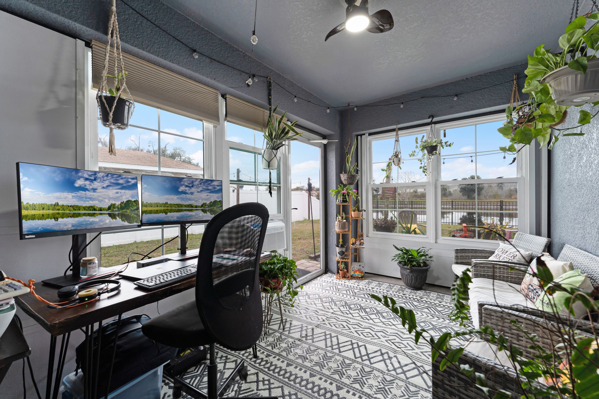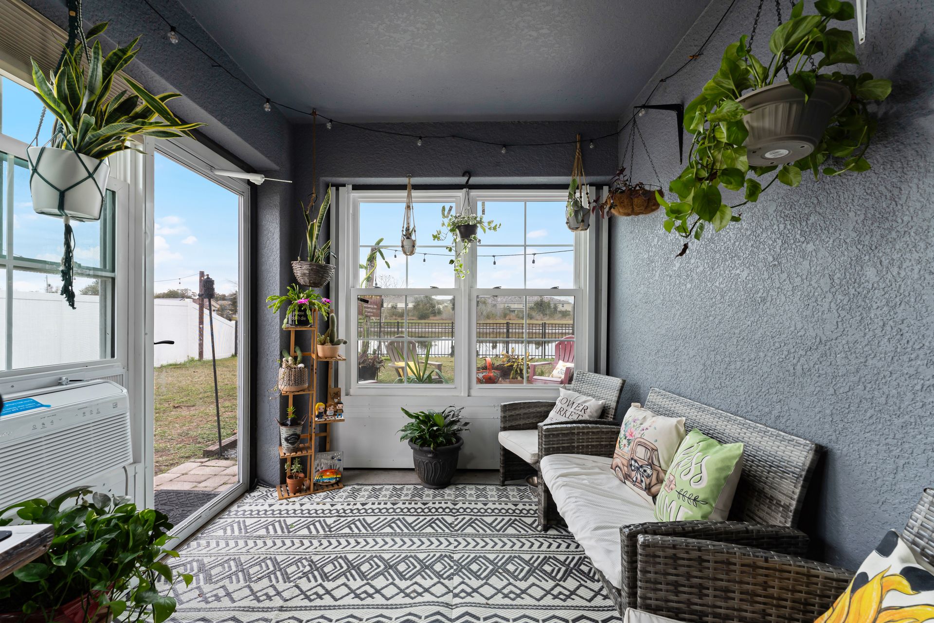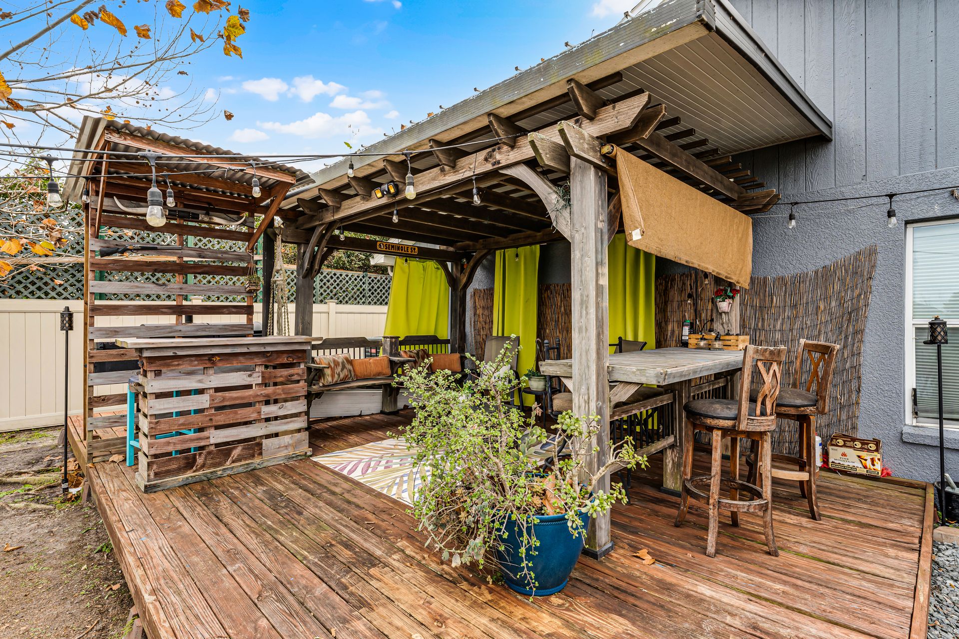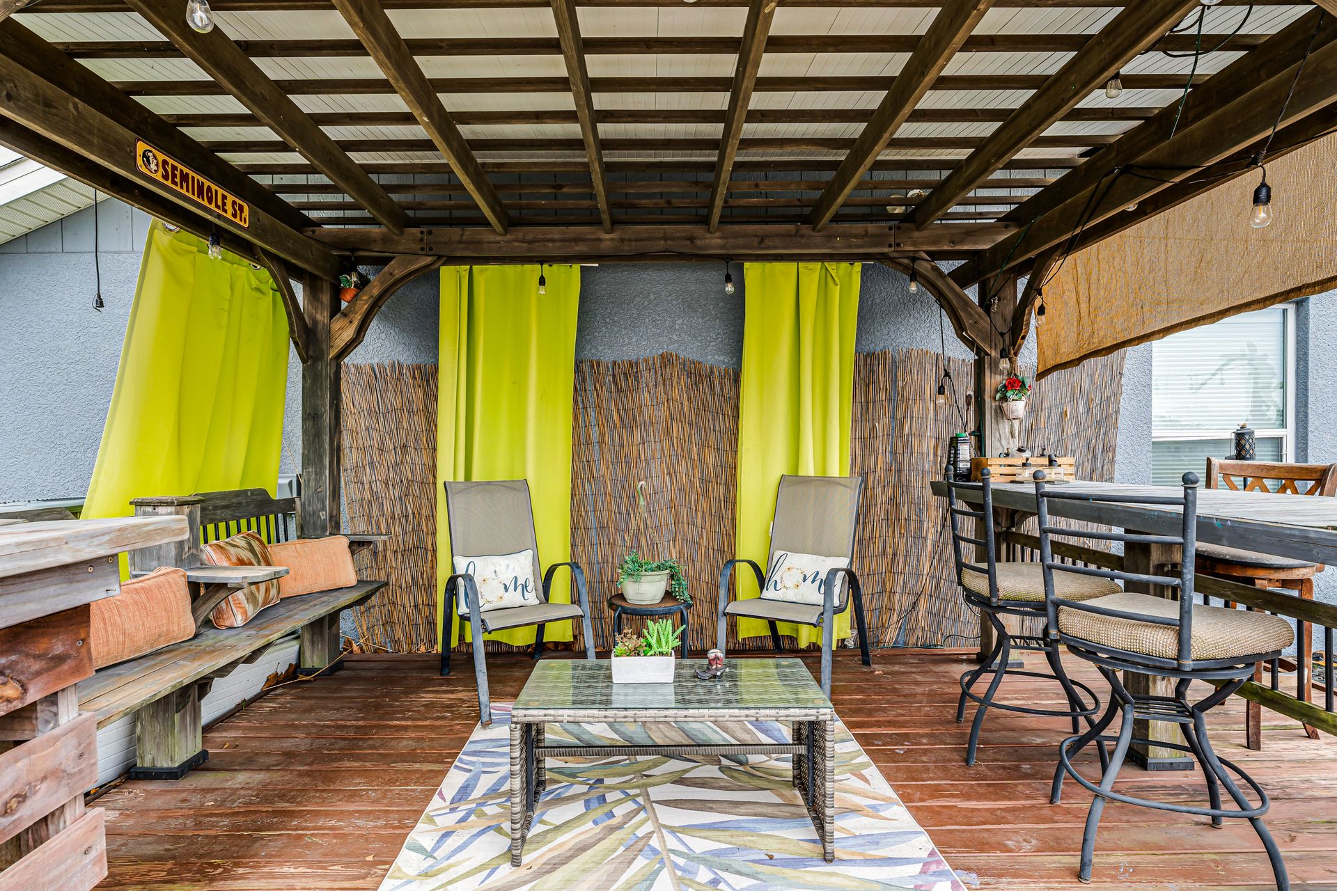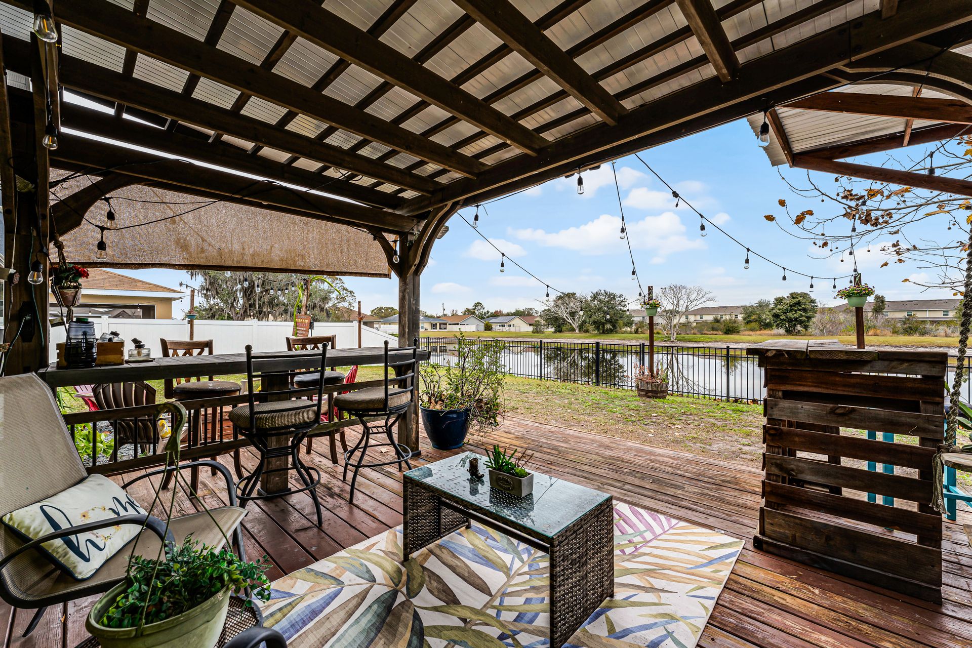 Enjoy year-round comfort in the closed-in Florida room, which seamlessly connects to your backyard oasis. This retreat features several gathering areas, including a firepit and a shaded wooden deck perfect for outdoor cooking, entertaining, or simply relaxing.