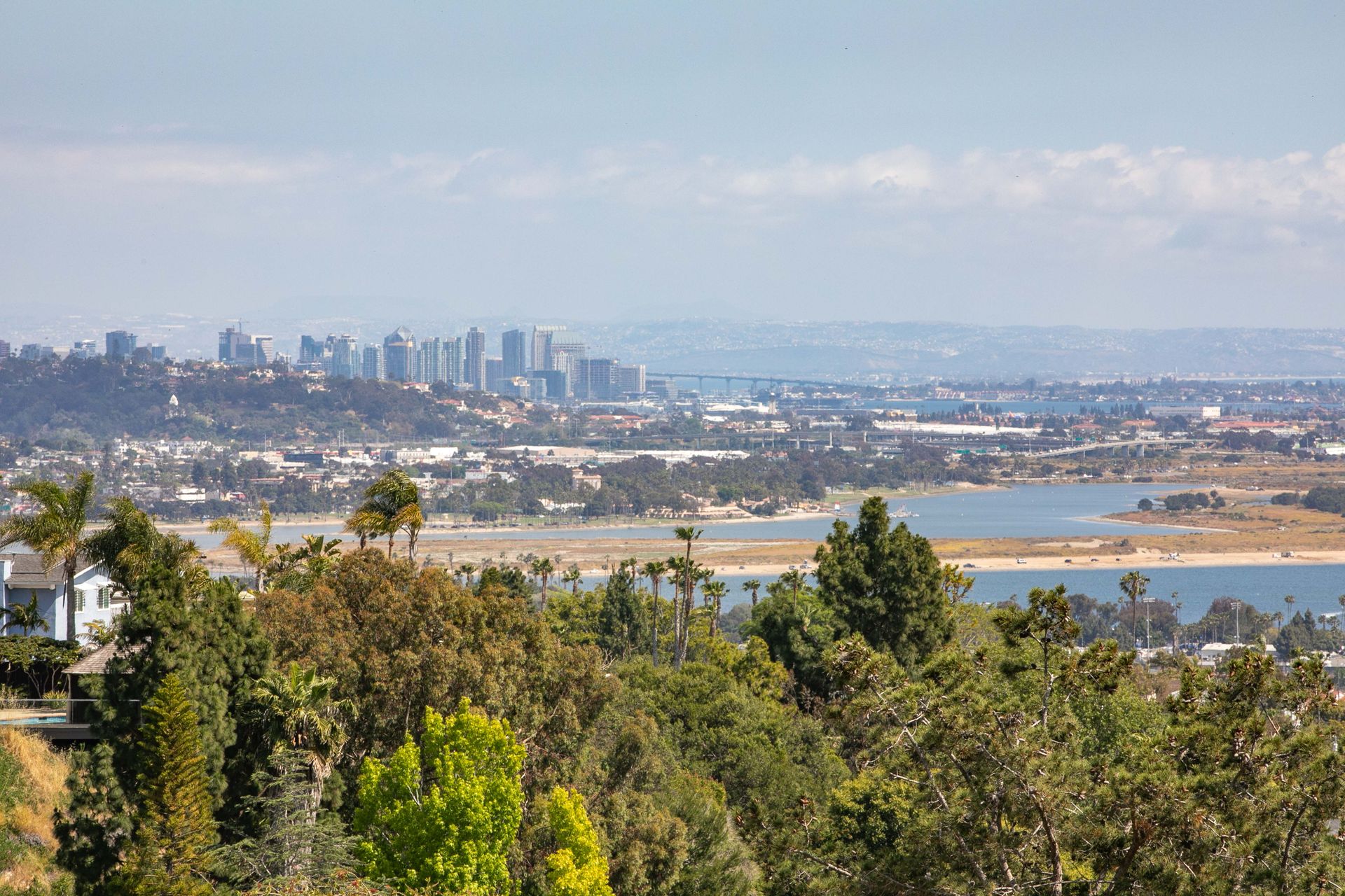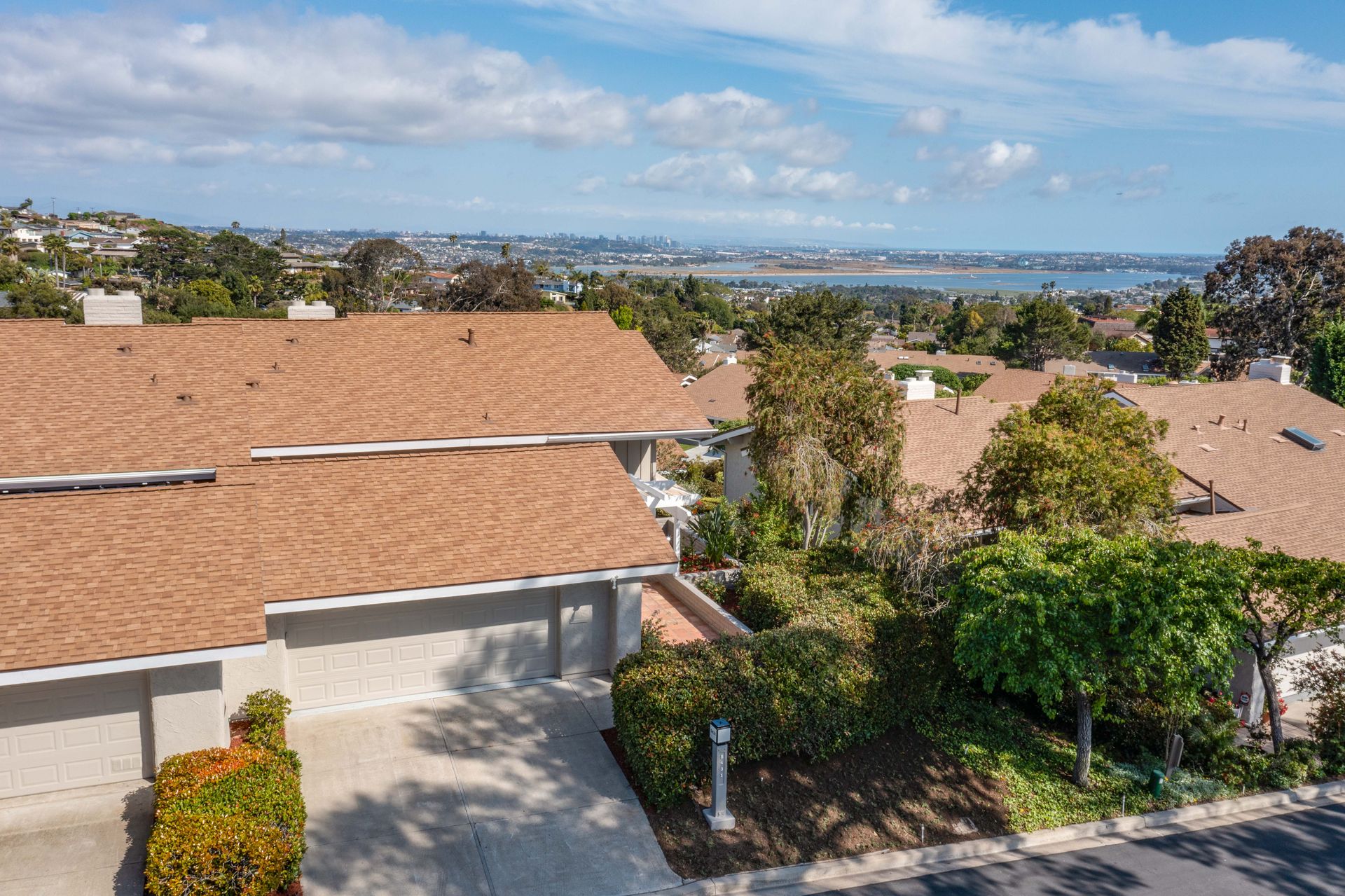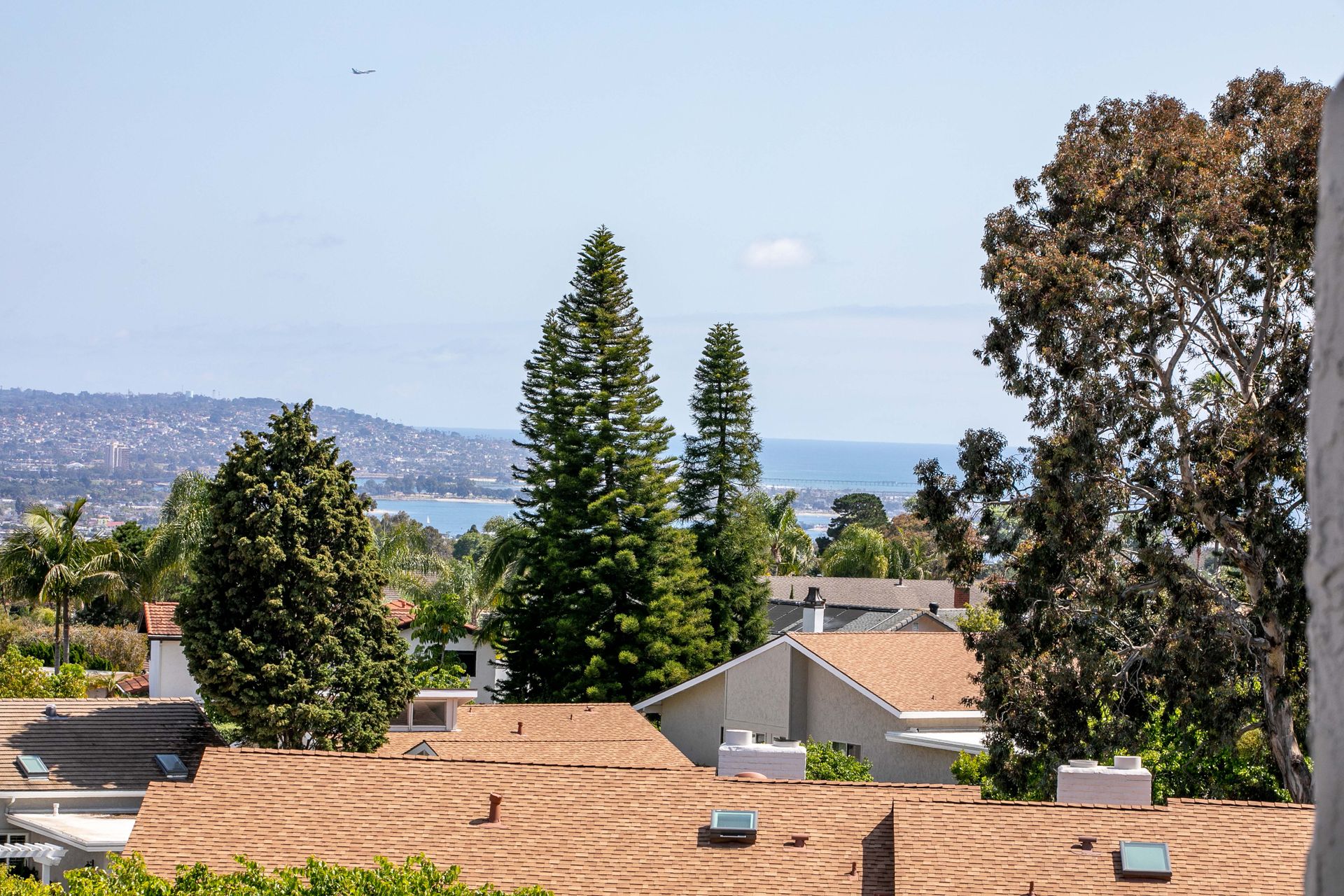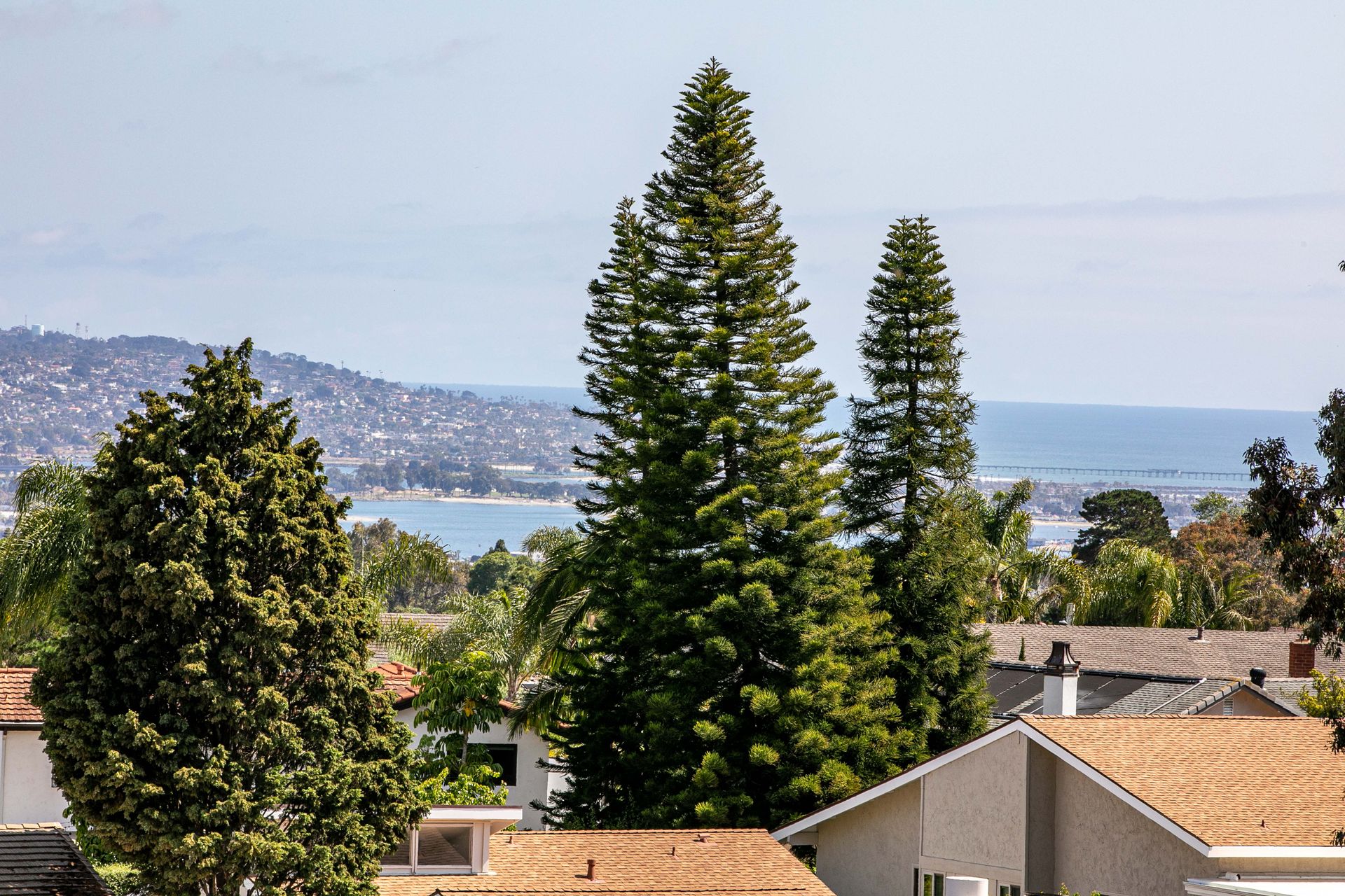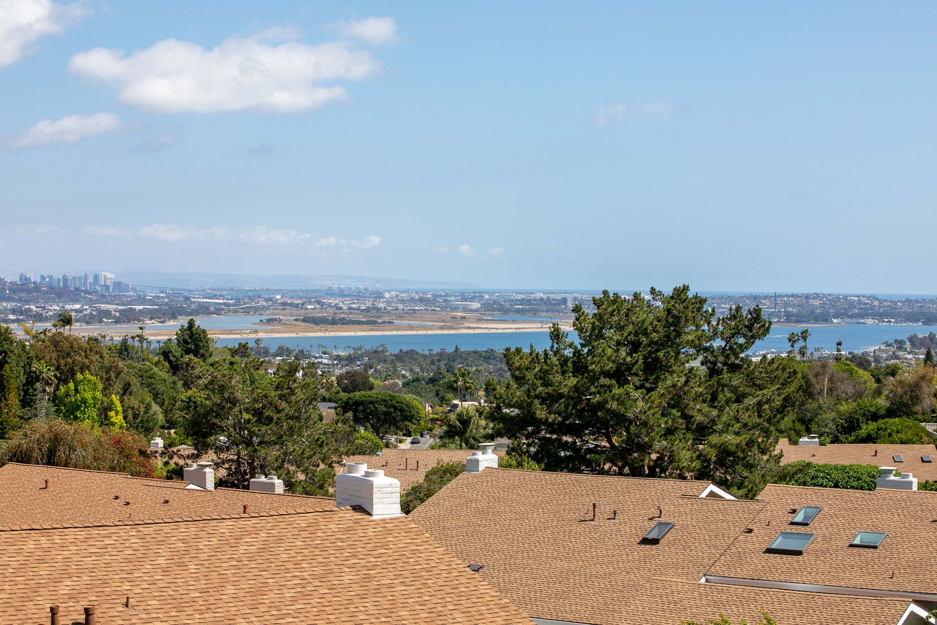 Enjoy expansive bay, ocean and city views on a prime lot located on a private cul-de-sac! This home has been meticulously maintained with a newer roof, remodeled kitchen and fresh exterior and interior paint. All three bedrooms also have scenic views. Enjoy the grand living/dining room with a fireplace which creates an ideal ambiance for gatherings. Savor your morning coffee on a private deck which is surrounded by flowers and mature fruit trees. The spacious primary suite boasts vaulted ceilings with floor to ceiling windows and its own private balcony to enjoy the ocean views and the Sea World fireworks! This is a home to love.