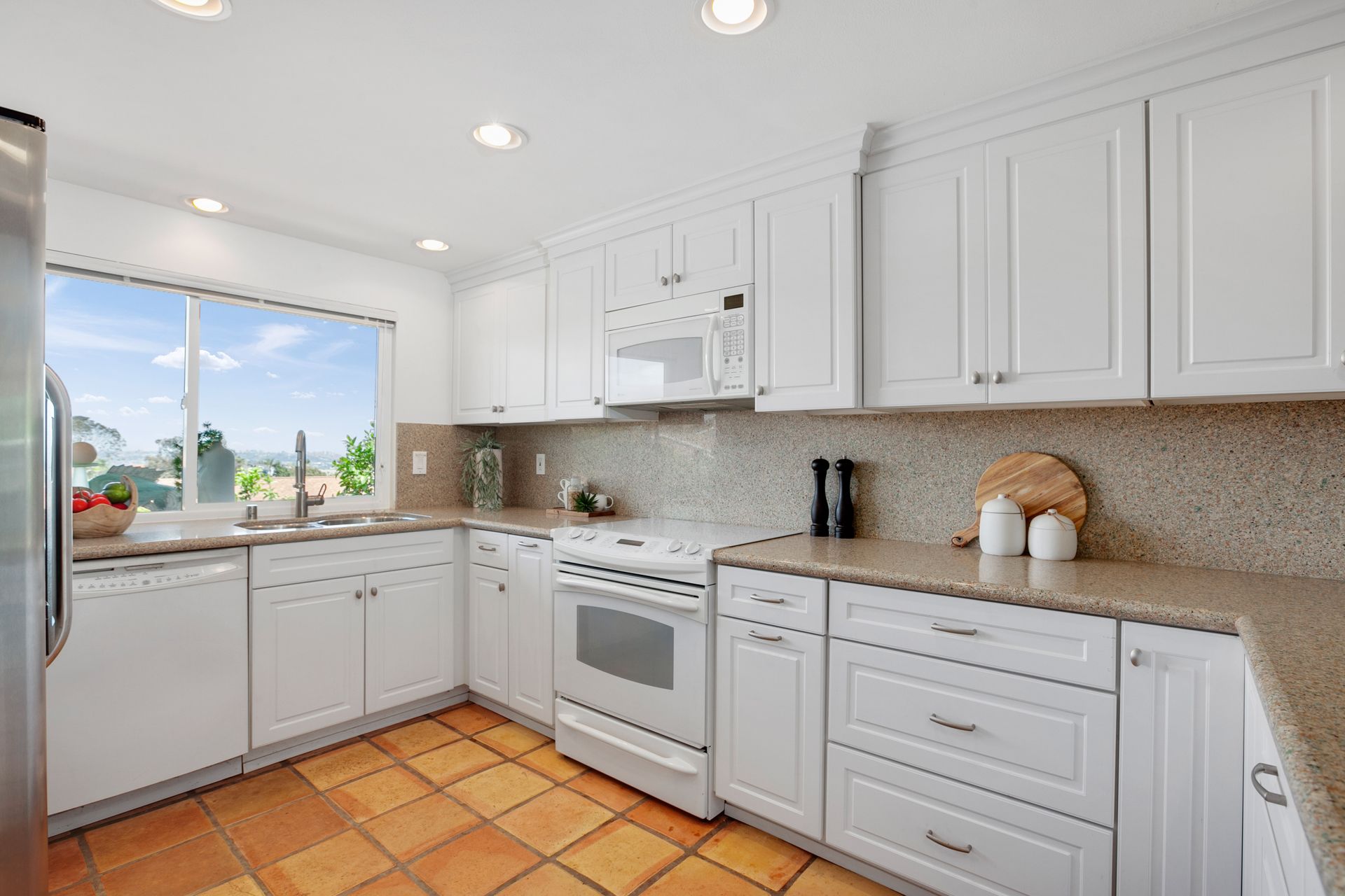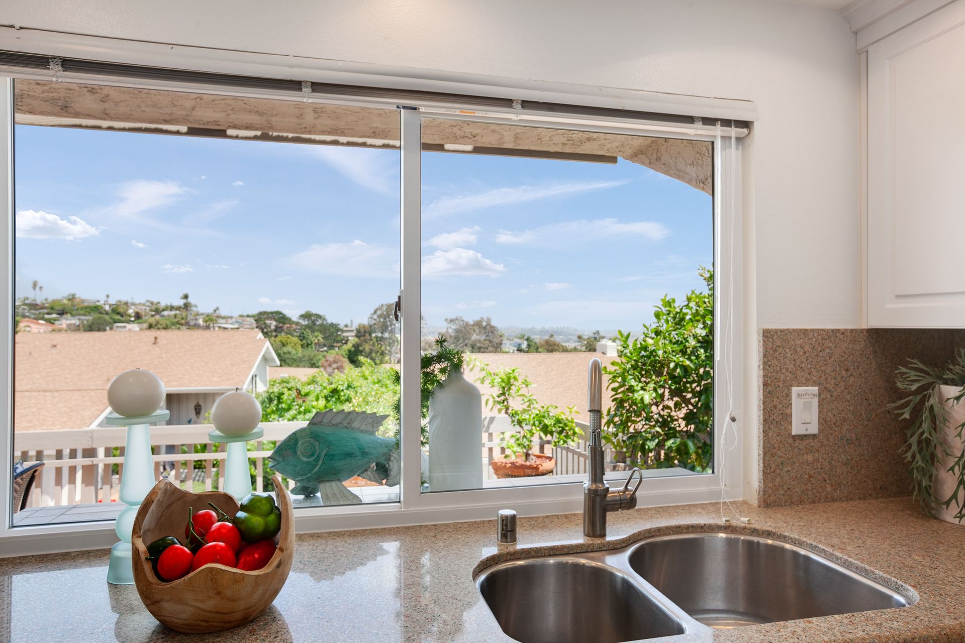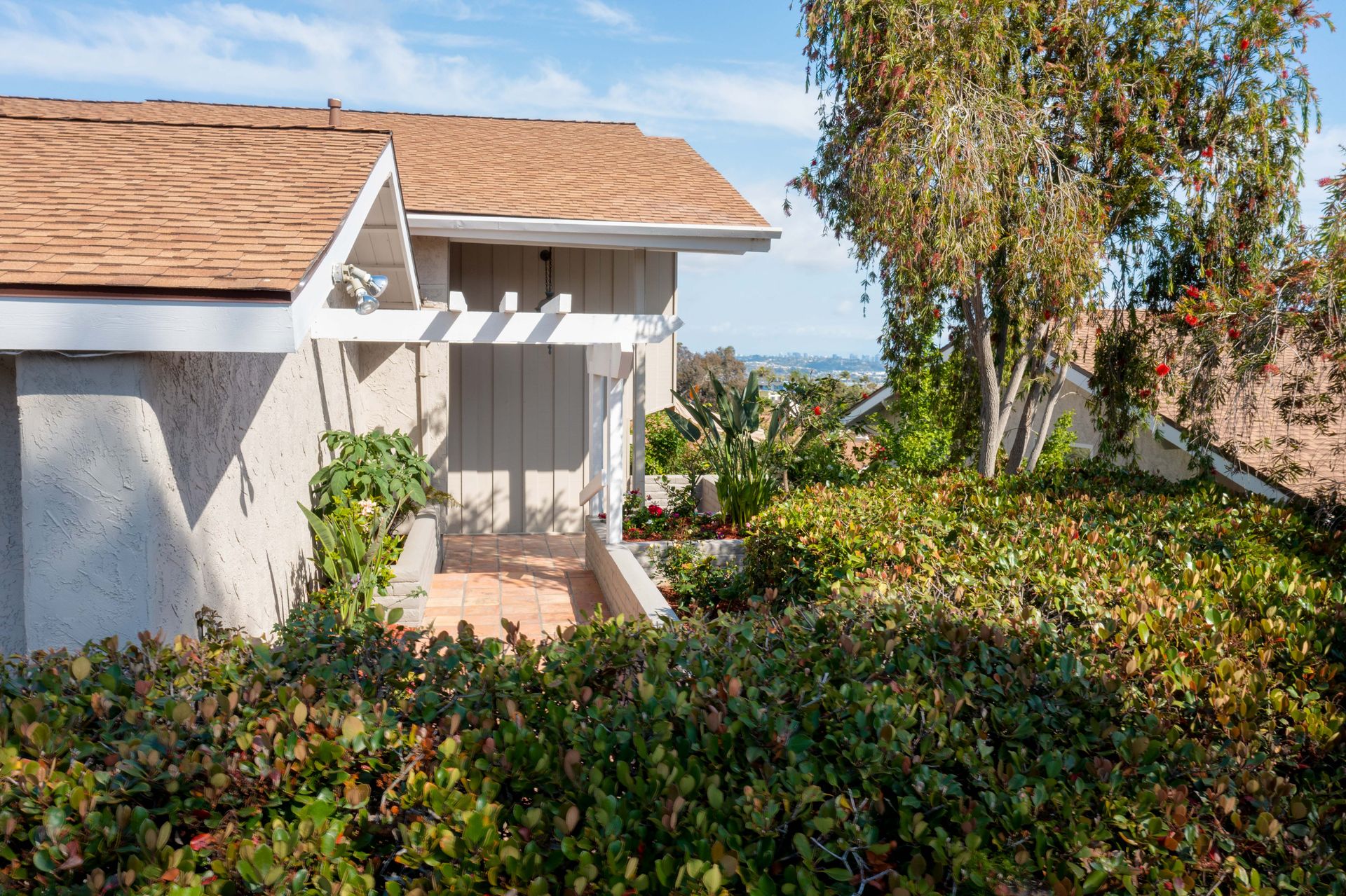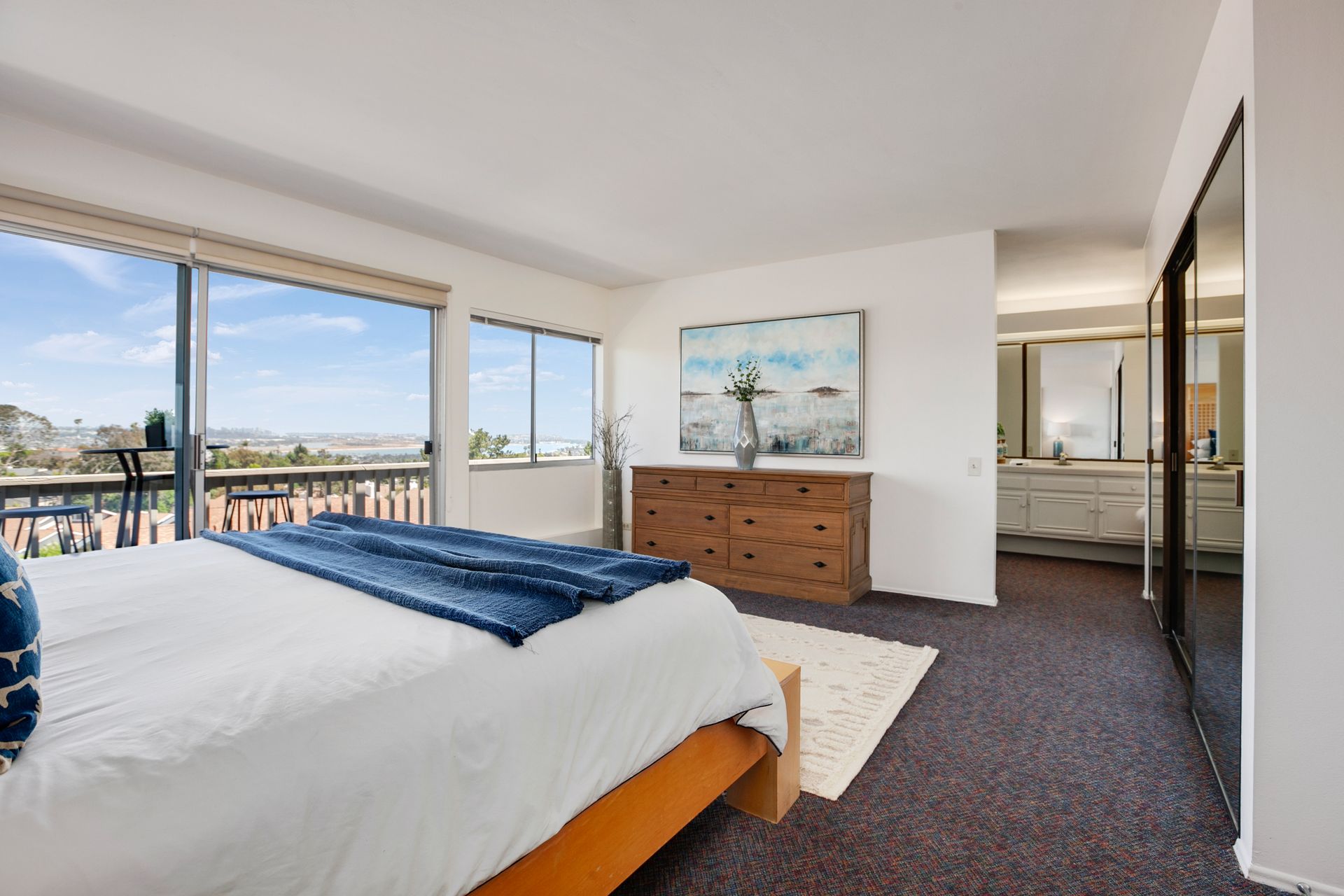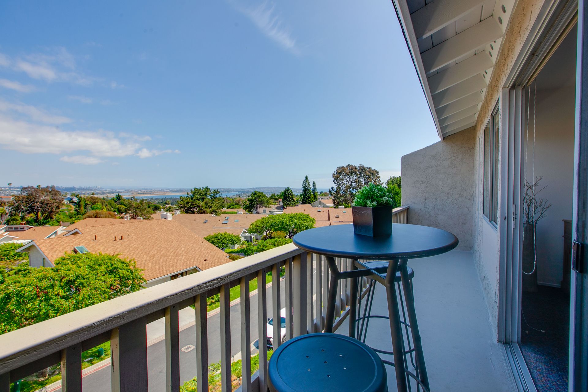 Enjoy expansive bay, ocean and city views on a prime lot located on a private cul-de-sac! This home has been meticulously maintained with a newer roof, remodeled kitchen and fresh exterior and interior paint. All three bedrooms also have scenic views. Enjoy the grand living/dining room with a fireplace which creates an ideal ambiance for gatherings. Savor your morning coffee on a private deck which is surrounded by flowers and mature fruit trees. The spacious primary suite boasts vaulted ceilings with floor to ceiling windows and its own private balcony to enjoy the ocean views and the Sea World fireworks! This is a home to love.