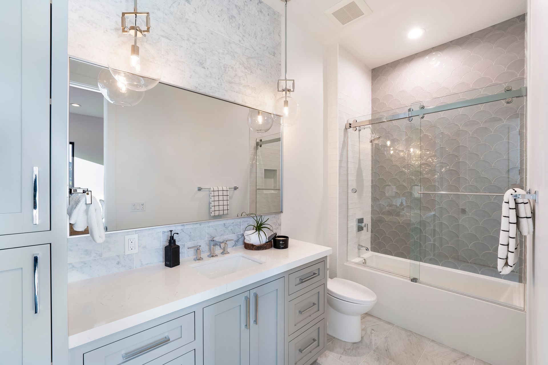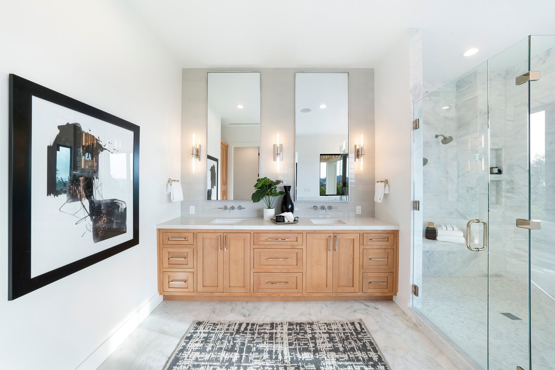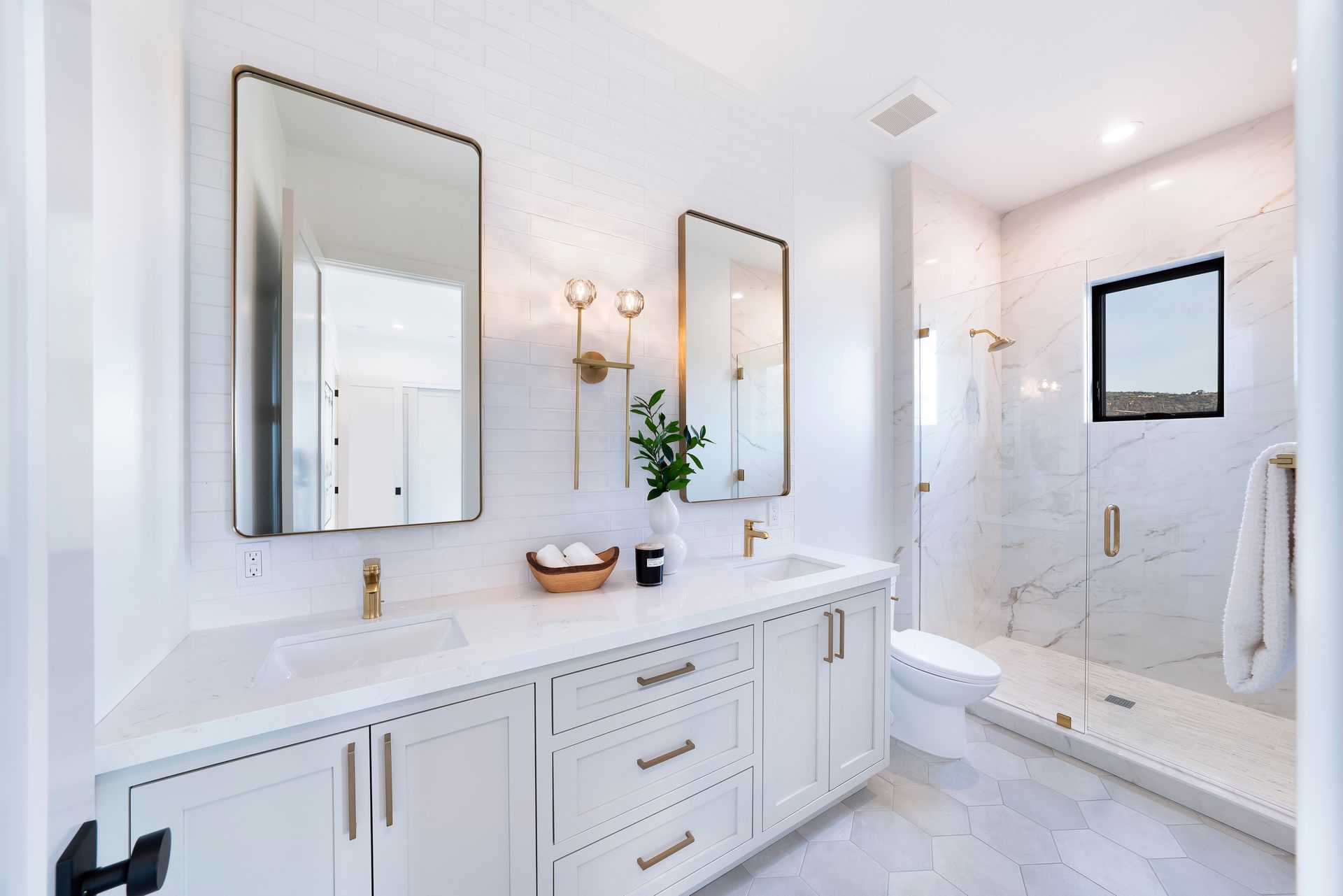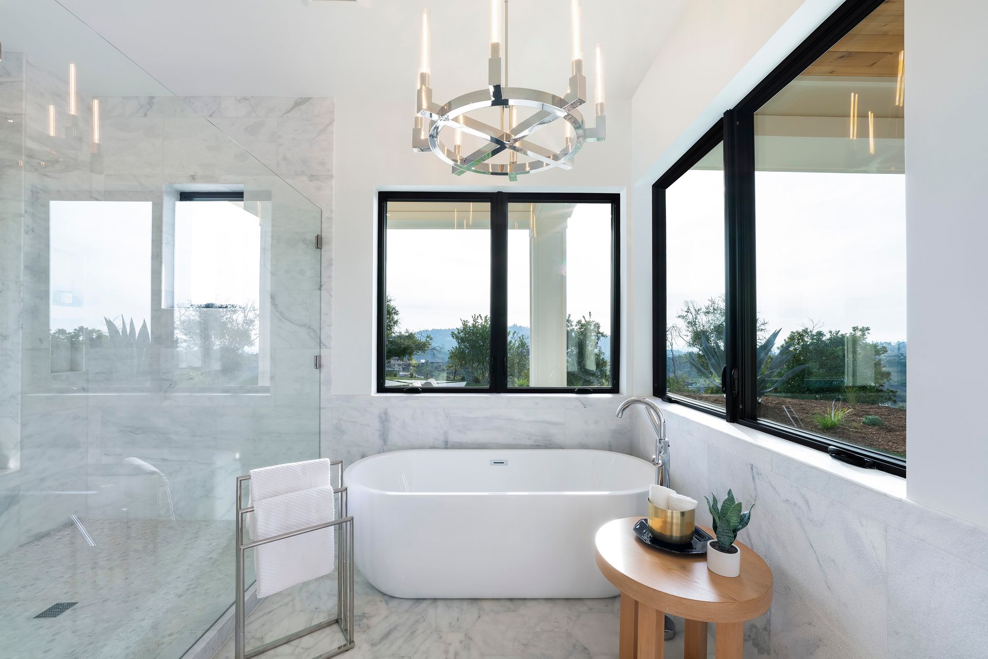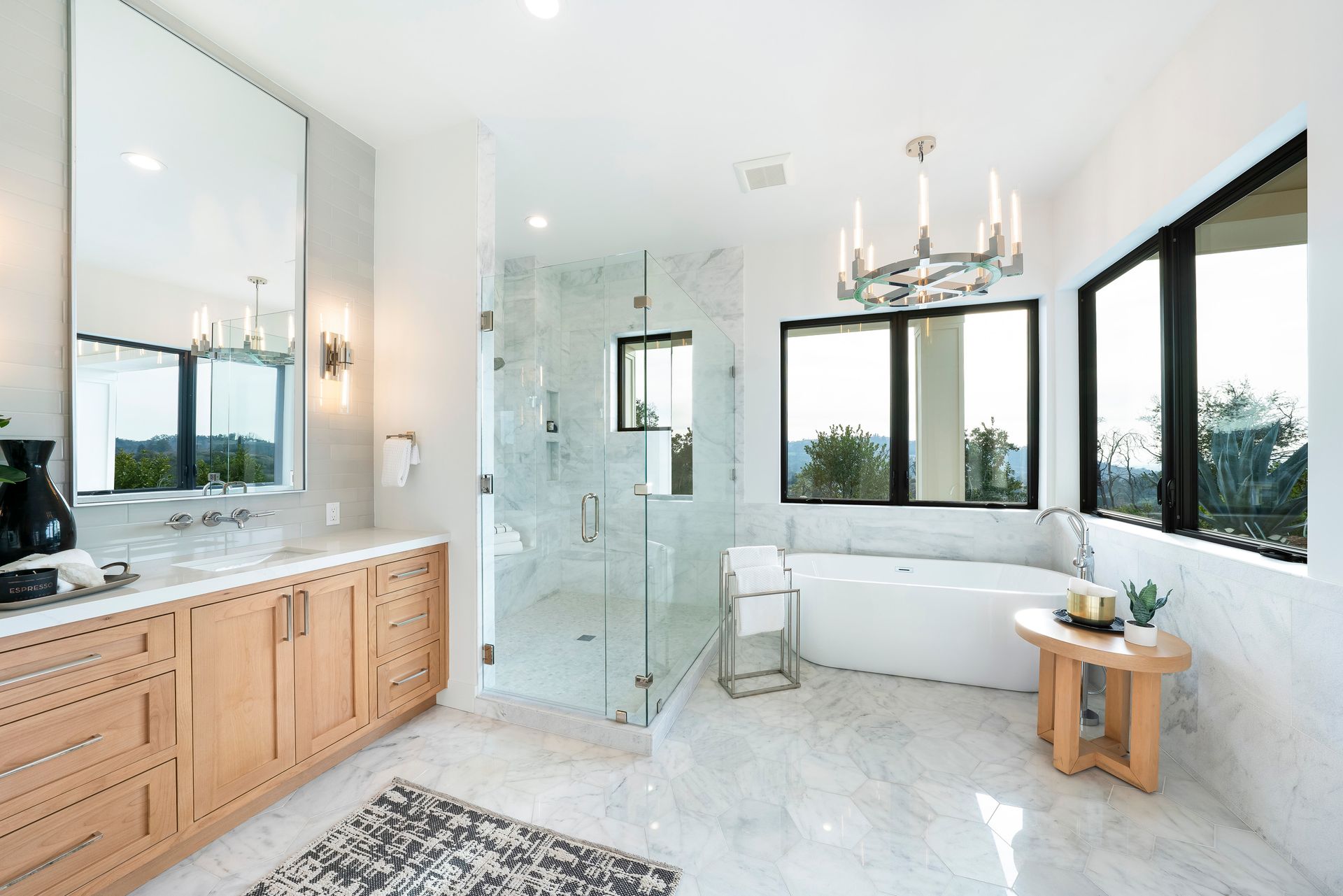 Primary bath includes dual sinks with quartz counters, soaking tub with views, large shower stall with shower head and handheld wand