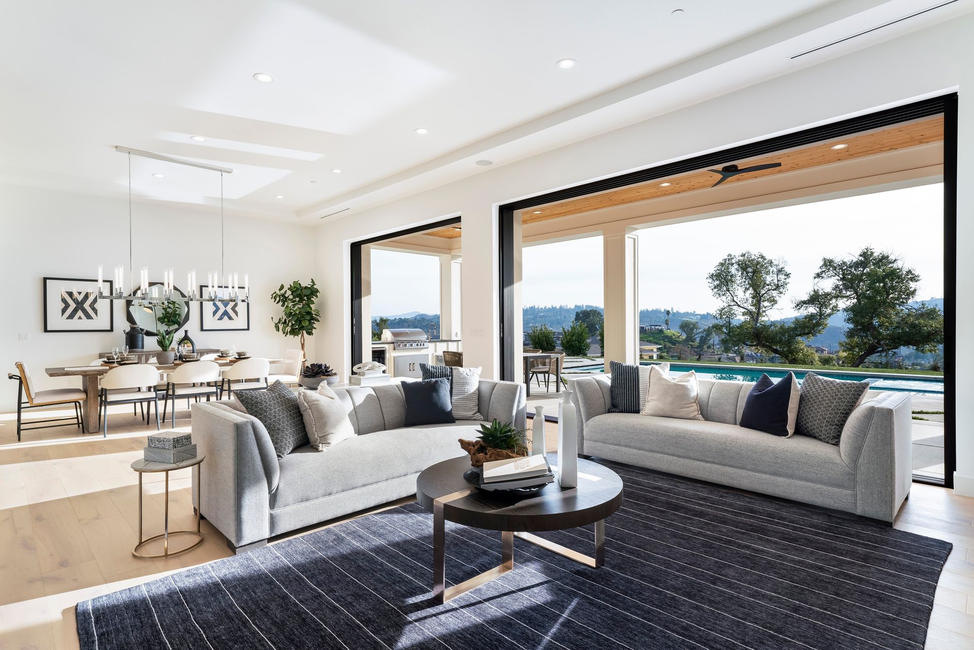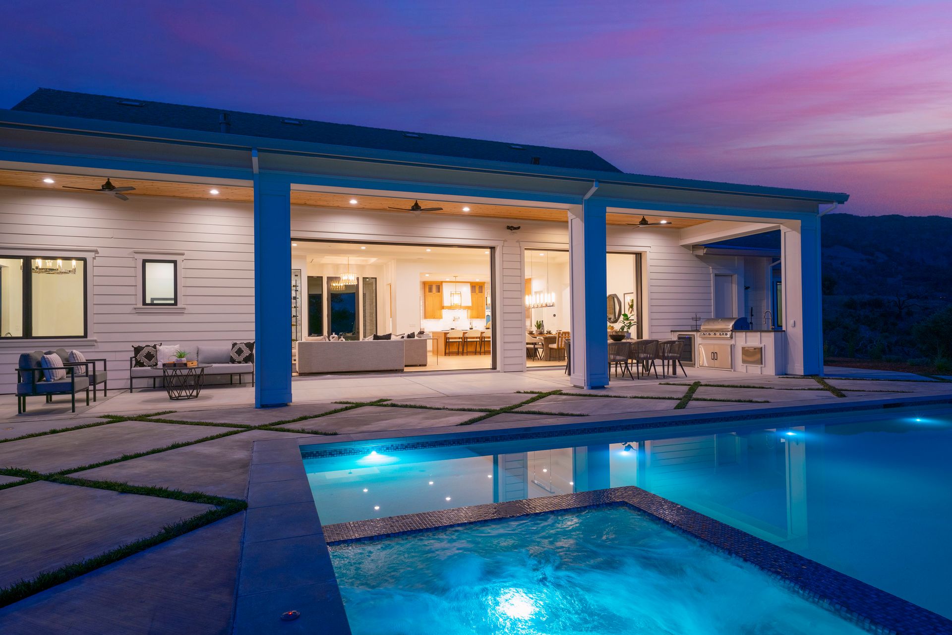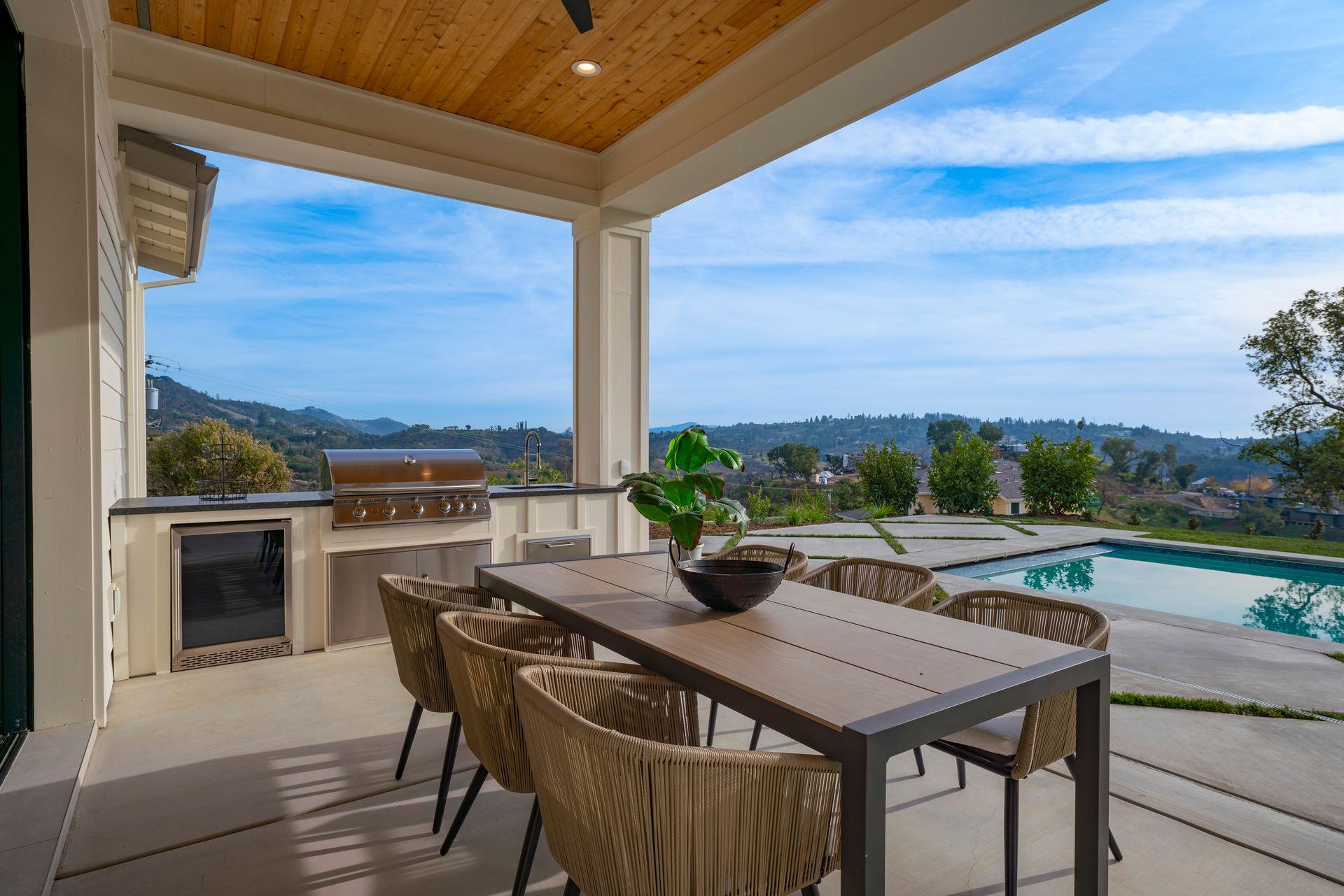 Covered view terrace with ceiling fan and decorative concrete surrounds the saltwater pool/spa, an outdoor kitchen is complete with Summerset grill, refrigerator and sink