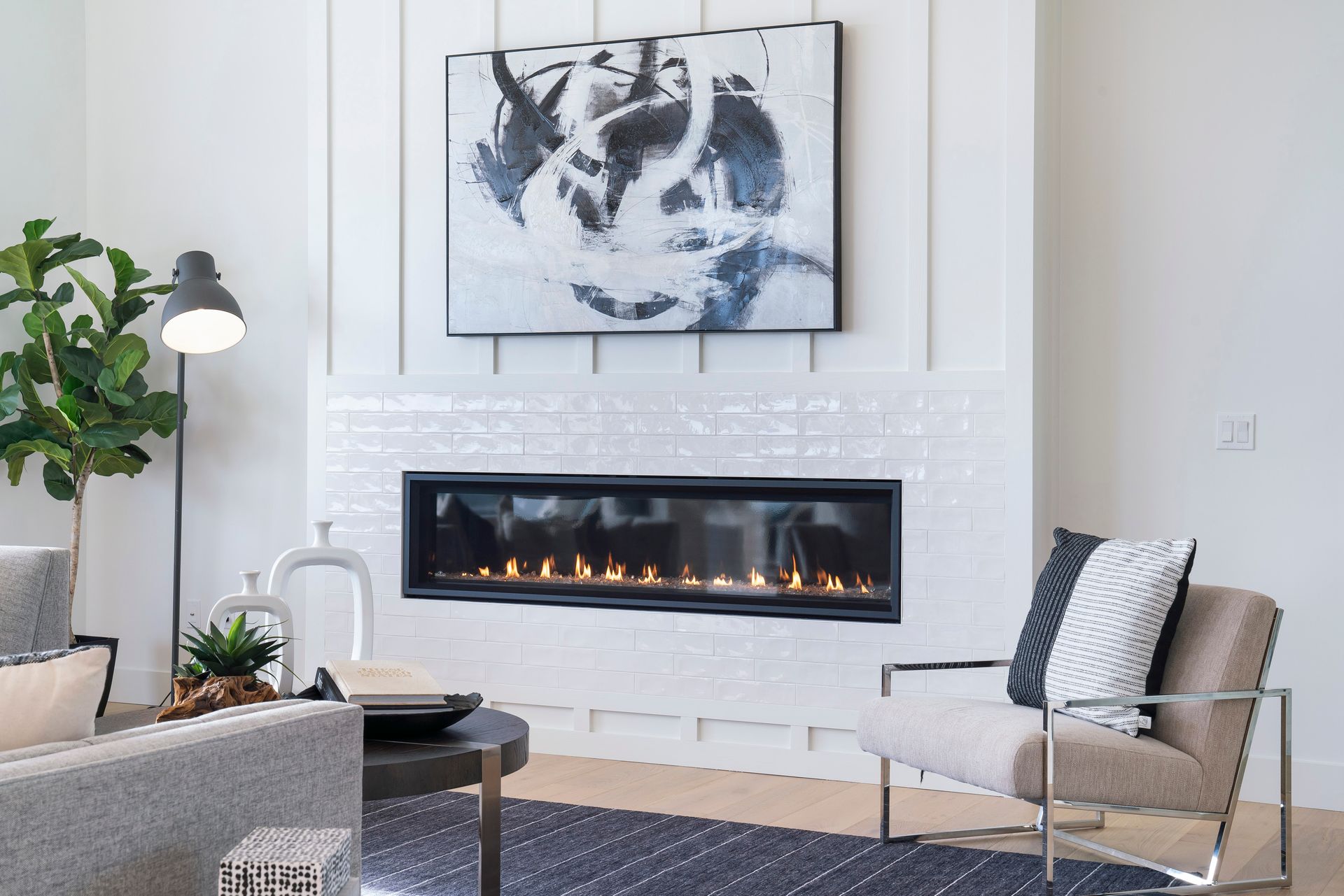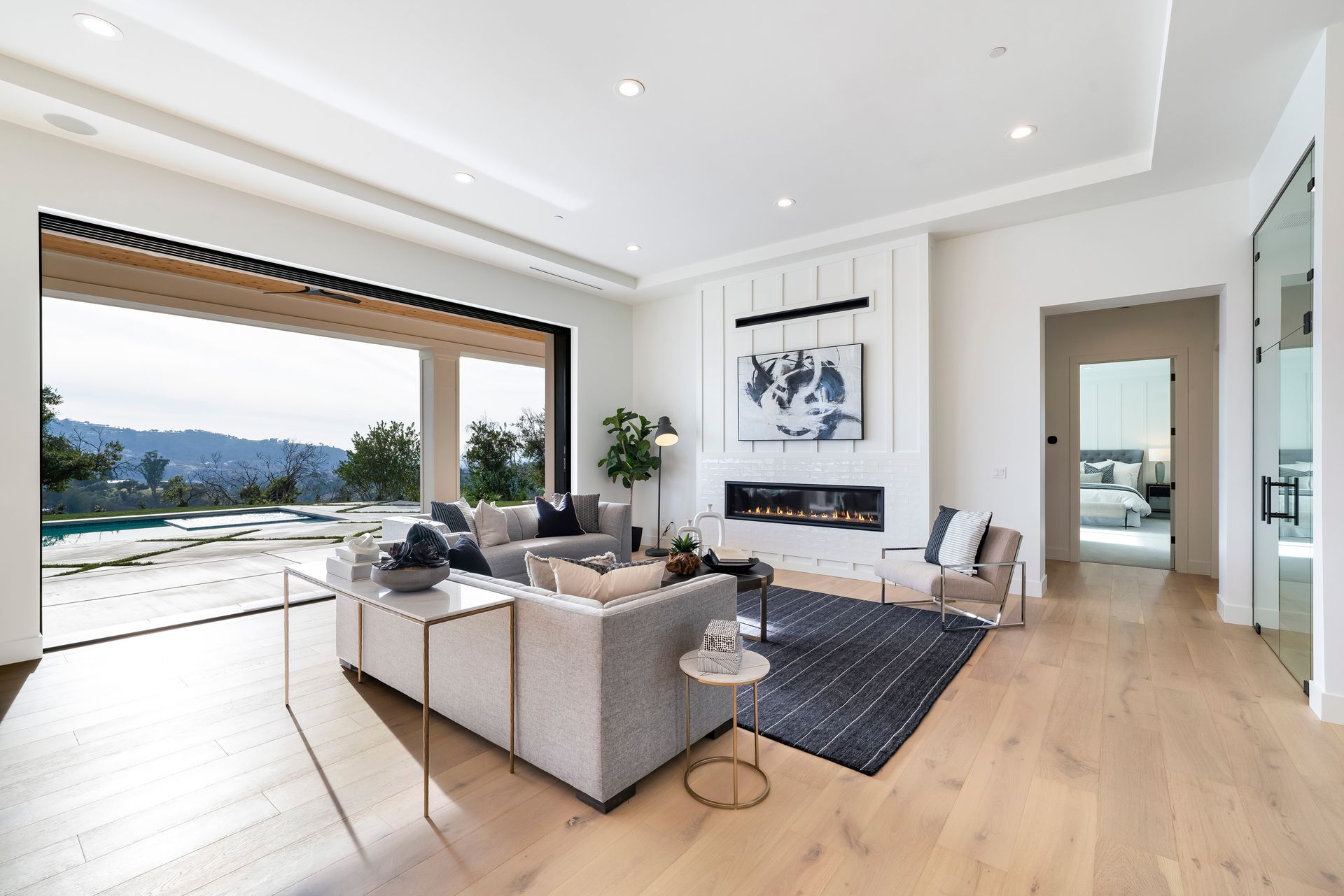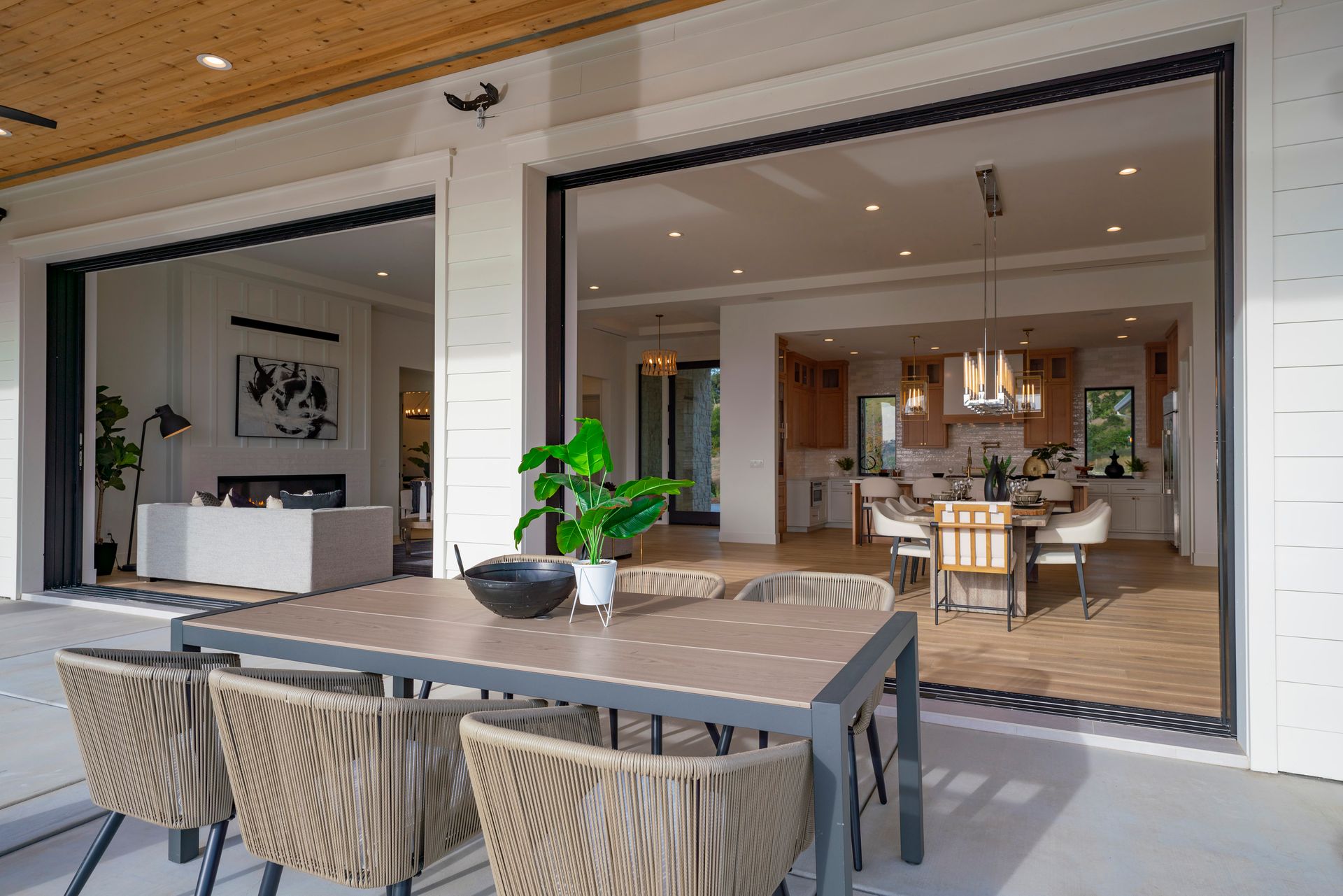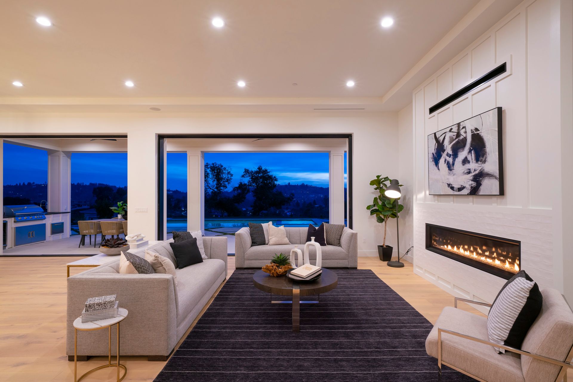 Open floor plan designed for comfort and convenience with great room featuring a gas fireplace set in a floor to ceiling accent wall, 10 foot tall disappearing pocket glass patio doors to the view terrace, 12 foot vaulted ceiling, and wired for audio with built-in speakers
