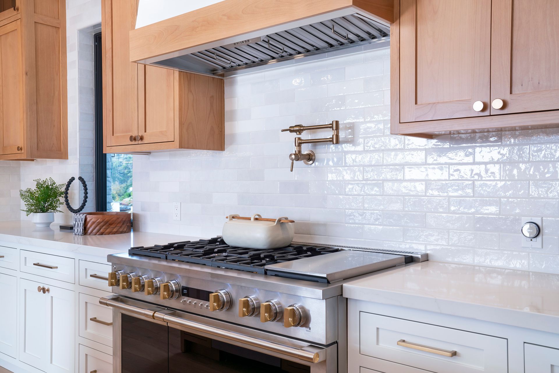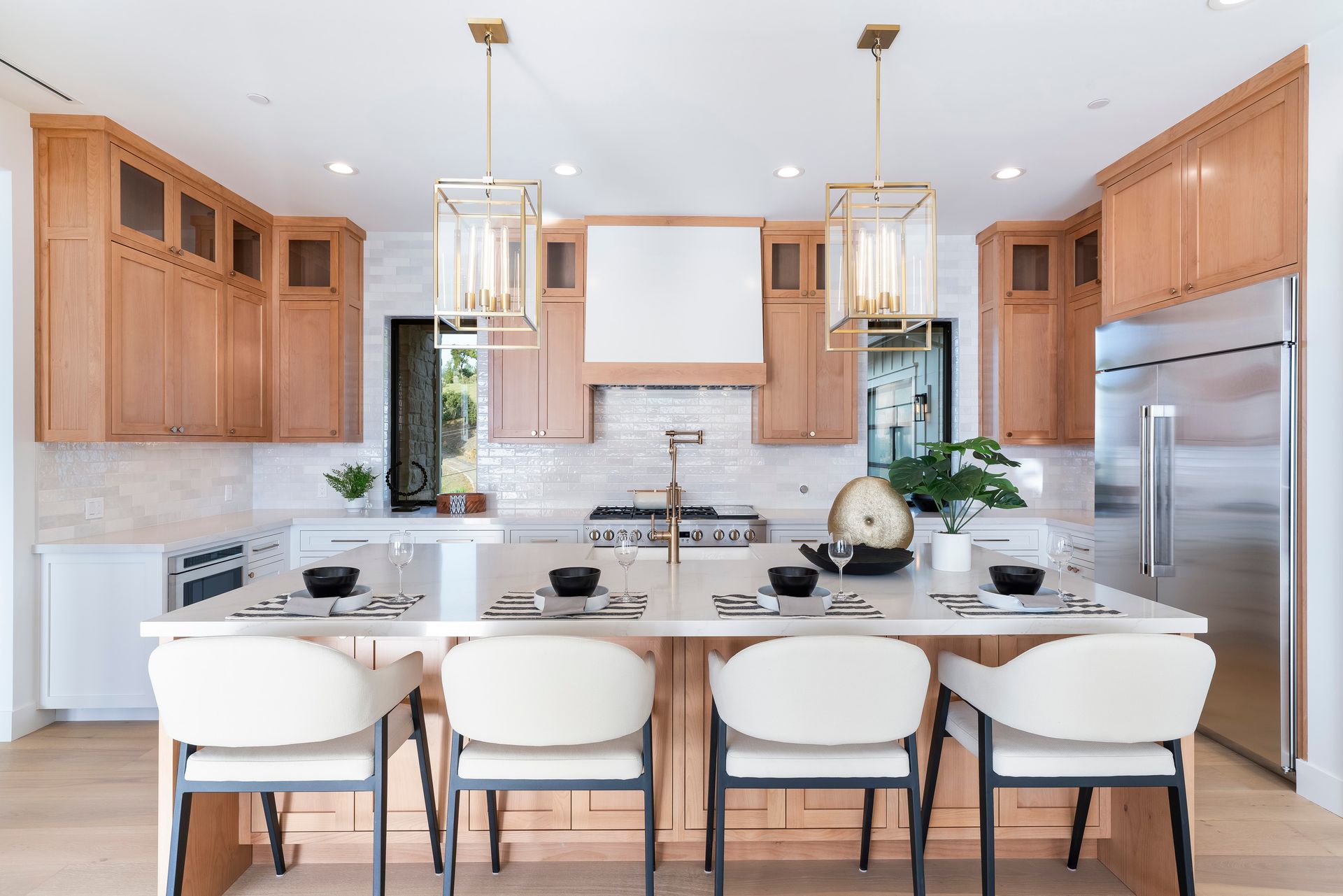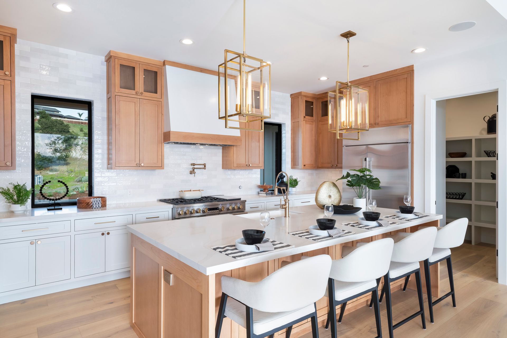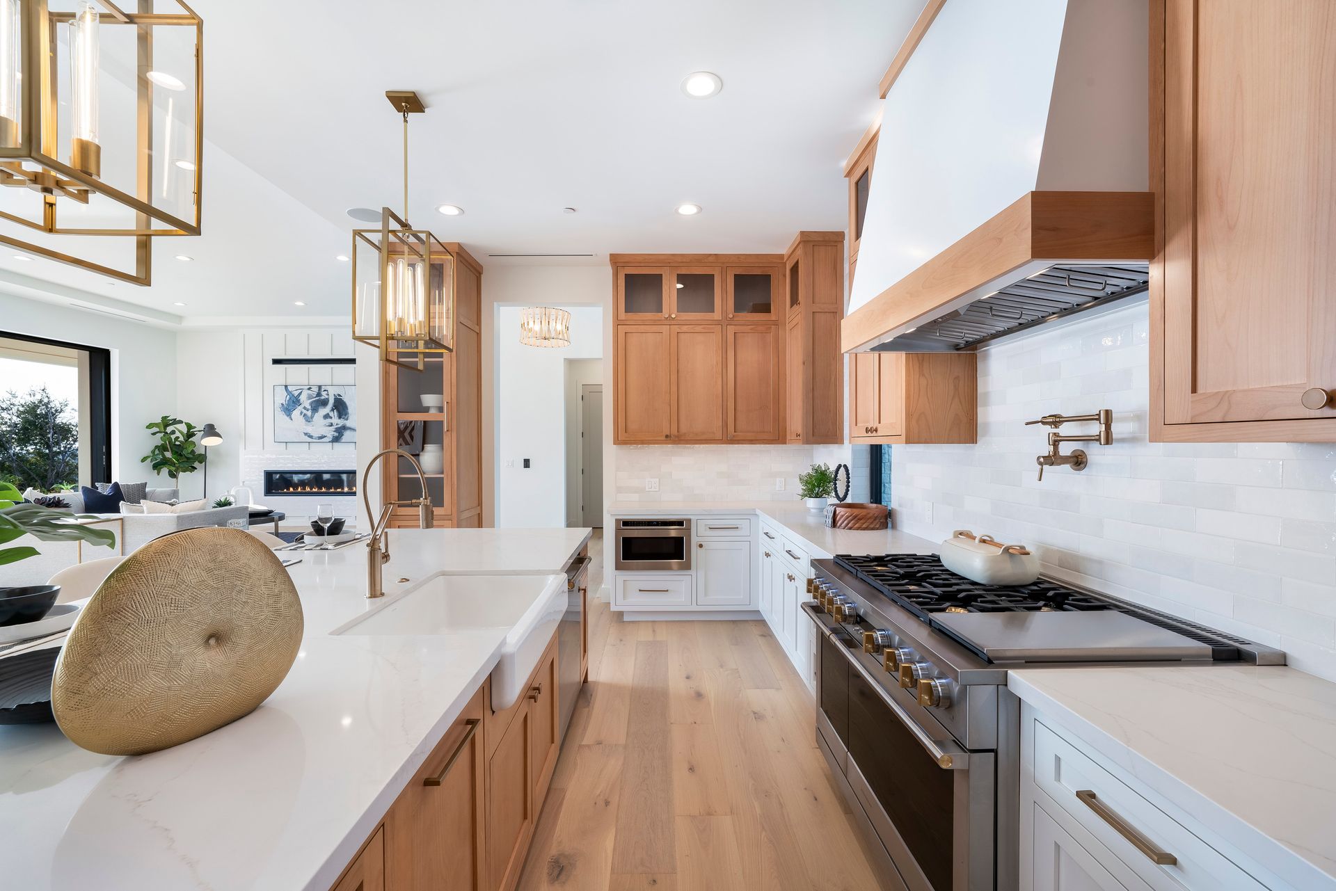 Kitchen features quartz center island with breakfast seating, Monogram 6 burner gas range with griddle, double ovens, dishwasher, microwave drawer, built-in refrigerator/freezer, pot filler faucet, hood over range, soft close Alder wood cabinets, walk-in pantry