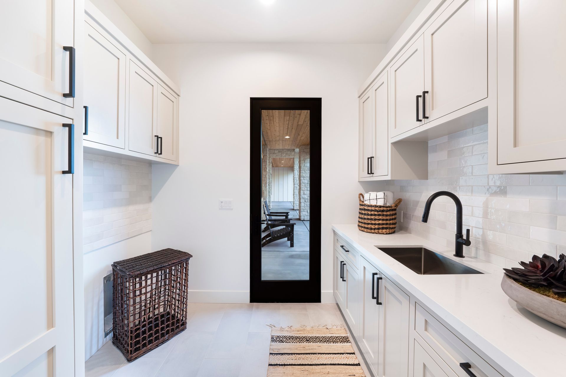 Laundry room with cabinetry and sink provides direct access to the outdoors